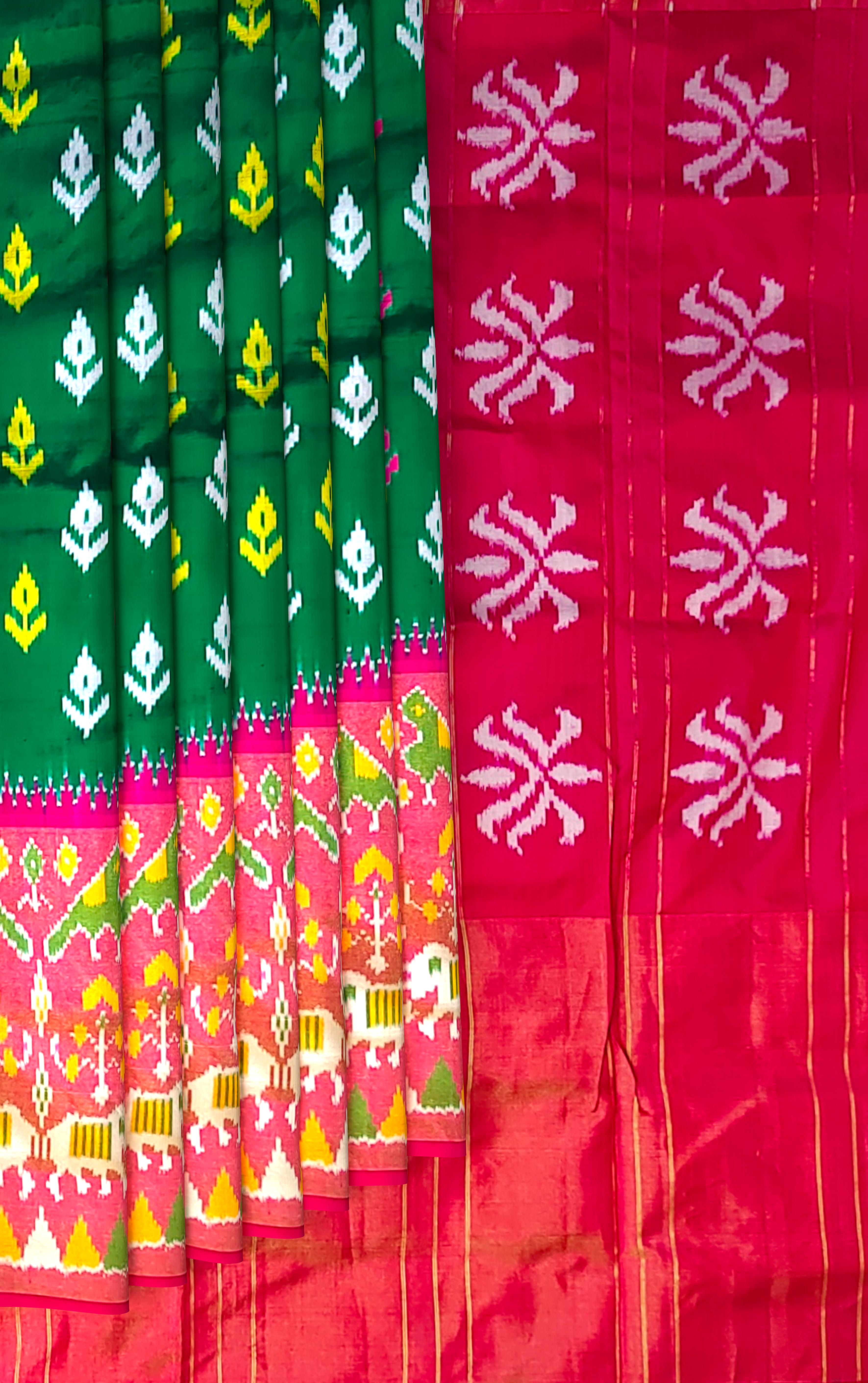 This gorgeous Green Pink Pochampally Single Ikat Handloom Saree is a stunning piece that showcases the beauty of traditional Indian craftsmanship. The saree features intricate gold zari work on a green and pink background, creating a striking contrast that exudes elegance and sophistication.