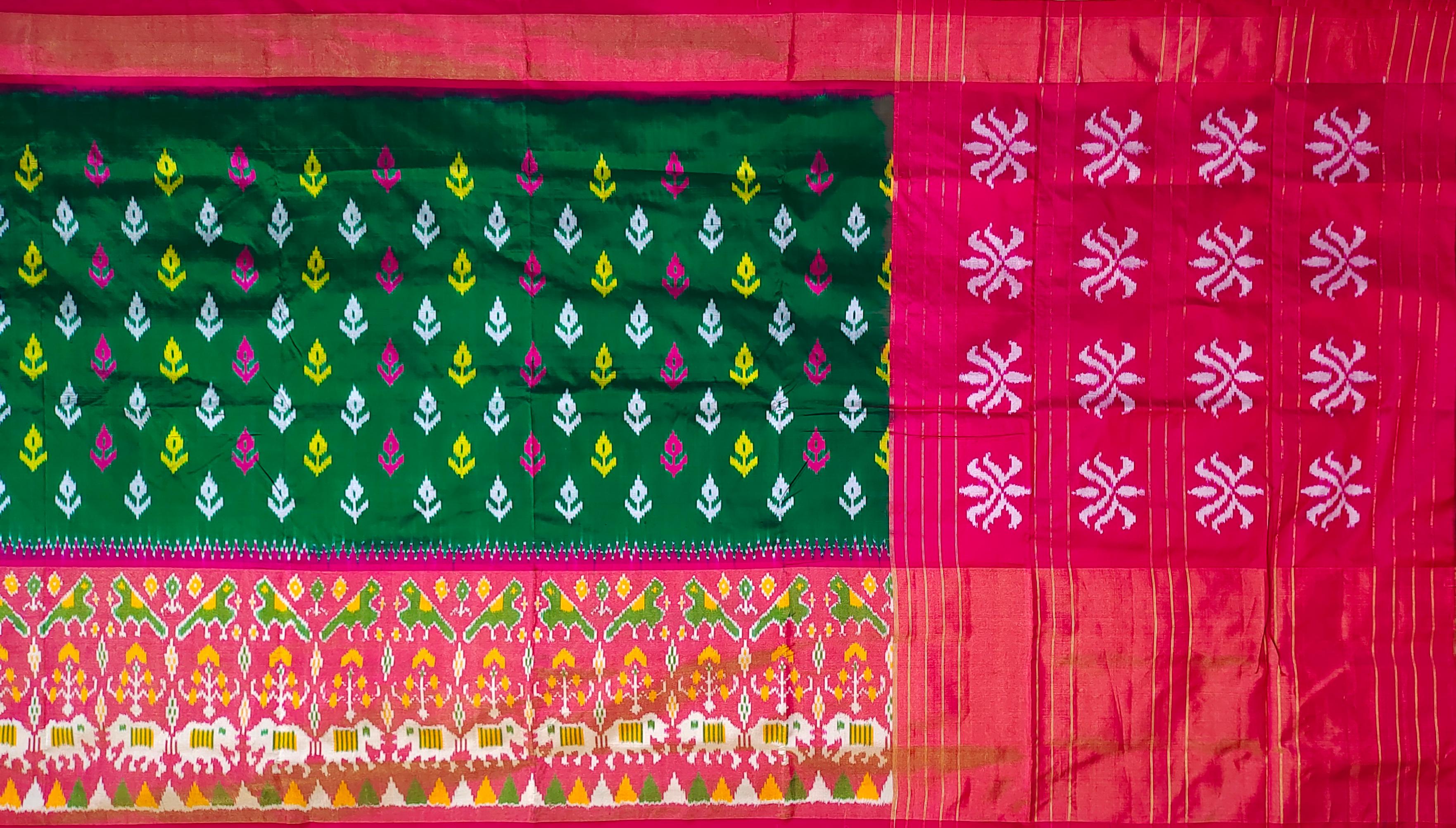 This Green Pink Pochampally Single Ikat Handloom Saree is perfect for formal occasions like weddings, festivals, and special events. Pair it with a matching green or pink-colored blouse and accessories like gold jewelry and a statement handbag to complete the look.