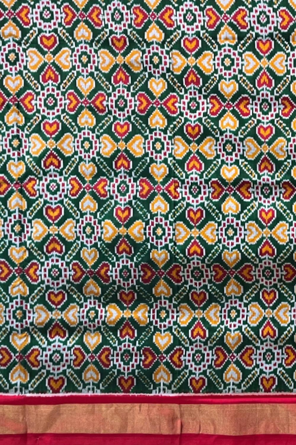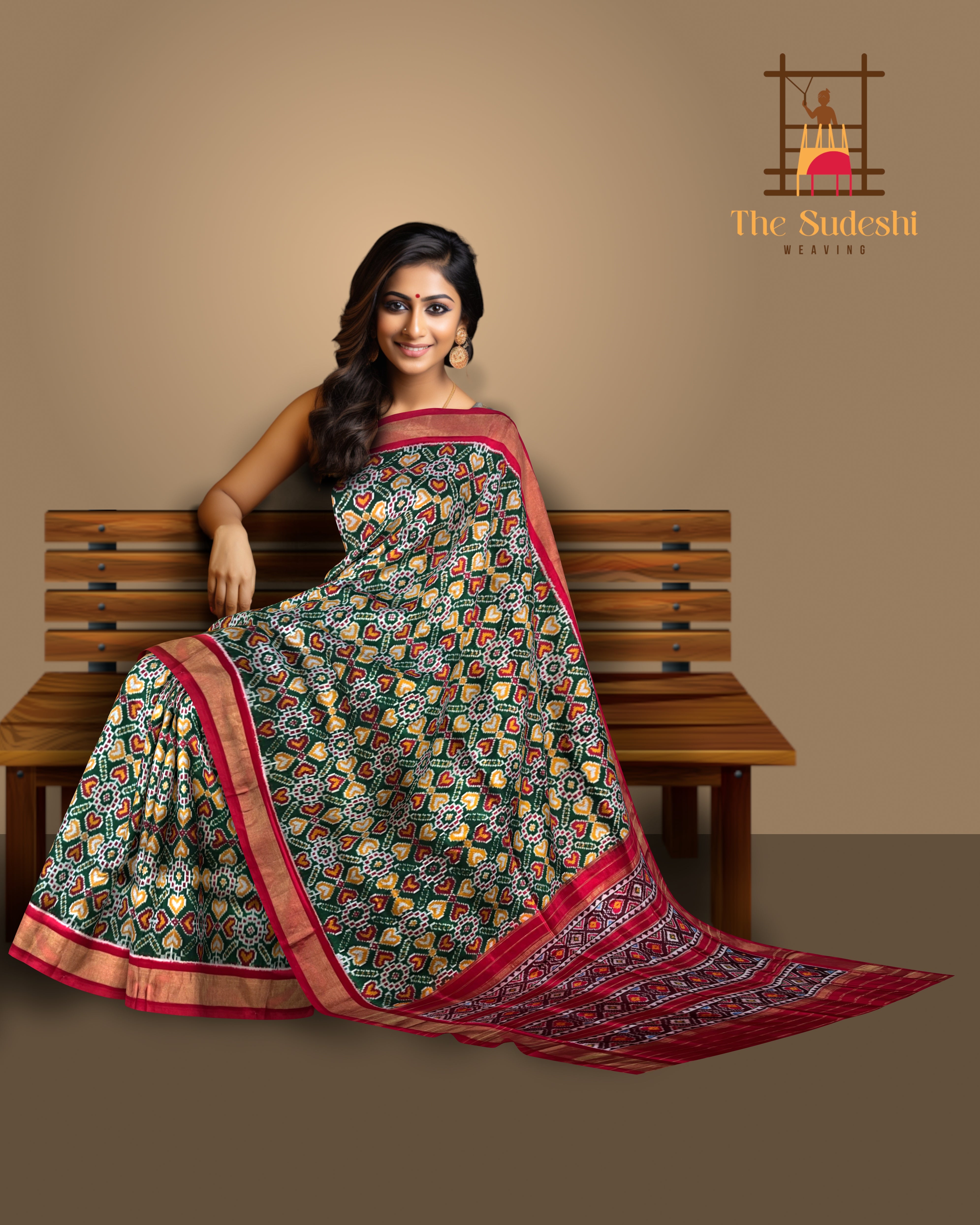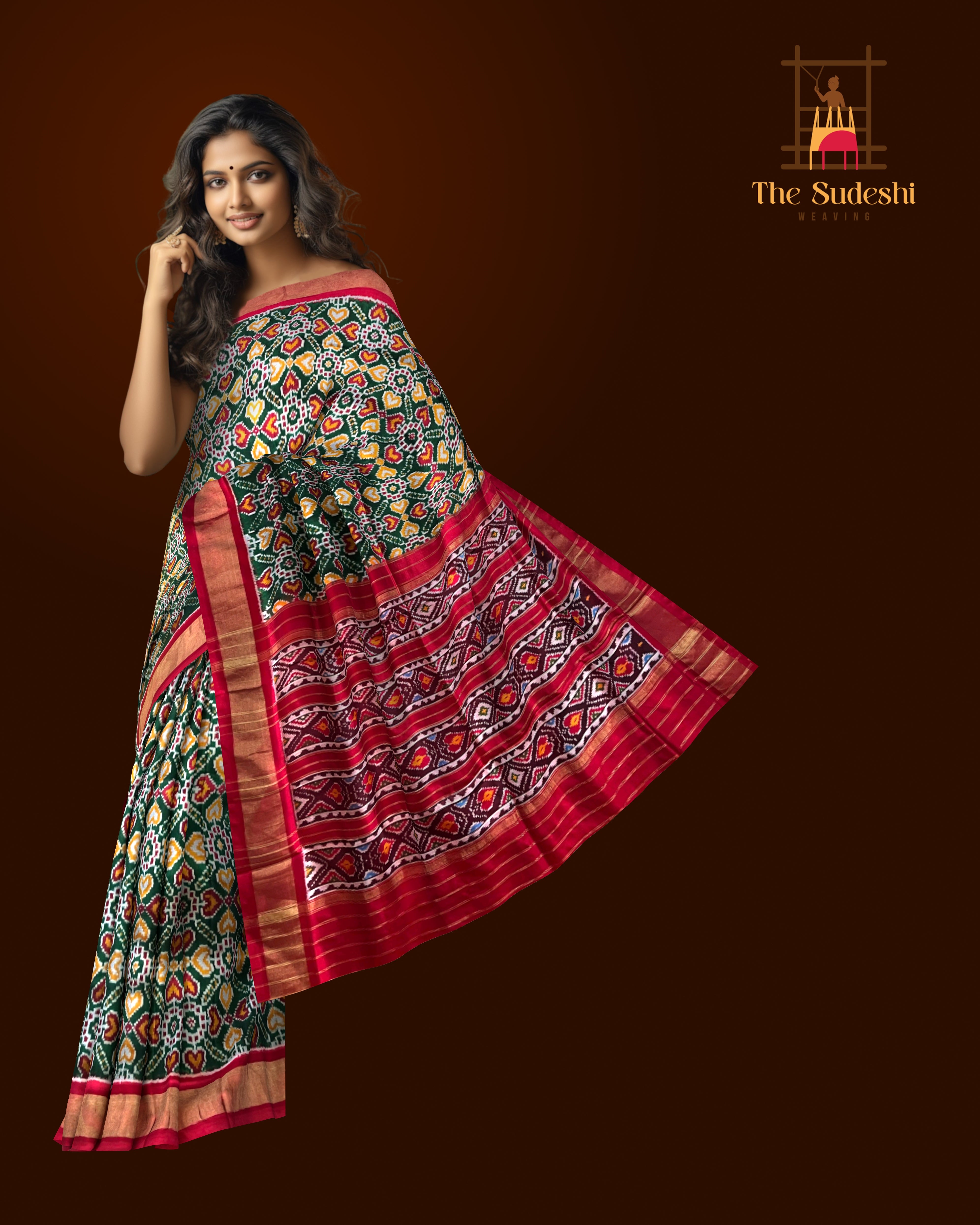 Classic and festive, the Green Pochampally Ikat Saree features a rich green body highlighted by a bold red border and pallu. This traditional color pairing is deeply rooted in Indian culture, symbolizing prosperity, fertility, and celebration. The intricate ikat patterns woven into the fabric further enrich its cultural essence. Originating from Pochampally, Telangana, this saree is woven using the intricate double ikat method. The careful alignment of pre-dyed yarns forms symmetrical motifs that often represent elements of nature and spirituality. The green and red combination is especially favored during festivals and auspicious ceremonies. Perfect for weddings, temple visits, and festive events, this saree pairs best with a red or gold blouse. Complement the ensemble with temple jewelry, gold bangles, and a statement necklace for a complete traditional look. Note: The appearance of the product’s colors may vary due to lighting conditions or your device’s screen calibration. For further assistance or additional images/videos, feel free to contact us at +91 97897 60367 / +1 (945) 308-5962 or email at wecare@thesudeshiweaving.com.