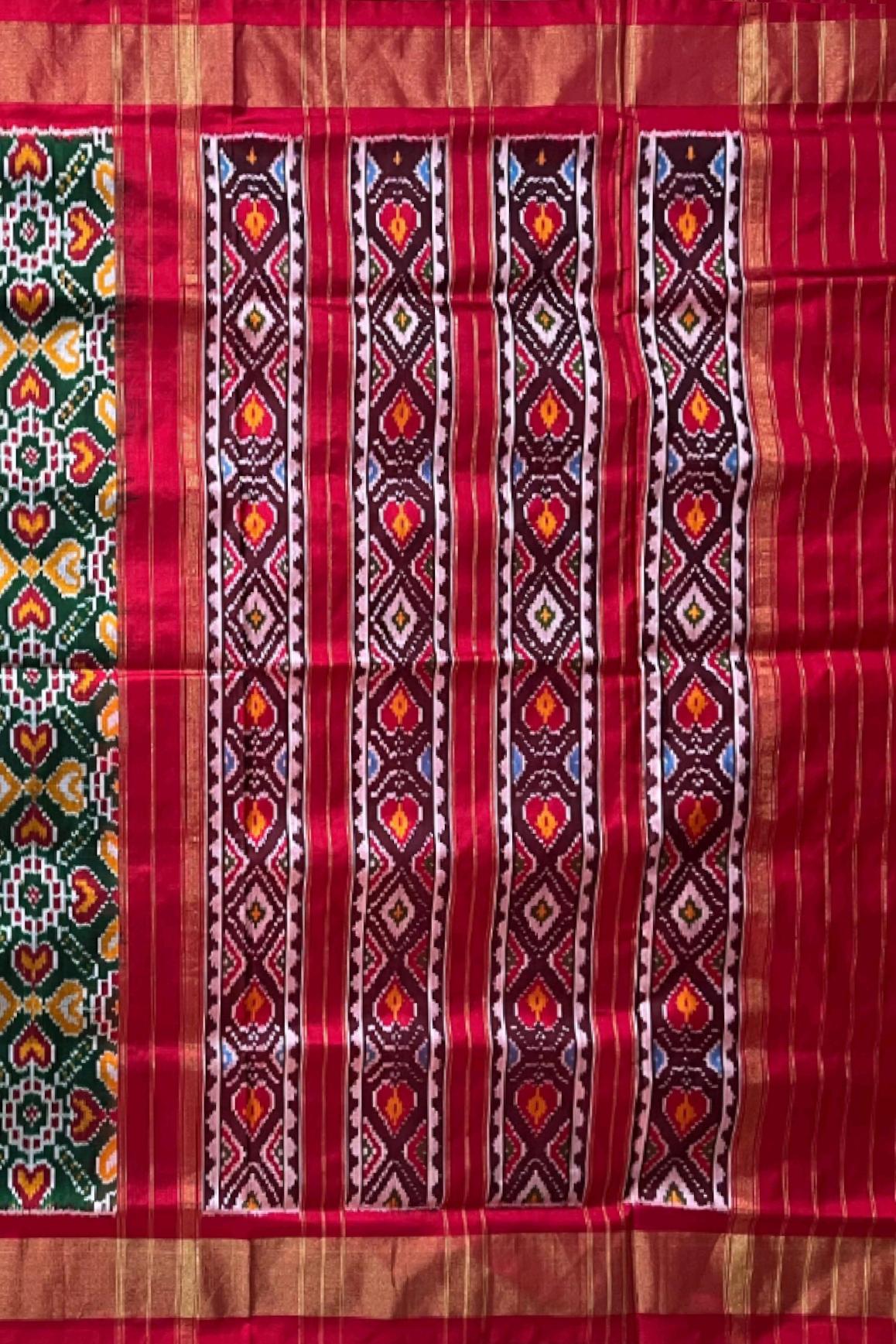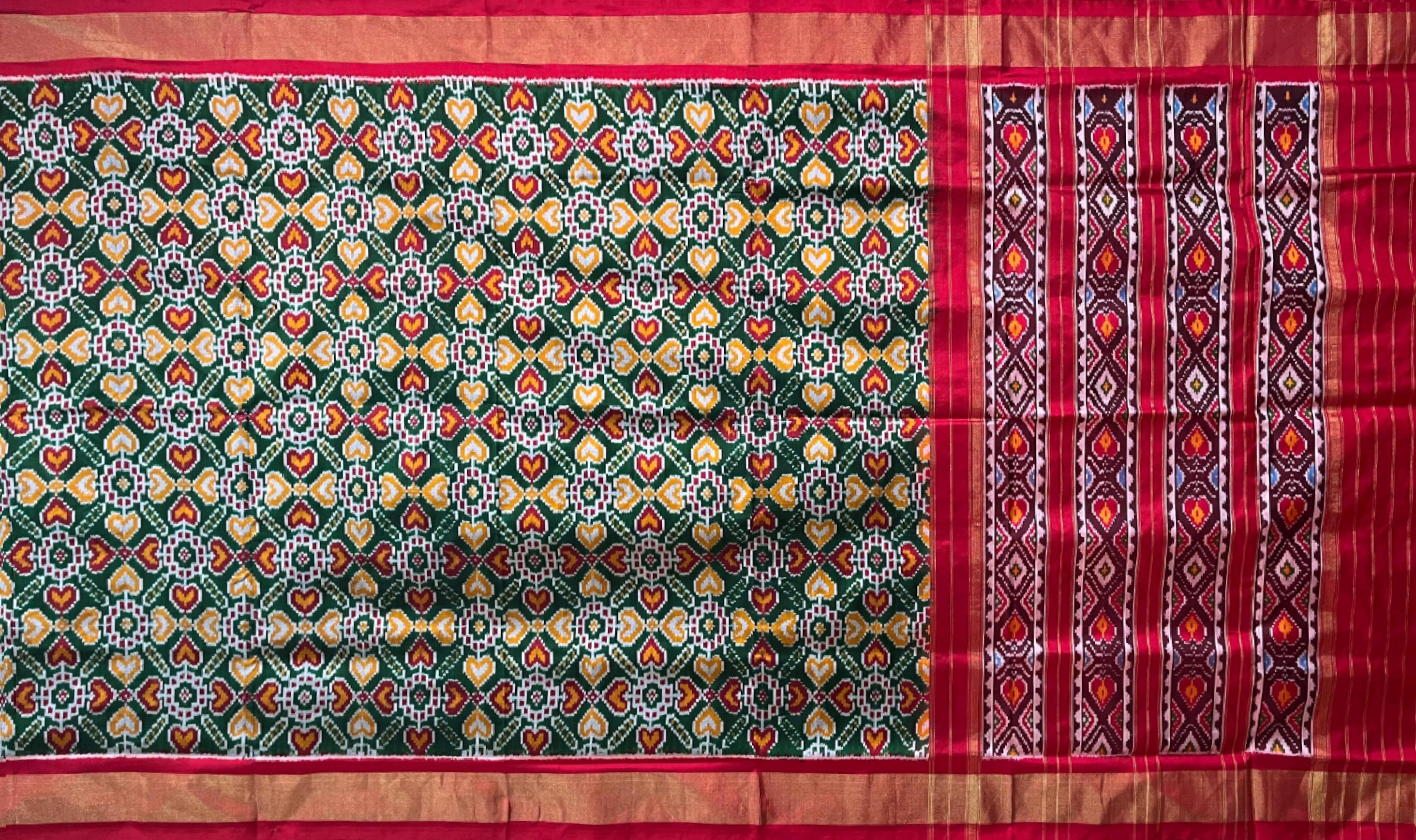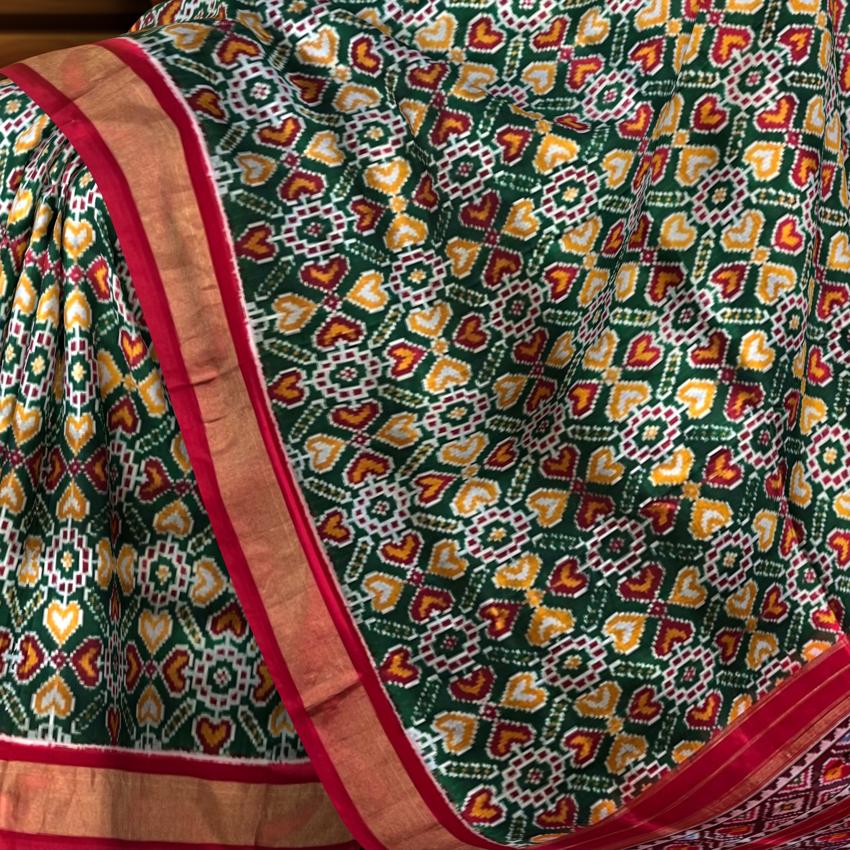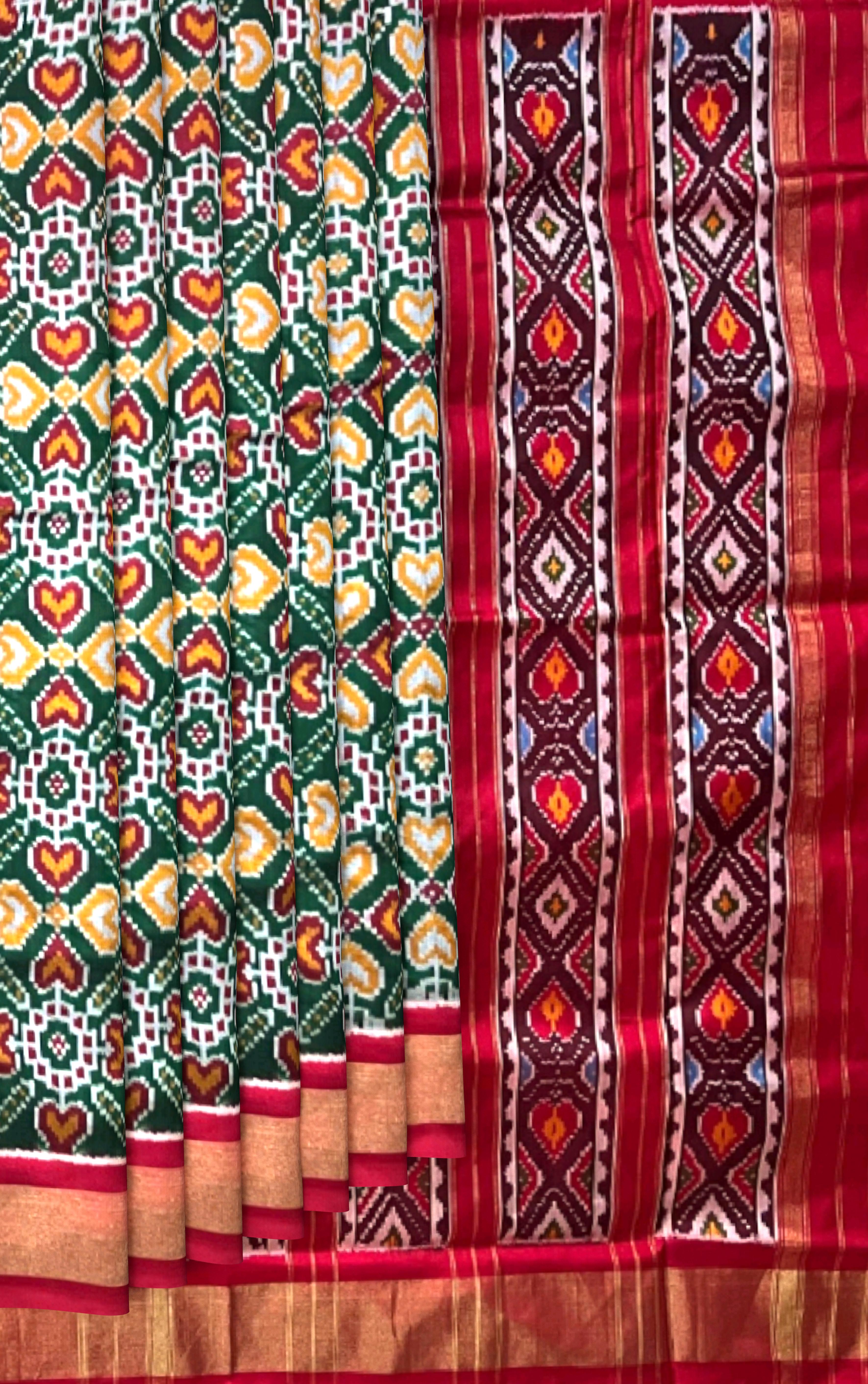 Classic and festive, the Green Pochampally Ikat Saree features a rich green body highlighted by a bold red border and pallu. This traditional color pairing is deeply rooted in Indian culture, symbolizing prosperity, fertility, and celebration. The intricate ikat patterns woven into the fabric further enrich its cultural essence. Originating from Pochampally, Telangana, this saree is woven using the intricate double ikat method. The careful alignment of pre-dyed yarns forms symmetrical motifs that often represent elements of nature and spirituality. The green and red combination is especially favored during festivals and auspicious ceremonies. Perfect for weddings, temple visits, and festive events, this saree pairs best with a red or gold blouse. Complement the ensemble with temple jewelry, gold bangles, and a statement necklace for a complete traditional look. Note: The appearance of the product’s colors may vary due to lighting conditions or your device’s screen calibration. For further assistance or additional images/videos, feel free to contact us at +91 97897 60367 / +1 (945) 308-5962 or email at wecare@thesudeshiweaving.com.