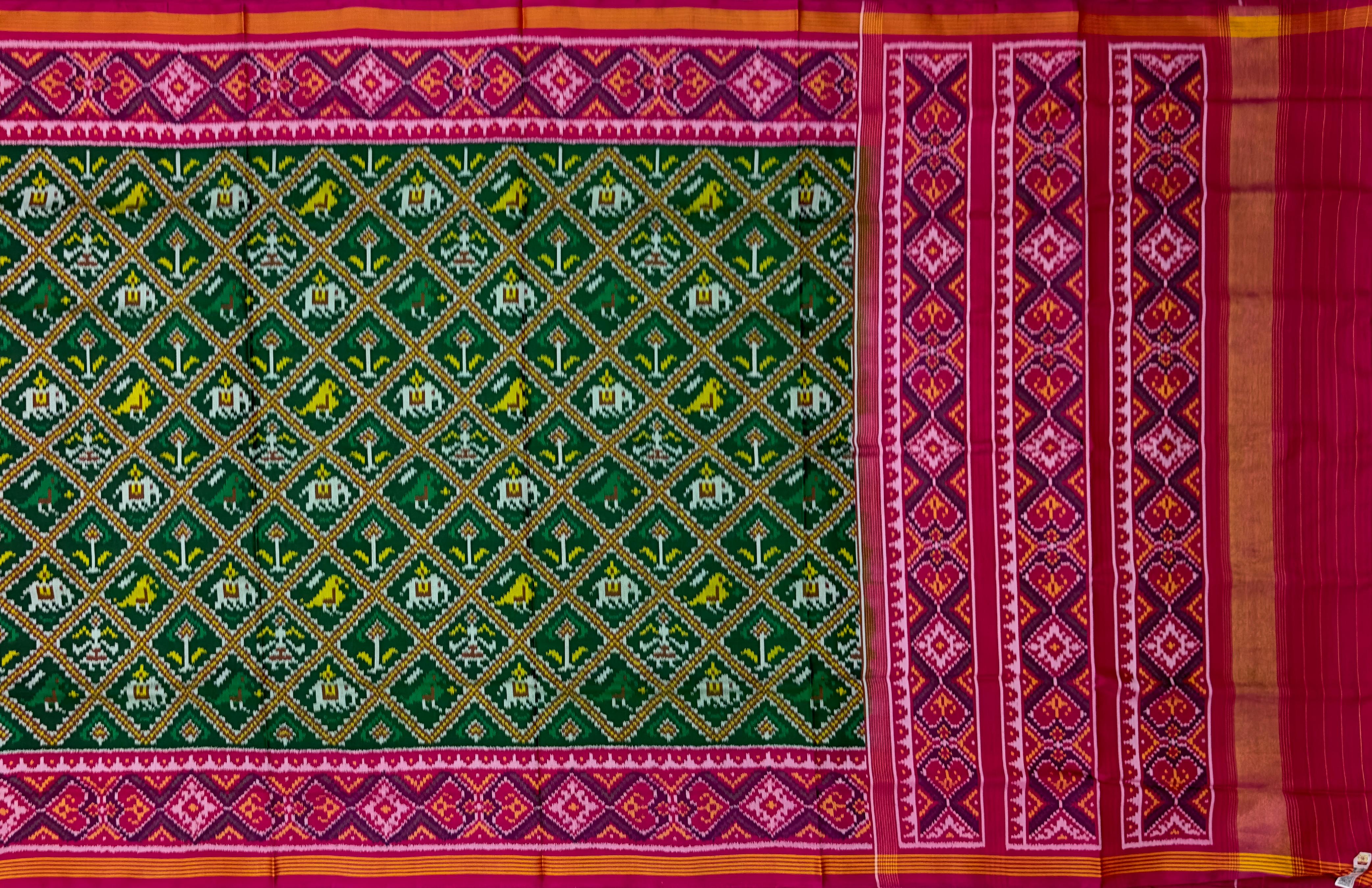 The Green Semi Patan Saree showcases the 'Sankli Narikunjar' design with a vibrant pink pallu. It's a fusion of classic and contemporary, perfect for gatherings that call for a distinctive, stylish ensemble.