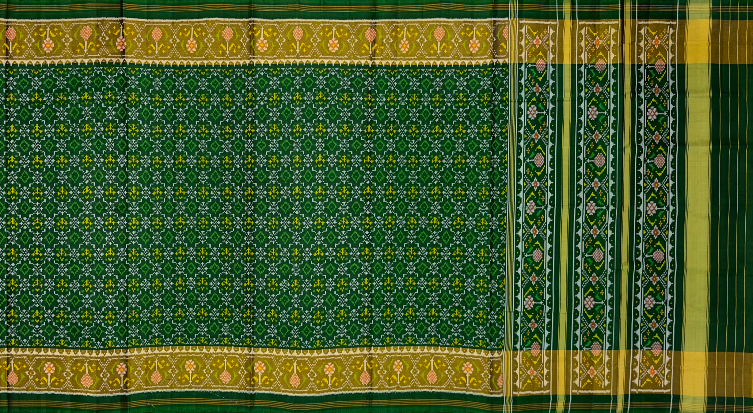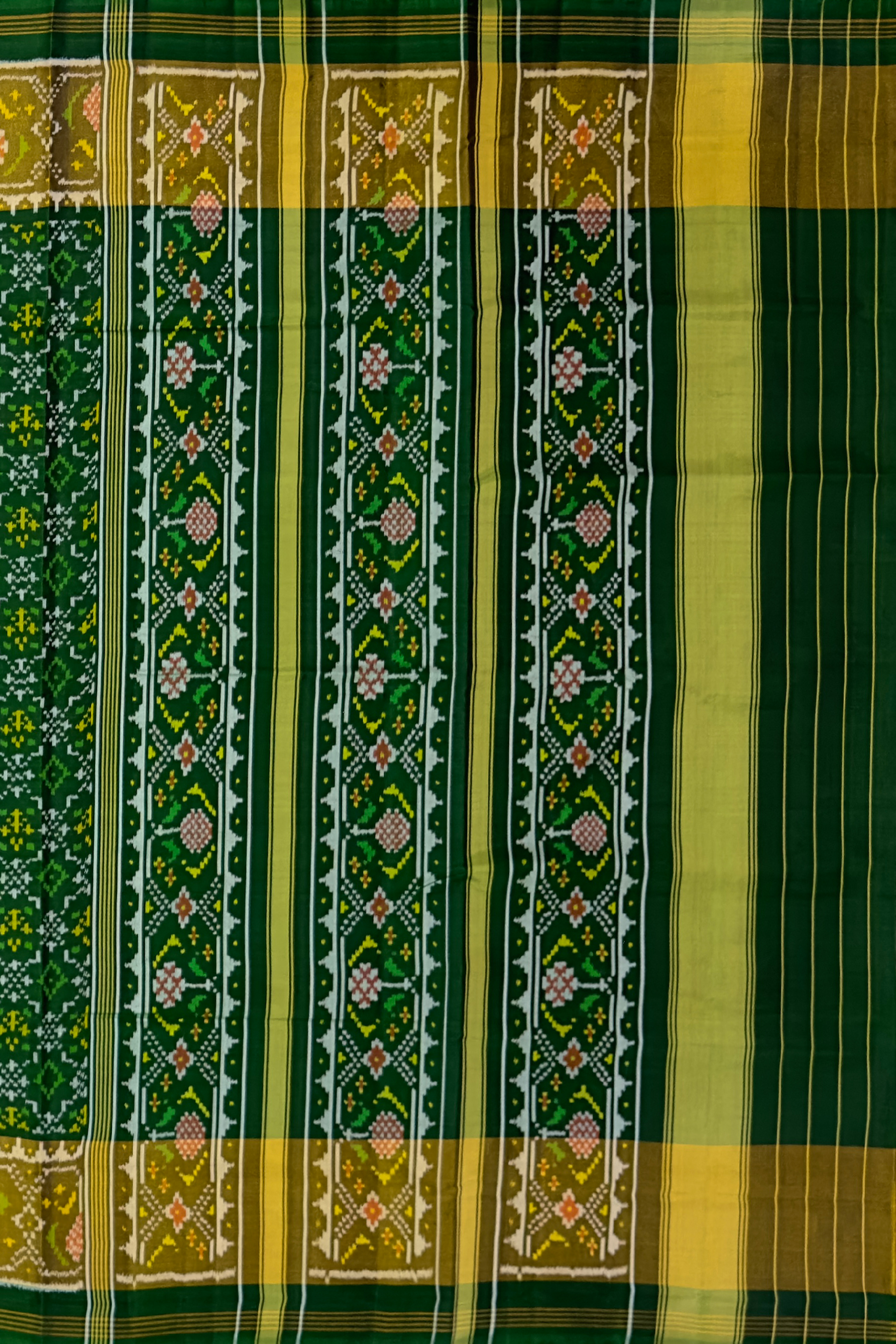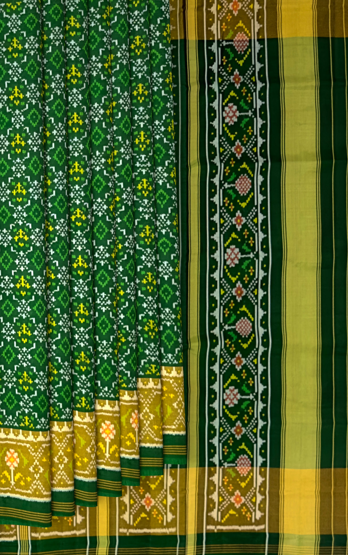 The Button Phool design, featuring delicate floral motifs, is a classic pattern in the Rajkot Patola sarees. Each motif is meticulously woven, reflecting the skilled craftsmanship and attention to detail that goes into creating these masterpieces. The rich green hue of the saree, combined with the luxurious Lagadi Patti Jari work, makes it ideal for weddings, festive celebrations, and cultural events.
