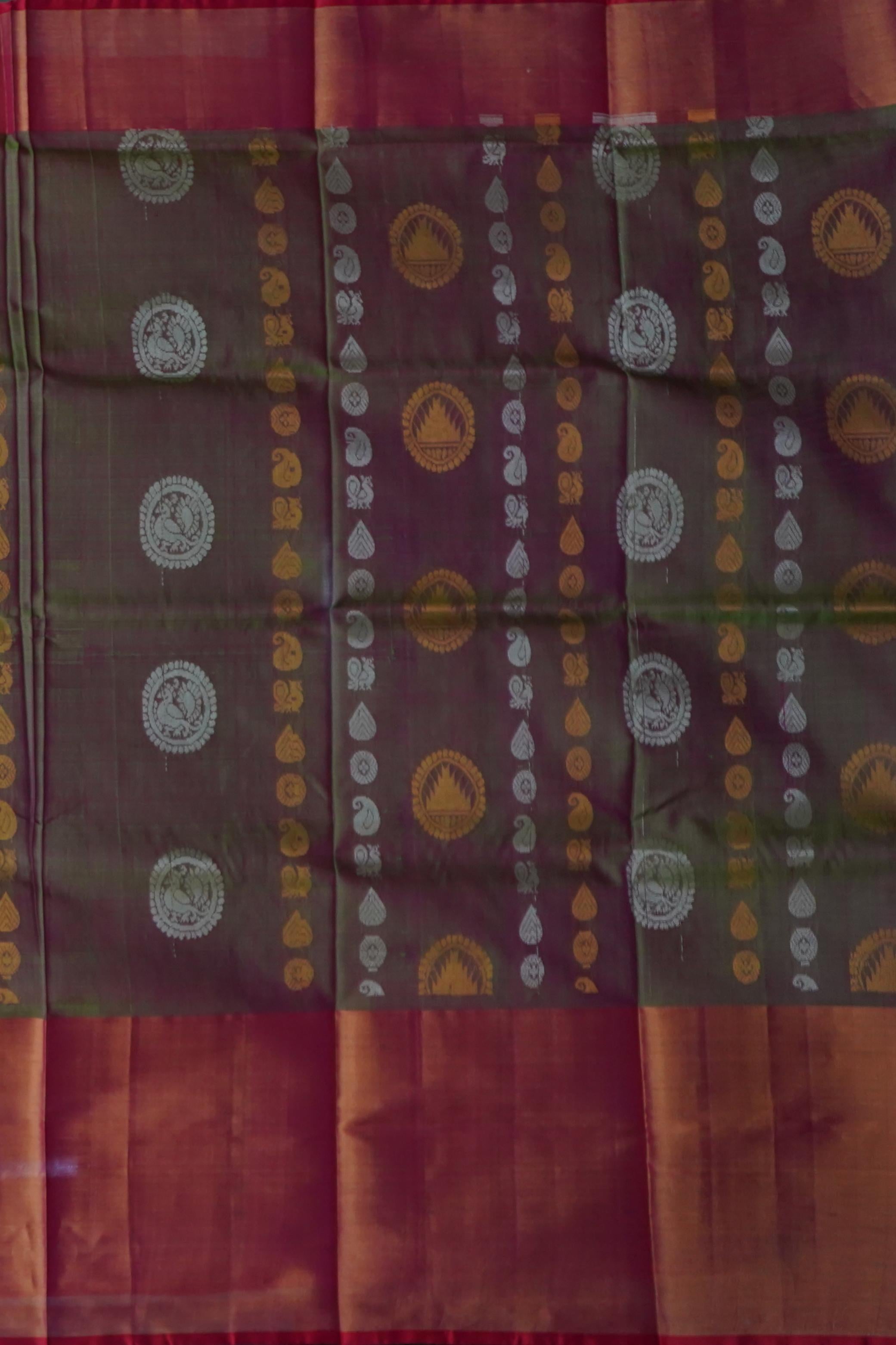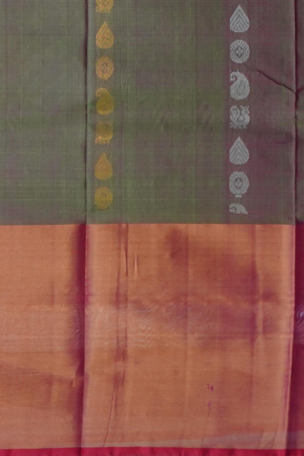 This Green Uppada Saree offers an exquisite combination of freshness and elegance. The lush green body is enhanced by a contrasting pink pallu and the intricate gold and blue buttas, creating a beautiful contrast. The delicate buttas, which symbolize wealth and prosperity, add a touch of refinement to this traditional piece.