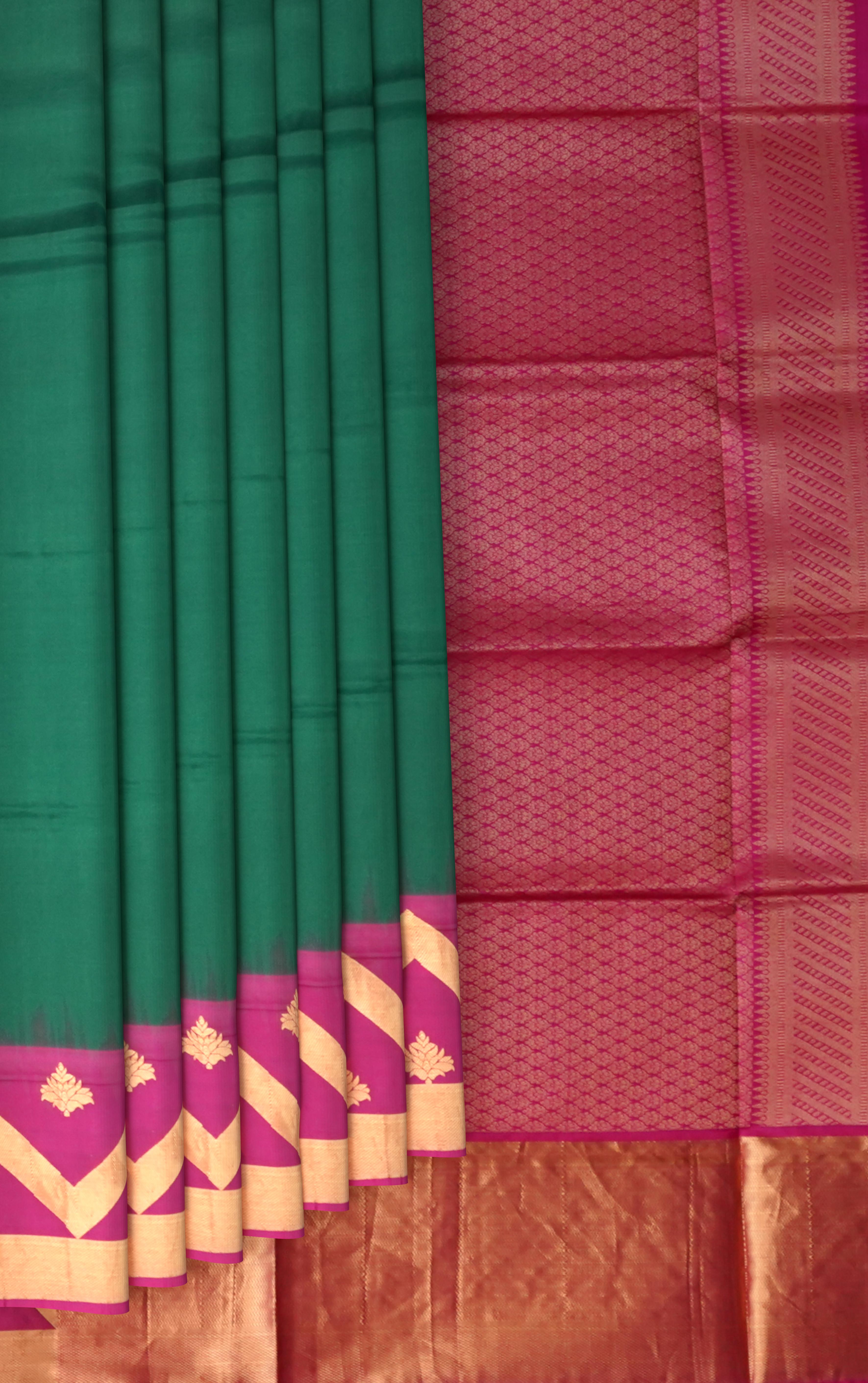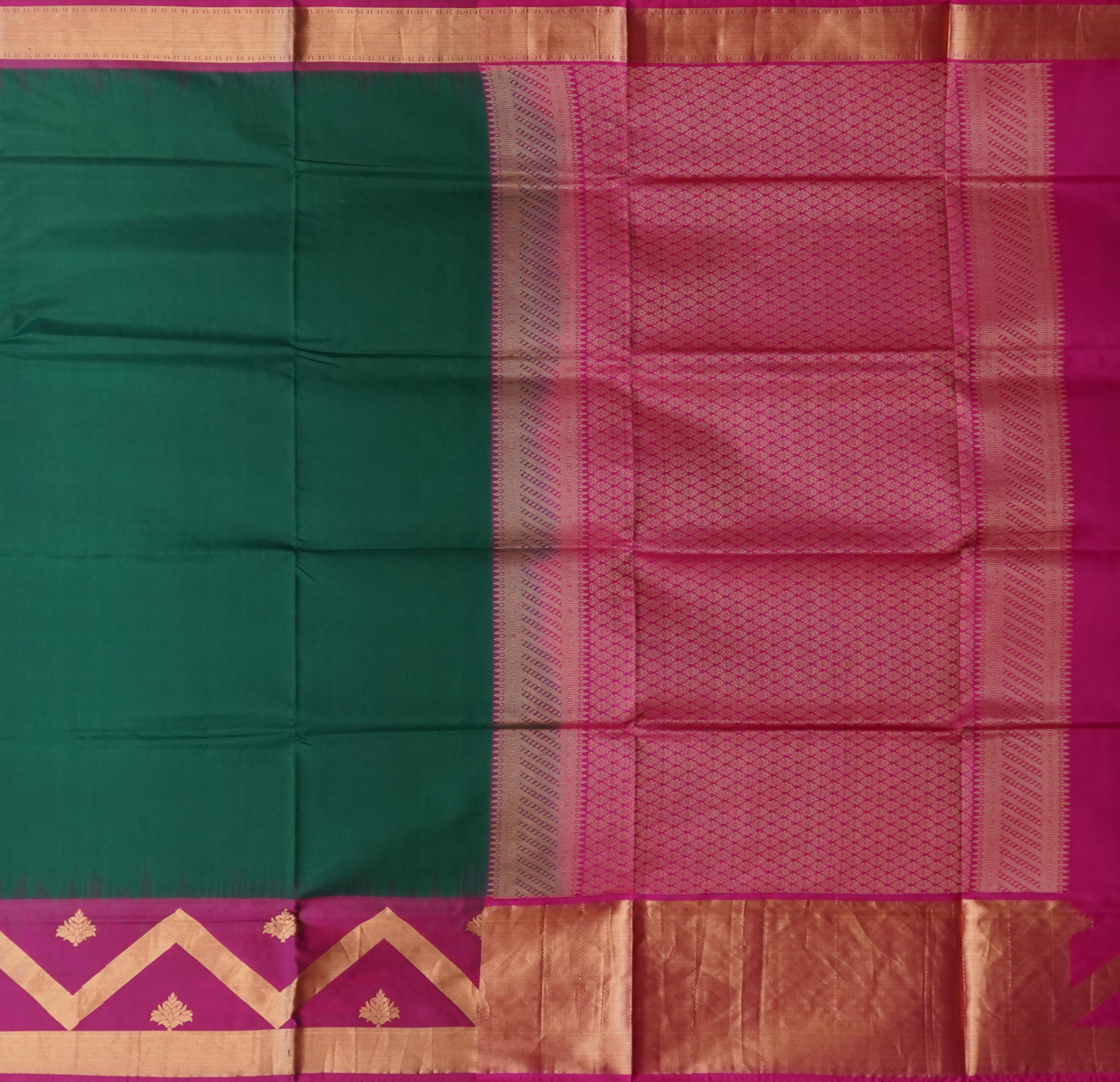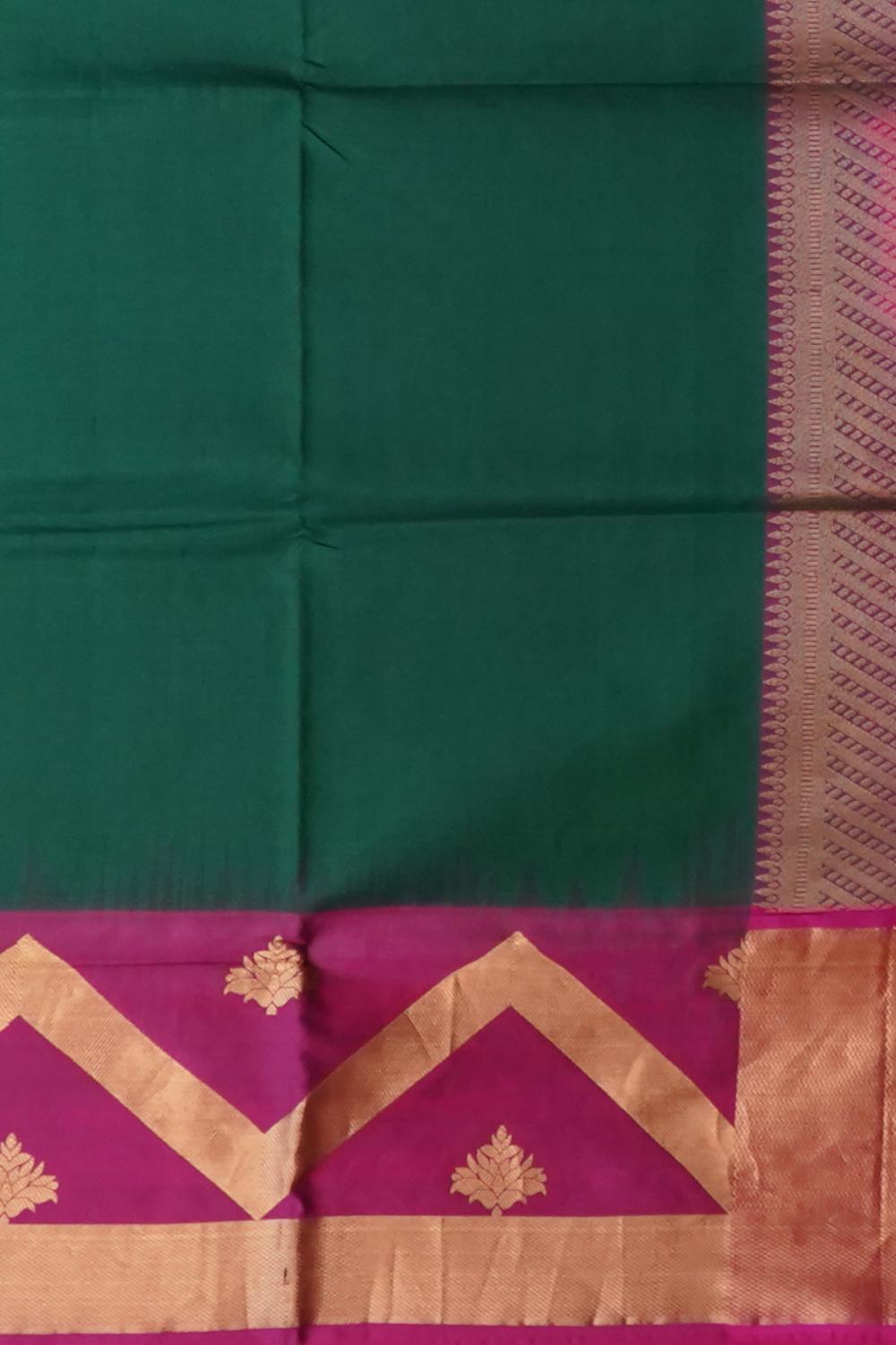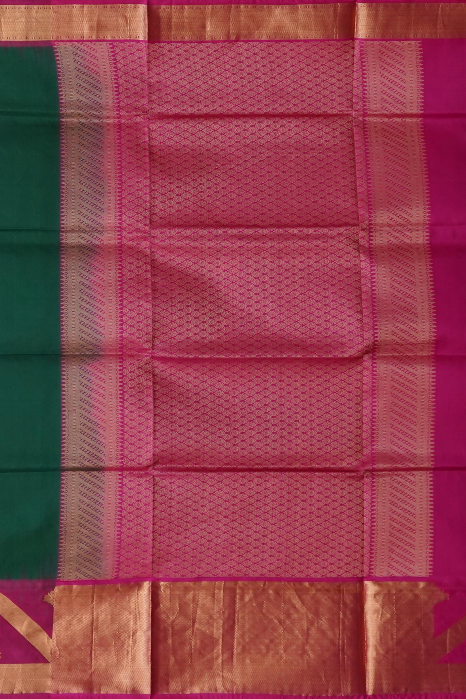 Simplicity and elegance define this Green Uppada Saree, featuring a solid green body complemented by a soft pink pallu. The minimalist design emphasizes the beauty of the fabric, while the pink pallu adds a touch of femininity and grace. This saree is perfect for those who appreciate understated beauty with a classic appeal.