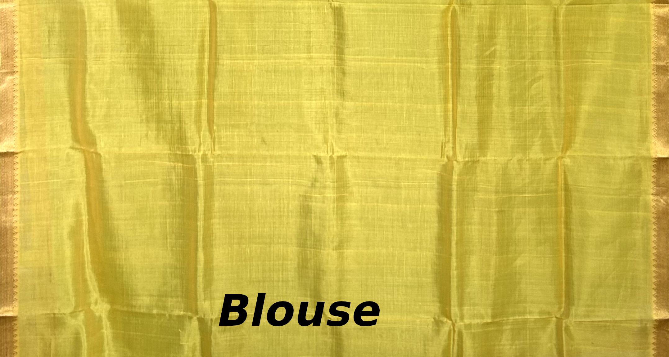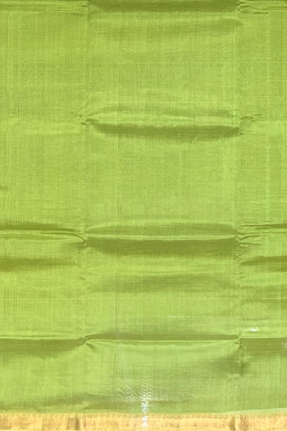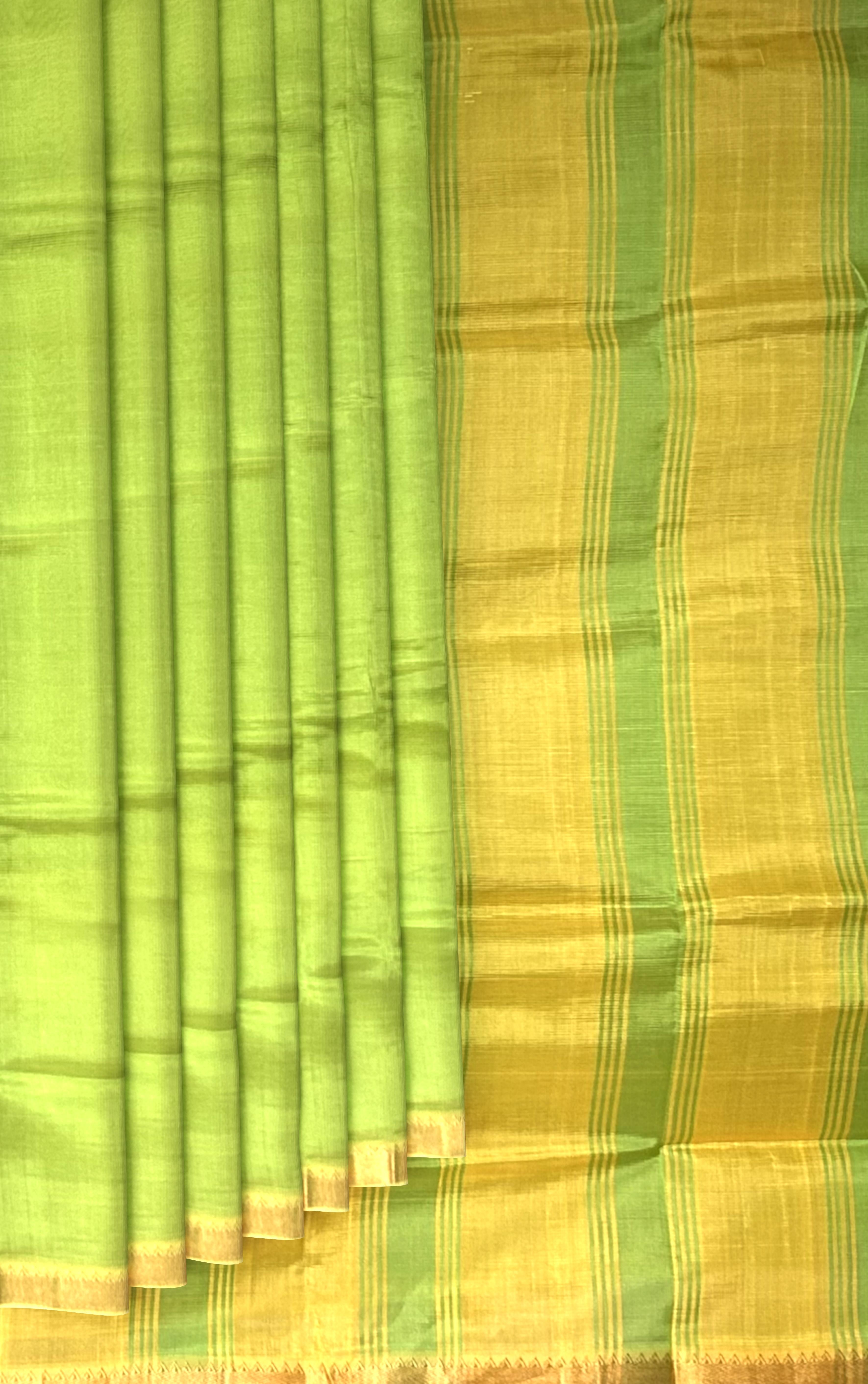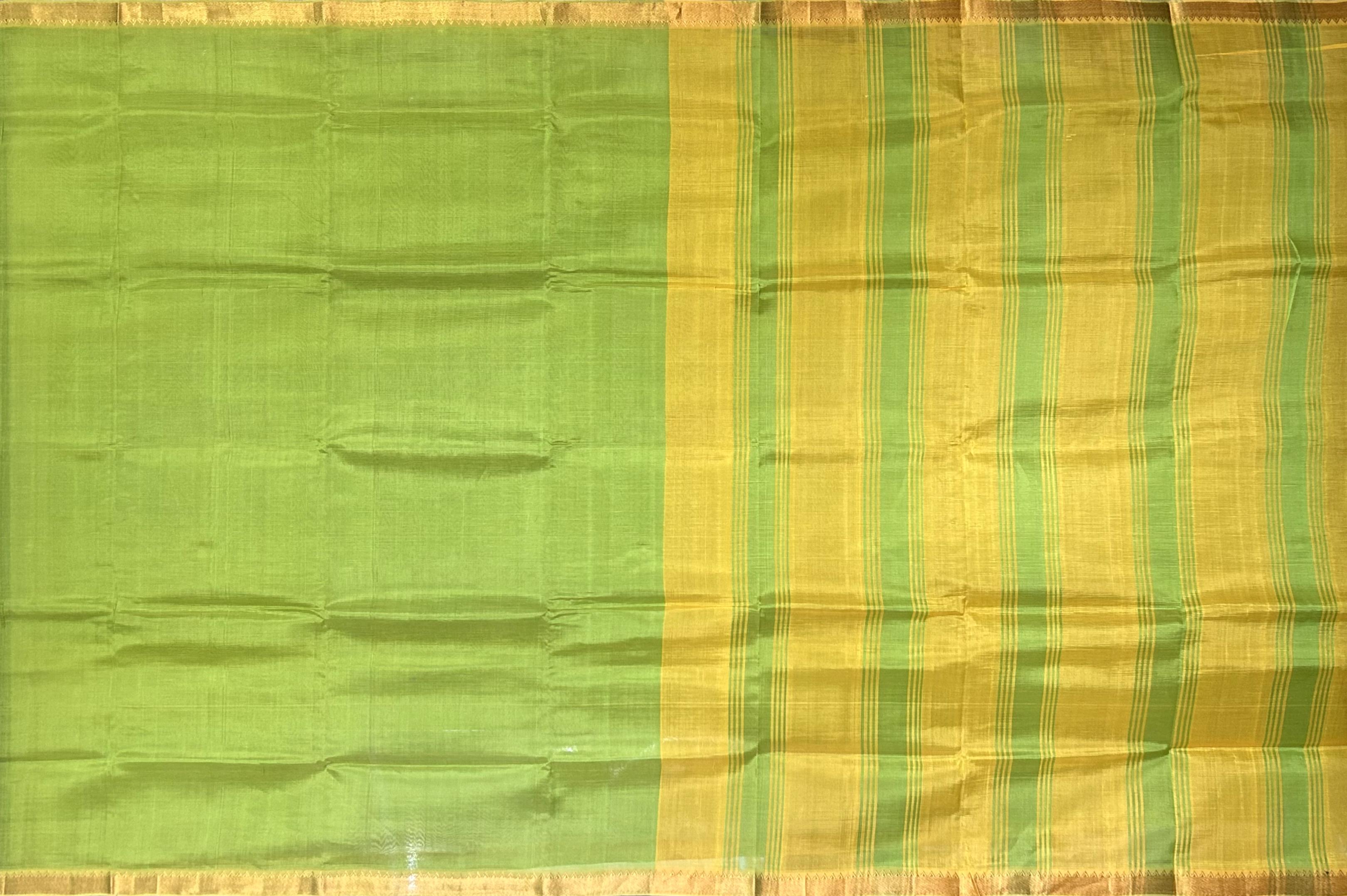 Experience the vibrant charm of this Green Yellow Gold Mangalagiri saree, featuring a plain design. The single-side design adds a touch of playfulness, while the gold accents create a luxurious ambiance.