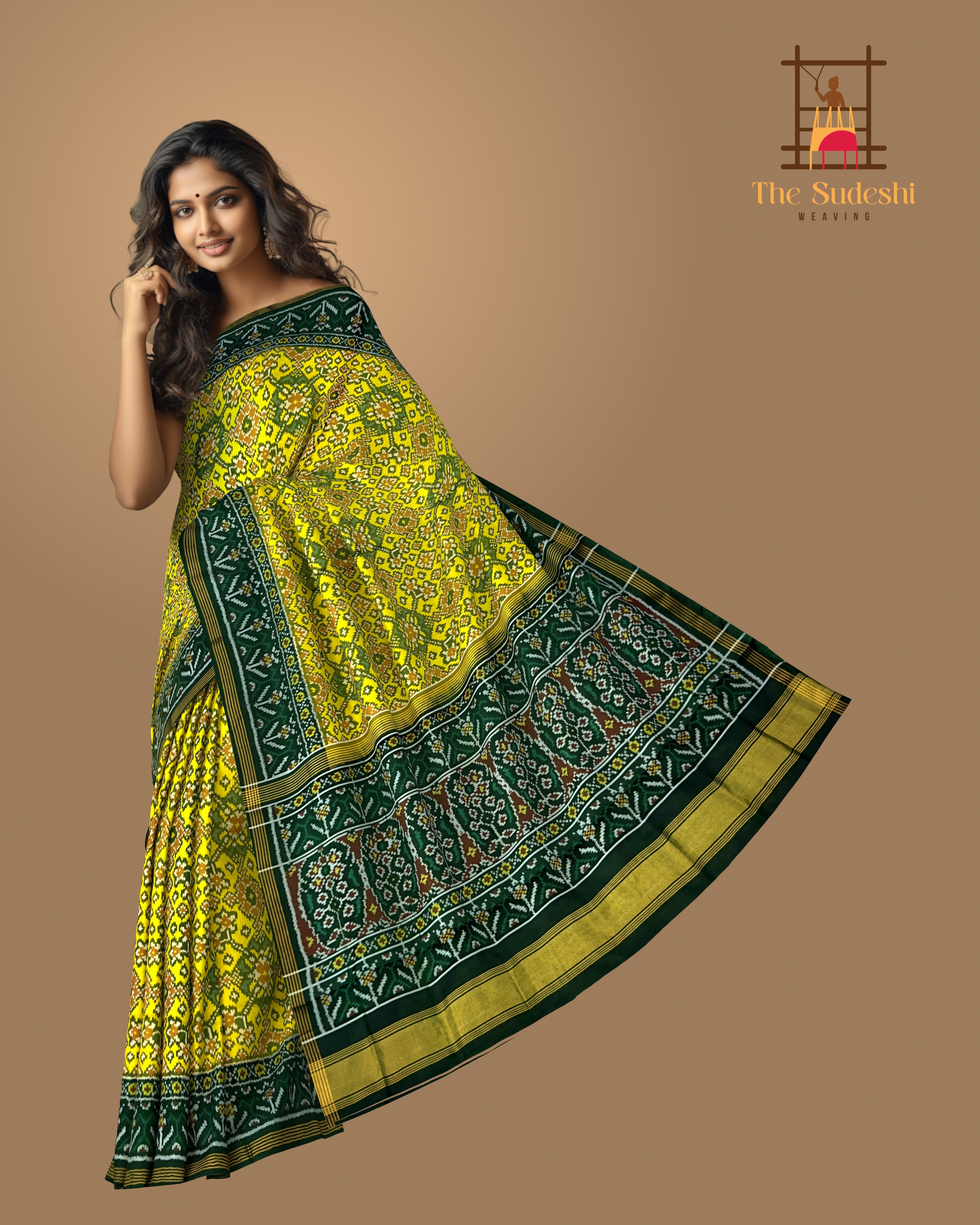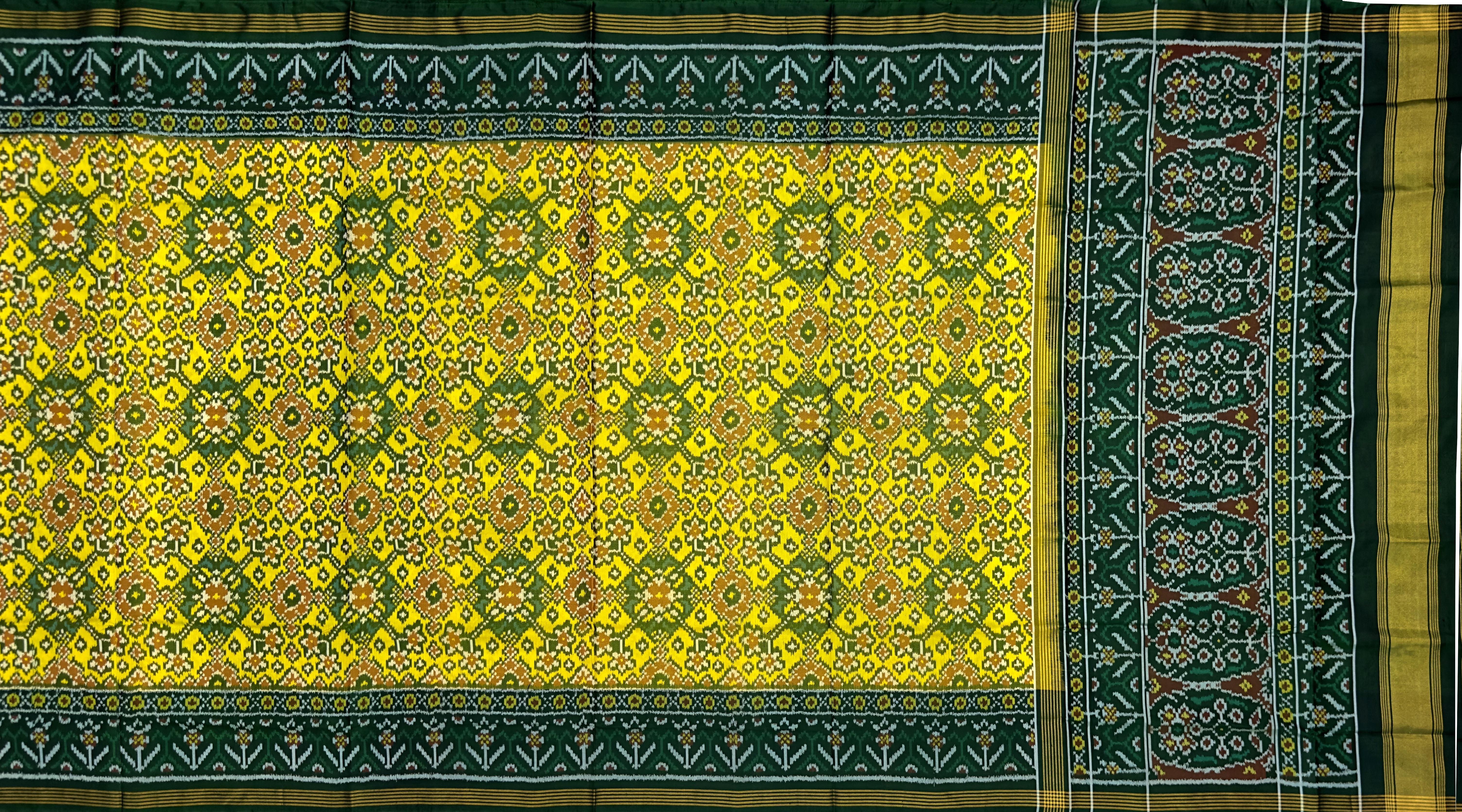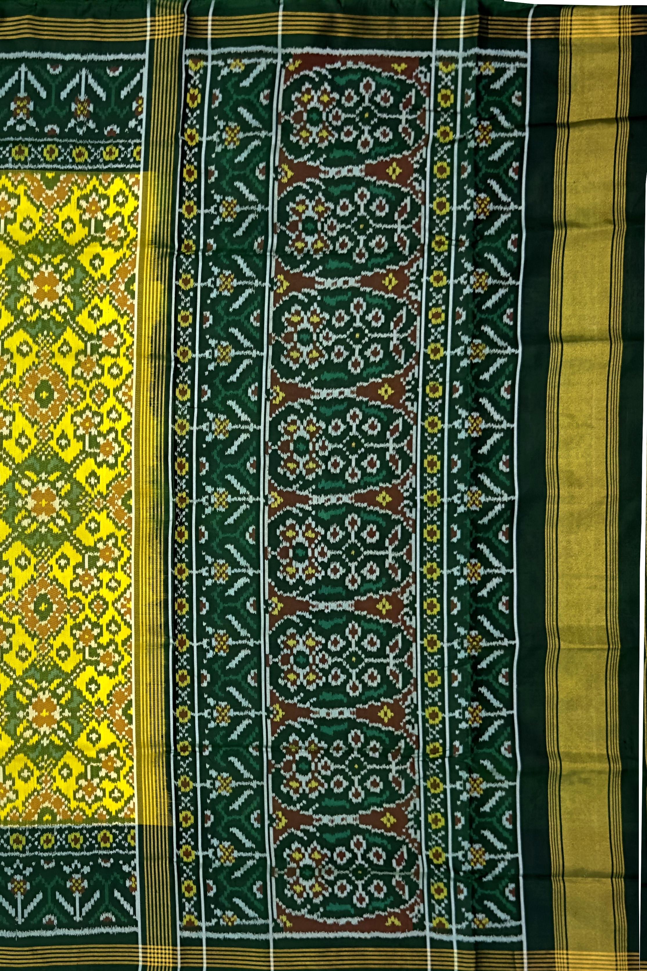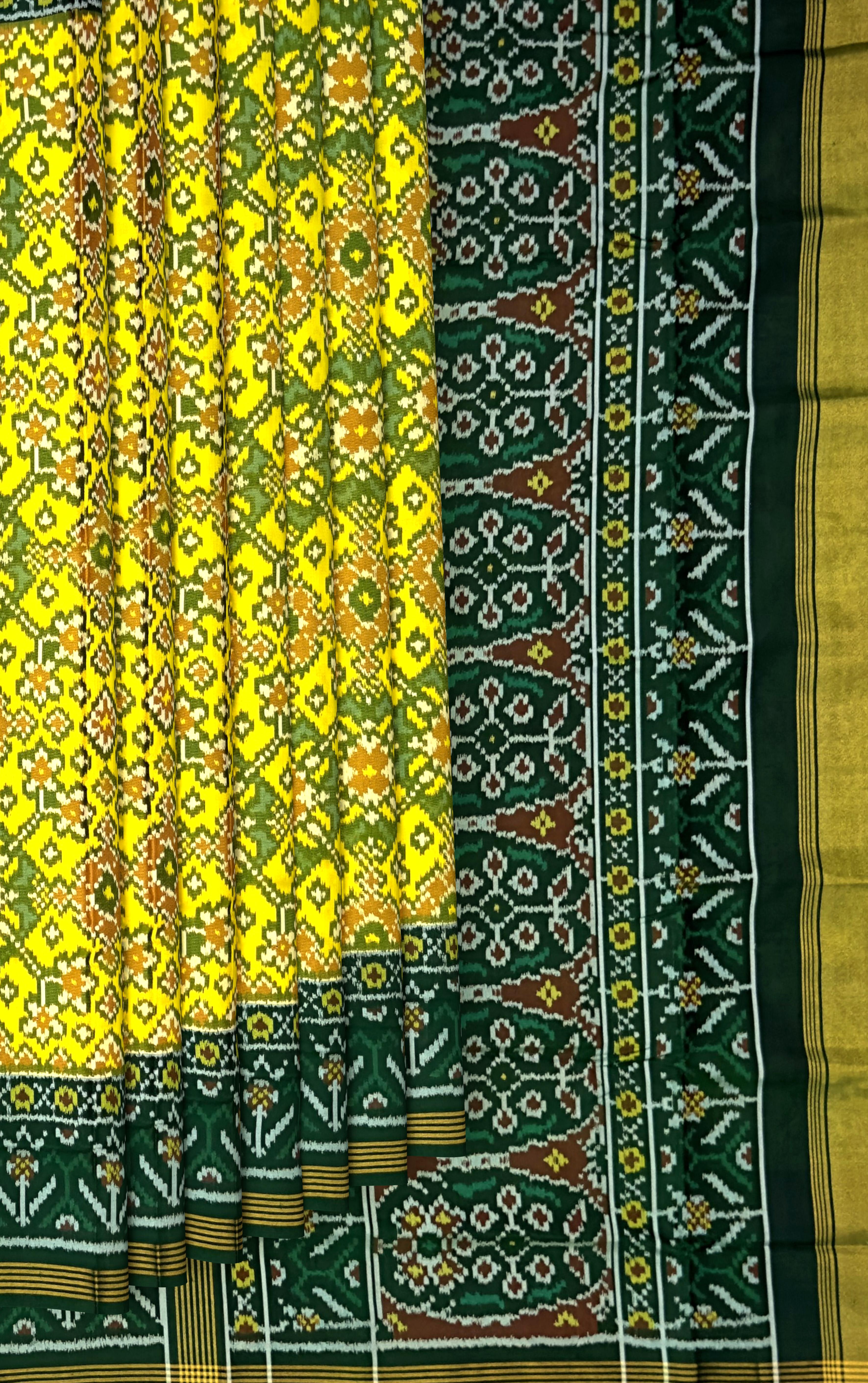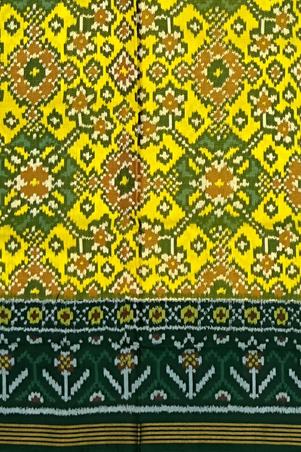 This stunning Green Yellow Single Ikat Semi Patan Patola Saree is a vibrant and beautiful piece. The saree features a beautiful Navratna design, intricately woven in Green Yellow hues.