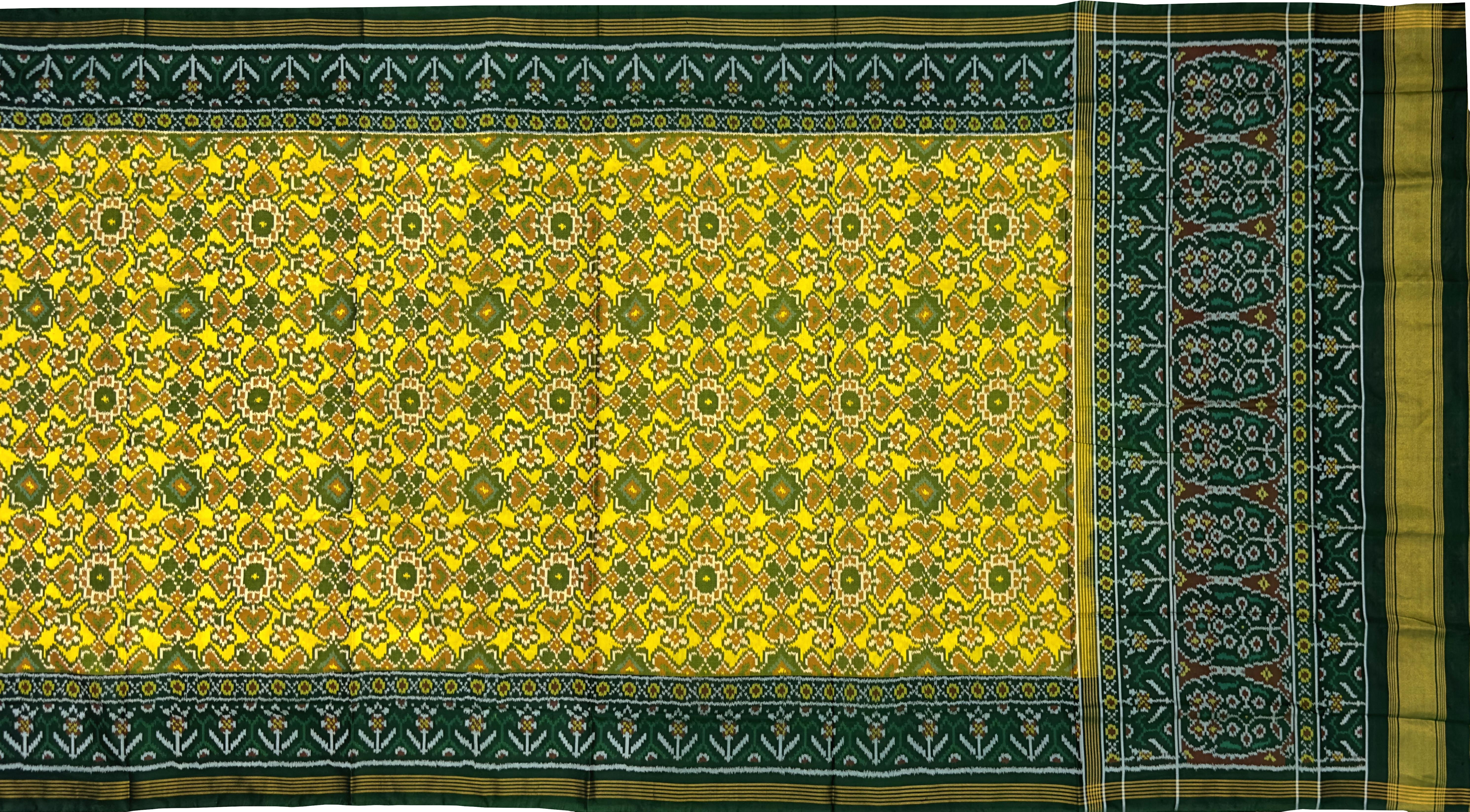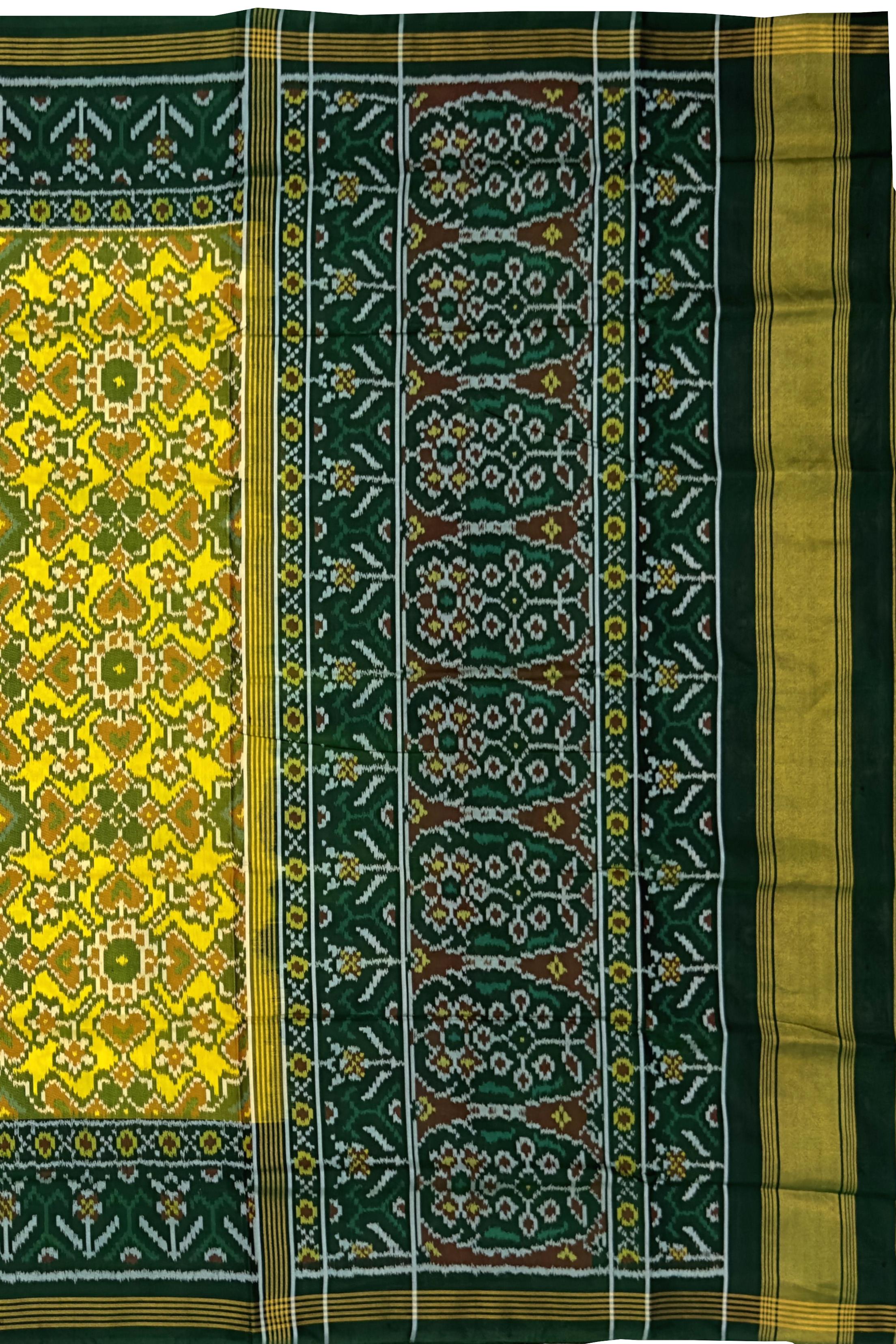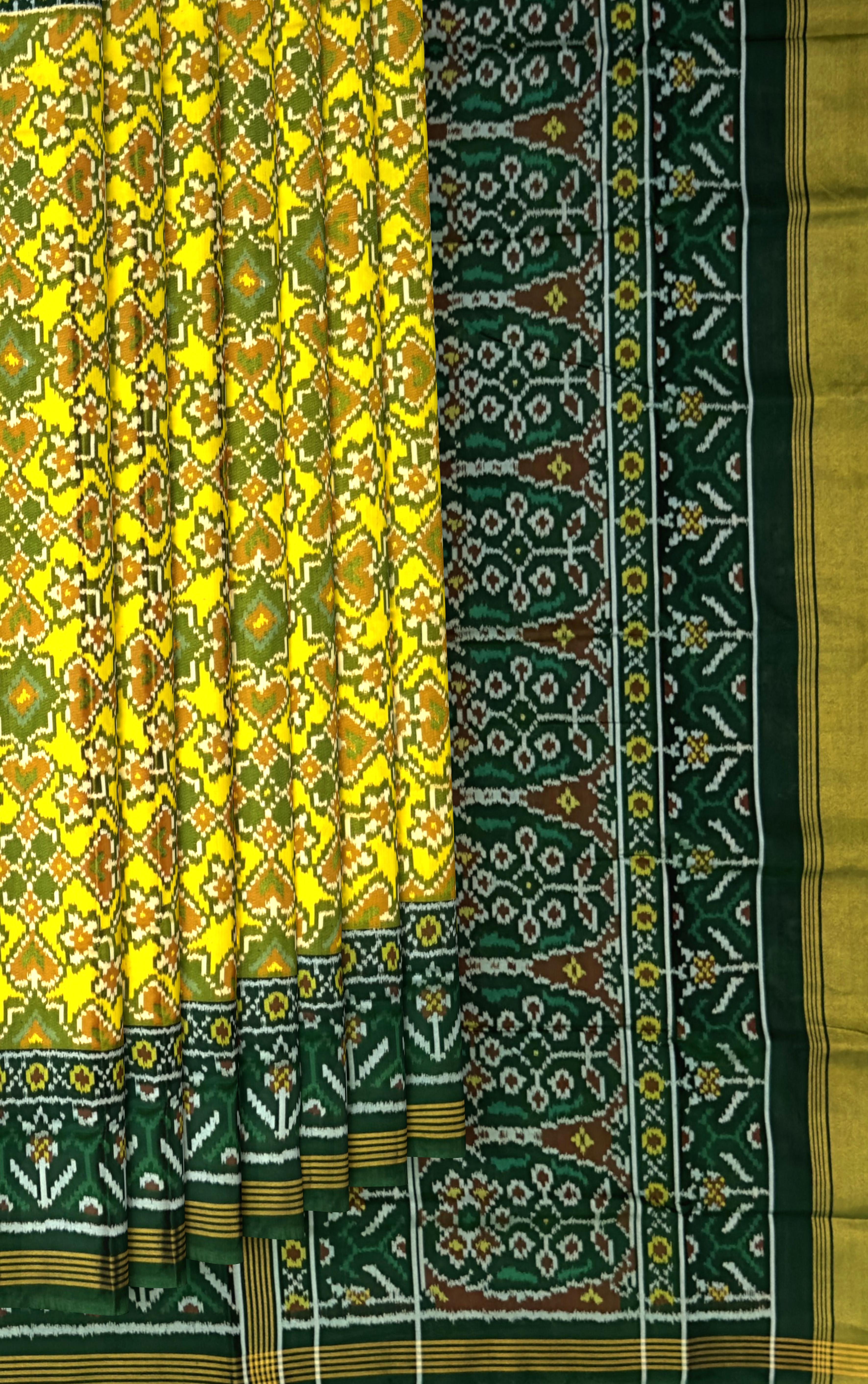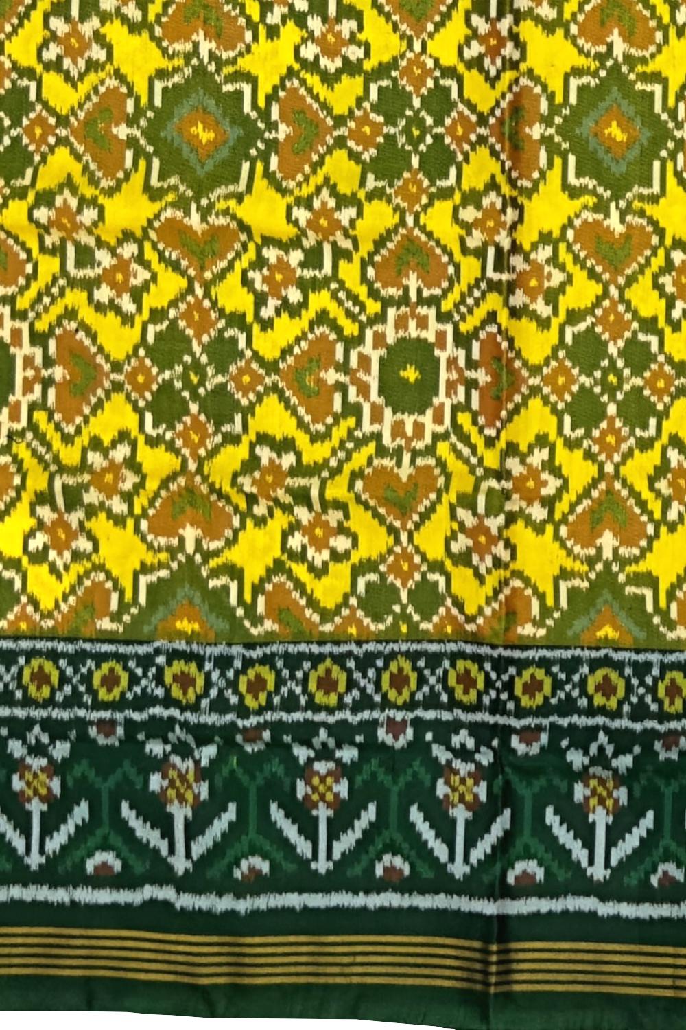 This stunning Green Yellow Single Ikat Semi Patan Patola Saree is a vibrant and beautiful piece. The saree features a beautiful Navratna + Manekchowk design, intricately woven in Green Yellow hues.