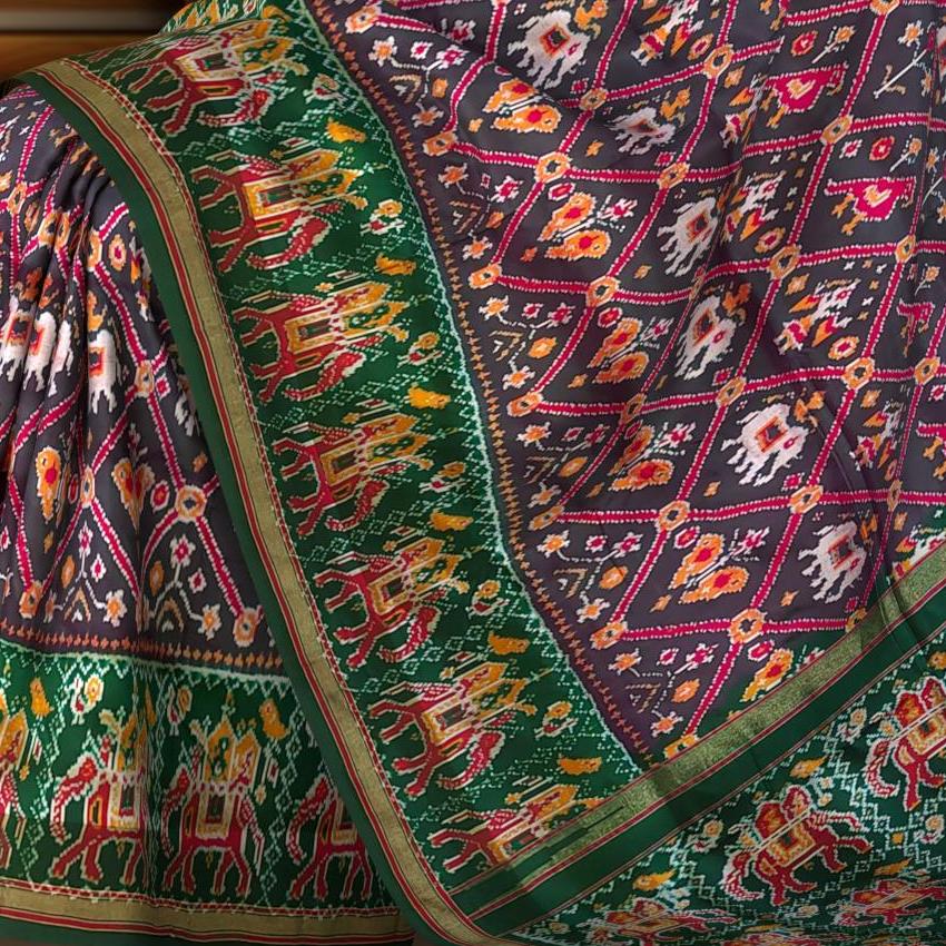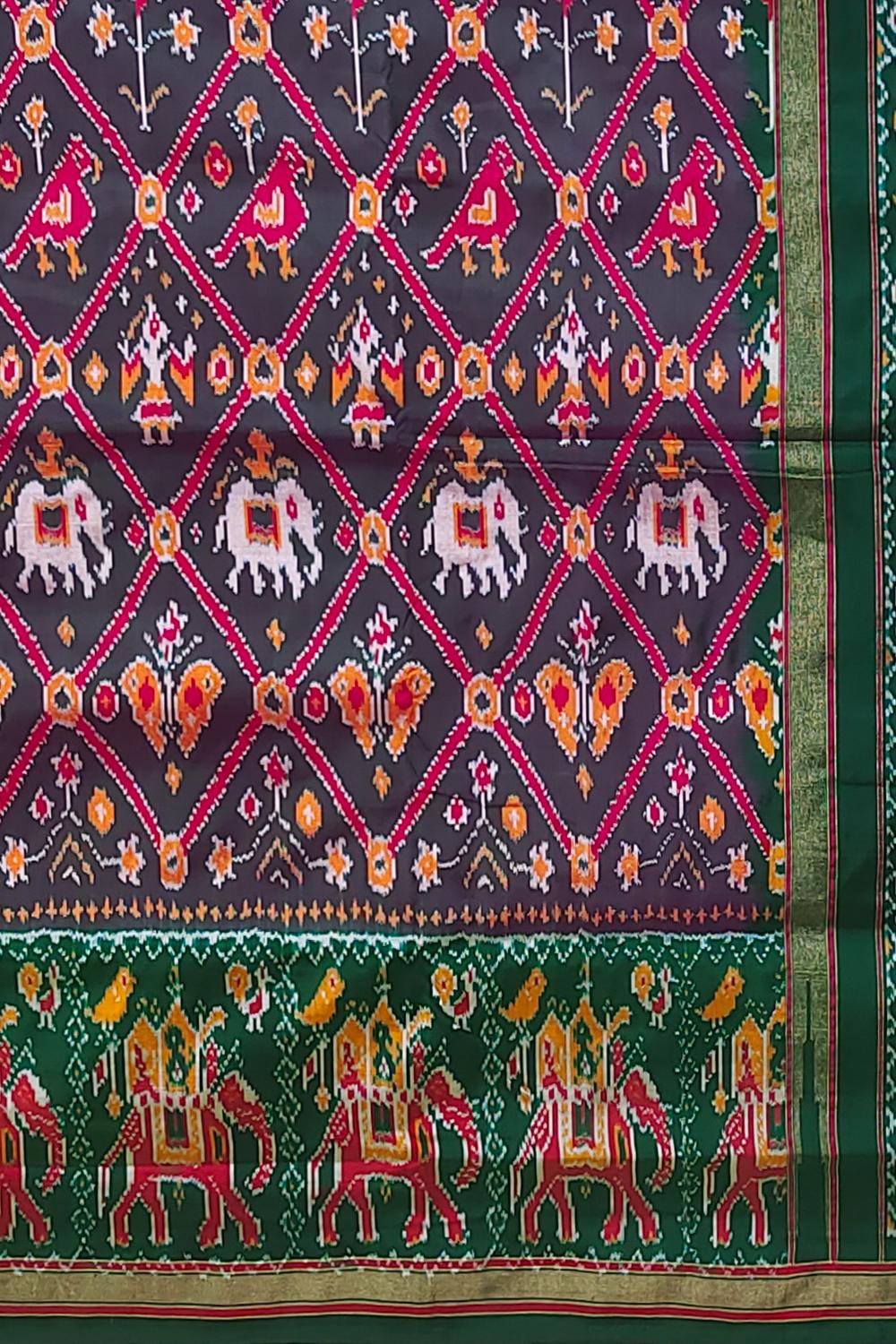 Adorn yourself in the understated elegance of our Grey and Bottle Green Narikunju Pochampally Saree. The thick grey body is perfectly complemented by a bottle green pallu and blouse, creating a sophisticated and classic look. This saree, featuring the Narikunju with Ambari border design, is ideal for casual wear, festivals, and social events, making it a versatile addition to your wardrobe.