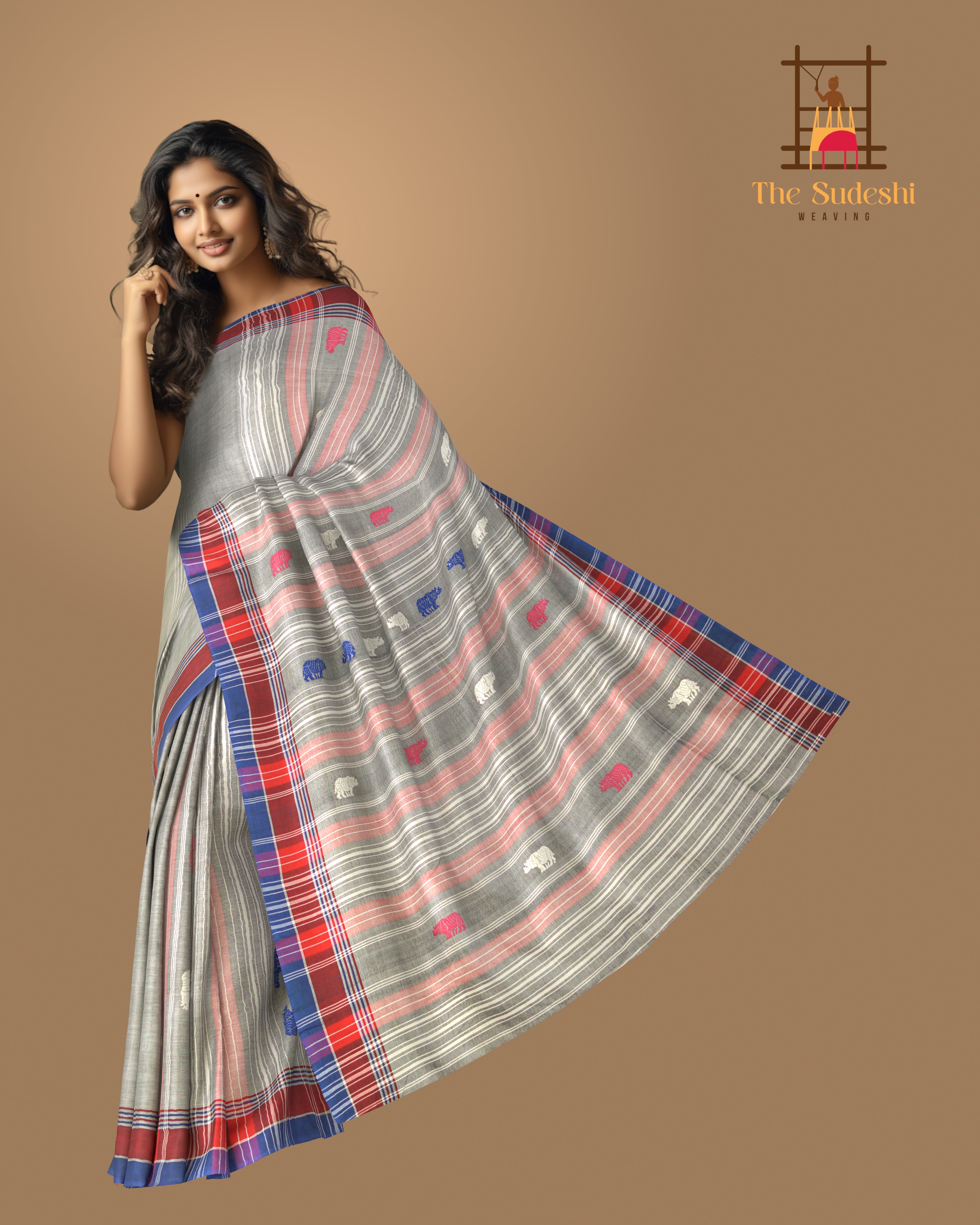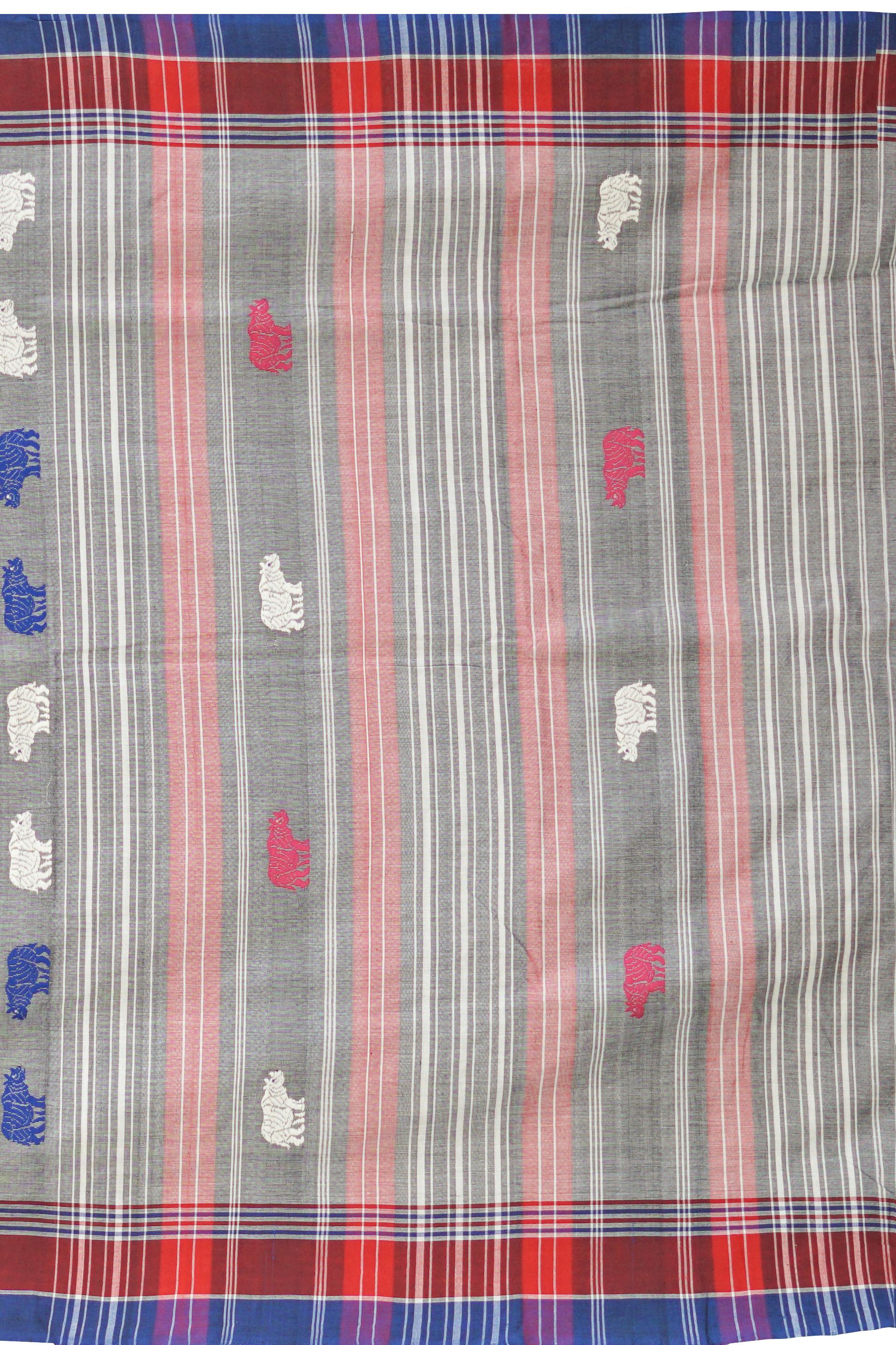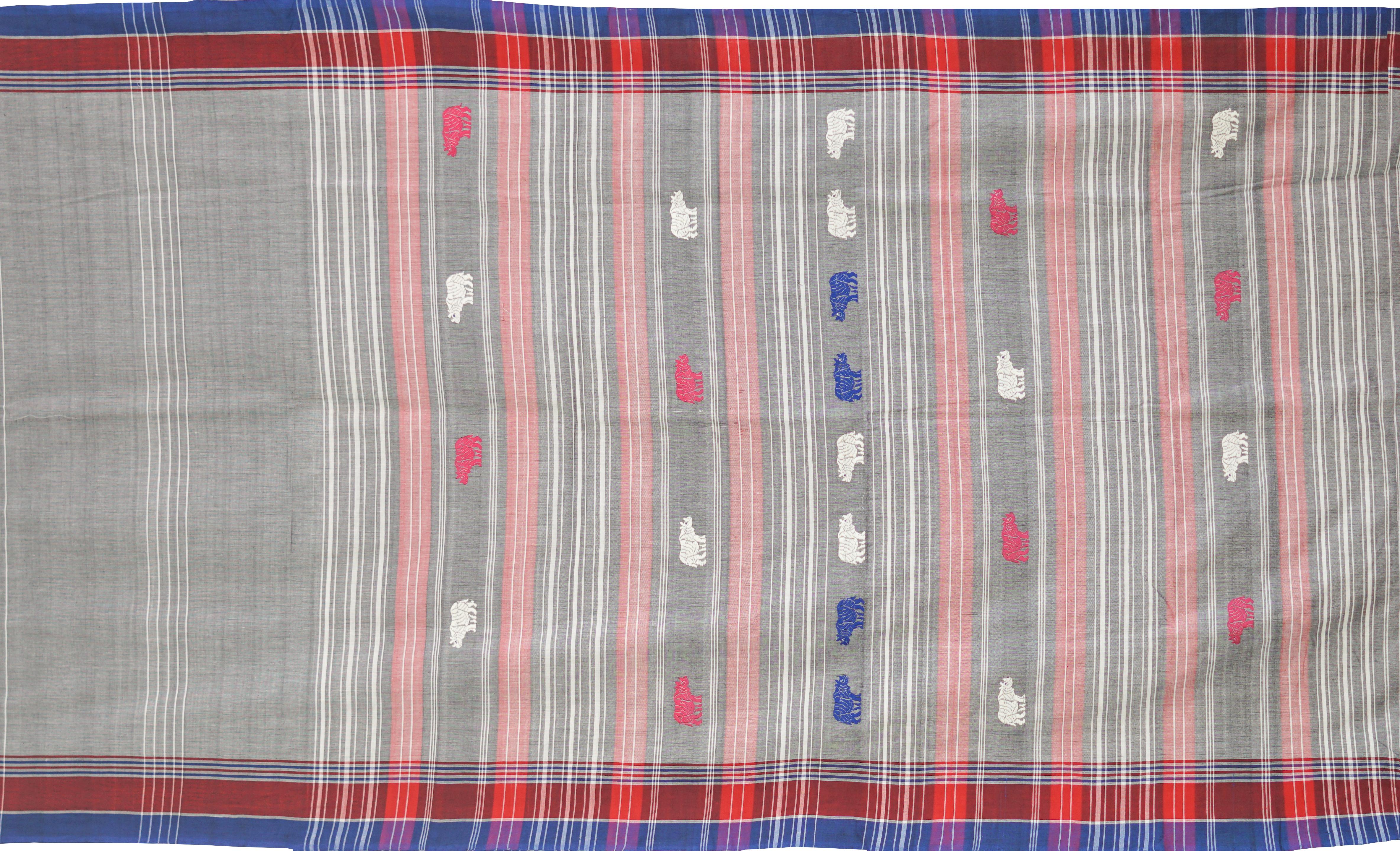 The motifs on this saree are inspired by Assamese culture and nature, featuring geometric and stylized patterns that symbolize flowers, plants, and traditional artifacts. These motifs, woven using the extra-weft technique, add a raised, embossed effect that enhances the saree's texture and depth. The combination of grey and blue is both sophisticated and modern, appealing to women of all ages.