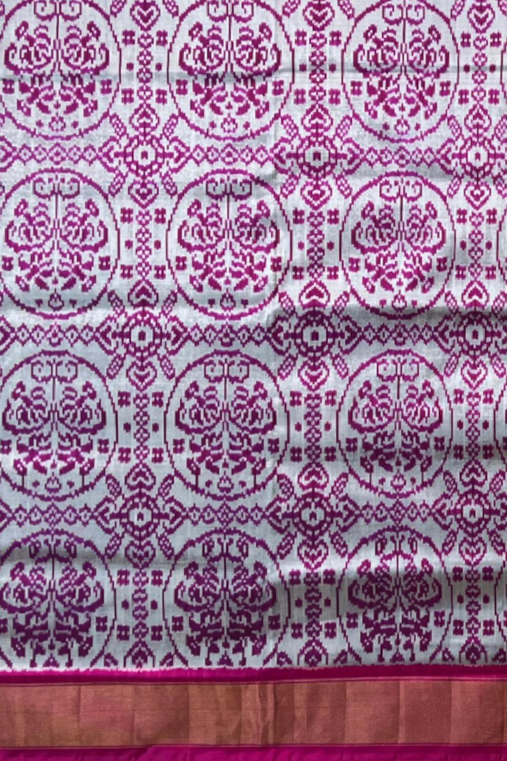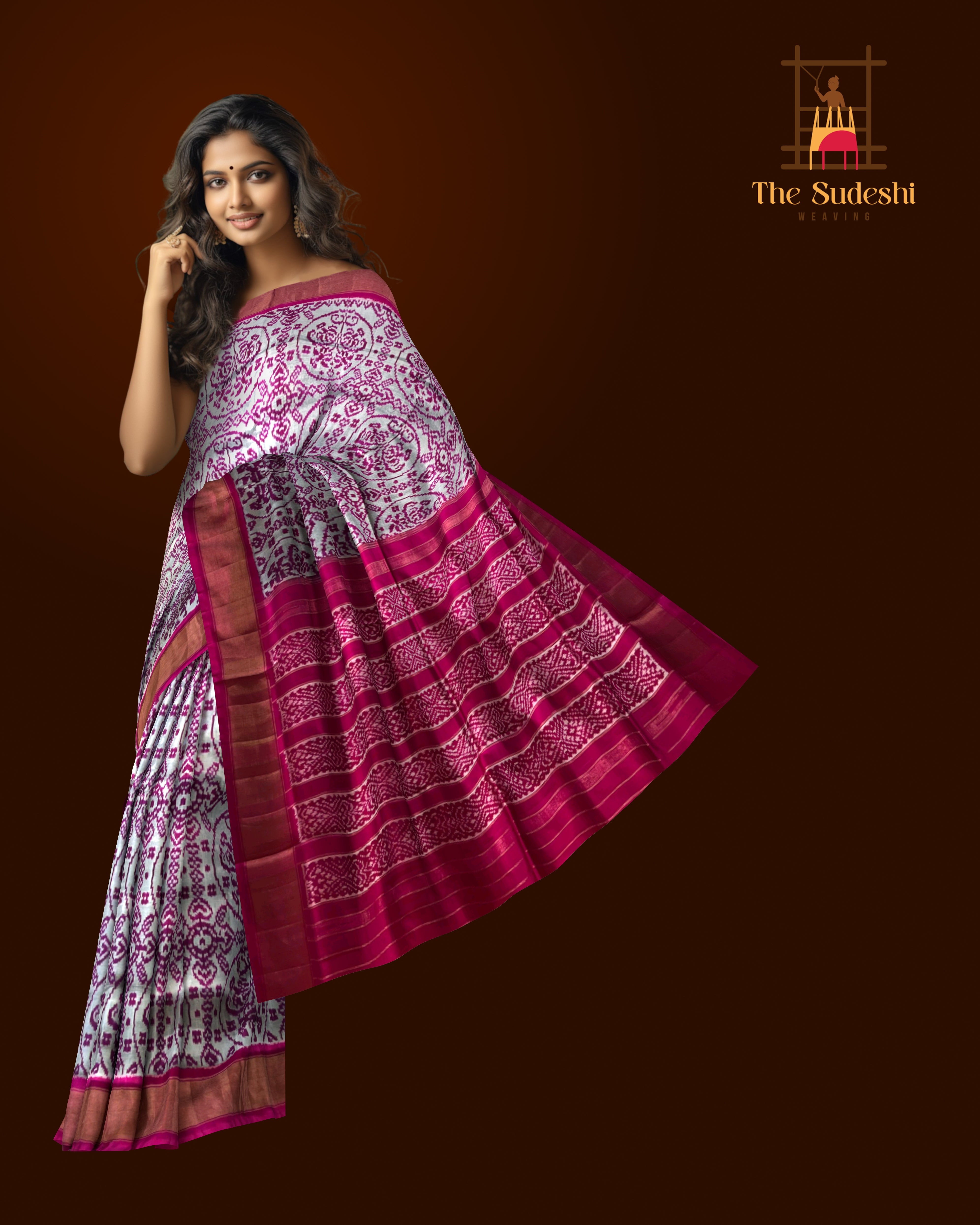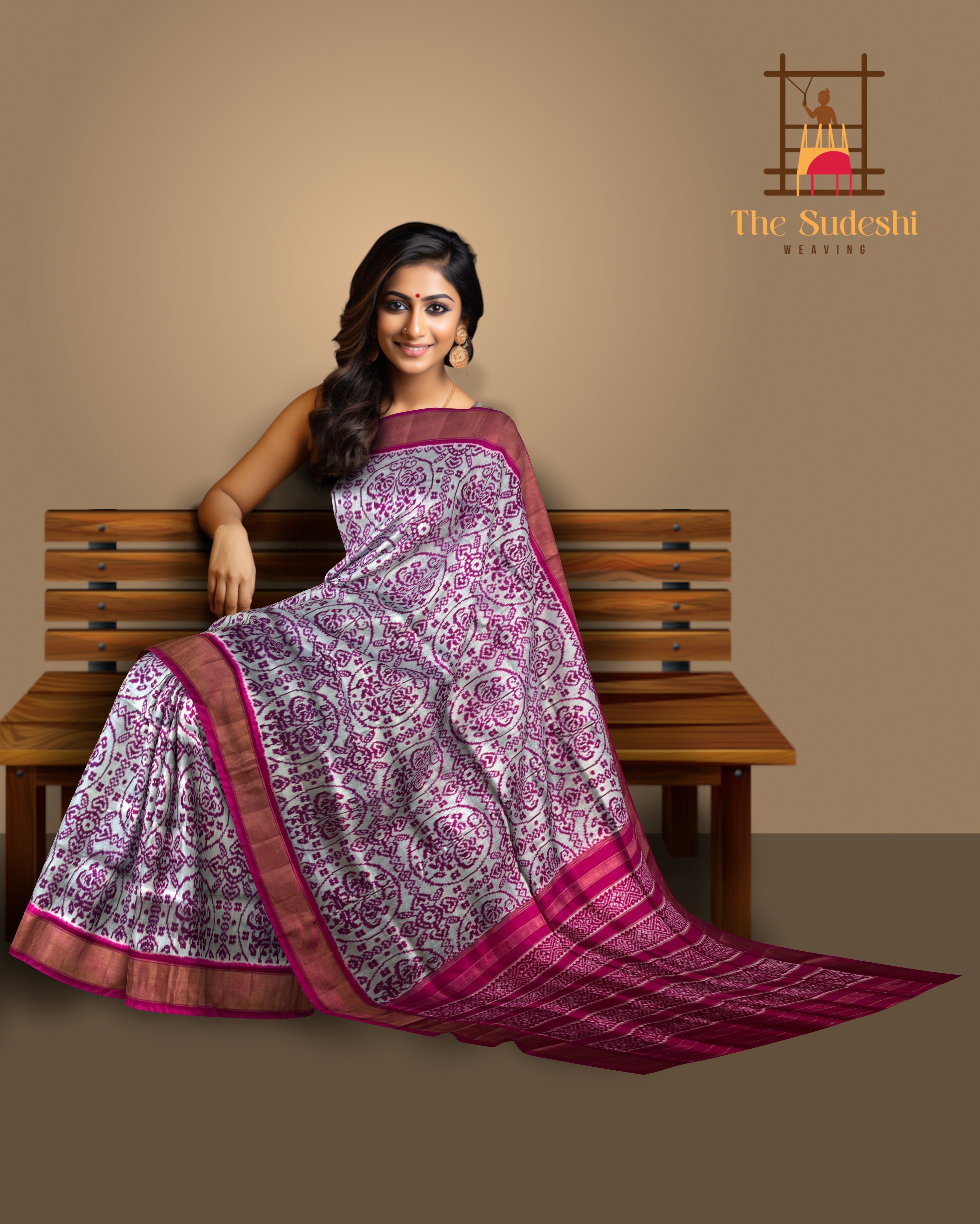 Elegant and understated, the Grey Pochampally Ikat Saree with a delightful pink border and pallu offers a perfect blend of subtlety and charm. The calm grey body exudes sophistication, while the vibrant pink accents add a pop of color, making this saree both refined and eye-catching. From the skilled artisans of Pochampally, Telangana, this saree is a beautiful representation of the double ikat technique, known for its precise and symmetrical motifs. Grey symbolizes neutrality and balance, while pink introduces a touch of warmth and femininity — a harmonious combination for versatile styling. Ideal for office functions, casual gatherings, or cultural events, this saree pairs well with a pink or silver blouse. Enhance your look with silver jewelry, pearls, or minimalistic accessories for an effortlessly graceful appearance. Note: The appearance of the product’s colors may vary due to lighting conditions or your device’s screen calibration. For further assistance or additional images/videos, feel free to contact us at +91 97897 60367 / +1 (945) 308-5962 or email at wecare@thesudeshiweaving.com.