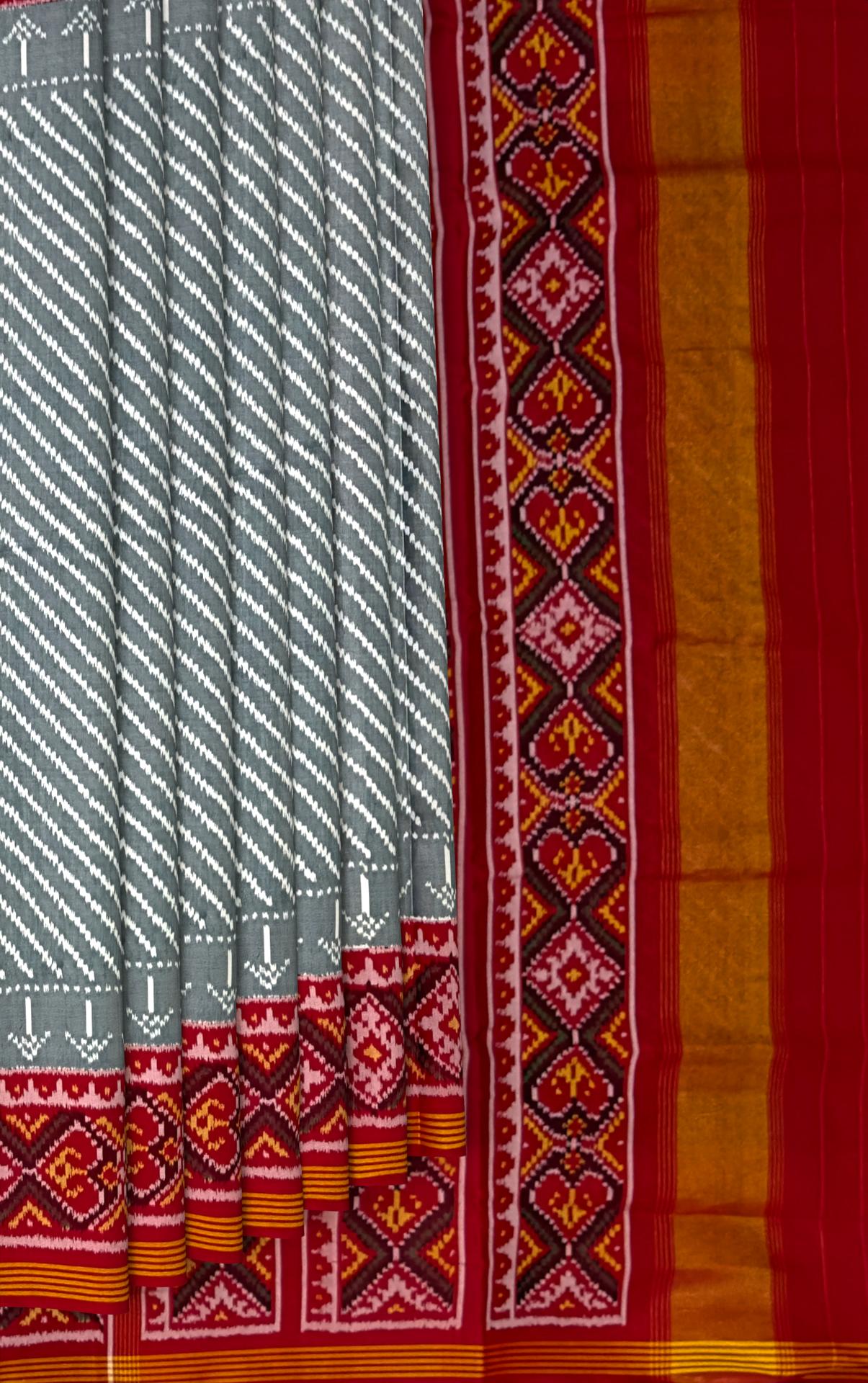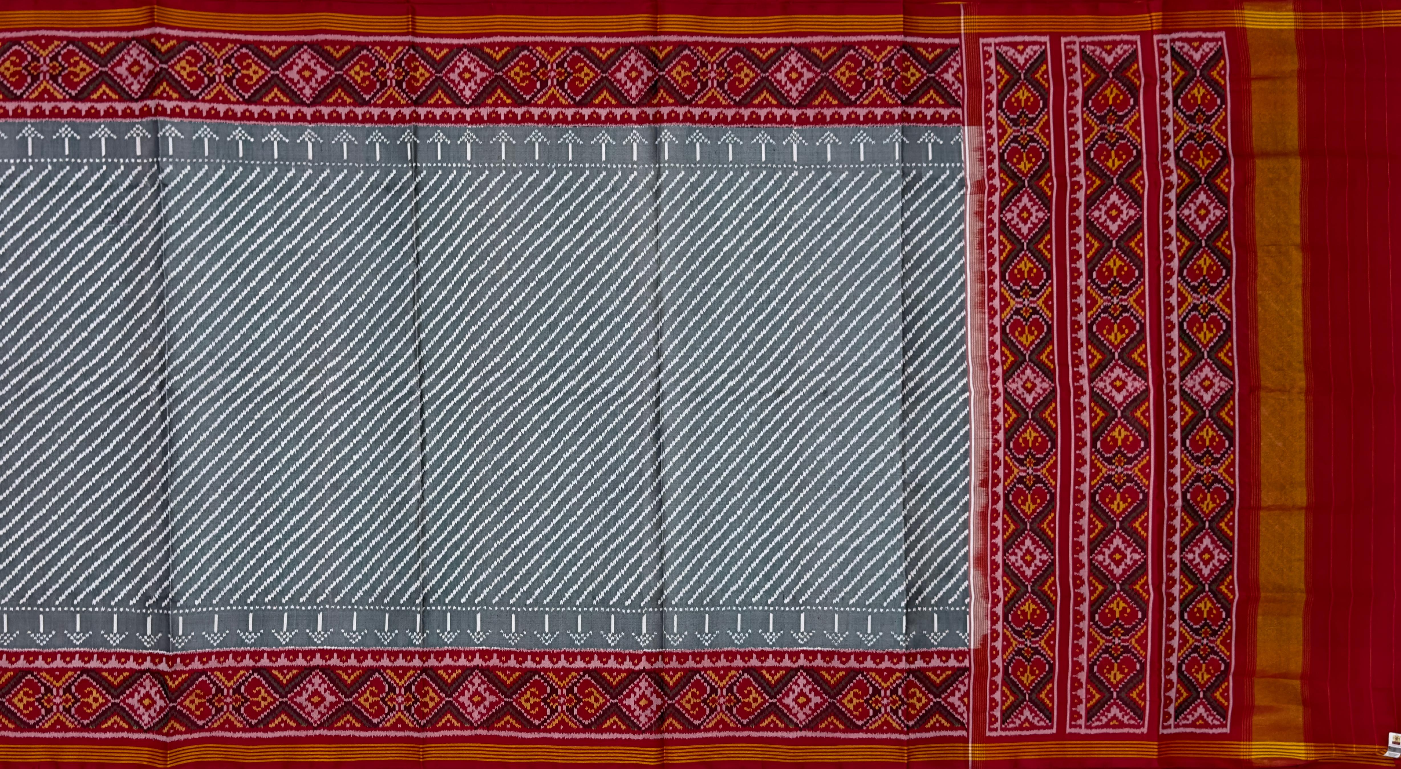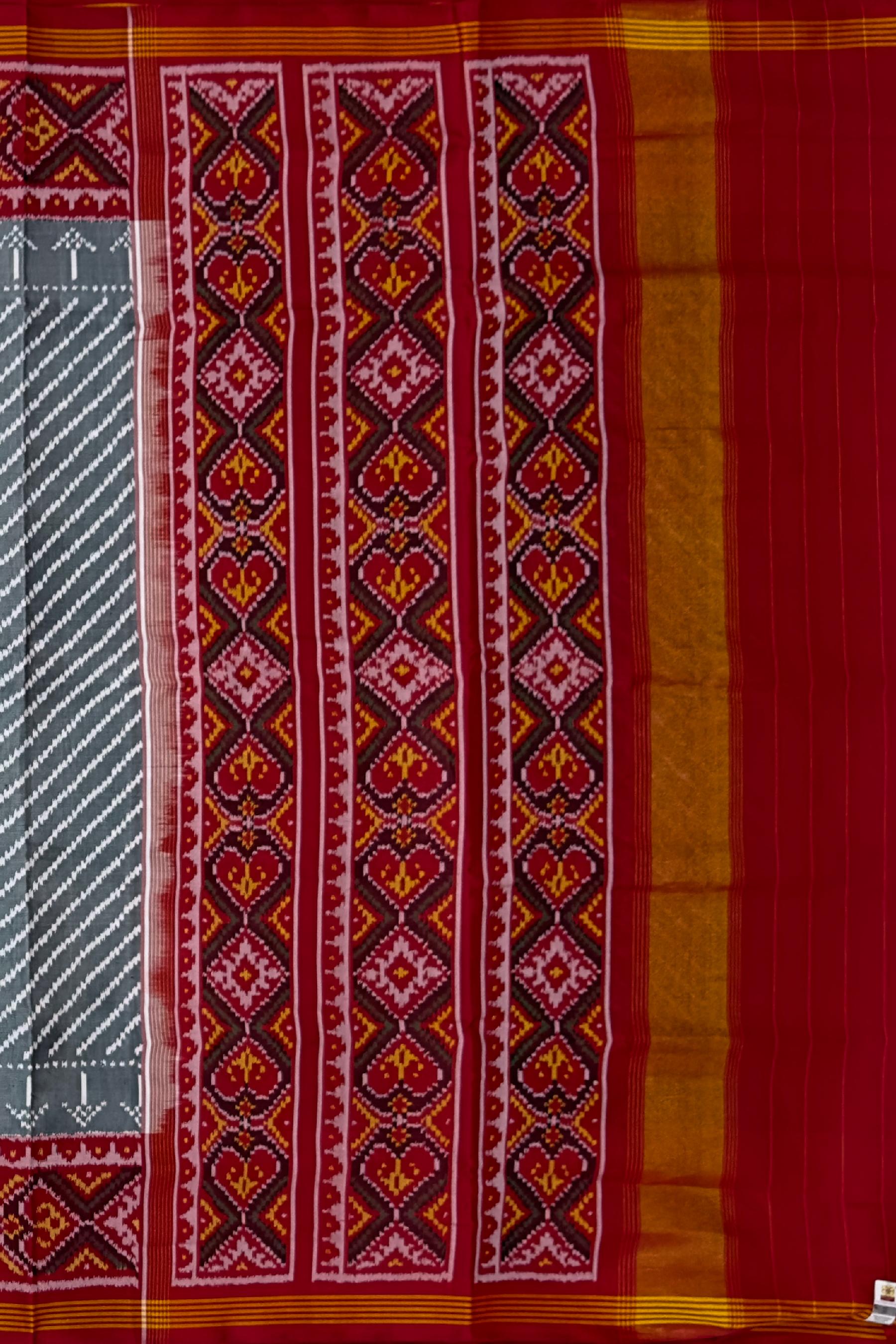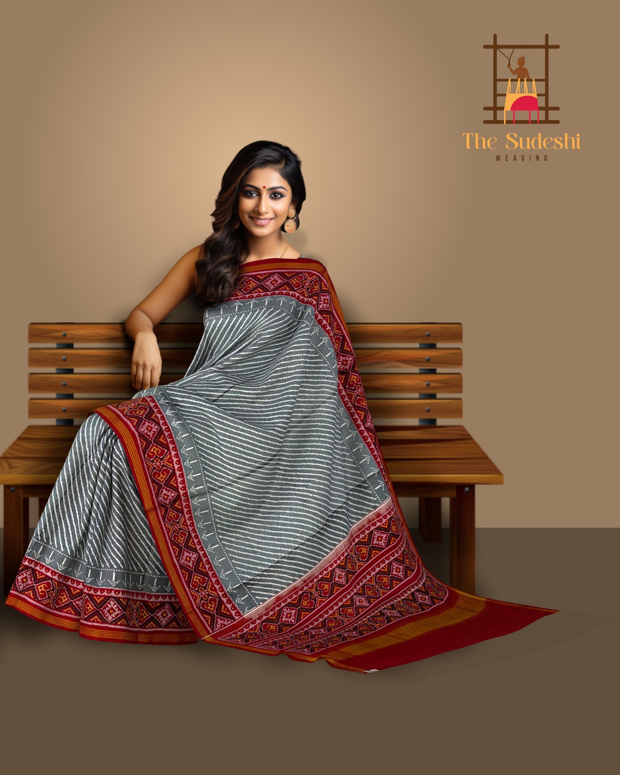 The Grey White Laheriya Semi Patan Saree, with its elegant grey and maroon palette, offers a modern twist on traditional styles. Ideal for formal events where a subtle yet striking appearance is desired.