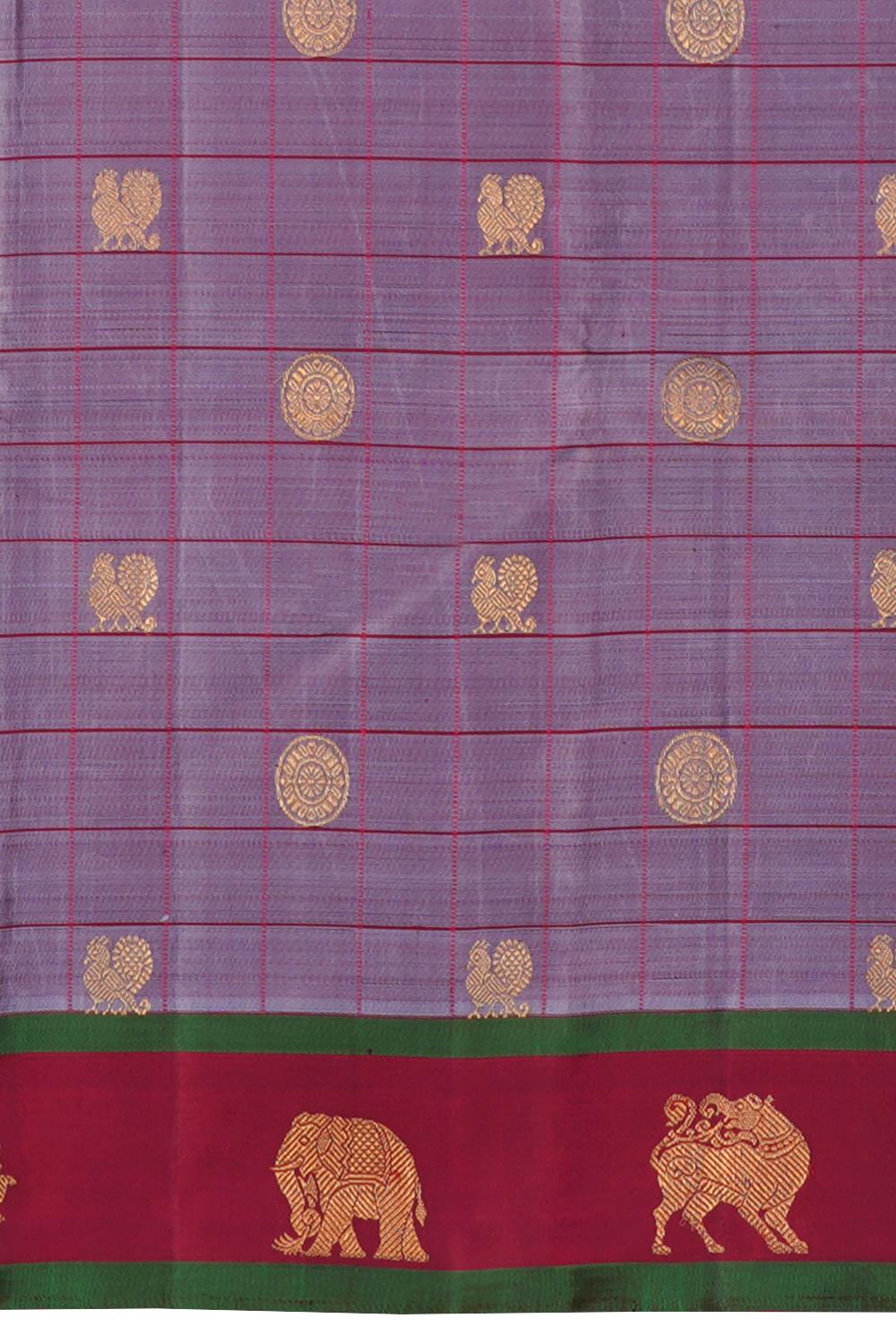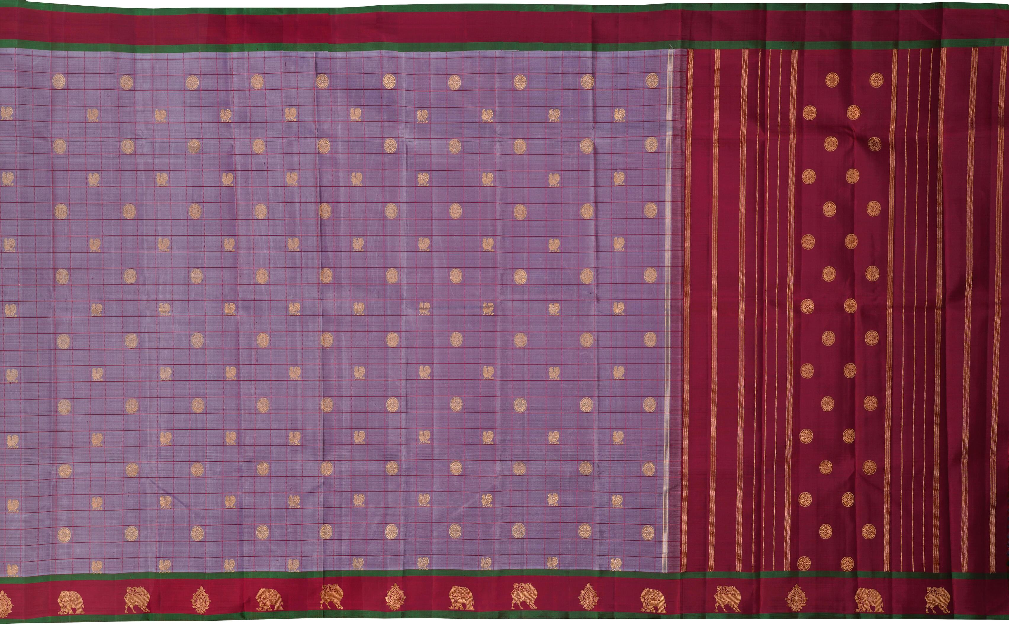 Exude Sophistication and Elegance with a Greyish Lilac Kanchipuram Pure Zari Saree.Discover the understated elegance of this Greyish Lilac Kanchipuram Pure Zari Saree. Handwoven with meticulous care, this saree showcases the timeless beauty of traditional Indian craftsmanship. The soft greyish lilac hue, adorned with the intricate Peacock and Chakram Butta motif, creates a captivating and visually striking ensemble. The lustrous zari threads, woven into the fabric with precision, add a touch of opulence and shimmer.
