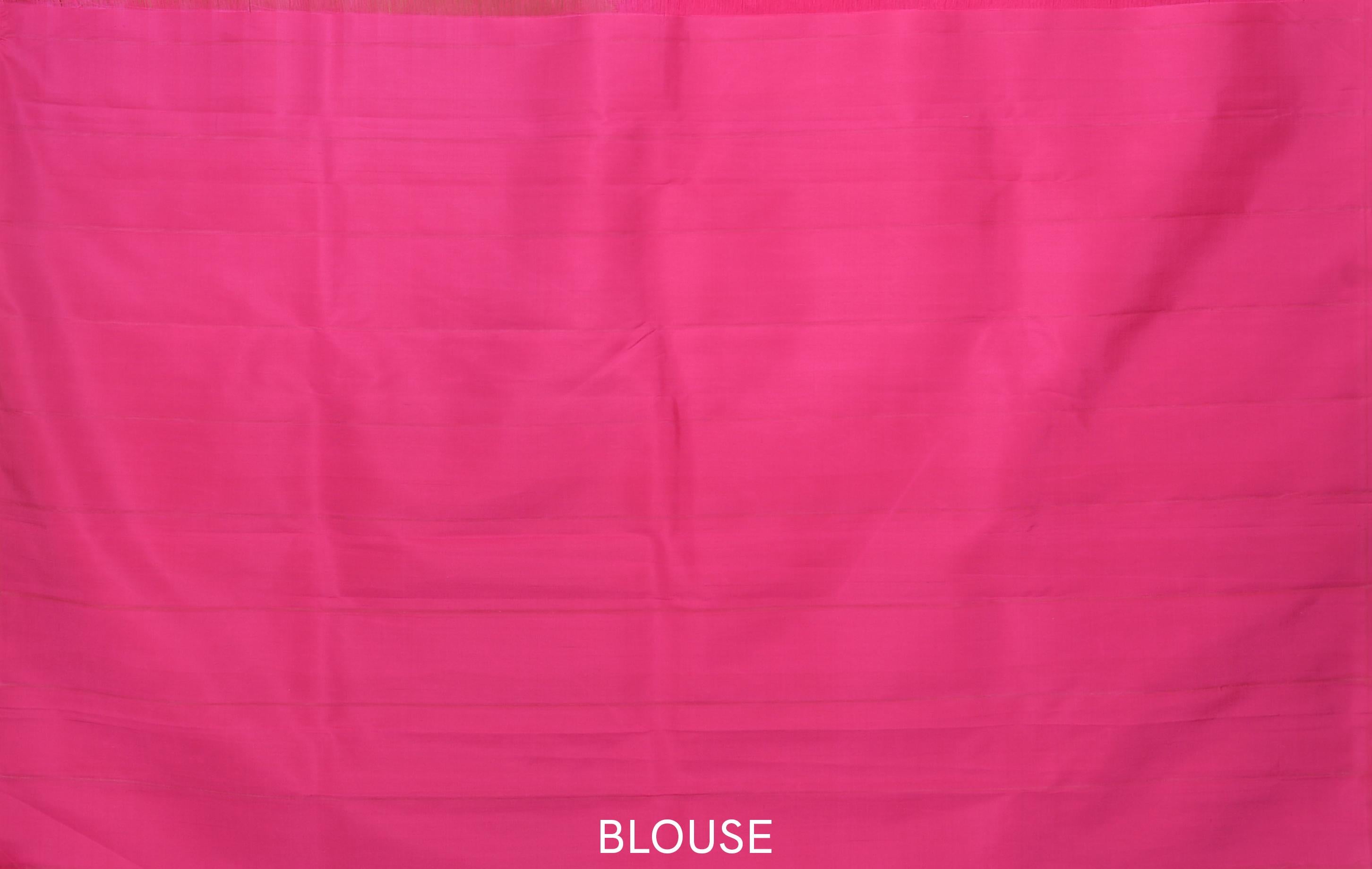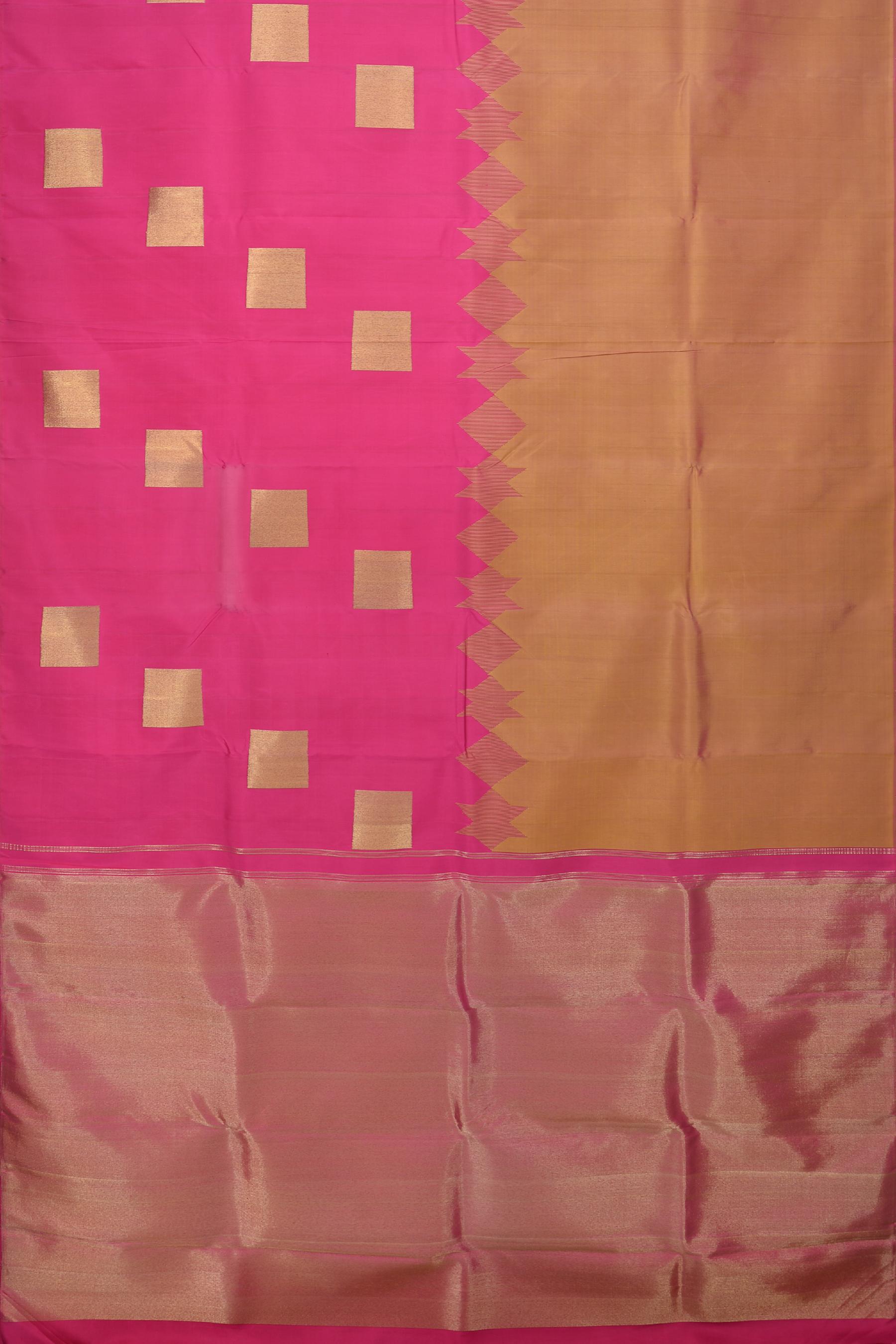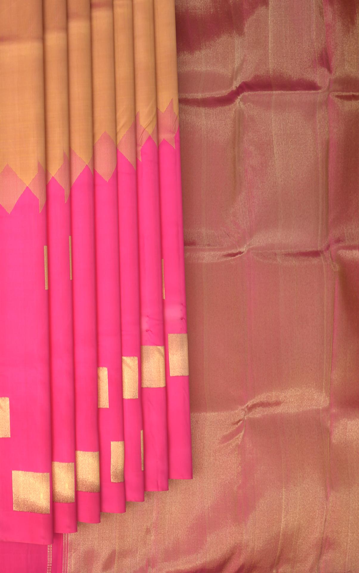 Embrace the harmony of contrasting hues with this unique half-and-half Kanchipuram silk saree, where the earthy tones of brown and light brown meet the softness of pink in a beautiful symphony. The Pink side is adorned with block checks zari, adding a touch of geometric elegance, while the brown side remains gracefully plain, offering a serene balance to the vibrant patterns.