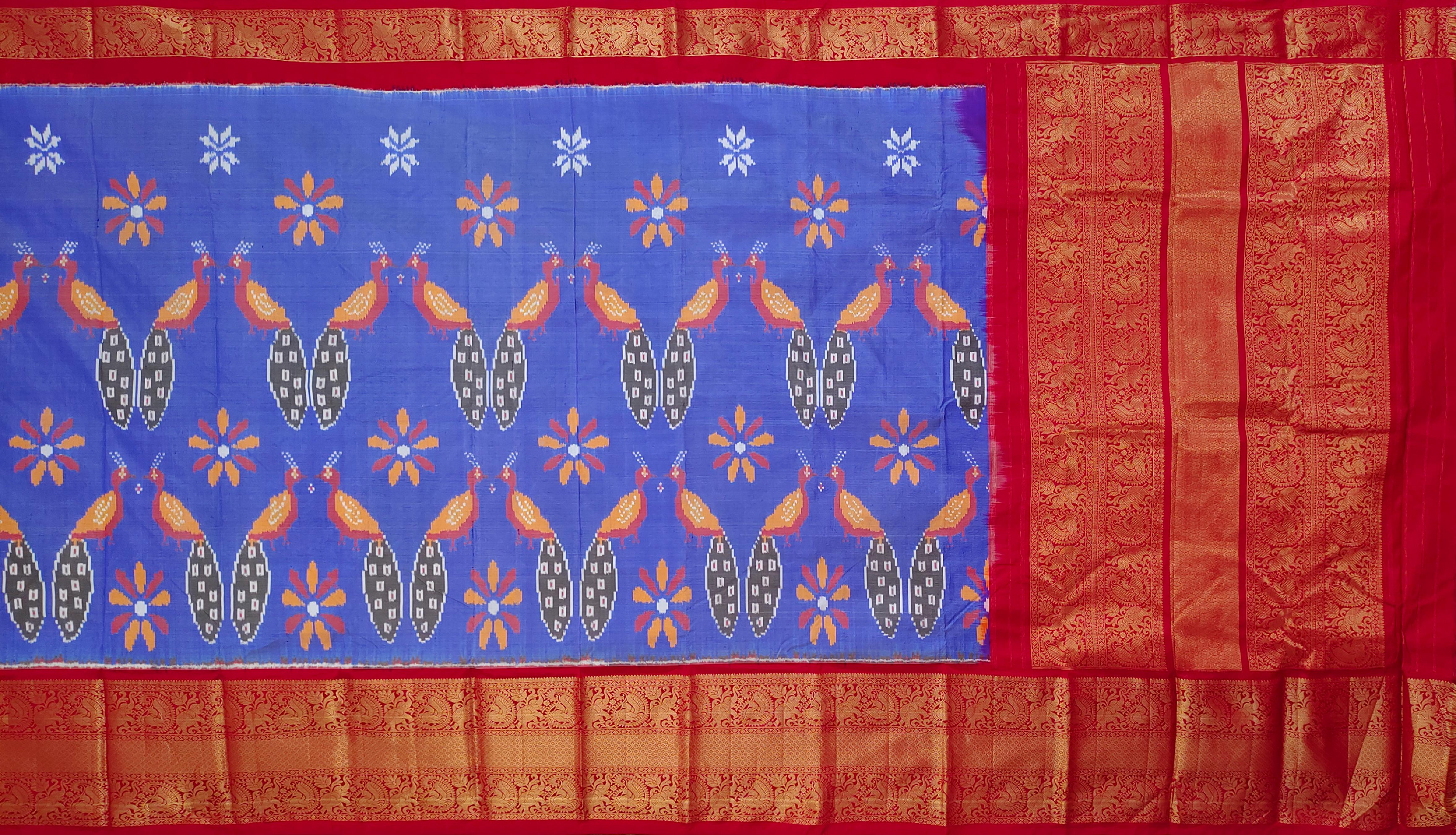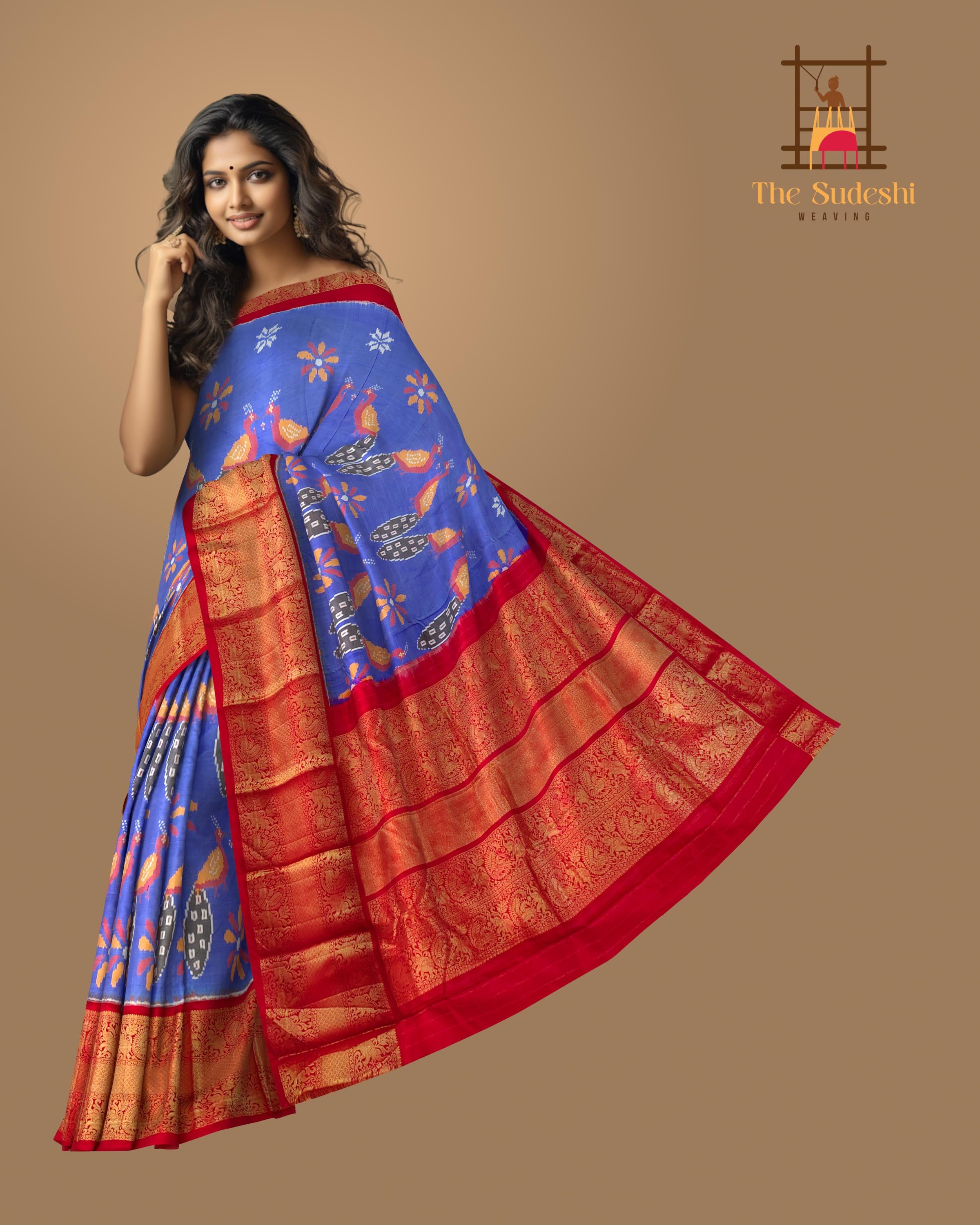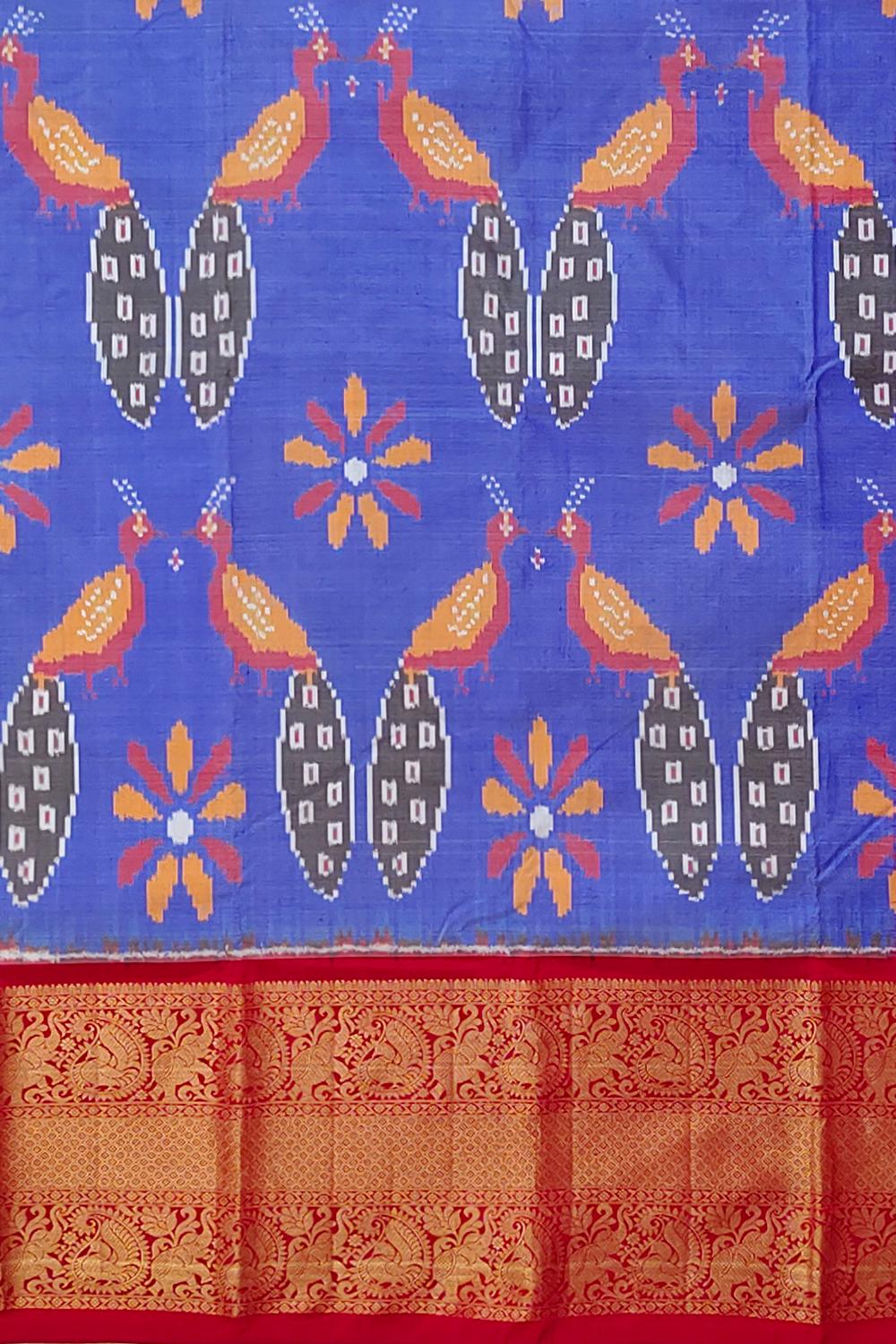 Step into elegance with our Iris Blue and Red Peacock Design Pochampally Saree. The stunning iris blue body contrasts beautifully with the vibrant red pallu and ikat woven blouse, making this saree a visual delight. Ideal for festivals and social events, this saree features a peacock body design, symbolizing beauty and grace, making it a perfect choice for those special occasions.