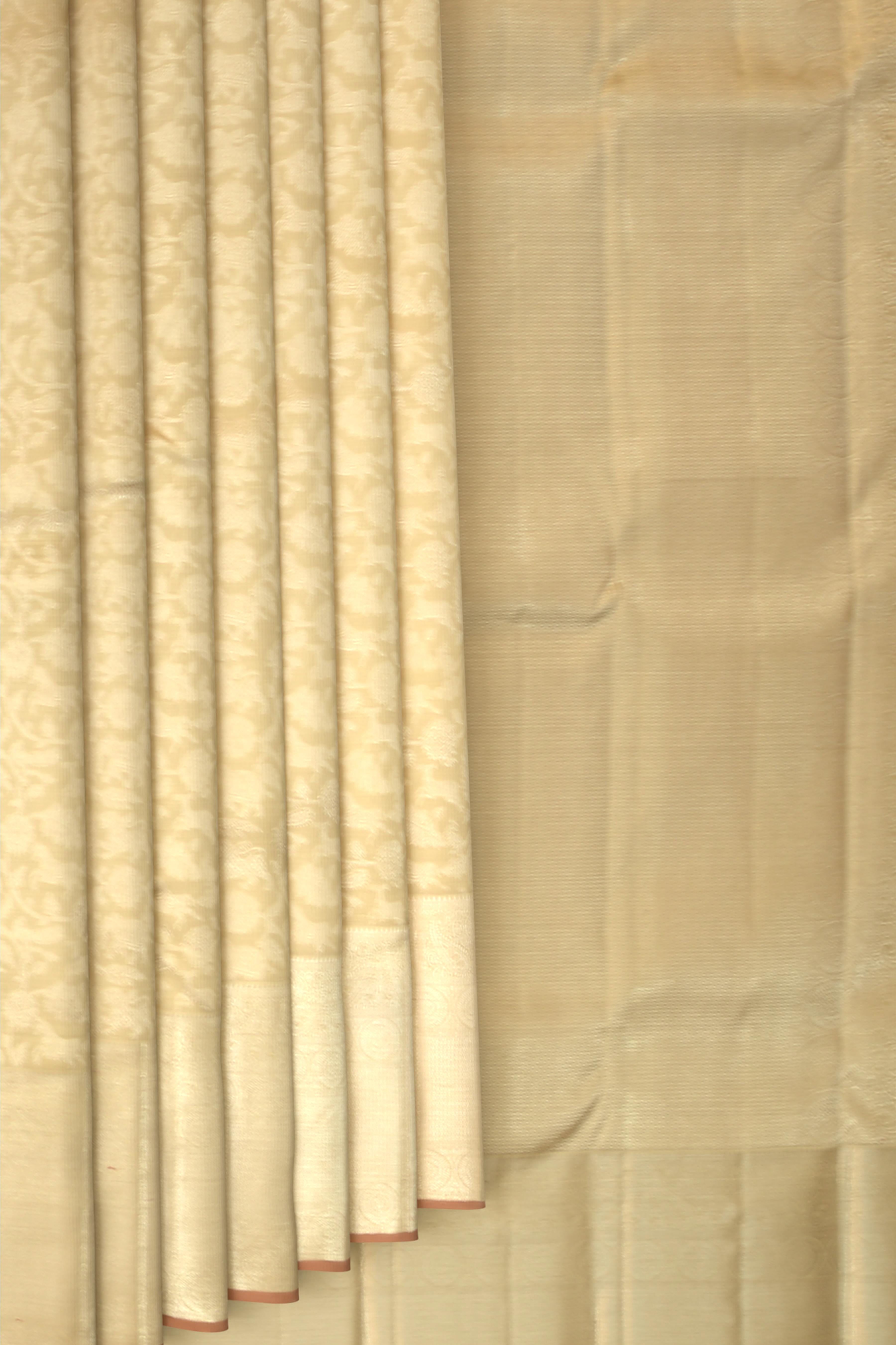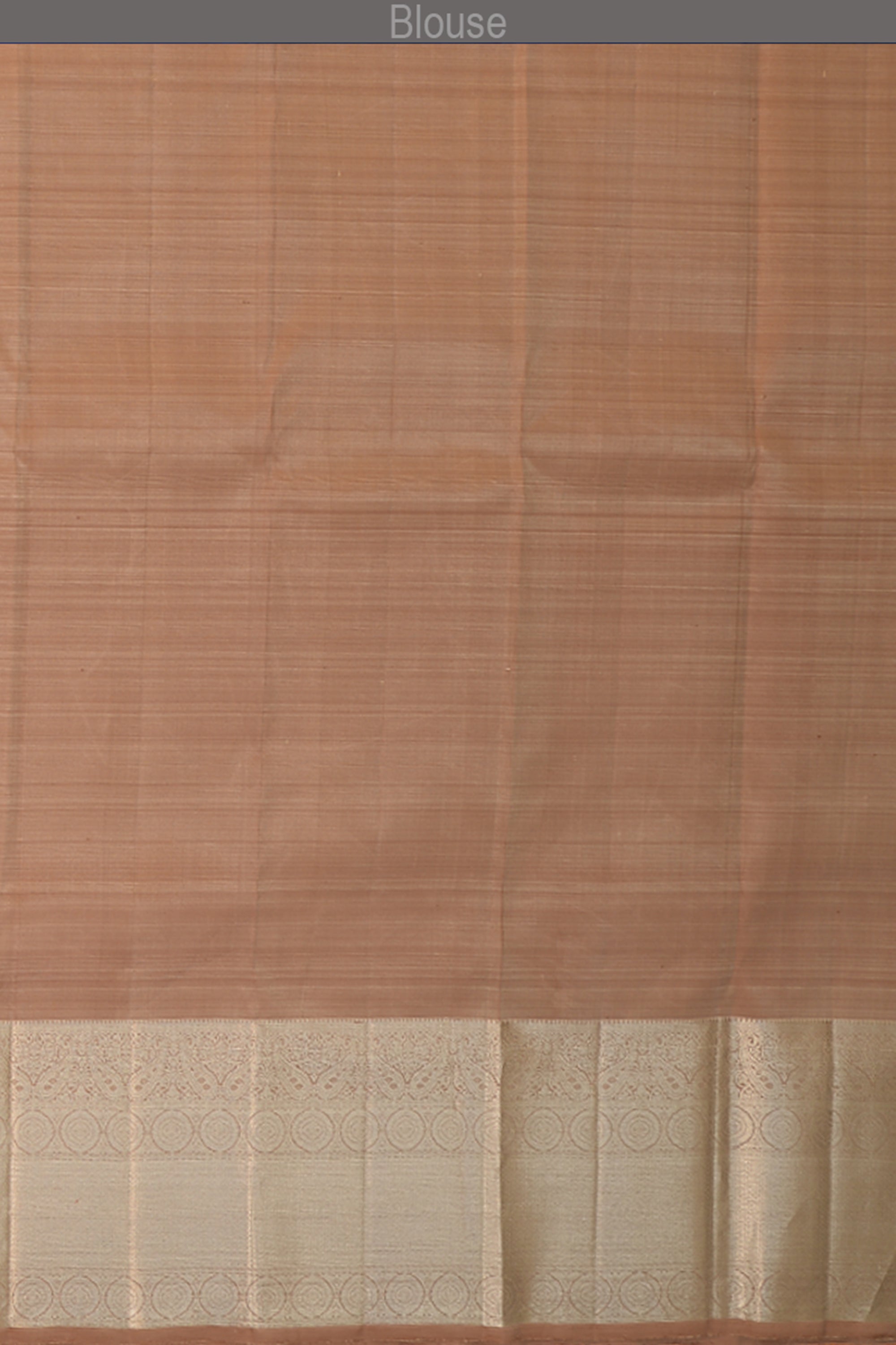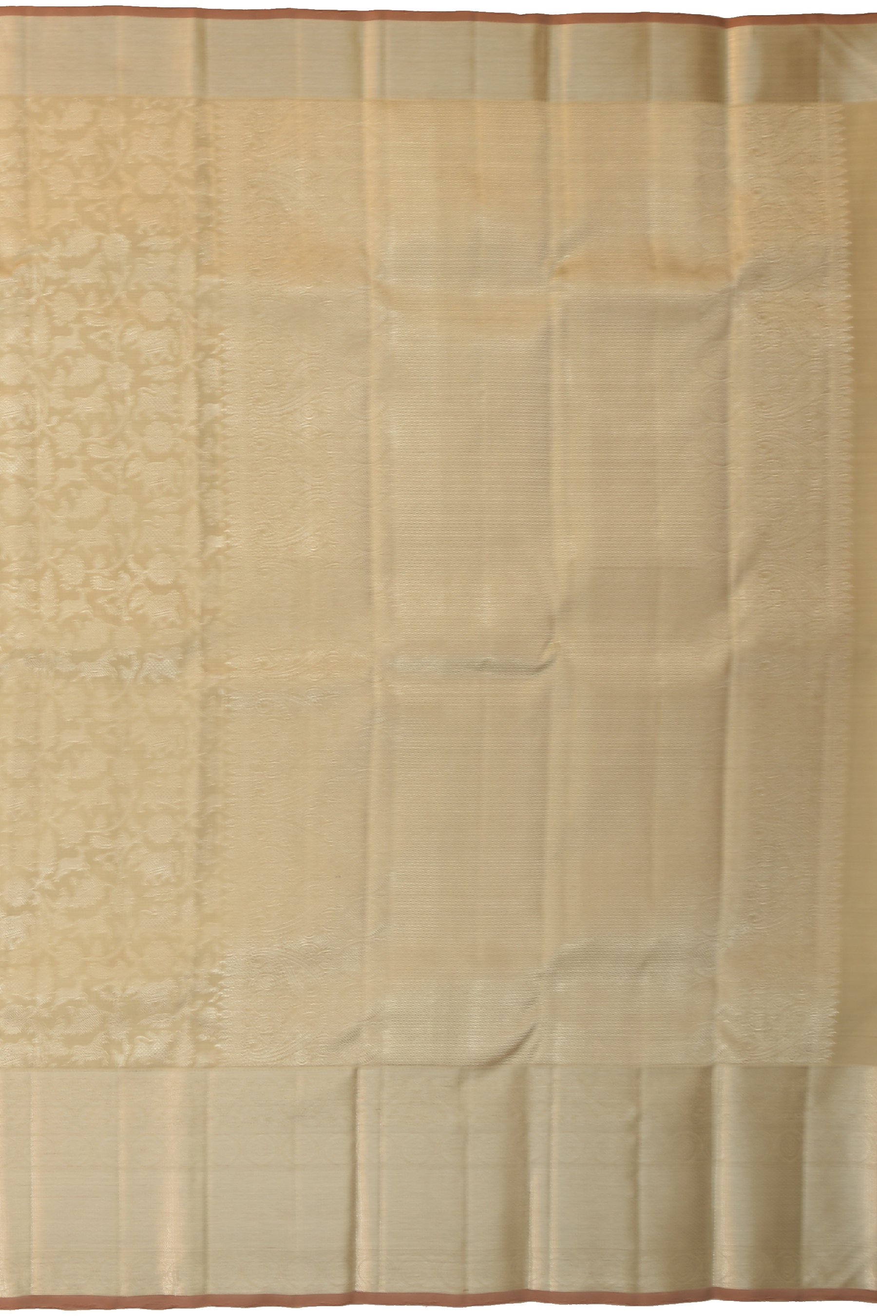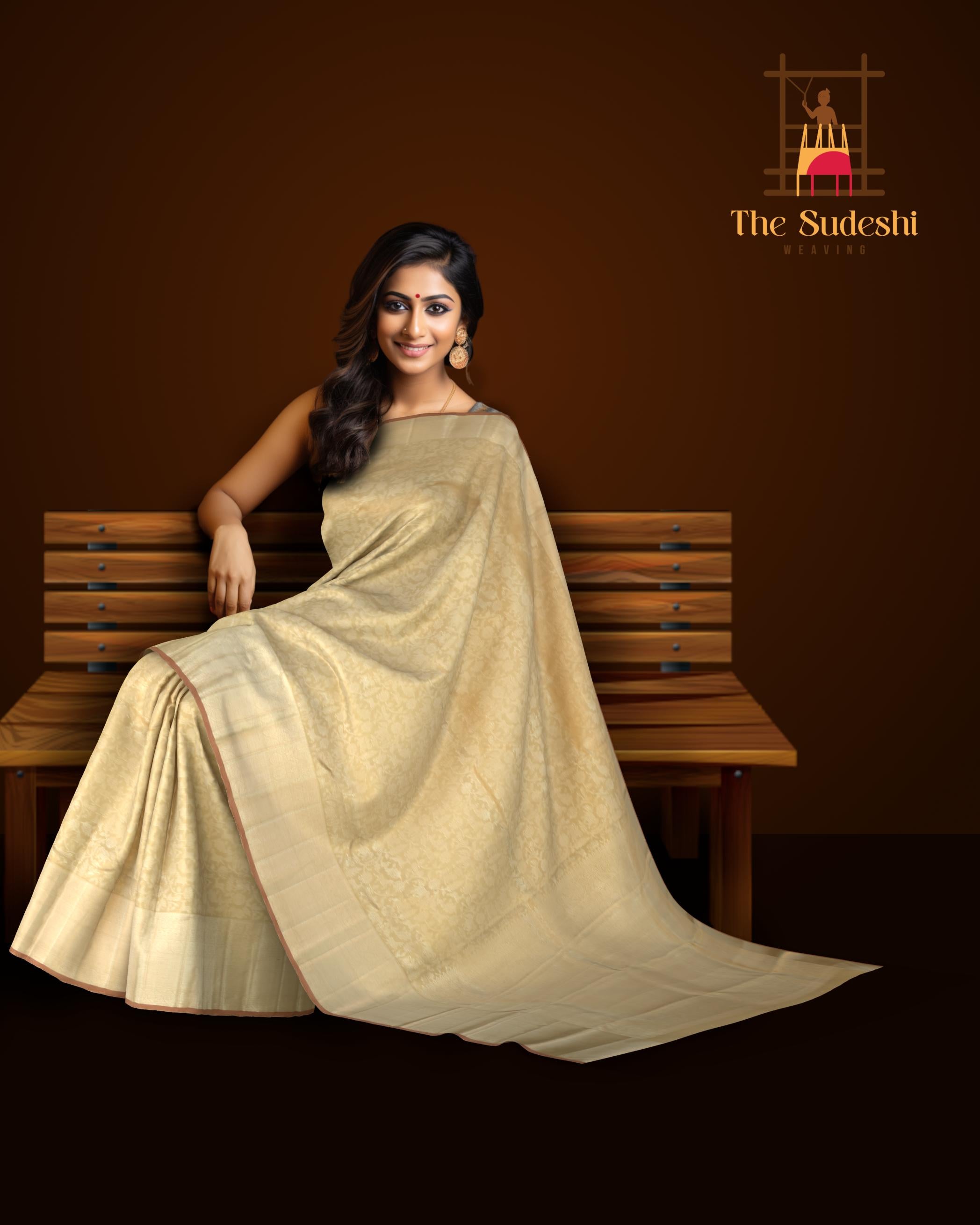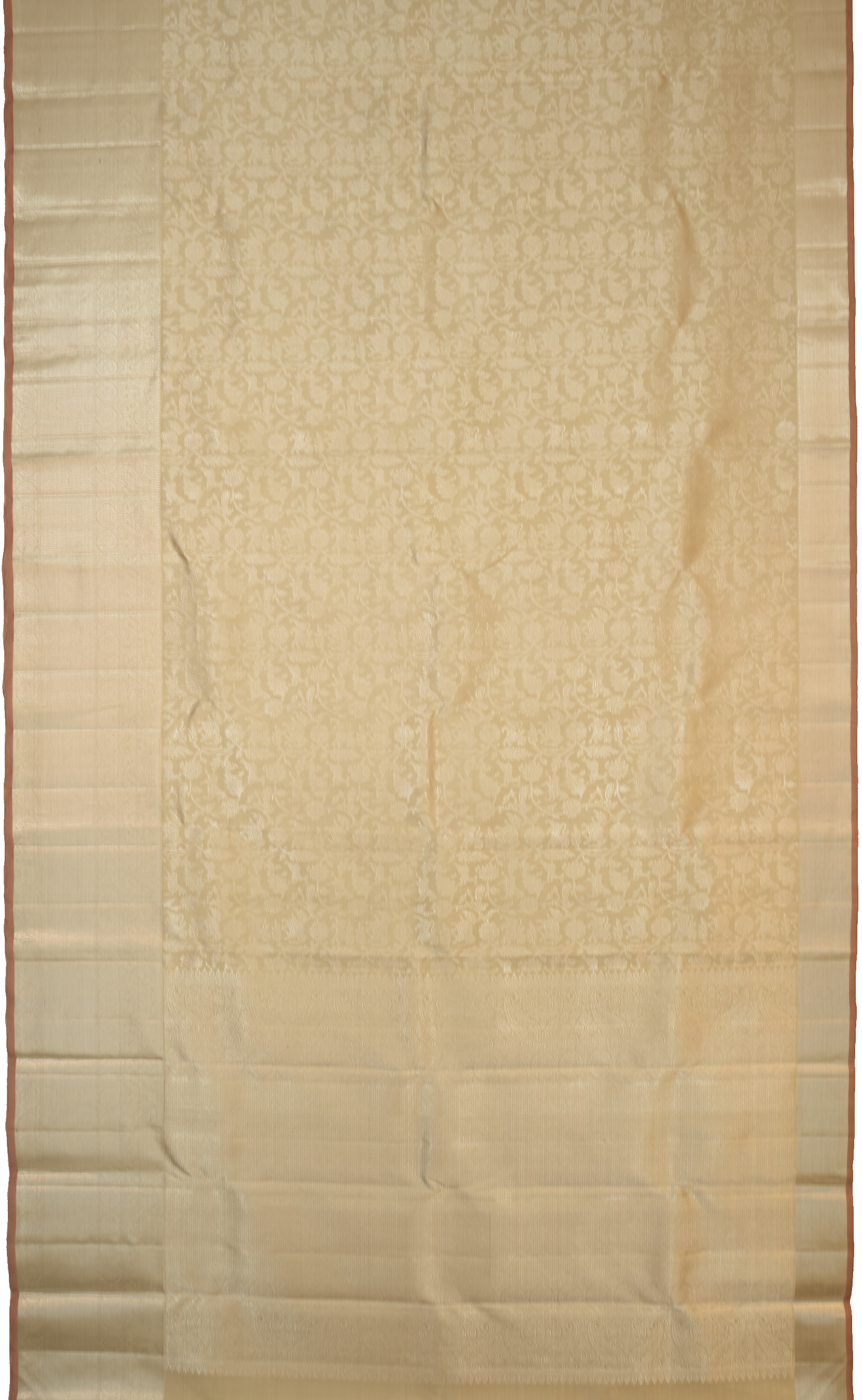 This saree is an ode to India's rich fauna, captured meticulously on the canvas of Kanchipuram silk. The beige body is decorated with Jacquard designs of elephants, yaali, and horses, each telling a tale of India's diverse ecosystems.