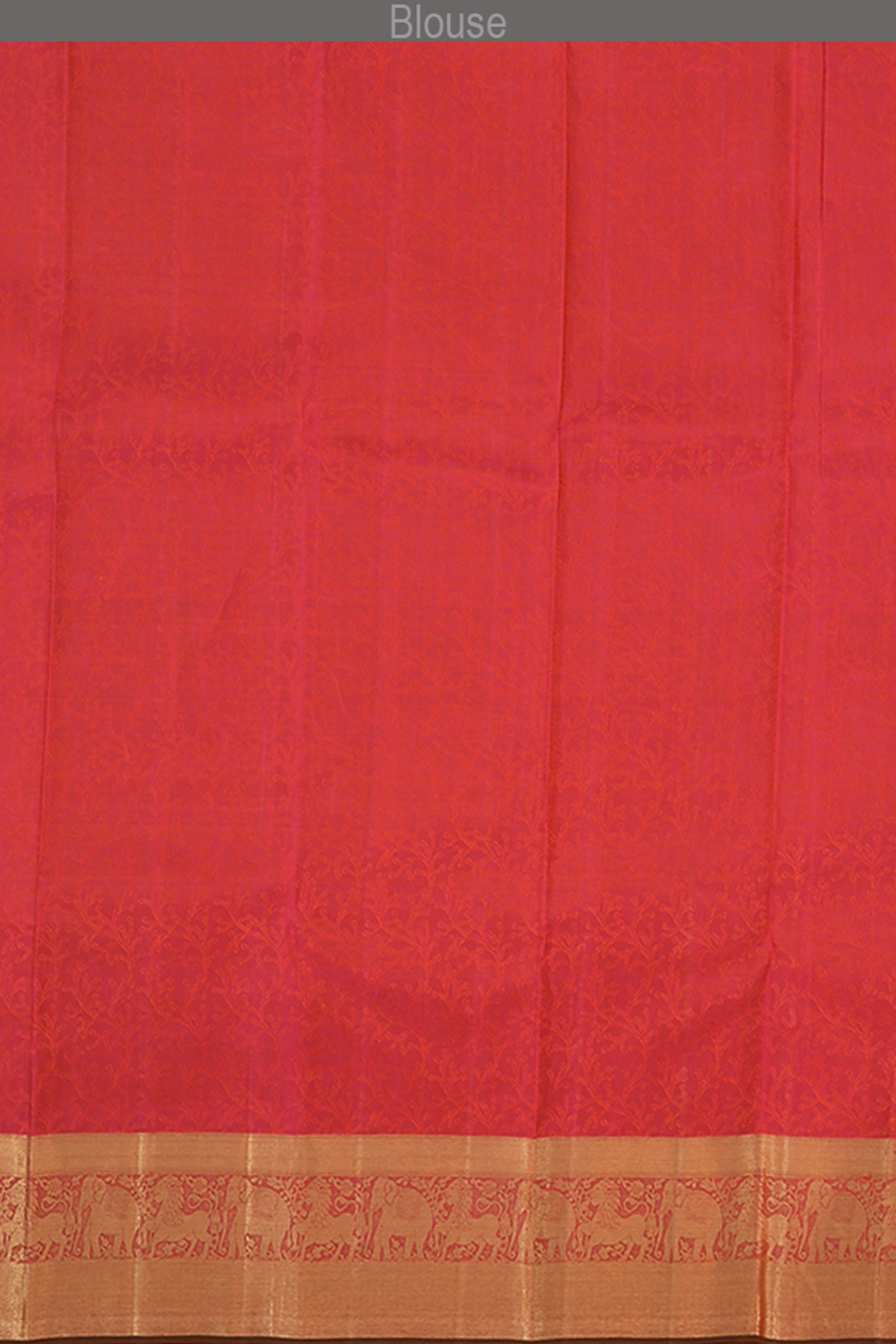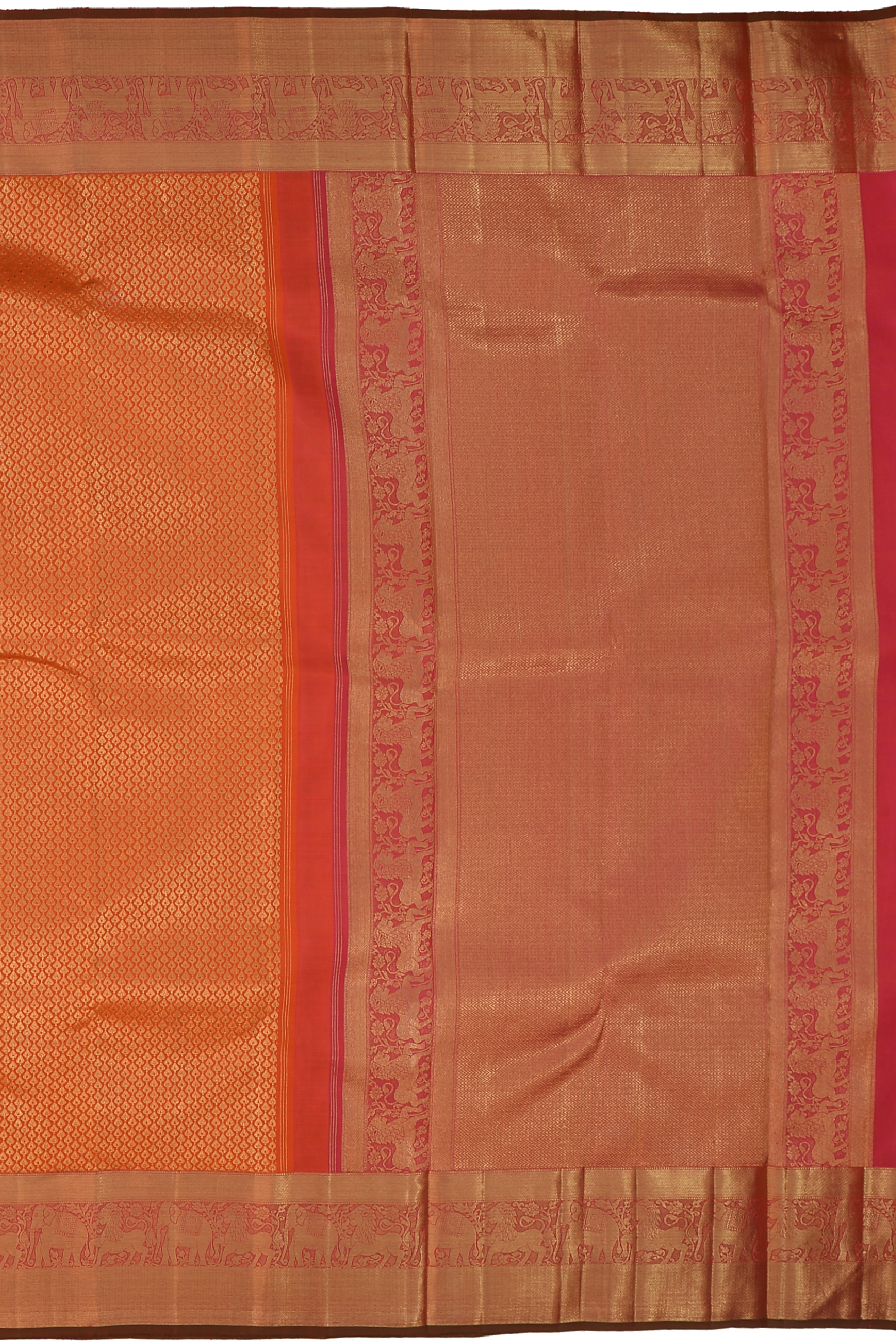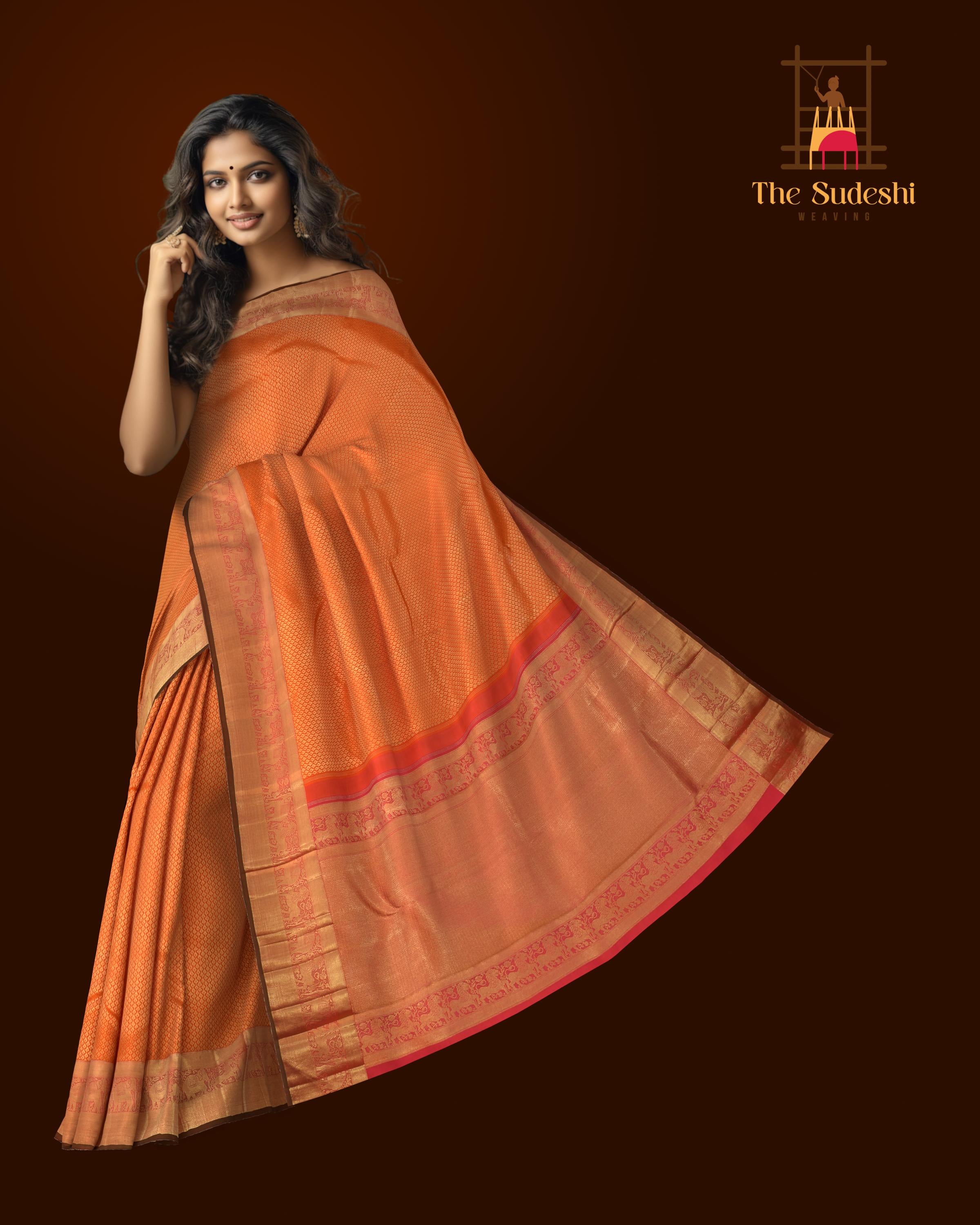 Bask in the warm glow of traditions with this saffron orange Kanchipuram silk saree. The intricate Jacquard design features small leaf motifs, each telling tales of ancient craftsmanship. The elephant and Yaali designs on the border are a nod to the majestic celebrations of the past.