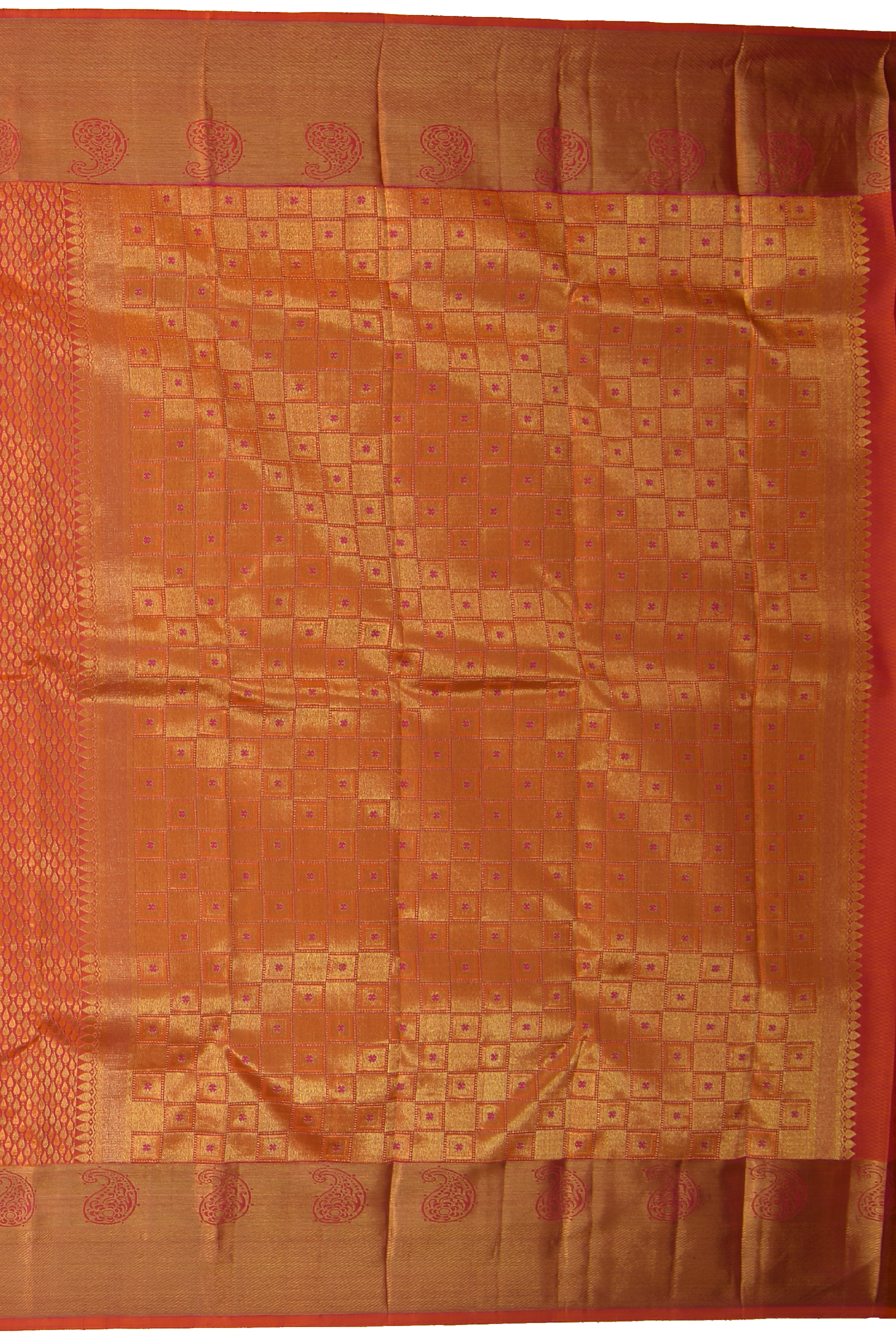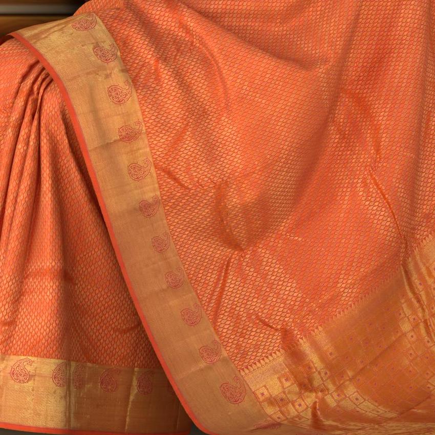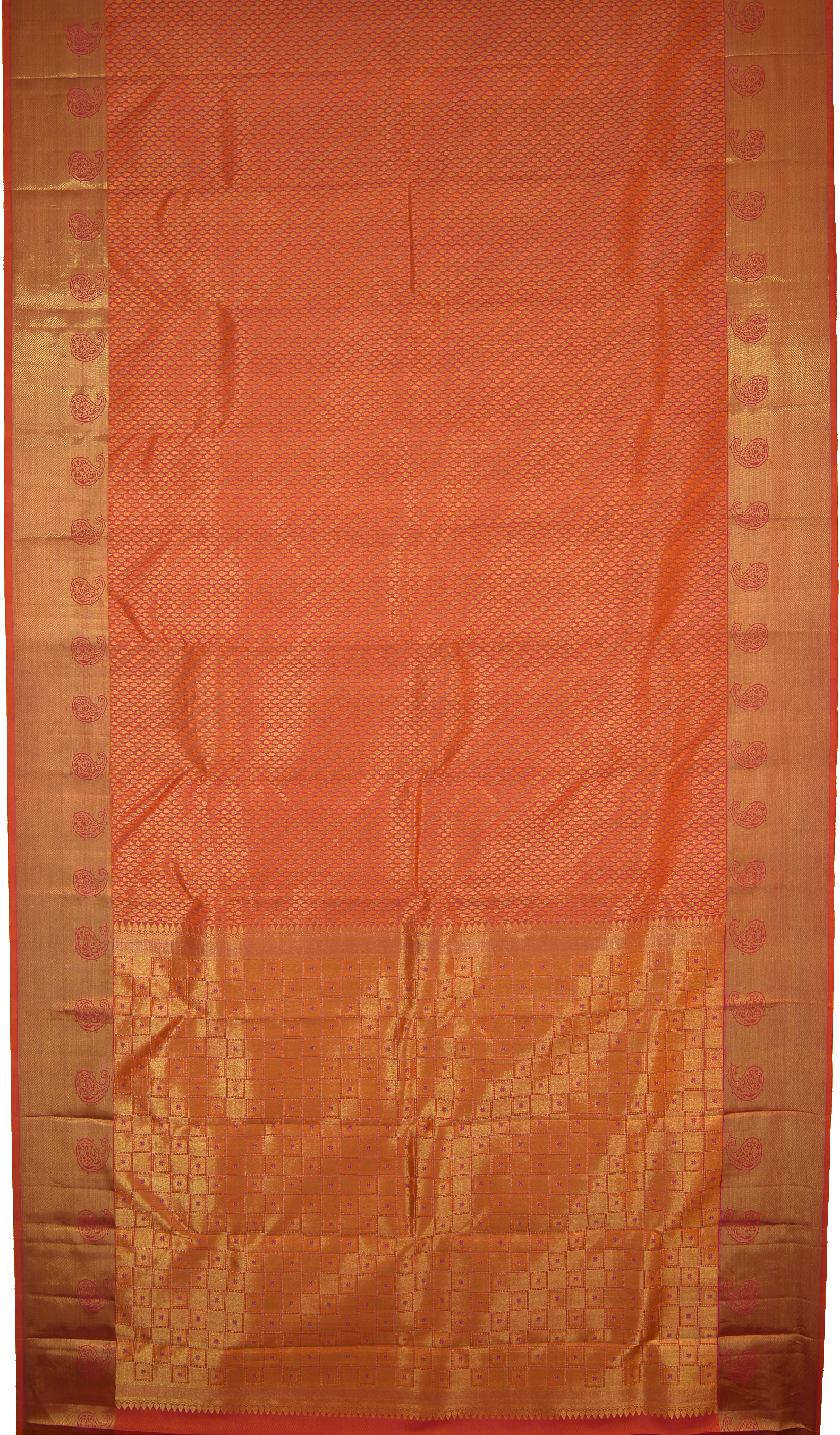 Step into a realm of resplendent beauty with this peach Kanchipuram silk saree, an epitome of handloom magnificence. The body of the saree is intricately woven in a Jacquard style, adorned with delicate tear drop motifs, representing droplets of timeless beauty. The Mango Bavanshi design on the border, in the saree's self-color, adds to its traditional charm, and is a symbol of auspiciousness in many Indian cultures. The pallu is a grand showcase, highlighted with square patterns and thick butta, woven meticulously with golden zari threads. When paired with its complementary pink blouse, this saree becomes a masterpiece, paying homage to the exceptional craftsmanship of Kanchipuram weavers.