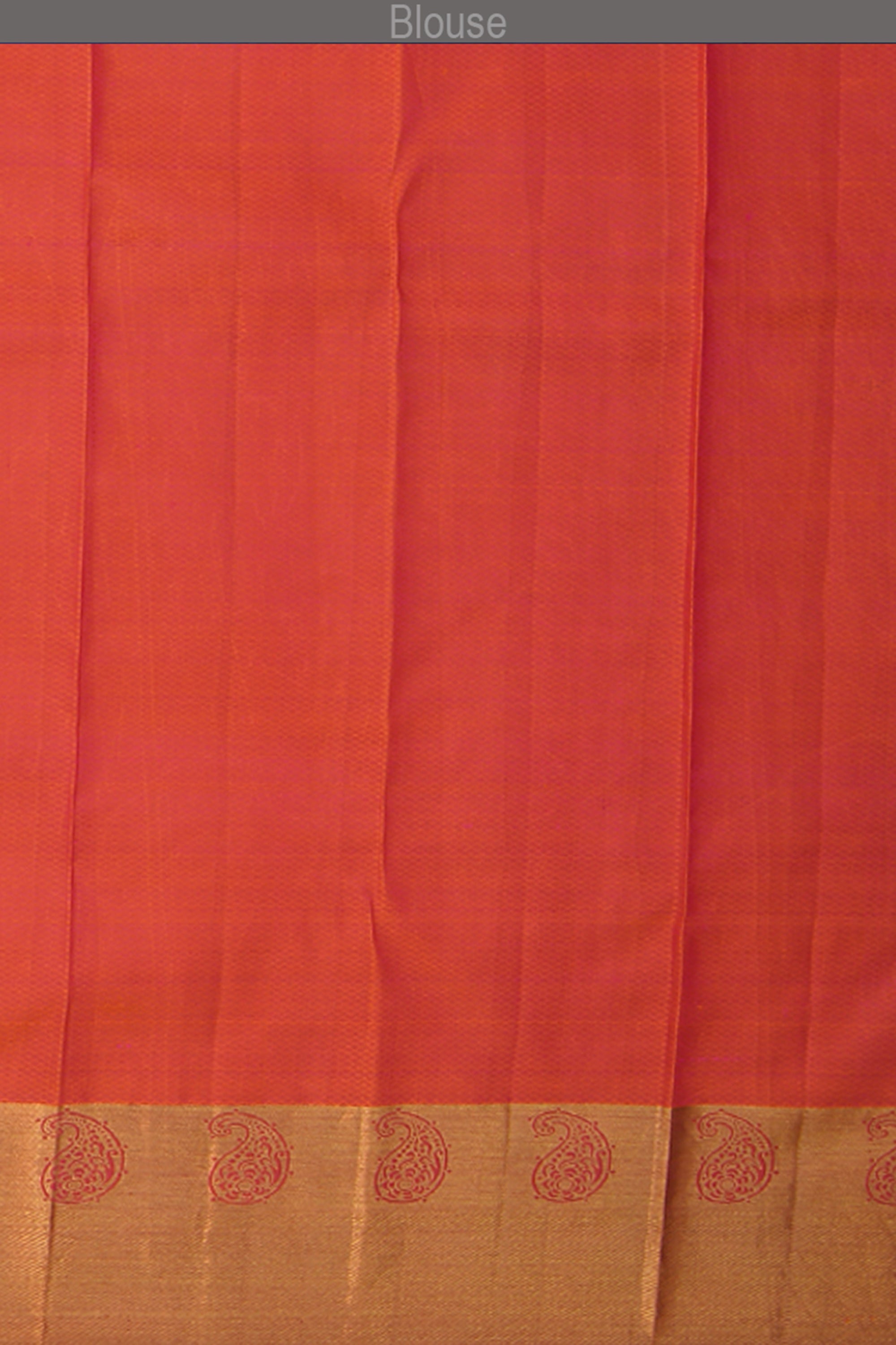 Celebrate the grandeur and heritage of Kanchipuram silk with this exquisite peach saree. Every inch narrates a story of dedicated weavers, expertly intertwining gold zari to create a piece that resonates with elegance and tradition.