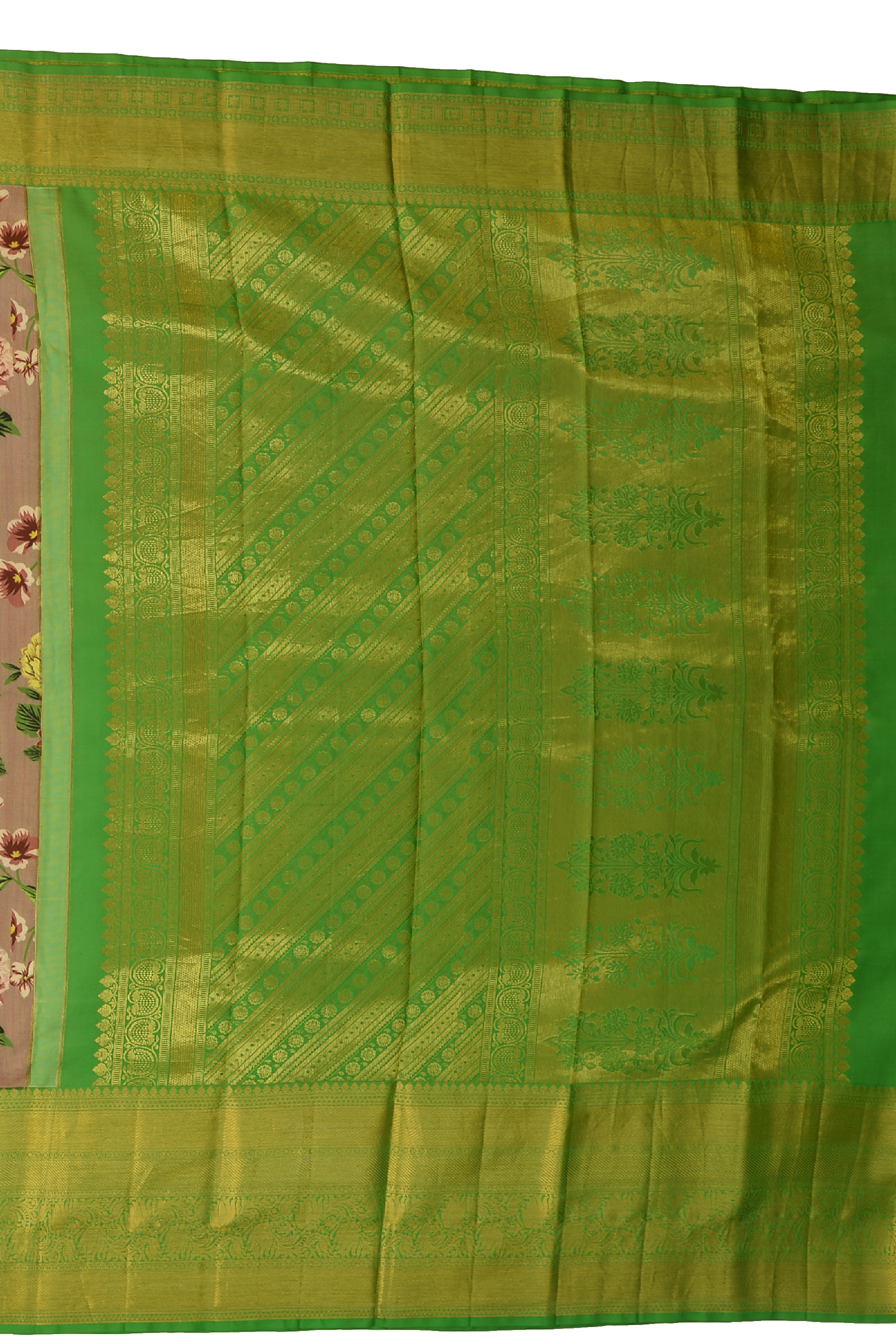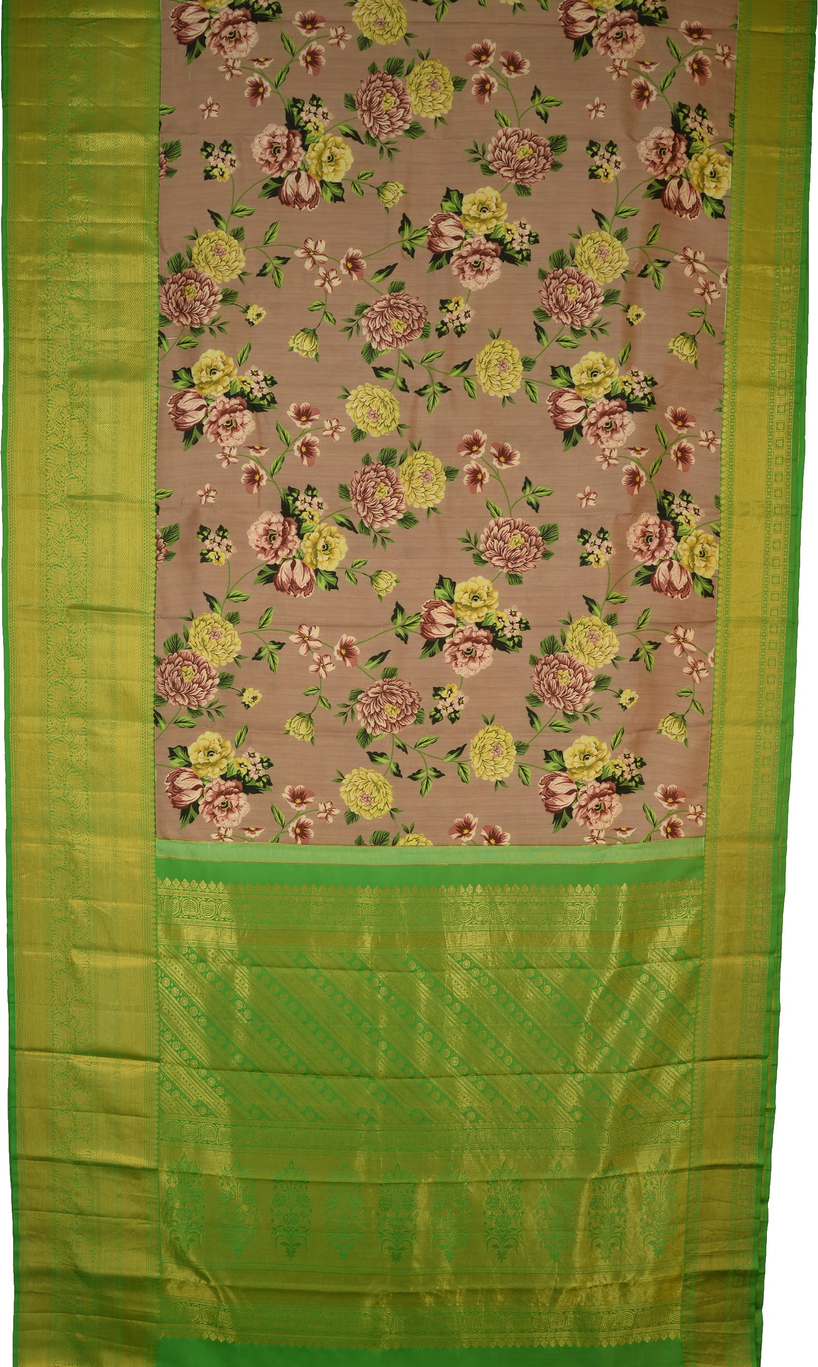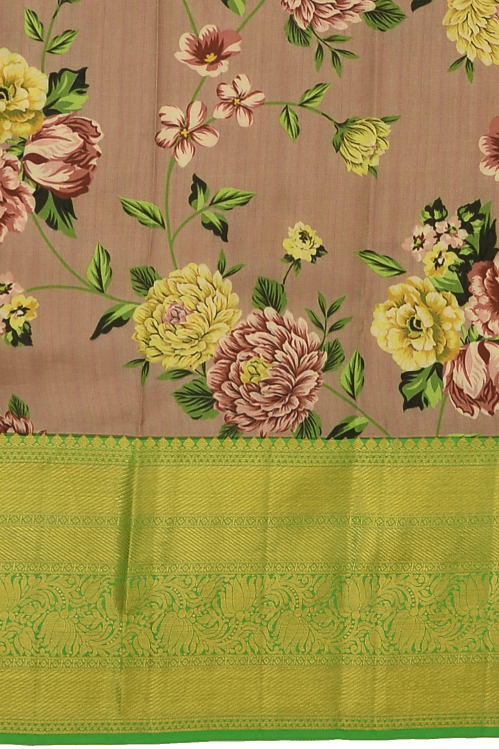 Drape yourself in the whispers of nature with this beige Kancheepuram silk saree adorned with brown digital floral motifs. The contrast of the parrot green border, enhanced with floral patterns, adds a vivacious touch to the earthy tones of the saree. The grand parrot green pallu, designed with diagonal lines and a floral motif, is a harmonious fusion of traditional motifs and contemporary design. Paired with a matching parrot green blouse, this saree is a celebration of nature's palette.