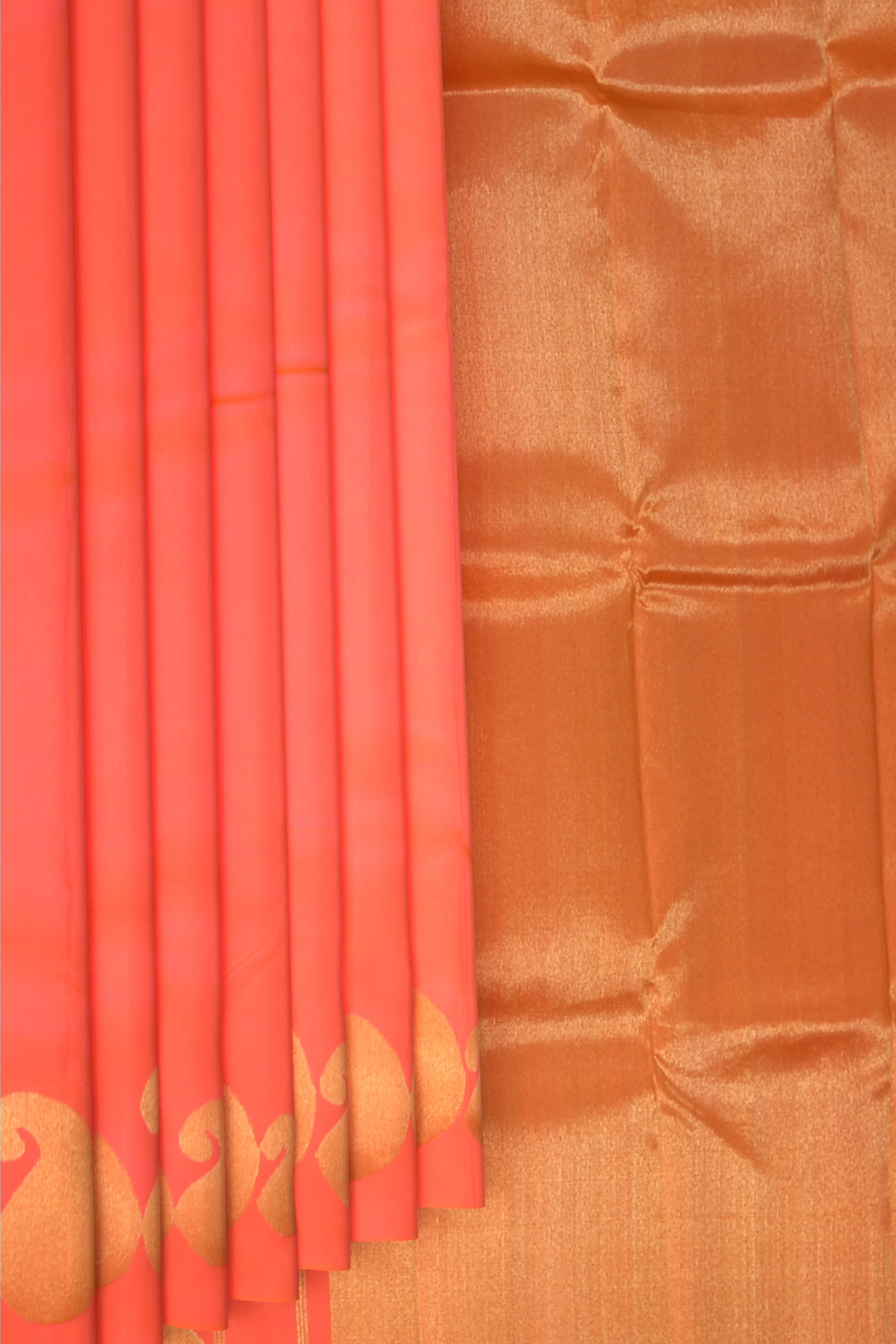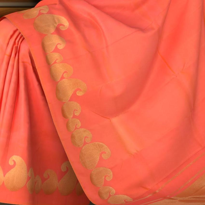 Elevate your elegance with this lustrous peach Kancheepuram silk saree. The unadorned body lets the grand tissue pallu take center stage, shimmering gloriously as it drapes. A symbol of timeless beauty, this saree beautifully merges simplicity with luxury. Paired with a matching peach blouse, this ensemble epitomizes regal charm.