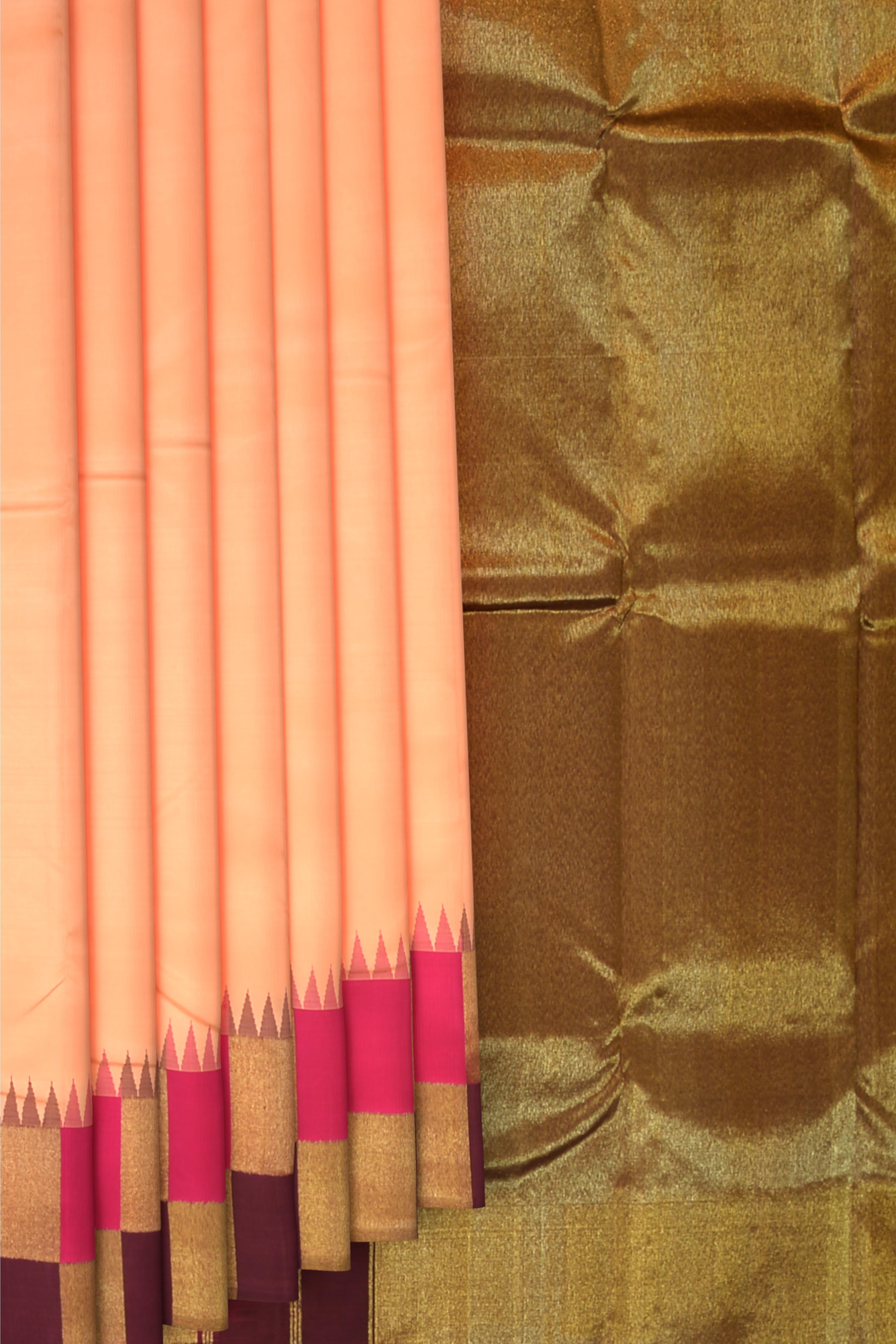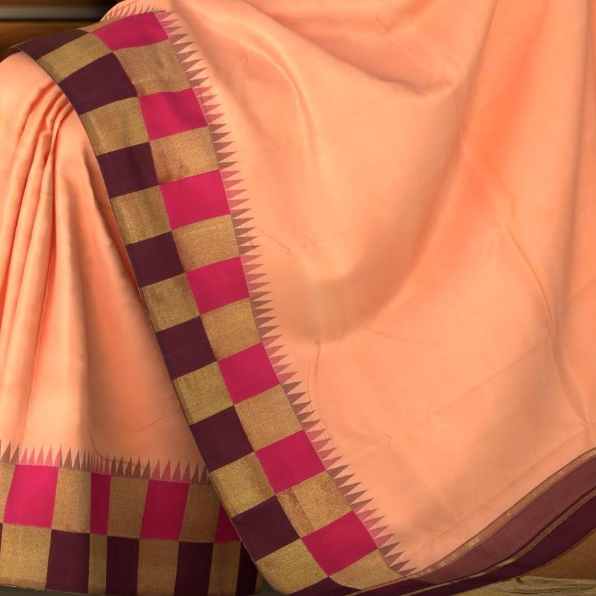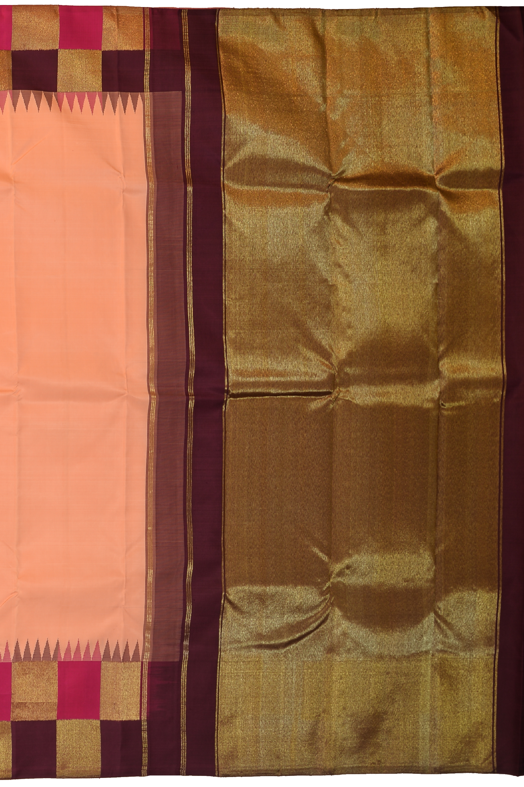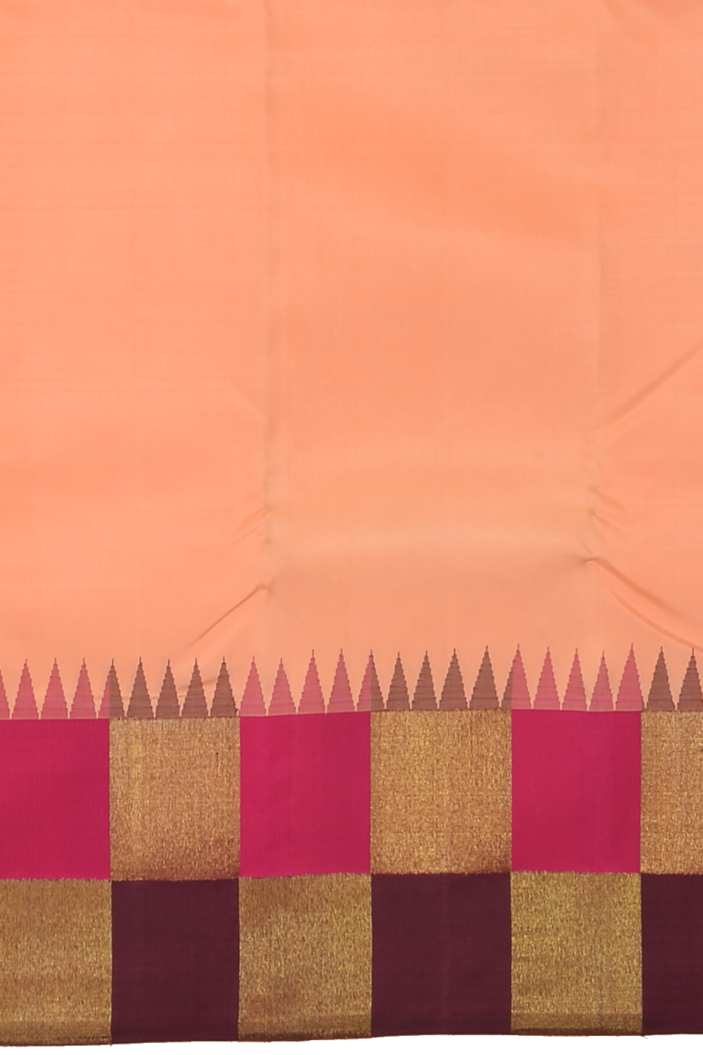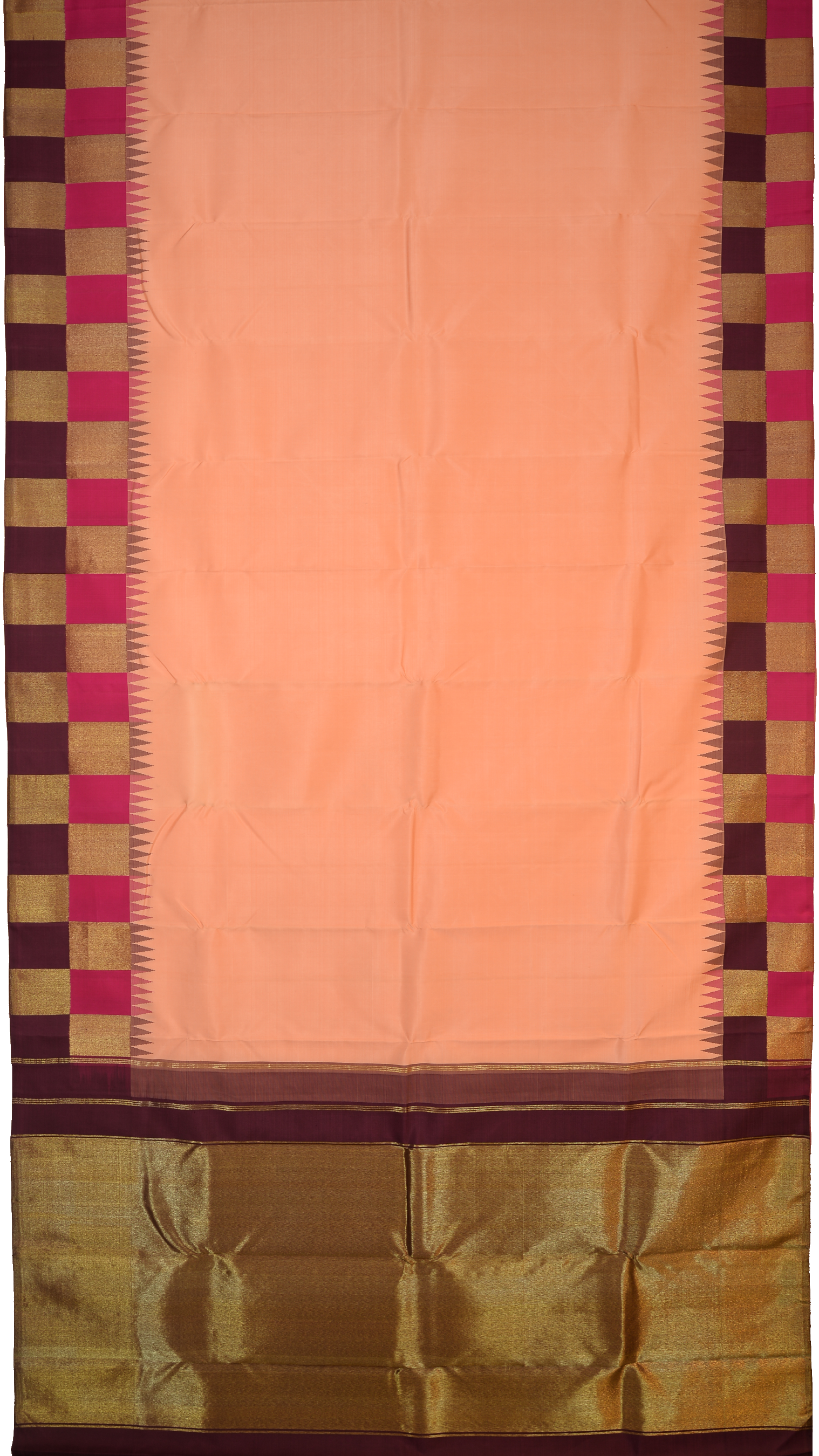 Experience serene elegance with this peach Kancheepuram silk saree. While the body remains plain, the traditional Korvai design speaks volumes about the depth of handloom artistry. Beetroot, pink, and gold checks on the border and tissue design on the pallu give the saree a charismatic touch. Paired with a magenta blouse, this saree evokes a sense of tradition intertwined with contemporary aesthetics.