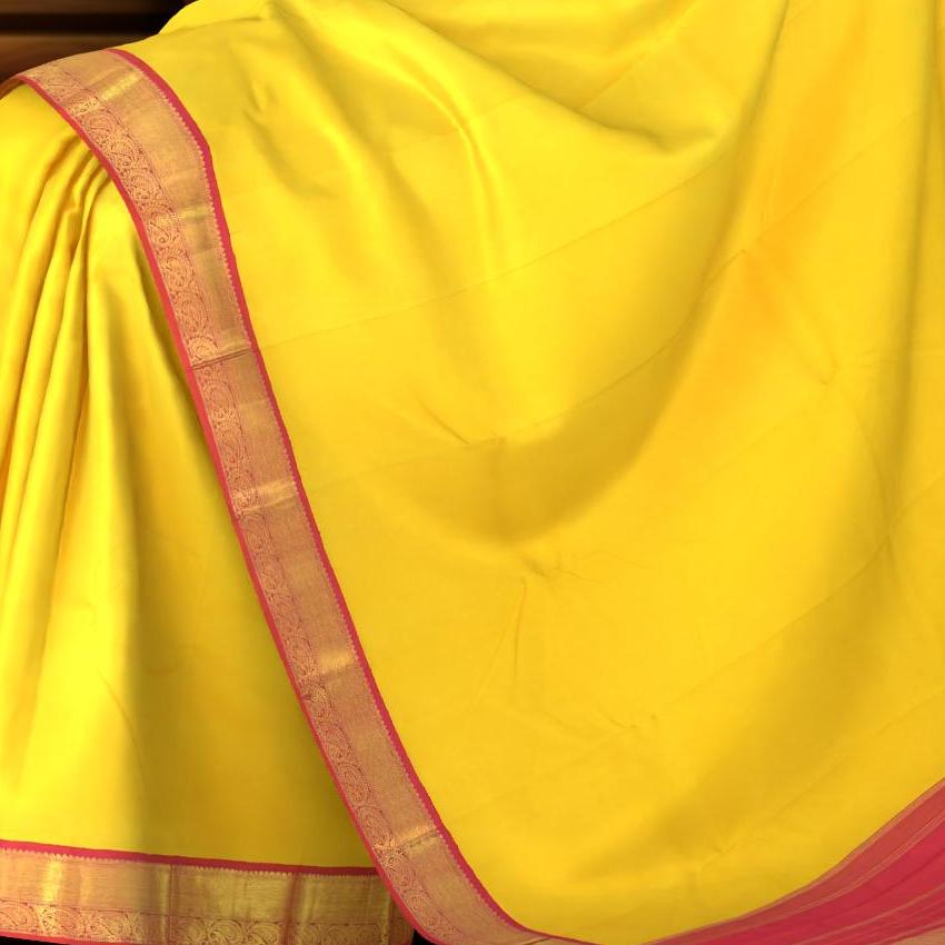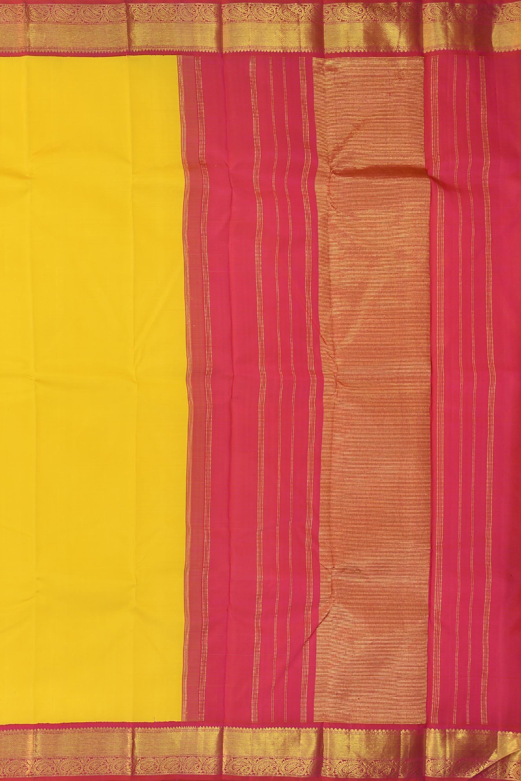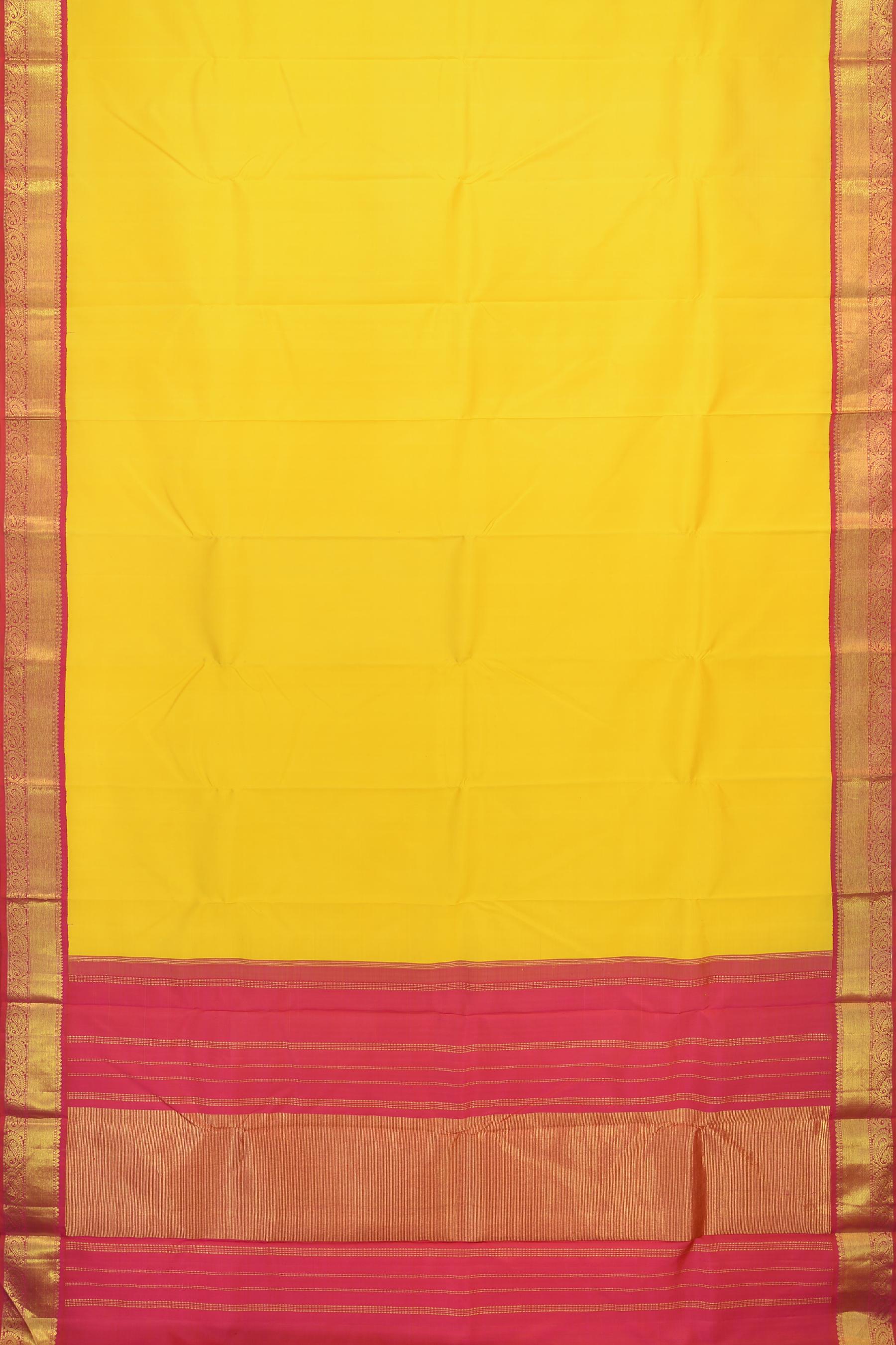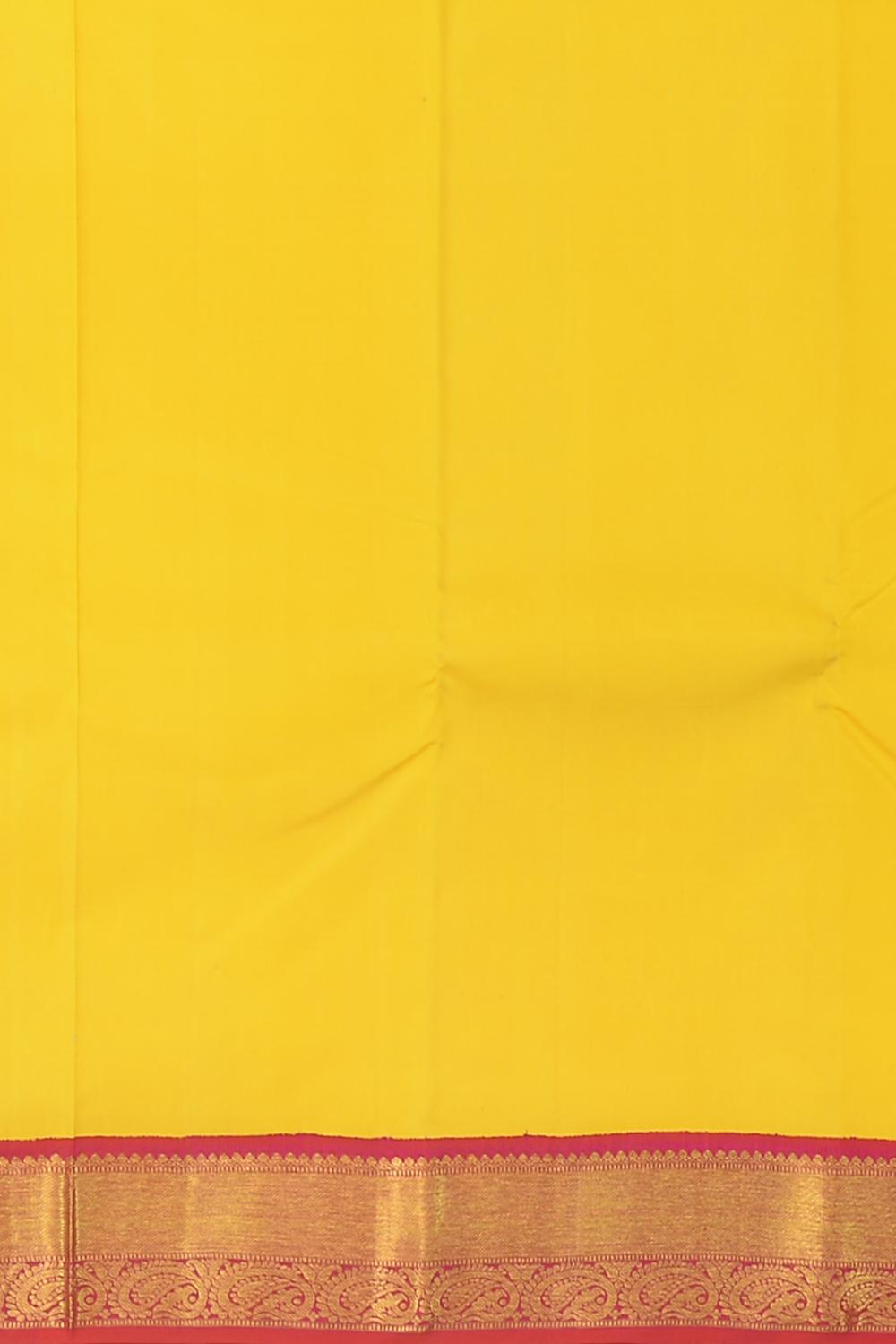 Brighten your collection with this vibrant Yellow Kancheevaram silk saree, a beam of sunshine woven into the fabric of tradition. This saree features a plain texture that lays a perfect canvas for the contrasting Red Benaraspet border, embellished with mango motifs, symbolizing love, prosperity, and fertility.