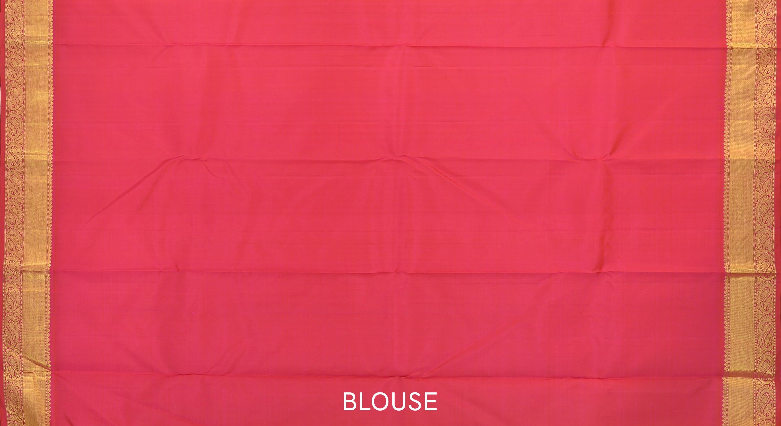 Accompanied by a Red blouse, this saree is a testament to the enduring beauty of Kancheevaram silk, marrying the simplicity of its weave with the complexity of its border and pallu designs, making it a must-have for those who cherish traditional wear with a touch of brightness.