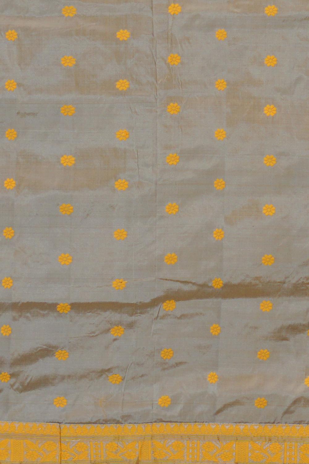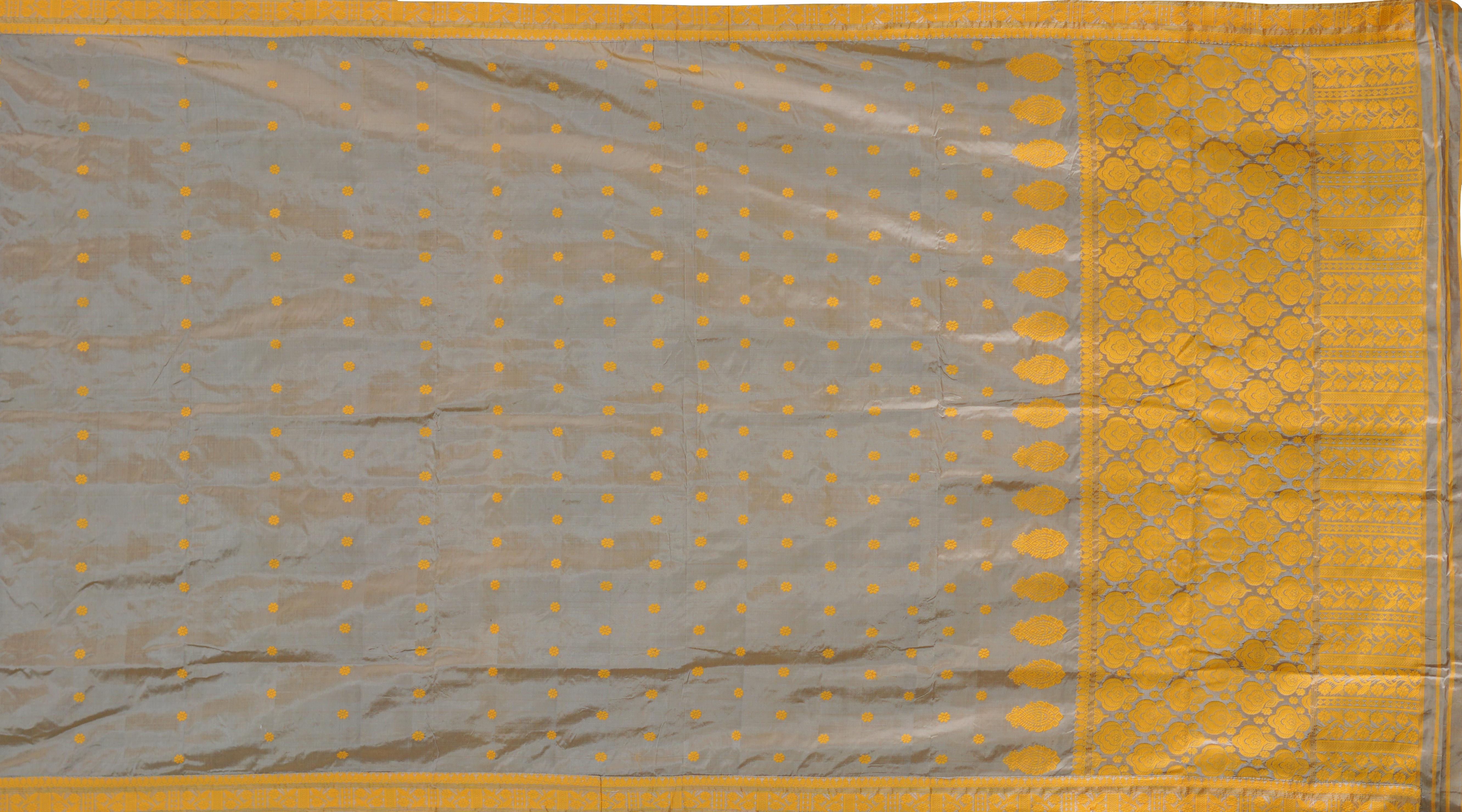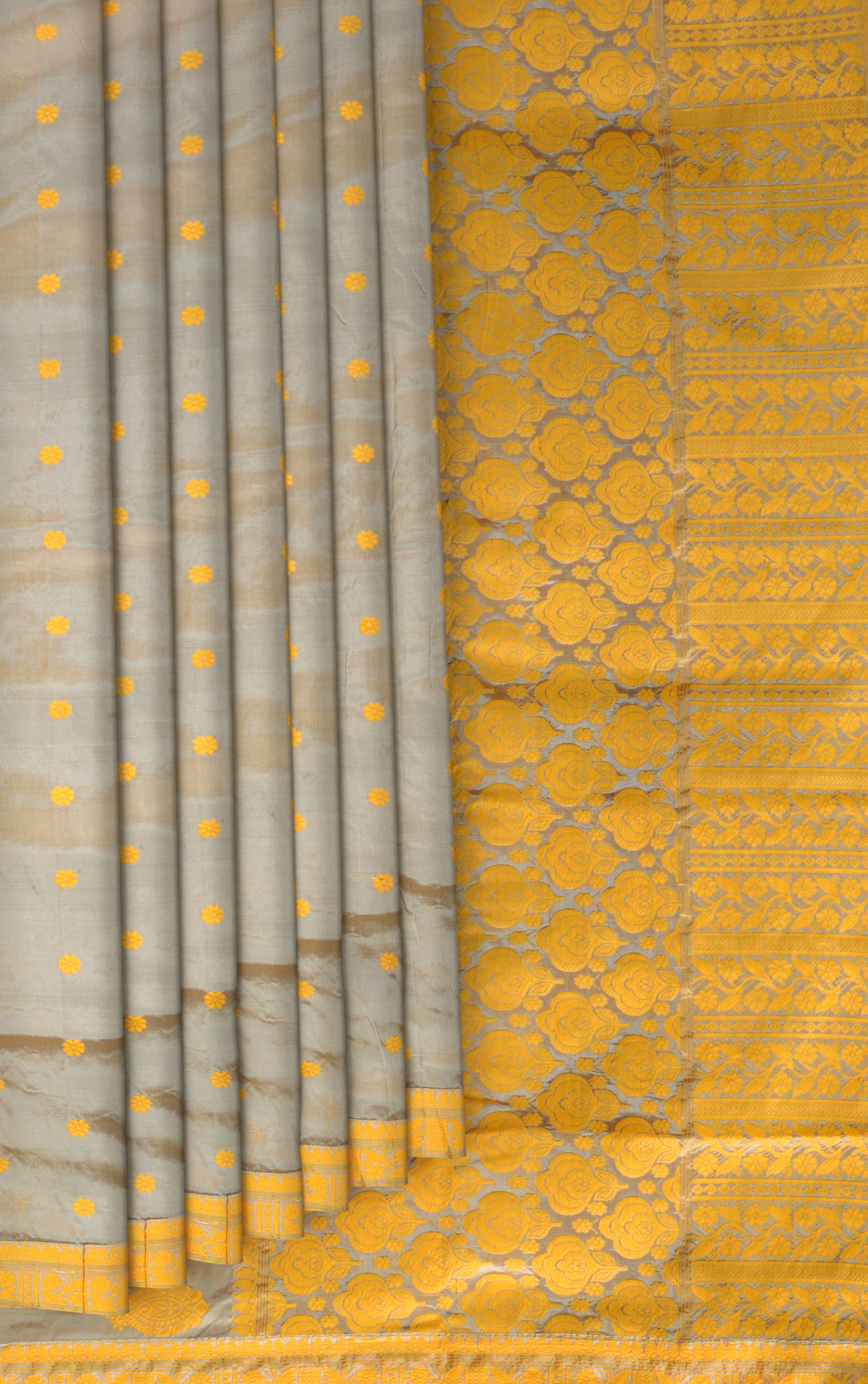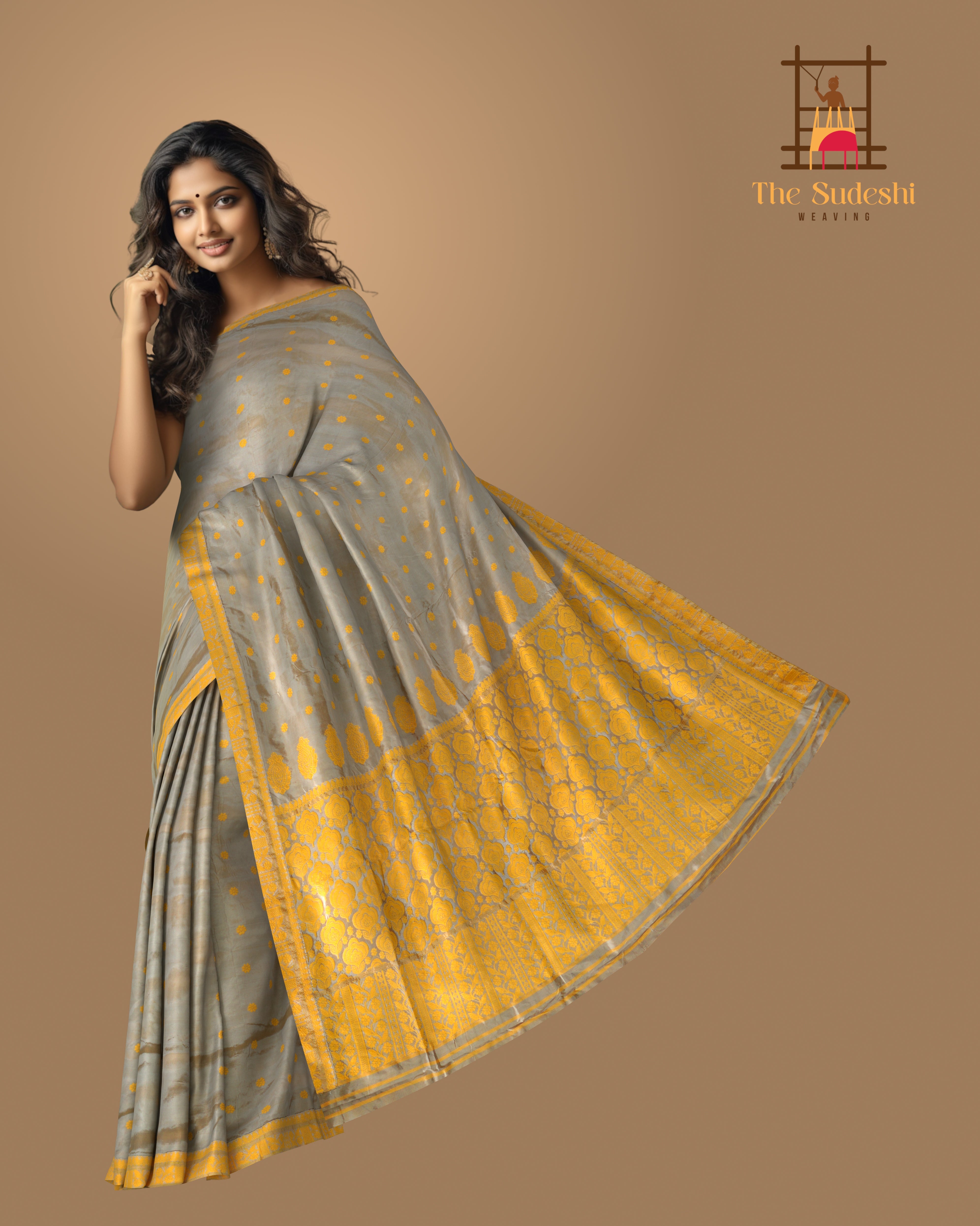 The motifs on this saree are inspired by Assamese culture and nature, featuring geometric and stylized patterns that symbolize flowers, plants, and traditional artifacts. These motifs, woven using the extra-weft technique and viscose, add a raised, embossed effect that enhances the saree's texture and depth. The combination of khaki and yellow is both sophisticated and modern, appealing to women of all ages.