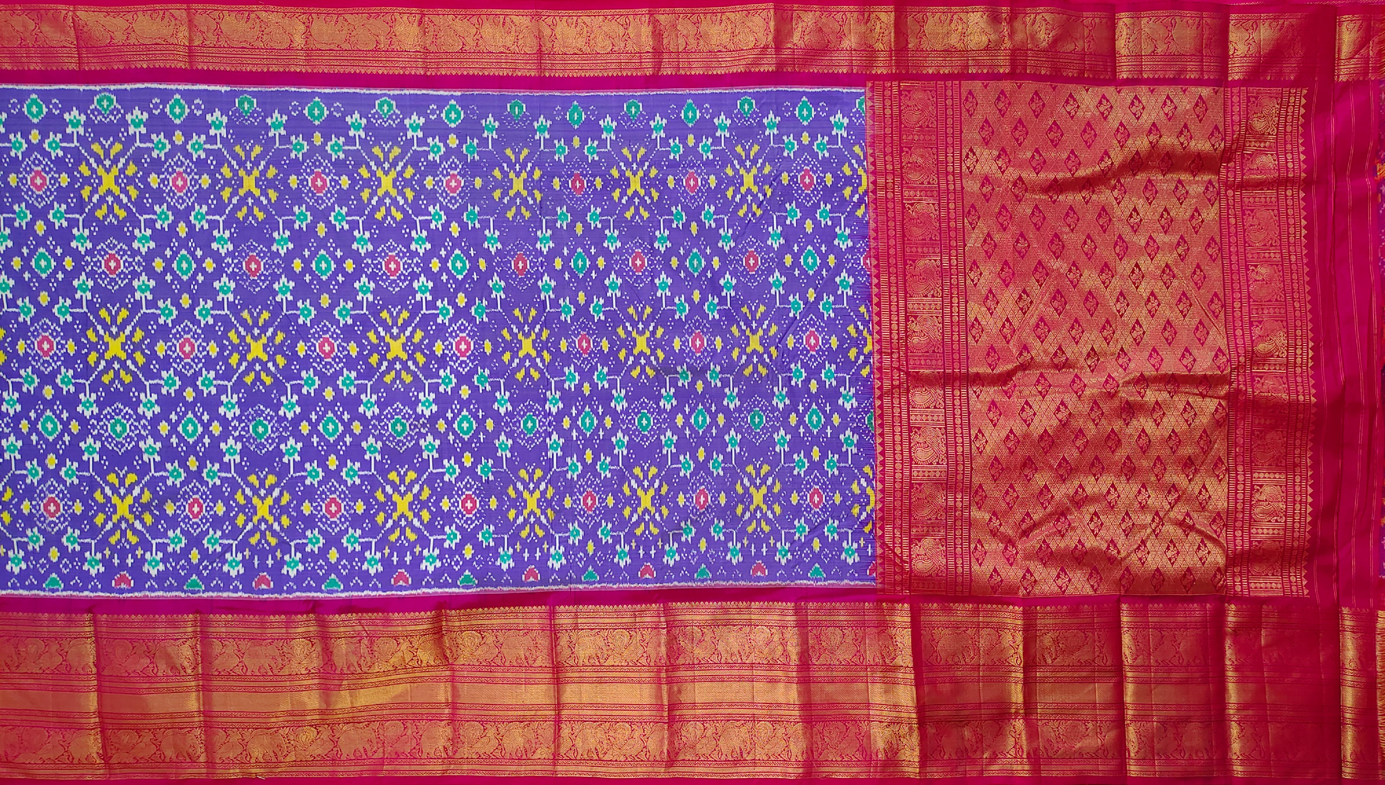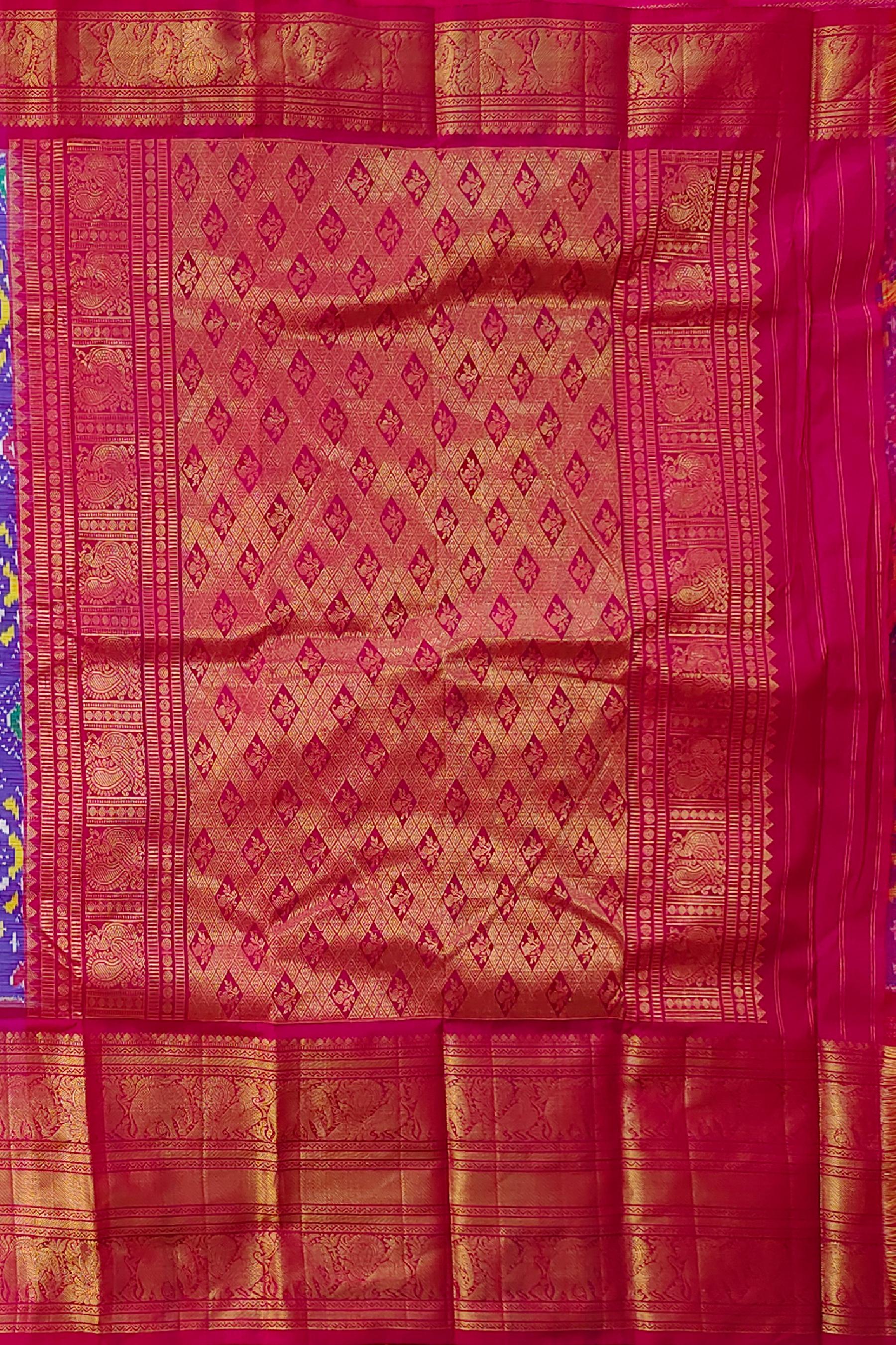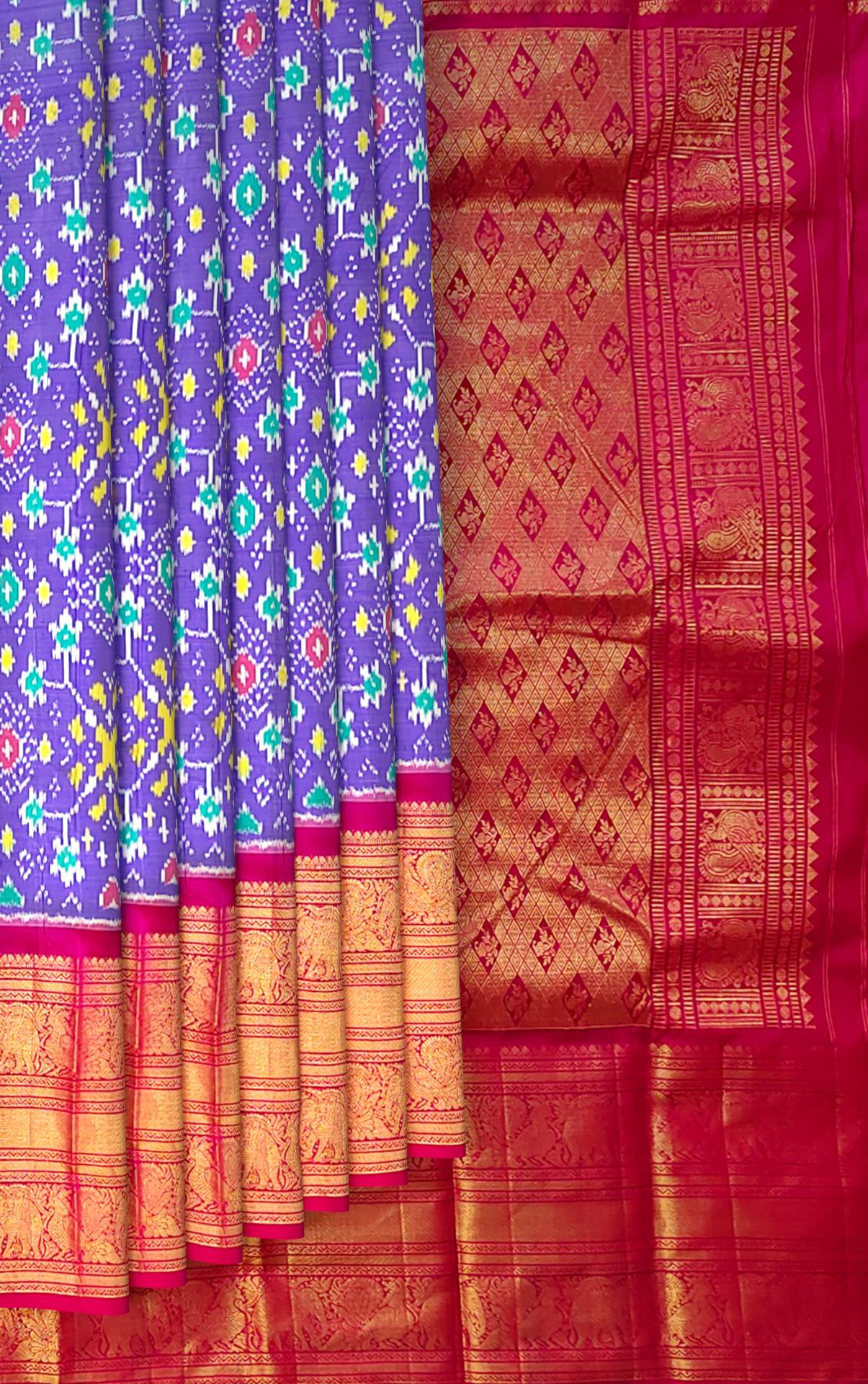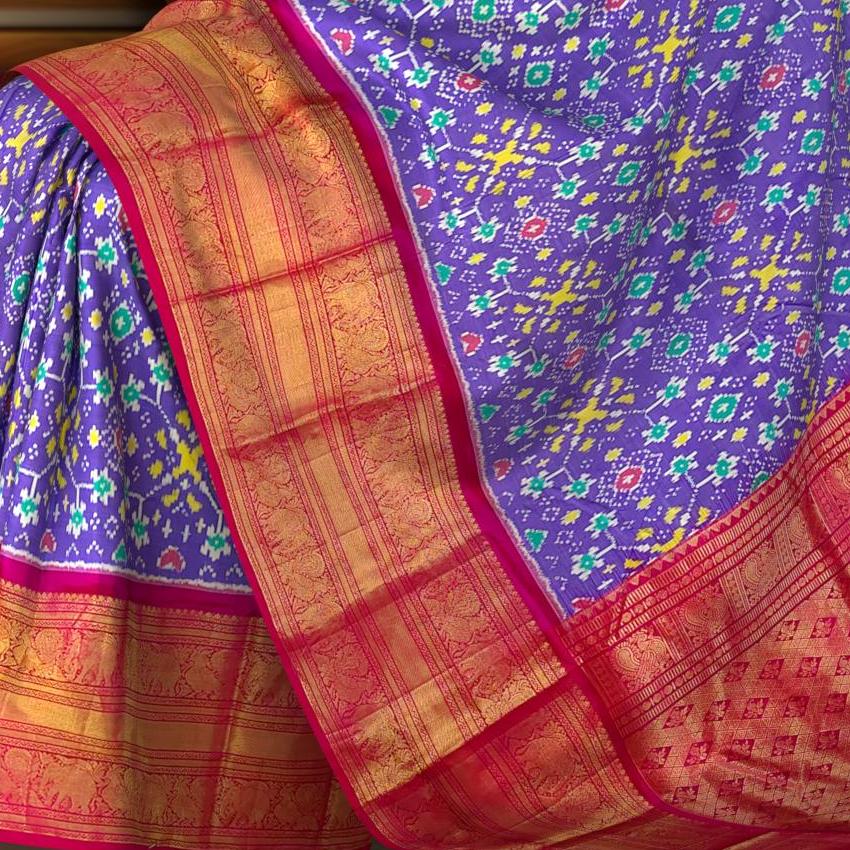 Step into elegance with our Lavender and Pink Navaratna Pochampally Saree. The soft lavender body is beautifully paired with a rich pink pallu and blouse, creating a graceful and feminine ensemble. Ideal for festivals and social events, this saree features the Navaratna design, symbolizing the nine gems, adding a touch of auspiciousness and tradition to your look.