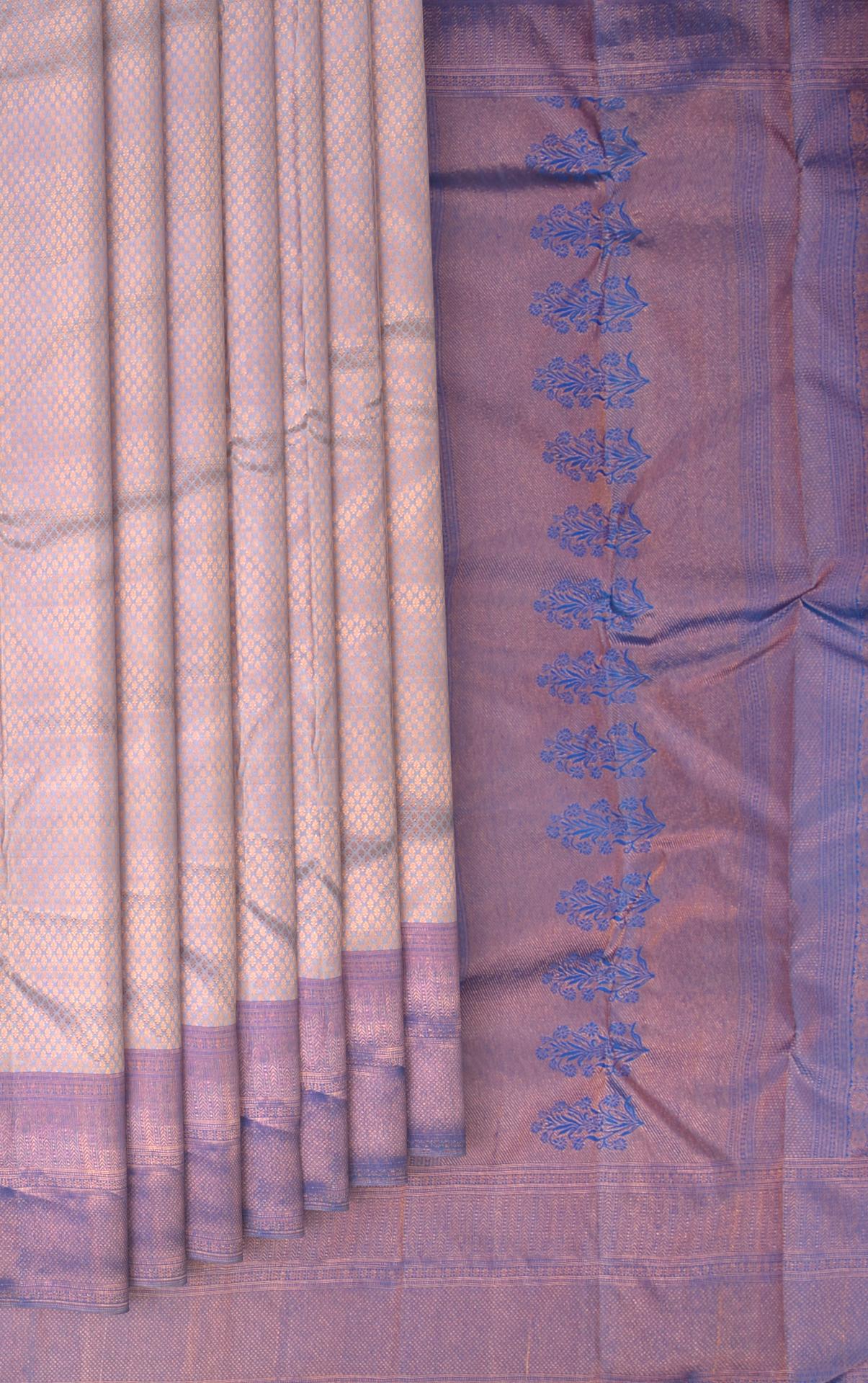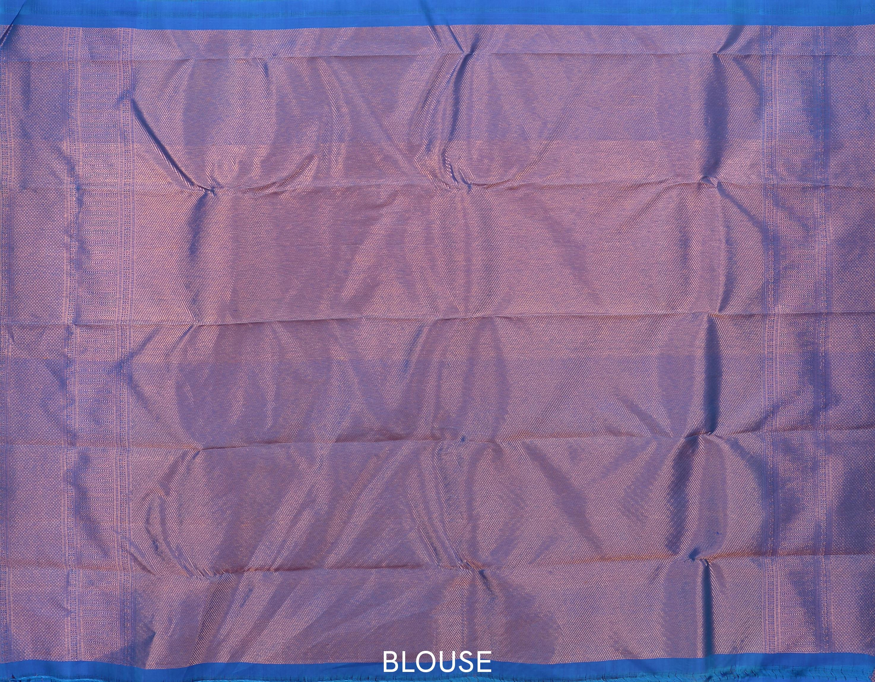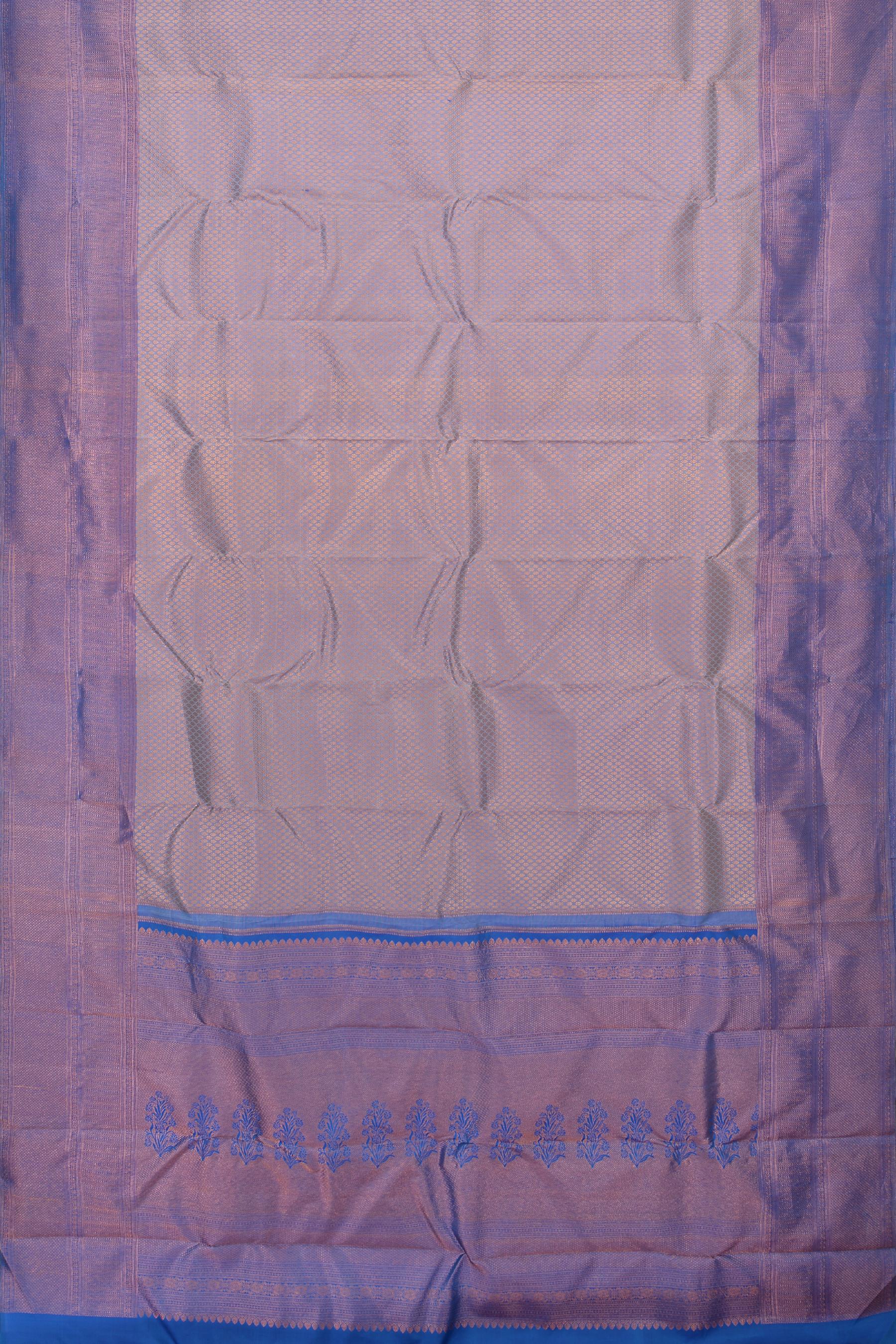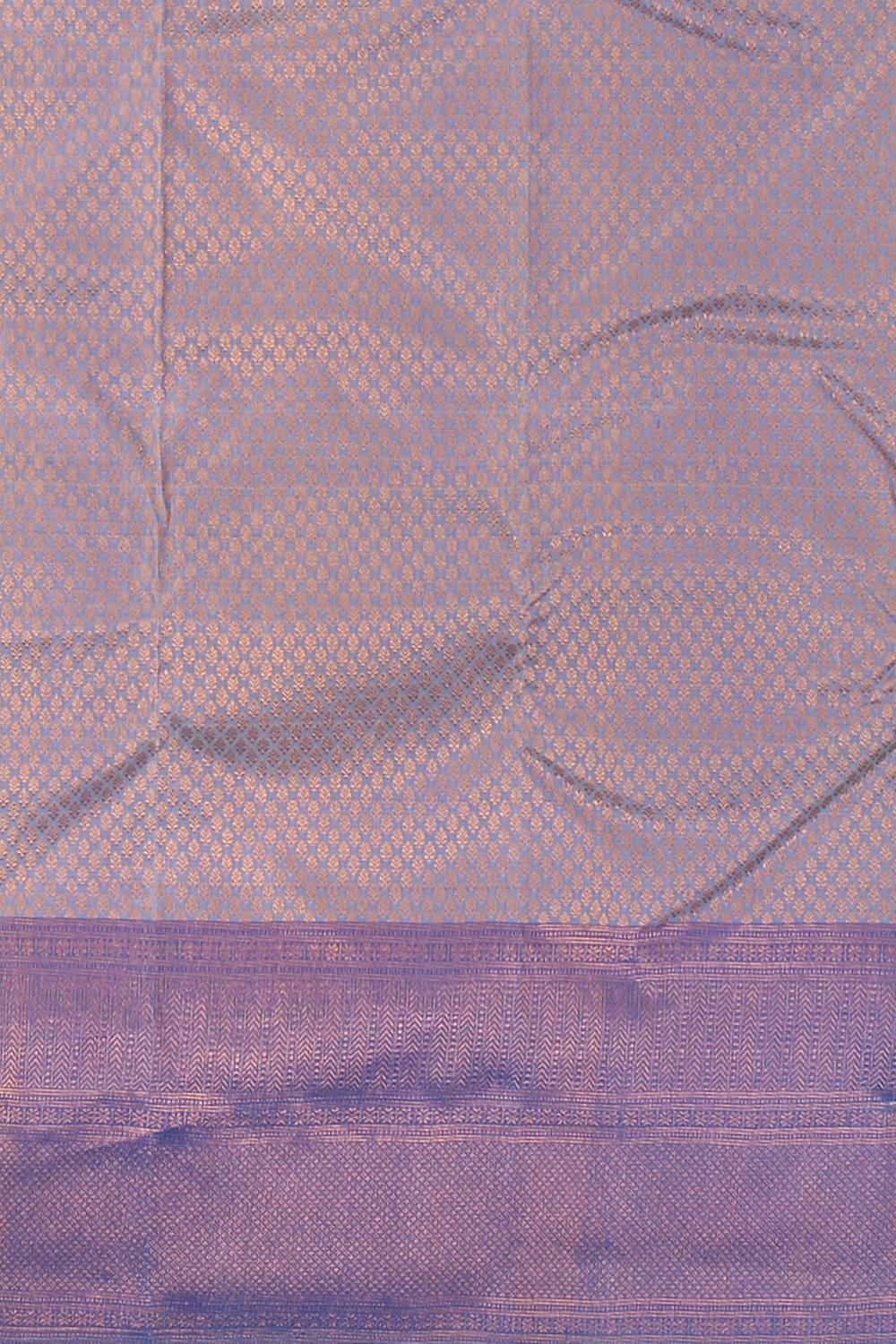 The allure of lavender is captured beautifully in this Kanchipuram silk saree, with its body enhanced by the sophisticated copper zari jacquard design. The contrast blue border and pallu provide a rich tapestry that complements the serene lavender, reminiscent of early morning skies. The pallu is an intricately woven floral pattern with mayil kan, completing the saree's look of subtle elegance and charm.
