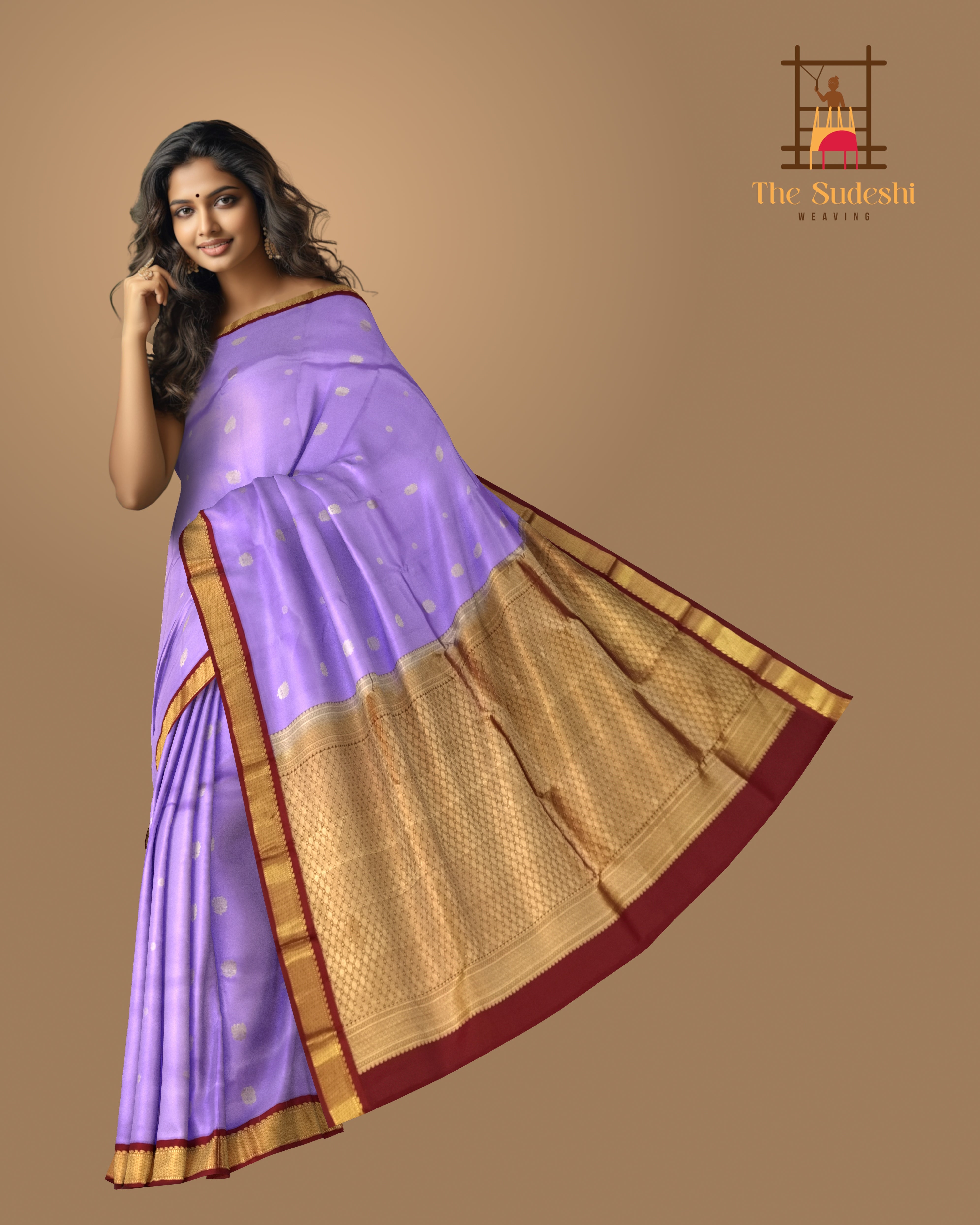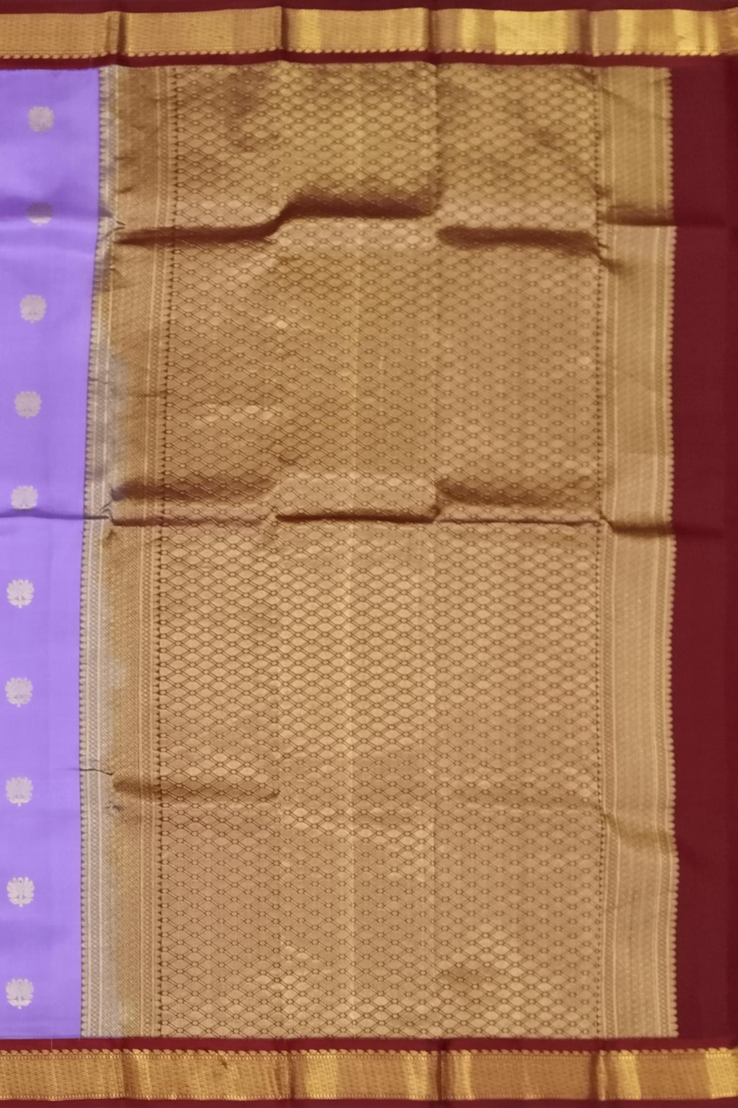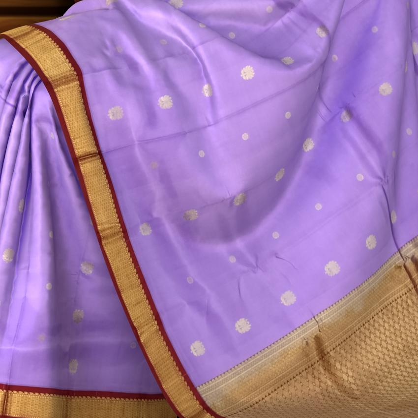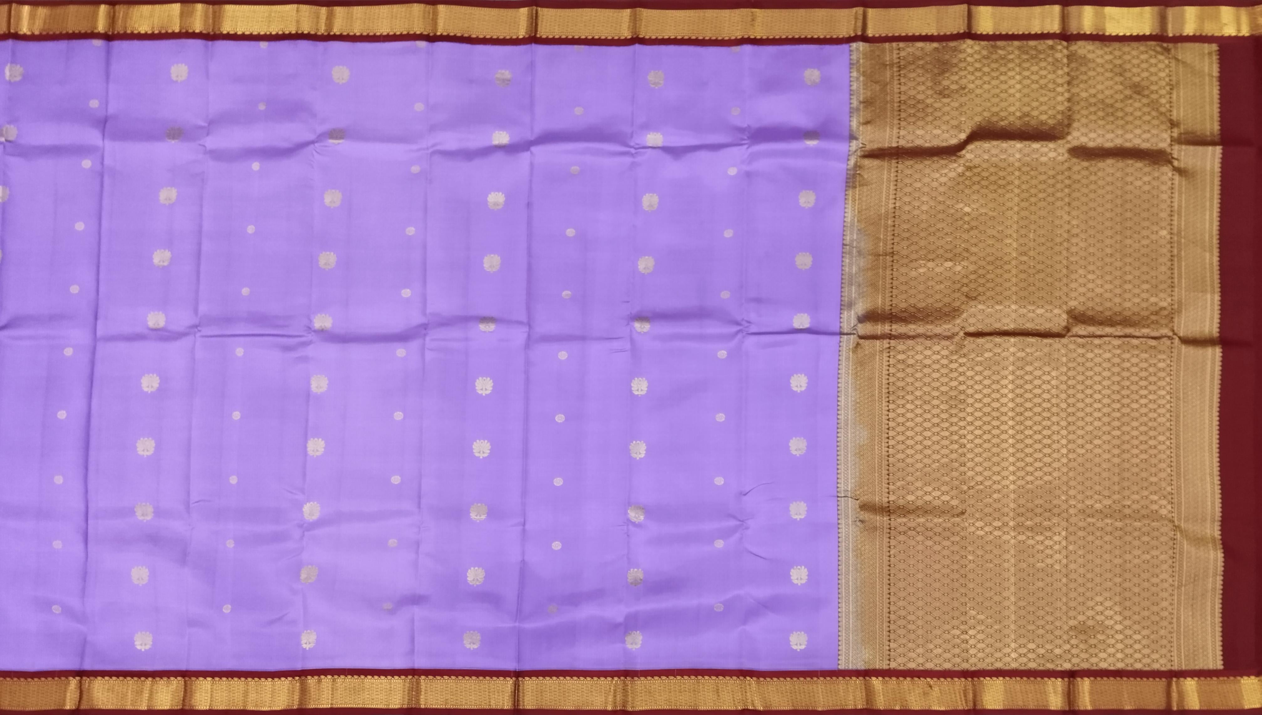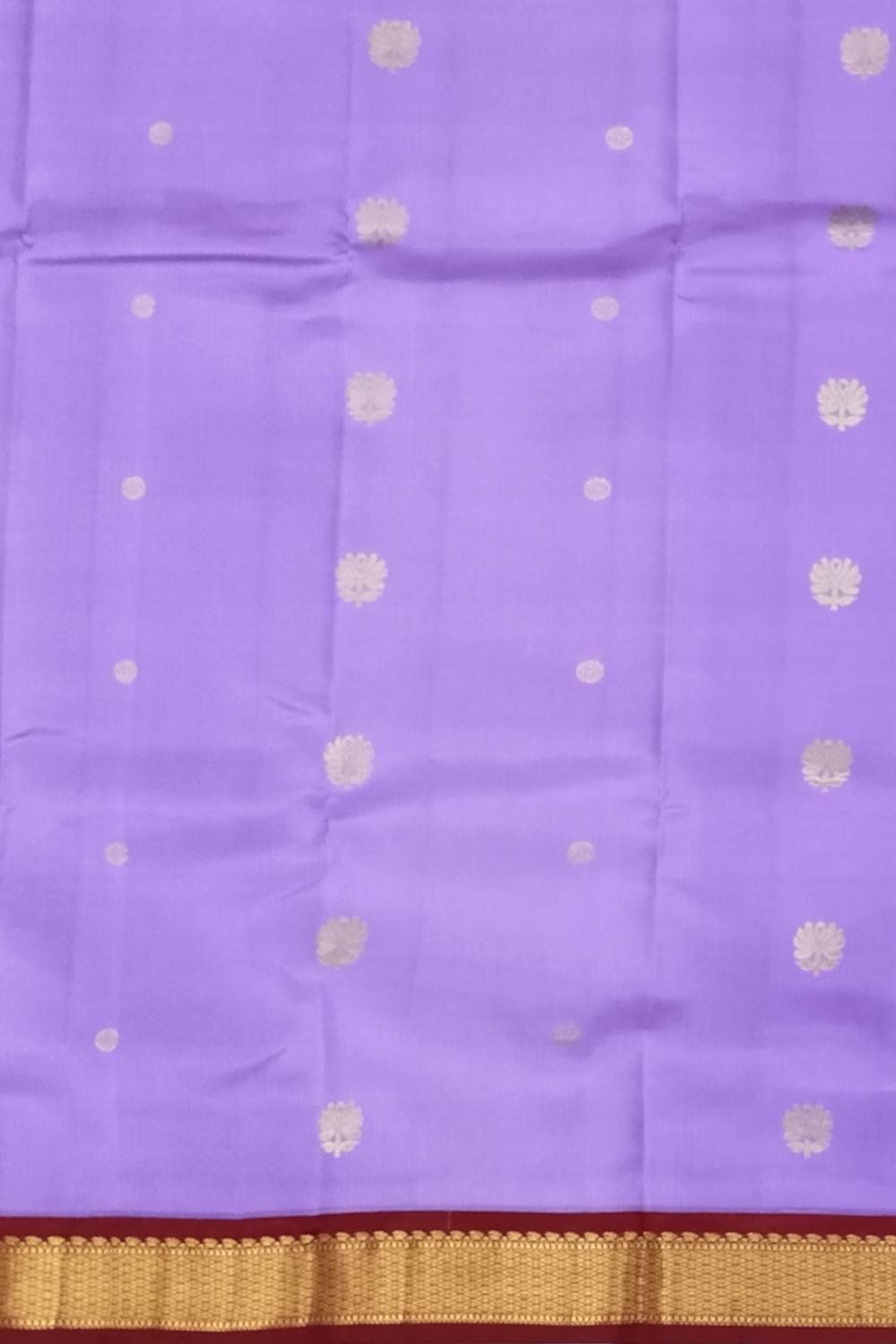 Discover the subtle charm of this Lavender Kanchipuram Silk Saree, gracefully adorned with delicate small bhuttas. The serene lavender hue of the saree's body offers a refreshing and contemporary take on traditional colors, while the tiny, meticulously woven bhuttas add a touch of refined elegance and understated luxury. This saree is a testament to delicate artistry, perfect for those who appreciate nuanced beauty.