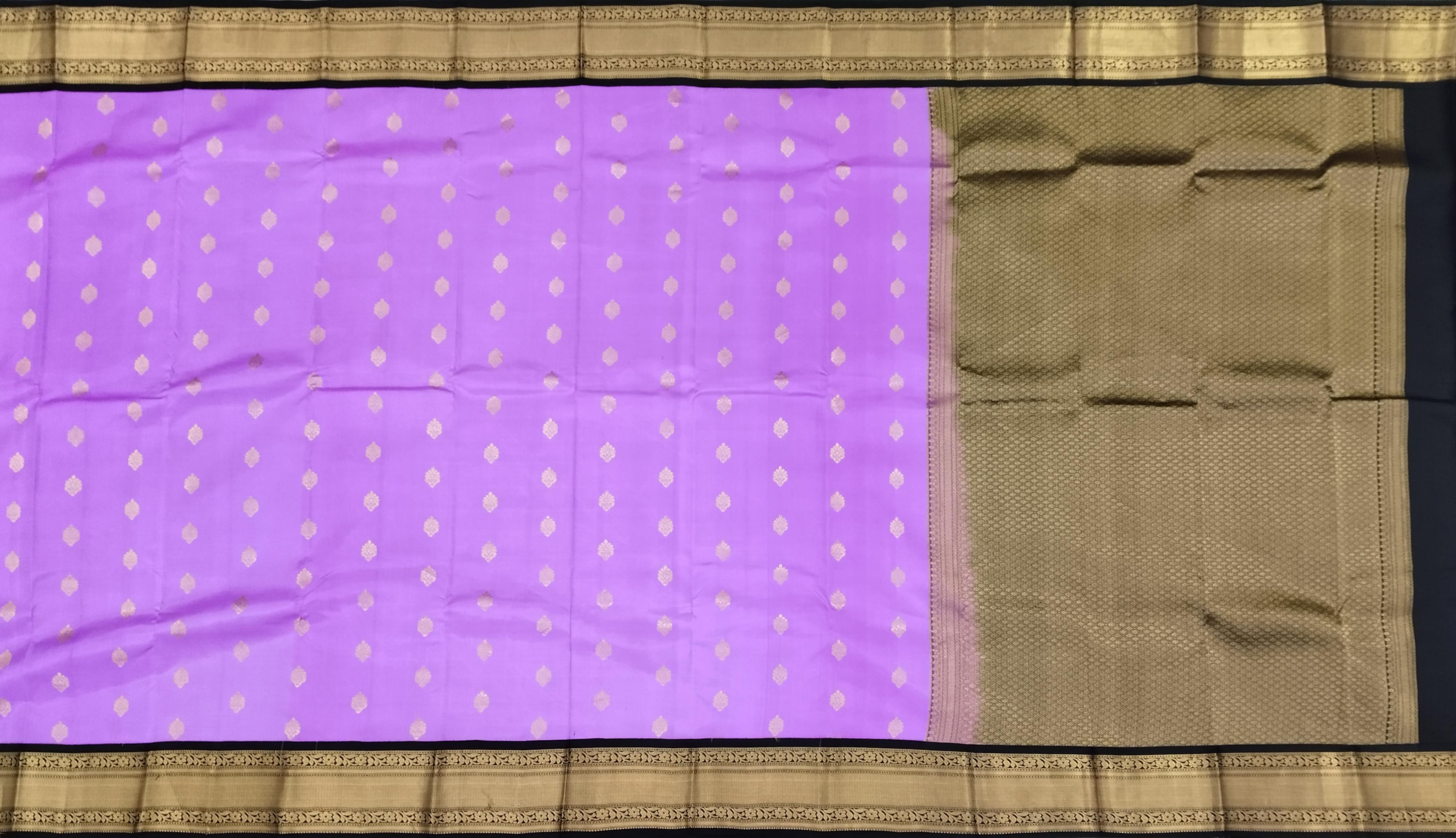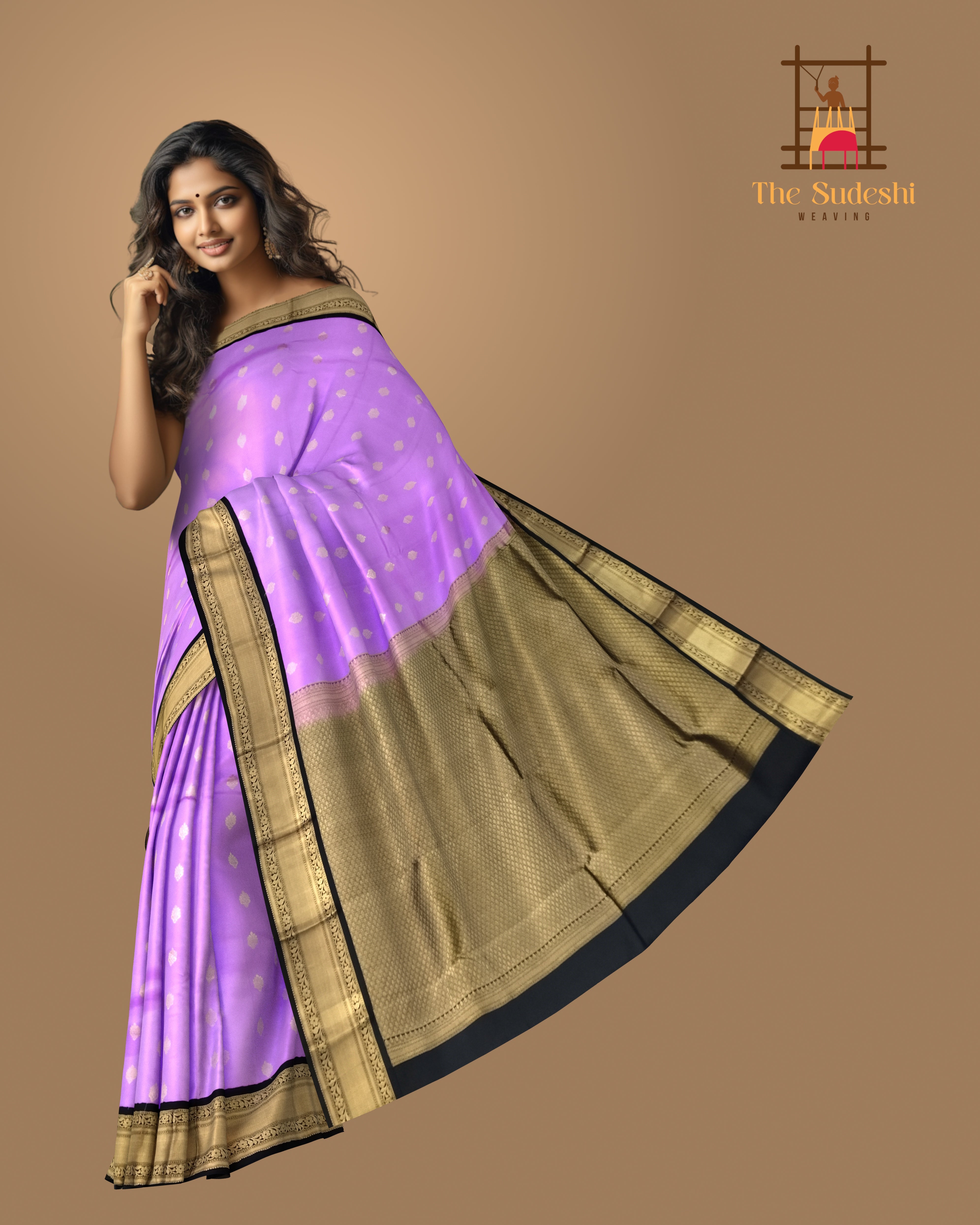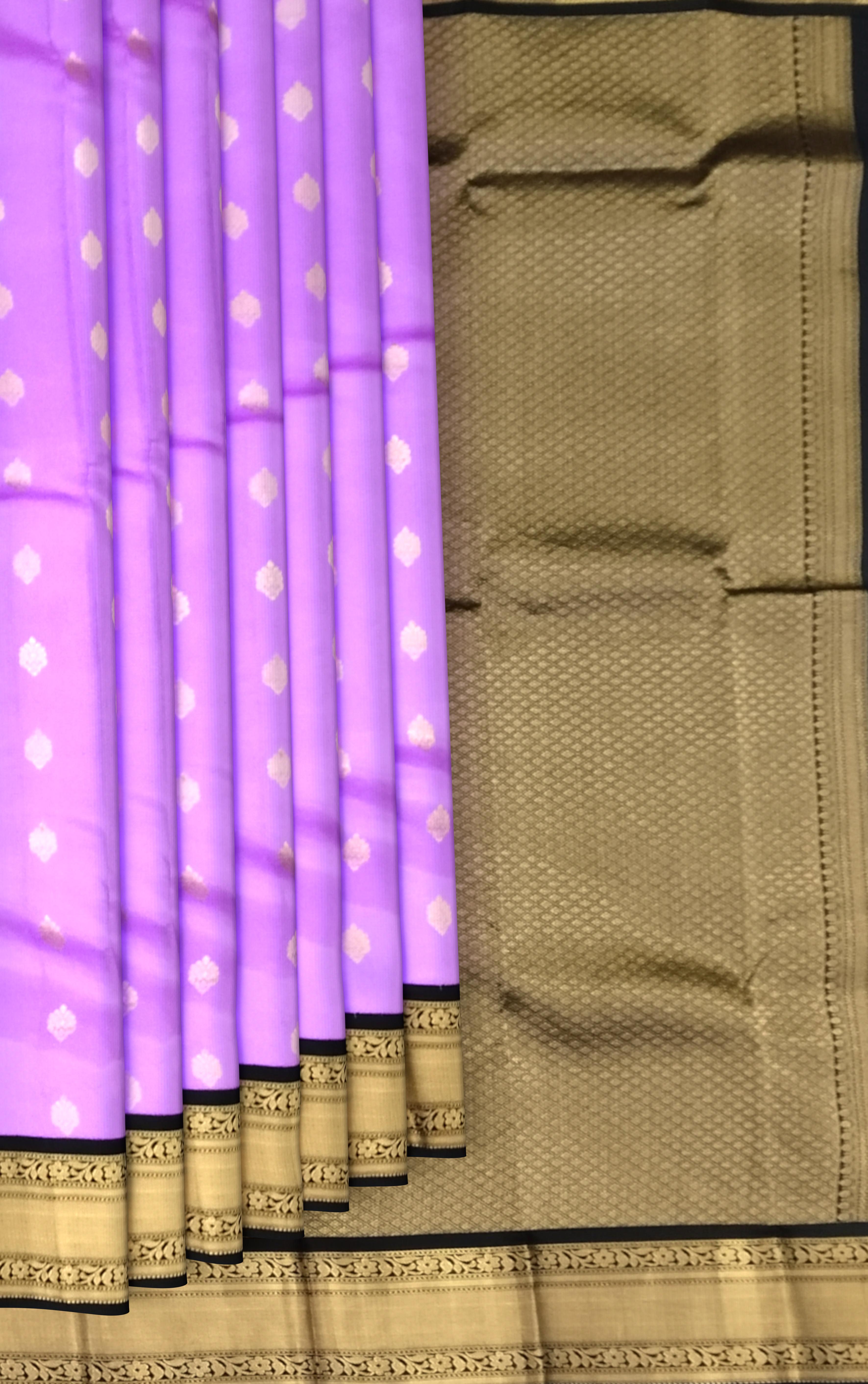 Step into a realm of mystical elegance with this enchanting Lavender Kanchipuram Silk Saree, exquisitely adorned with intricate bhuttas. The delicate lavender hue of the saree's body creates a captivating and unique aesthetic, offering a refreshing departure from traditional colors. The meticulously woven bhuttas, shimmering subtly, add depth and dimension to this ethereal piece, making it a true work of art.