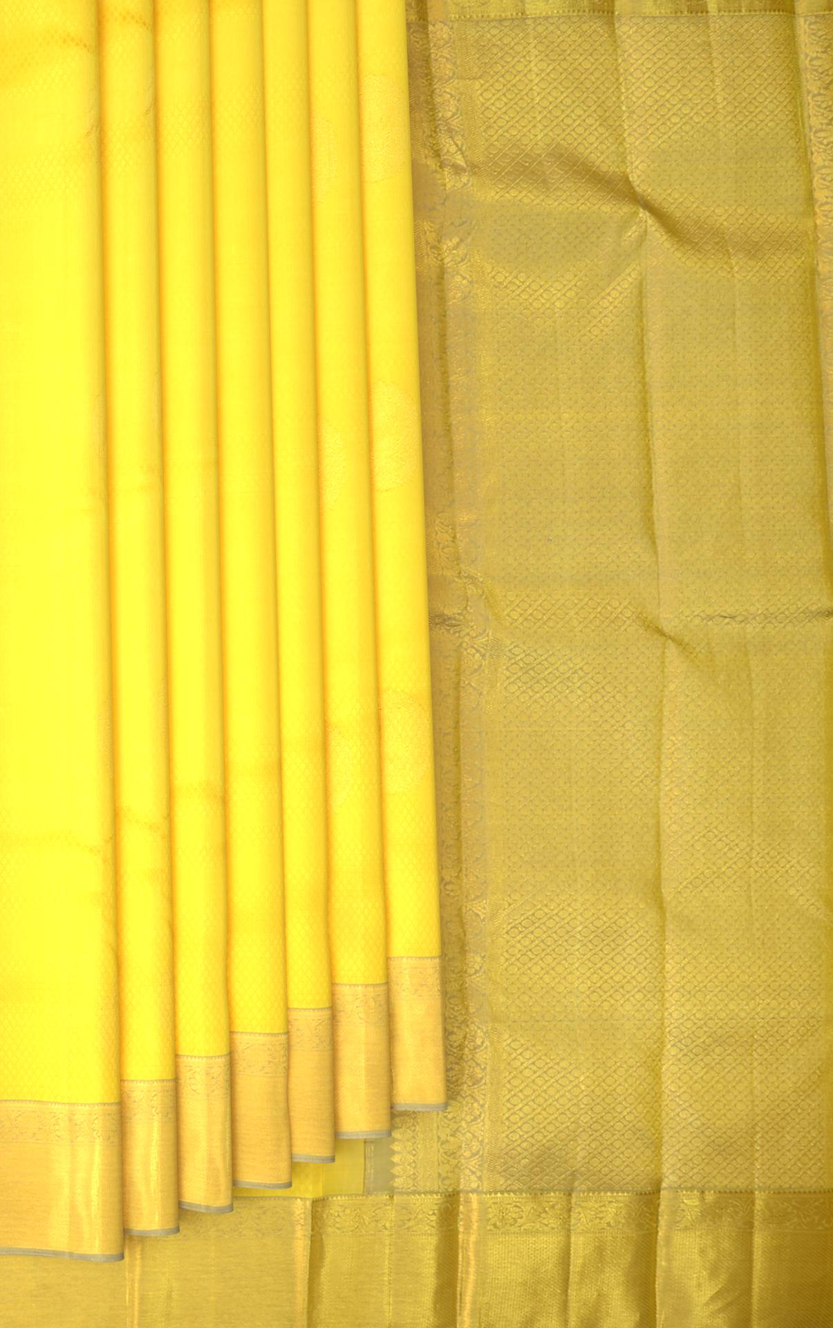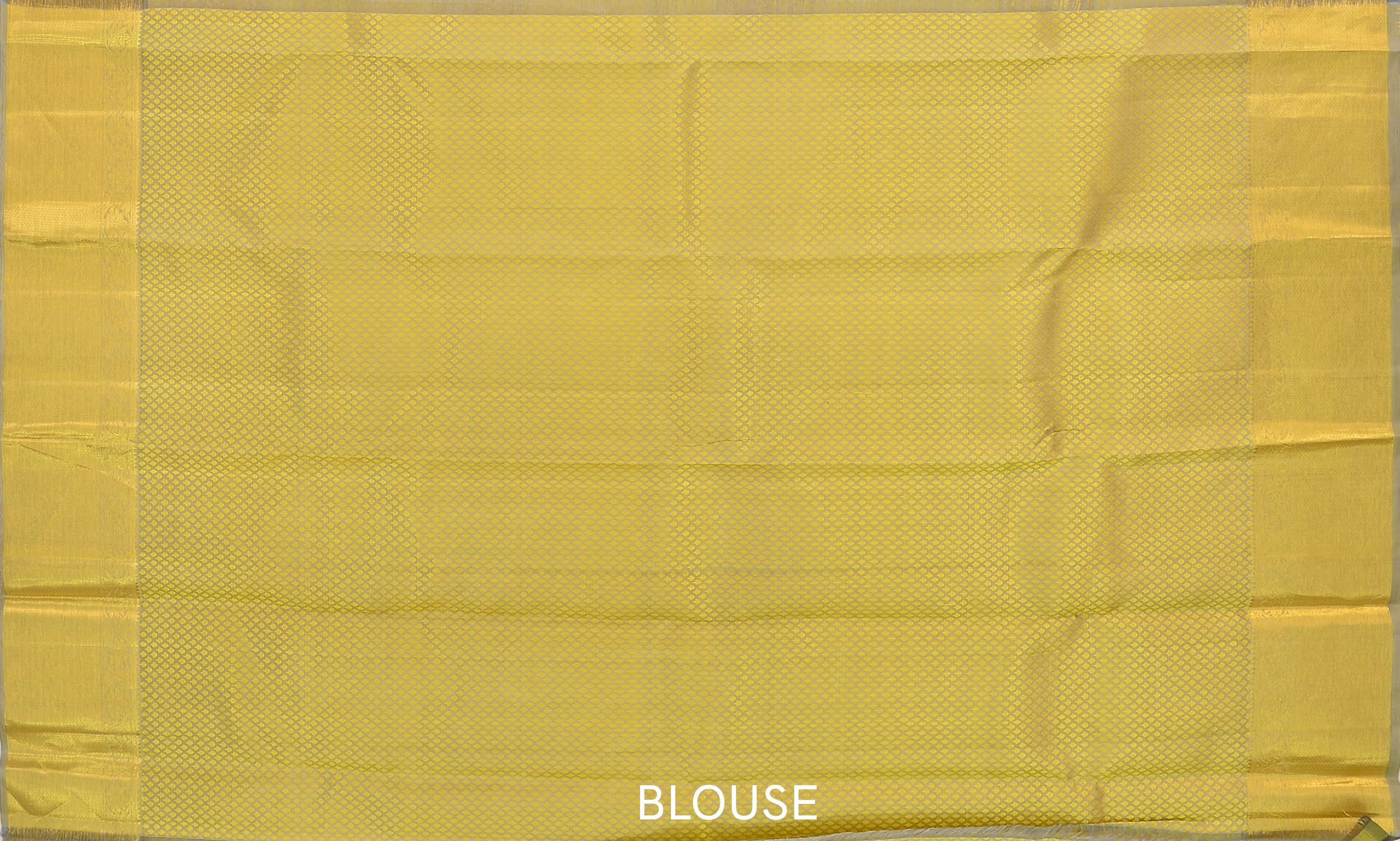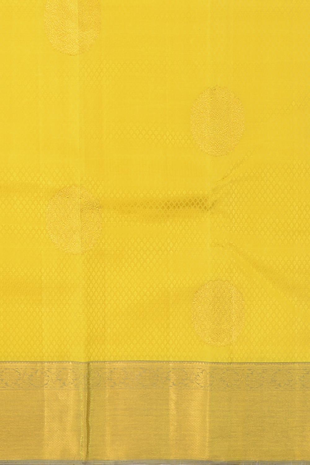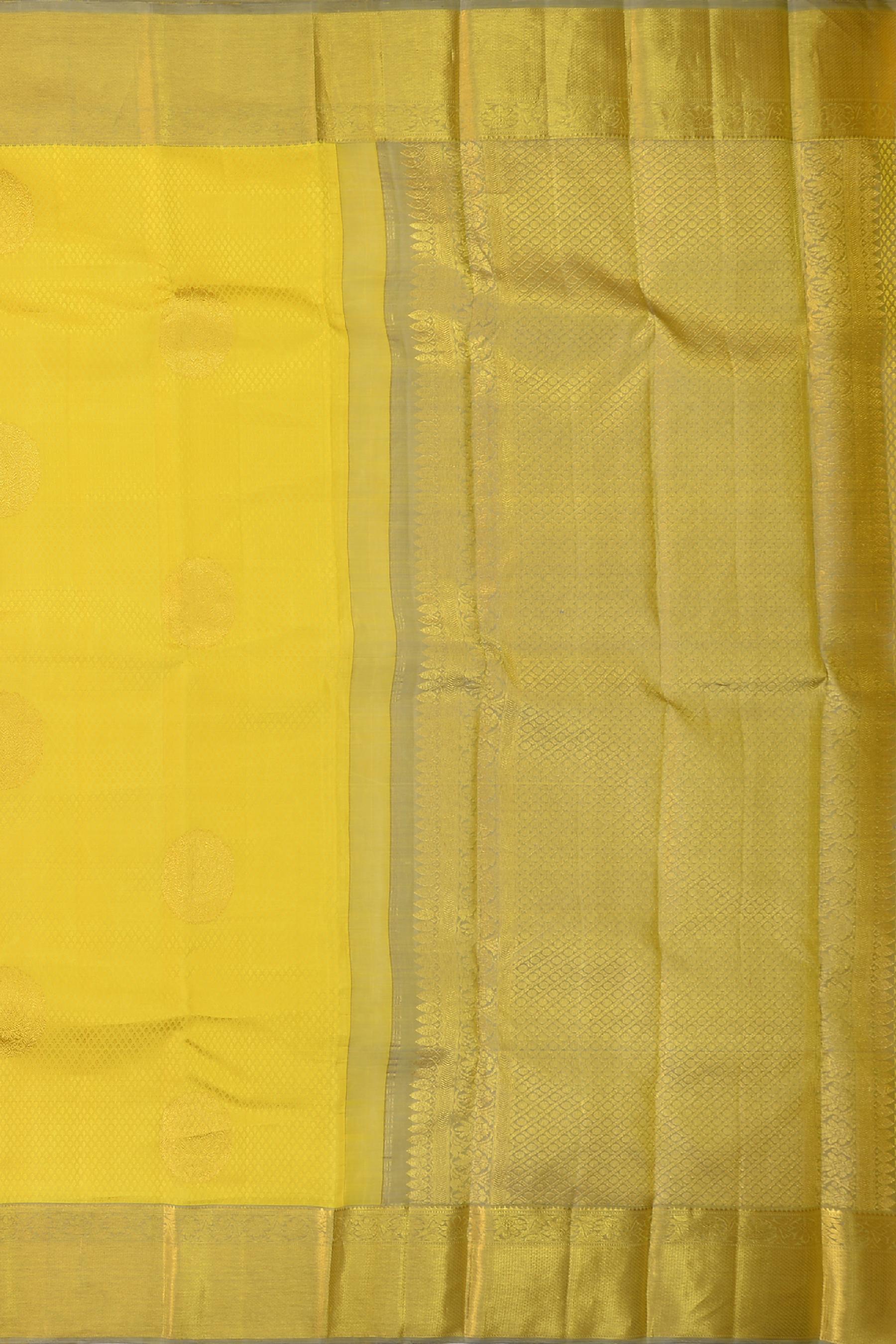 Brighten up your wardrobe with our Lemon Yellow Kancheevaram silk saree, a symbol of joy and vibrancy. Featuring jacquard with big round buttas, this saree combines traditional motifs with a playful color palette. The contrast Grey border, adorned with a floral design, adds a serene balance to the lively yellow, making it a unique piece in your collection.