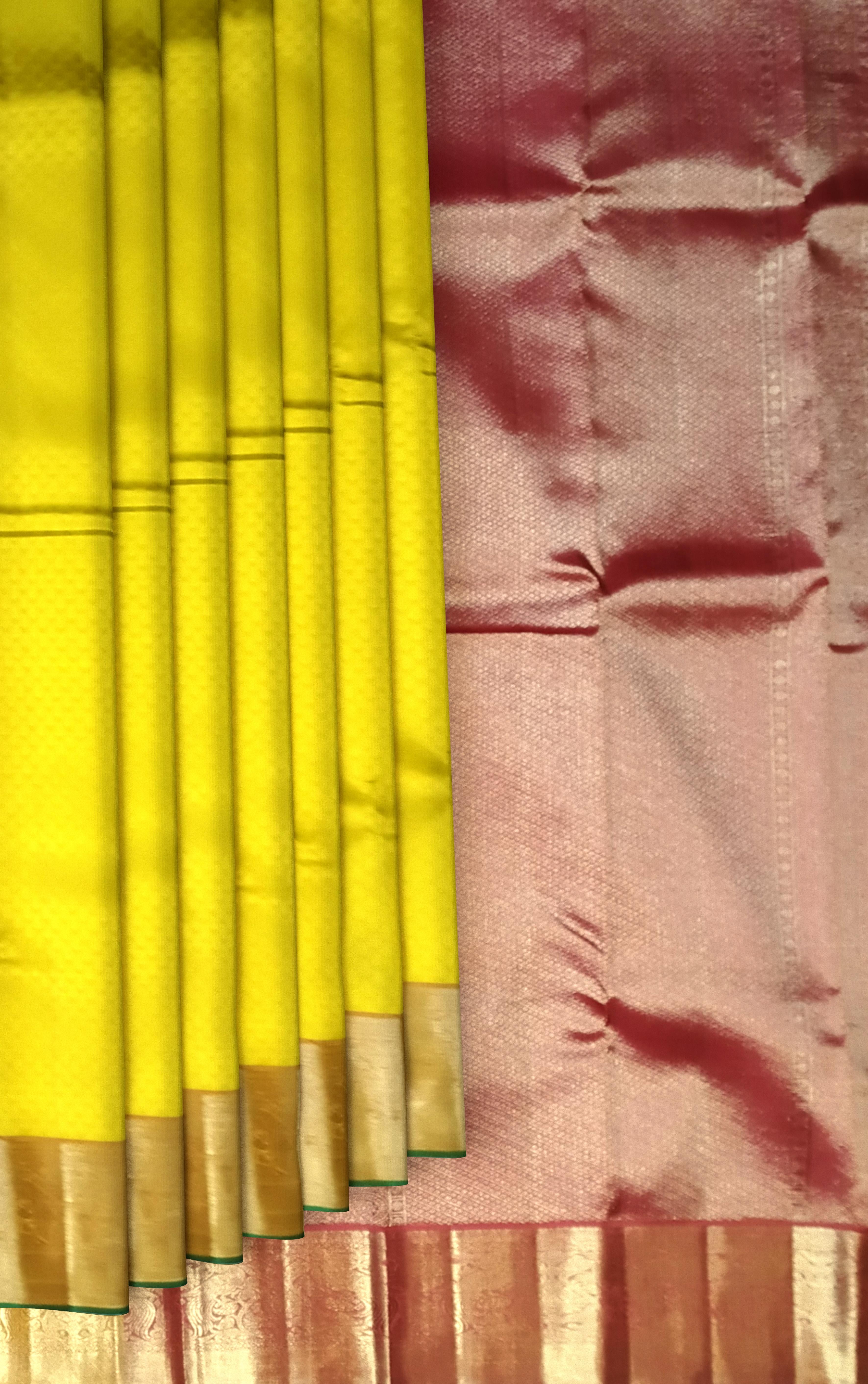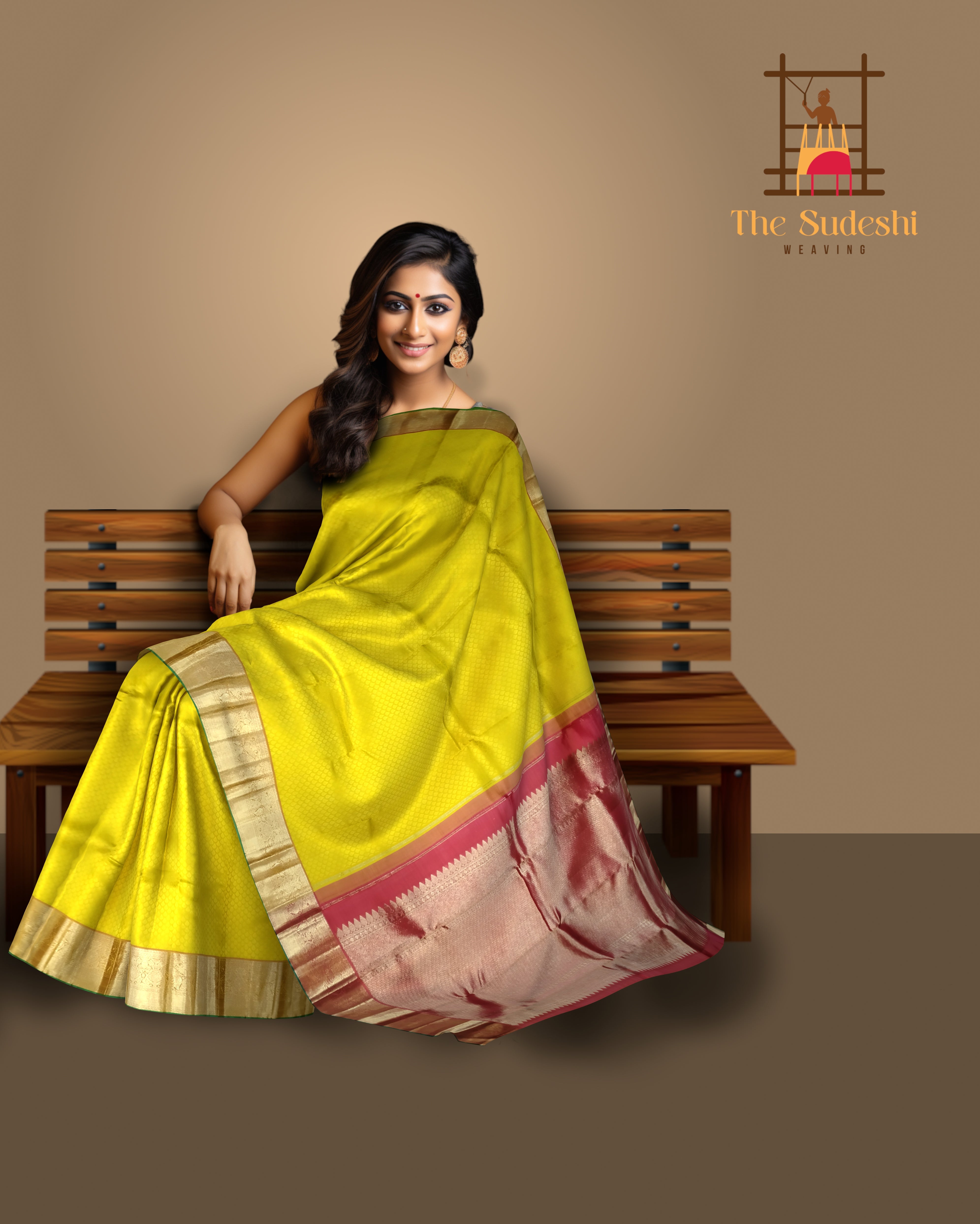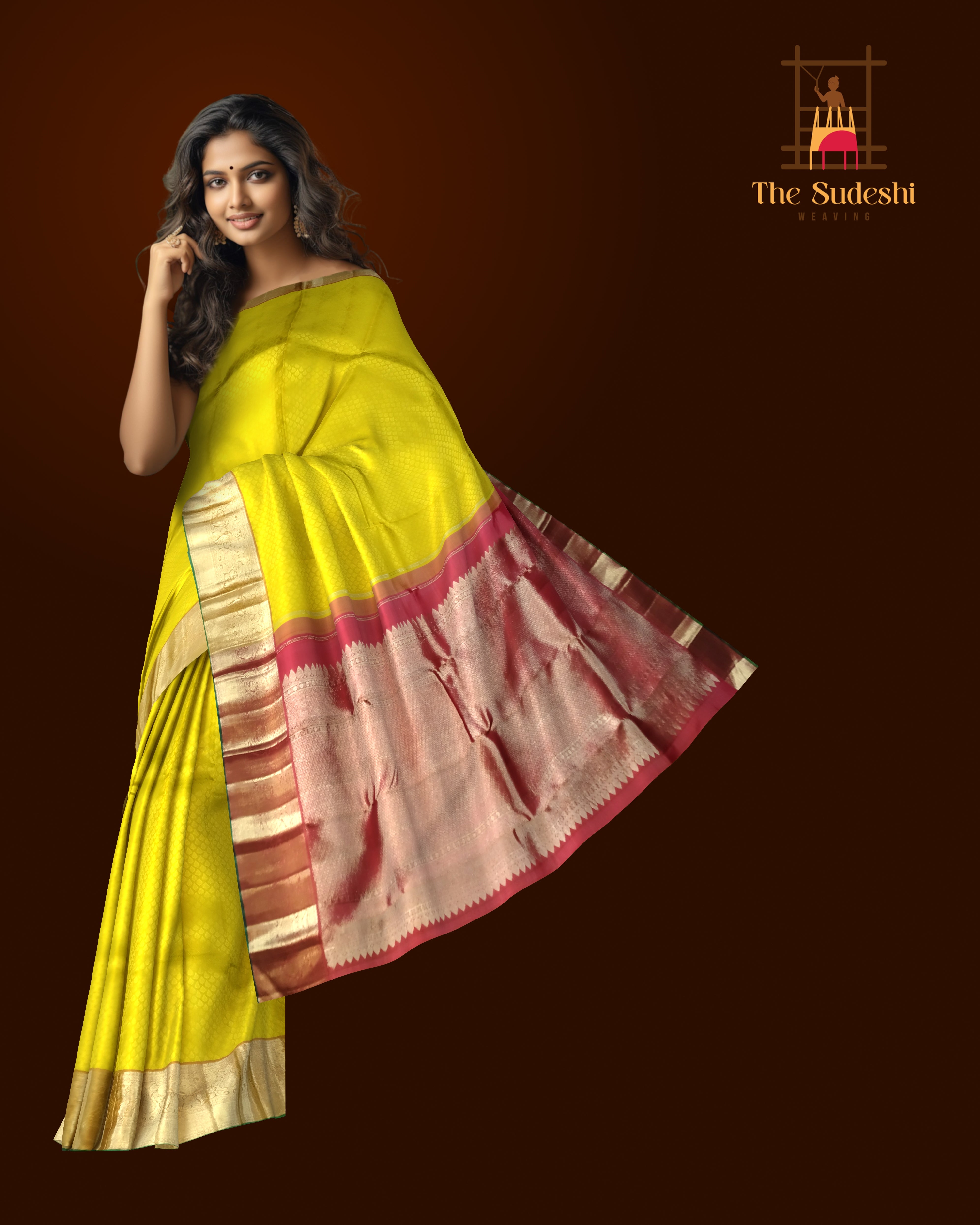 The jacquard motifs, reminiscent of temple art and natural droplets, carry meanings of fertility, life, and auspicious beginnings. The lemon yellow hue stands for positivity and celebration, while the contrasting red and green details highlight the mastery of traditional South Indian weaving. This saree reflects the soul of Kanchipuram—a town known for its luxurious silks, meticulous handlooms, and culturally rich motifs that have stood the test of time.