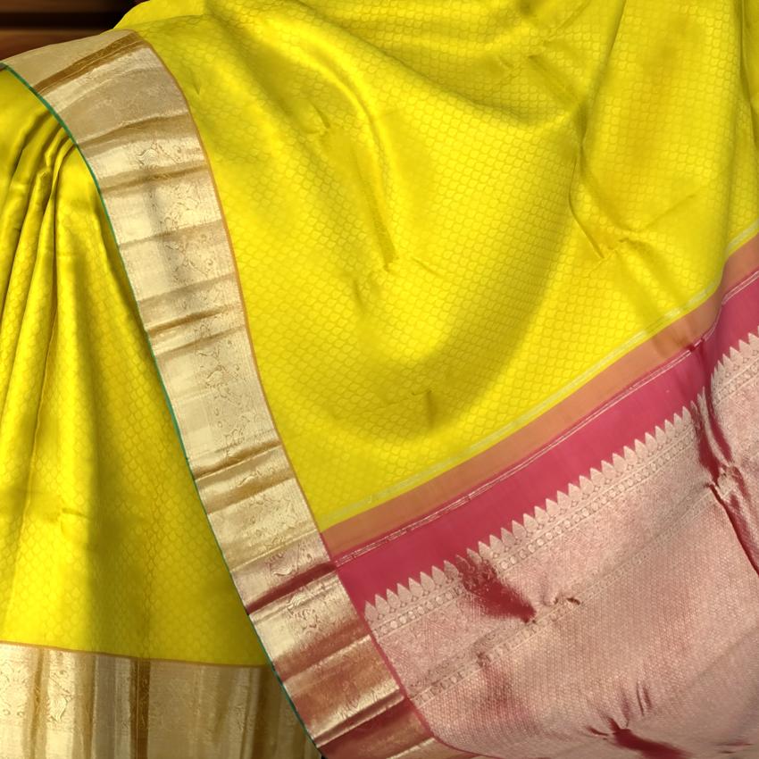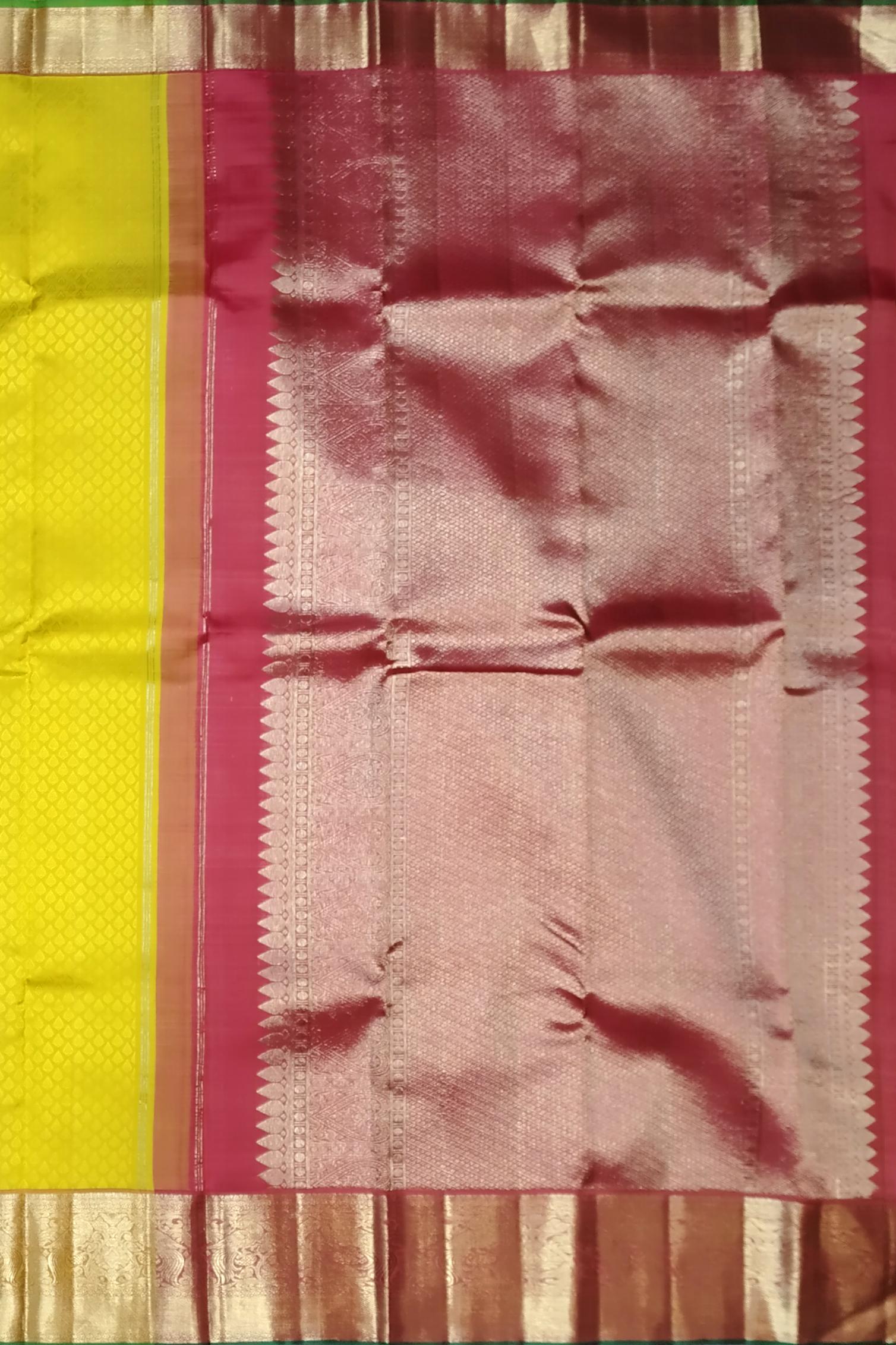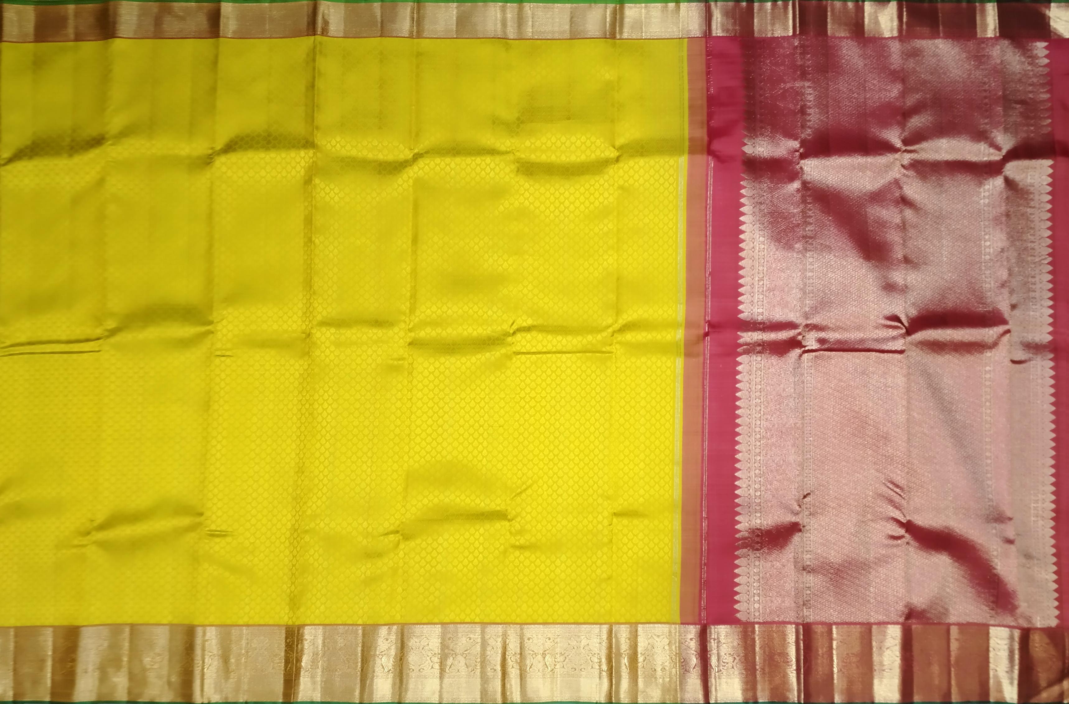 The jacquard motifs, reminiscent of temple art and natural droplets, carry meanings of fertility, life, and auspicious beginnings. The lemon yellow hue stands for positivity and celebration, while the contrasting red and green details highlight the mastery of traditional South Indian weaving. This saree reflects the soul of Kanchipuram—a town known for its luxurious silks, meticulous handlooms, and culturally rich motifs that have stood the test of time.