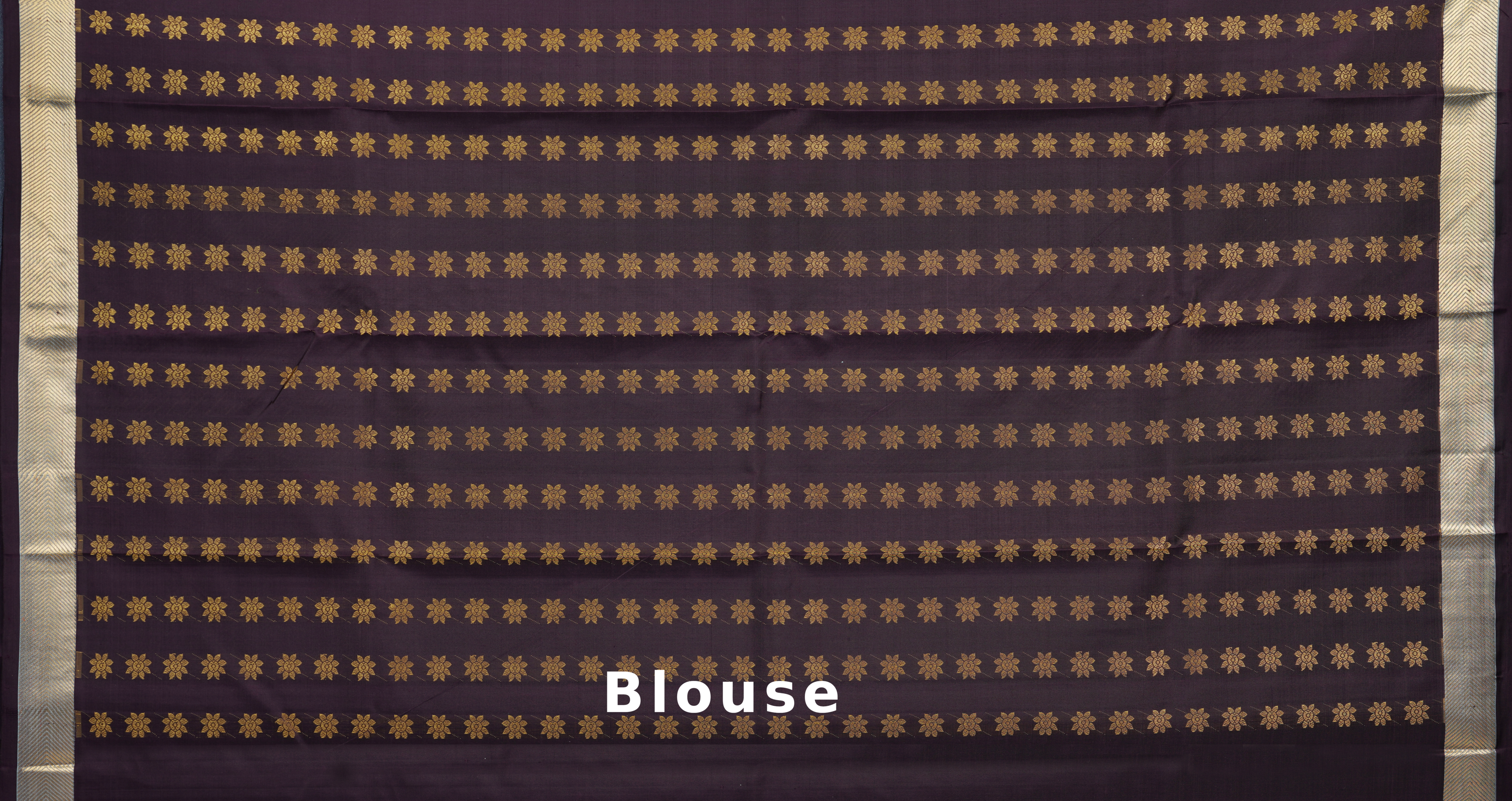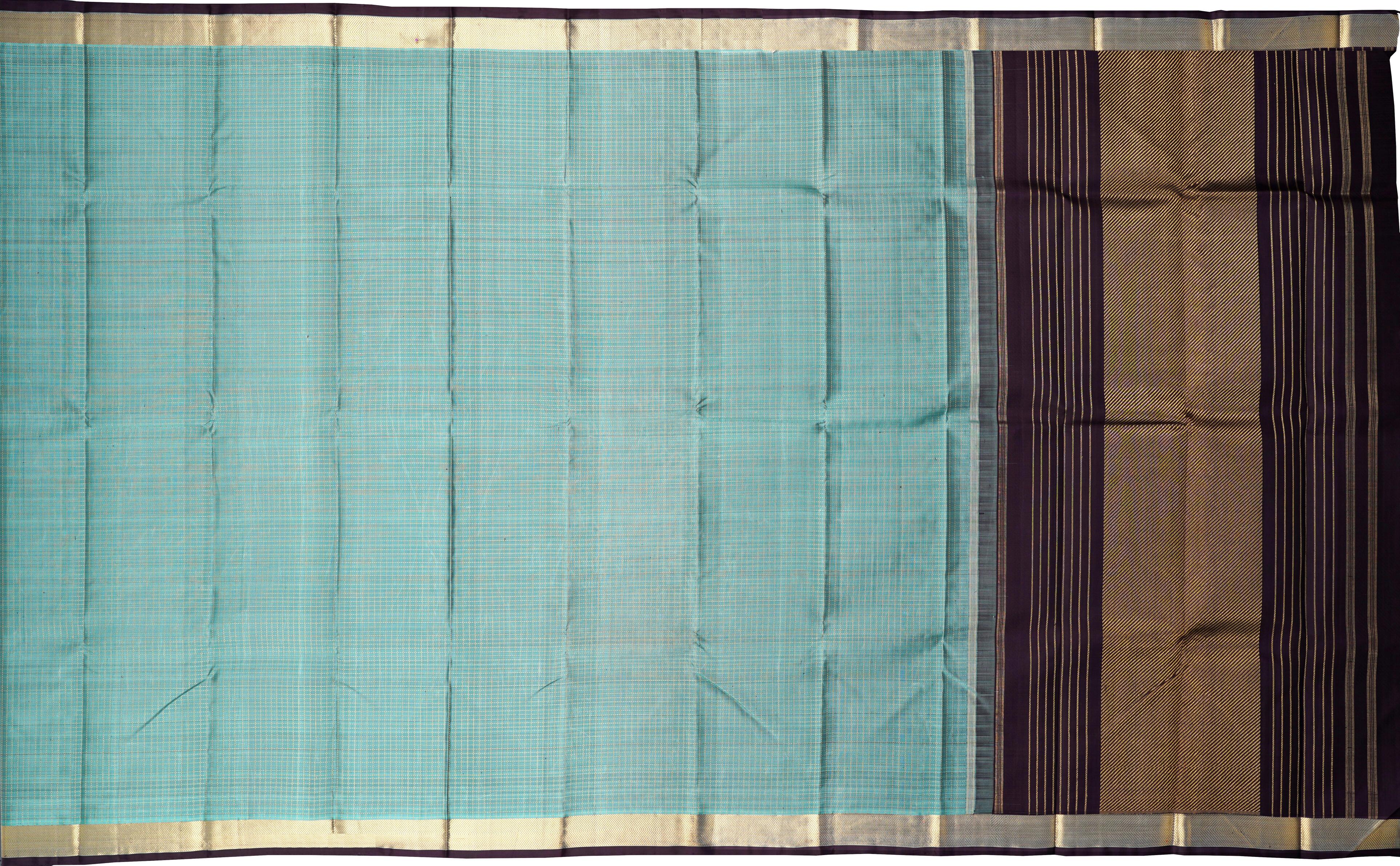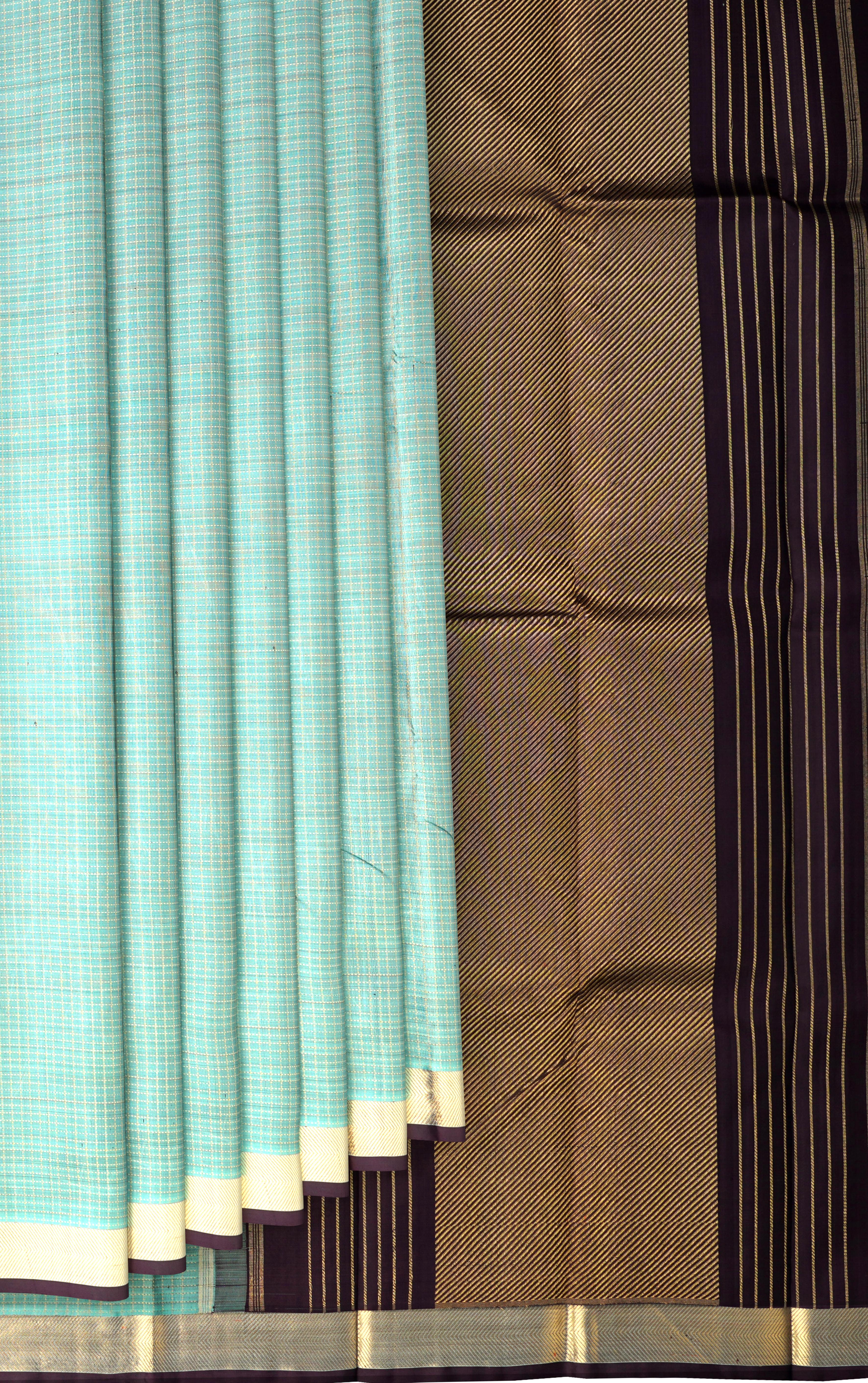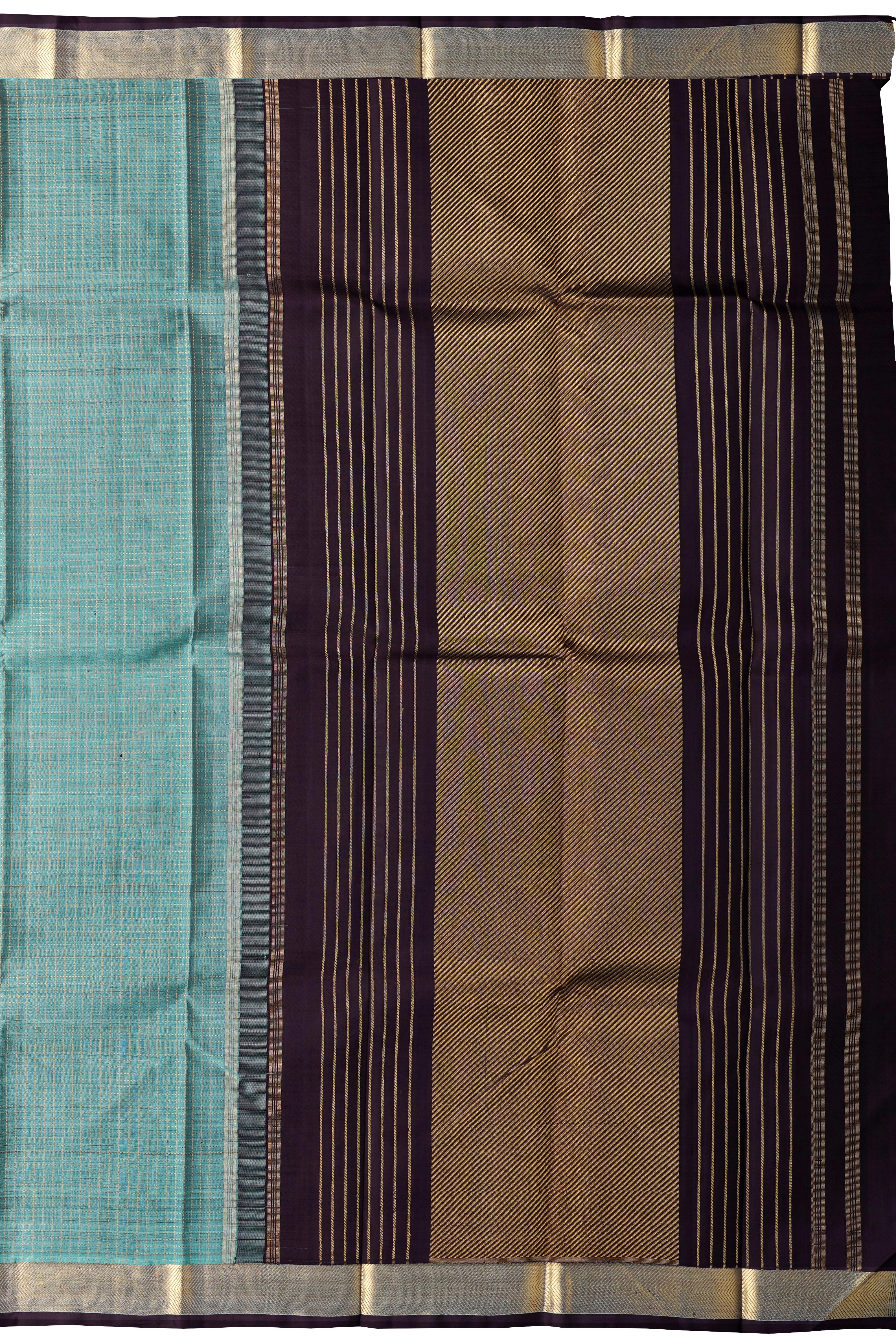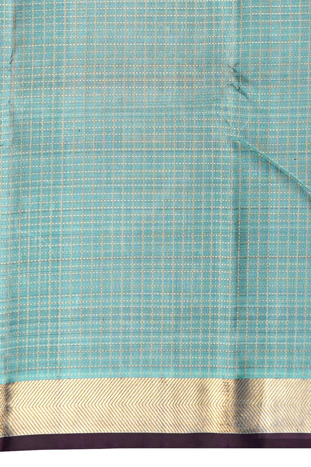 Experience the elegance of this stunning Light Blue and Brown Kanchipuram Pure Zari Saree. The checks pattern with a border, a hallmark of Kanchipuram Pure Zari, is a testament to the artisan's skill and dedication. The light blue and brown colors, symbolizing tranquility and earthiness, are perfectly complemented by the delicate checks design.