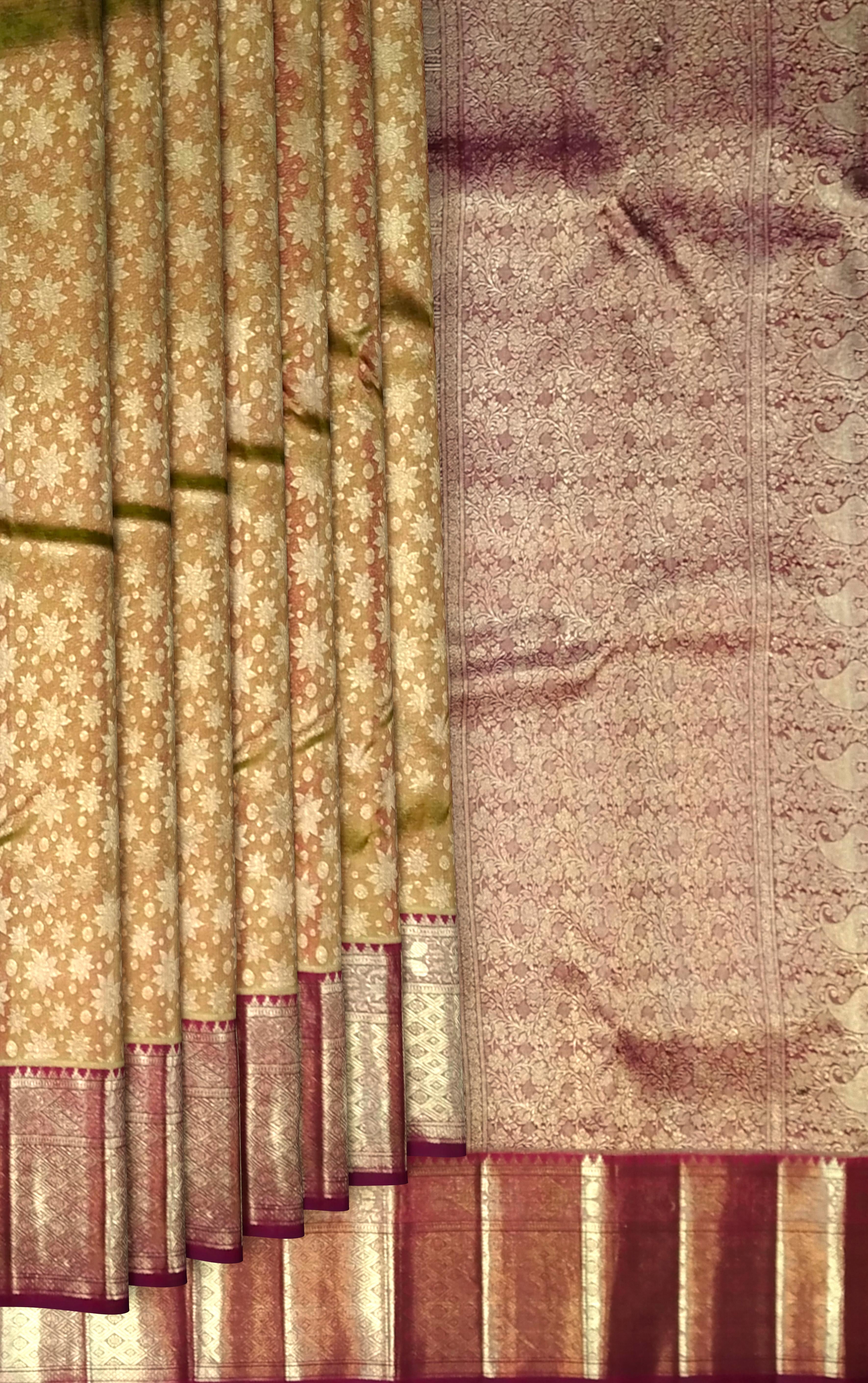 Drenched in earthy elegance, this light brown Kanchipuram silk saree is graced with a subtle sunflower jacquard weave, radiating natural charm and sophistication. The maroon border and pallu add a rich, grounding contrast, turning this saree into a graceful yet powerful statement piece. Its warmth and texture make it a beautiful expression of understated grandeur, with a matching maroon blouse completing the look.