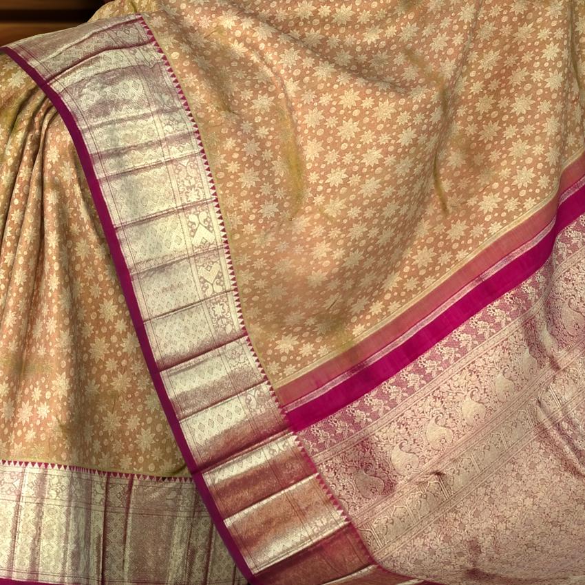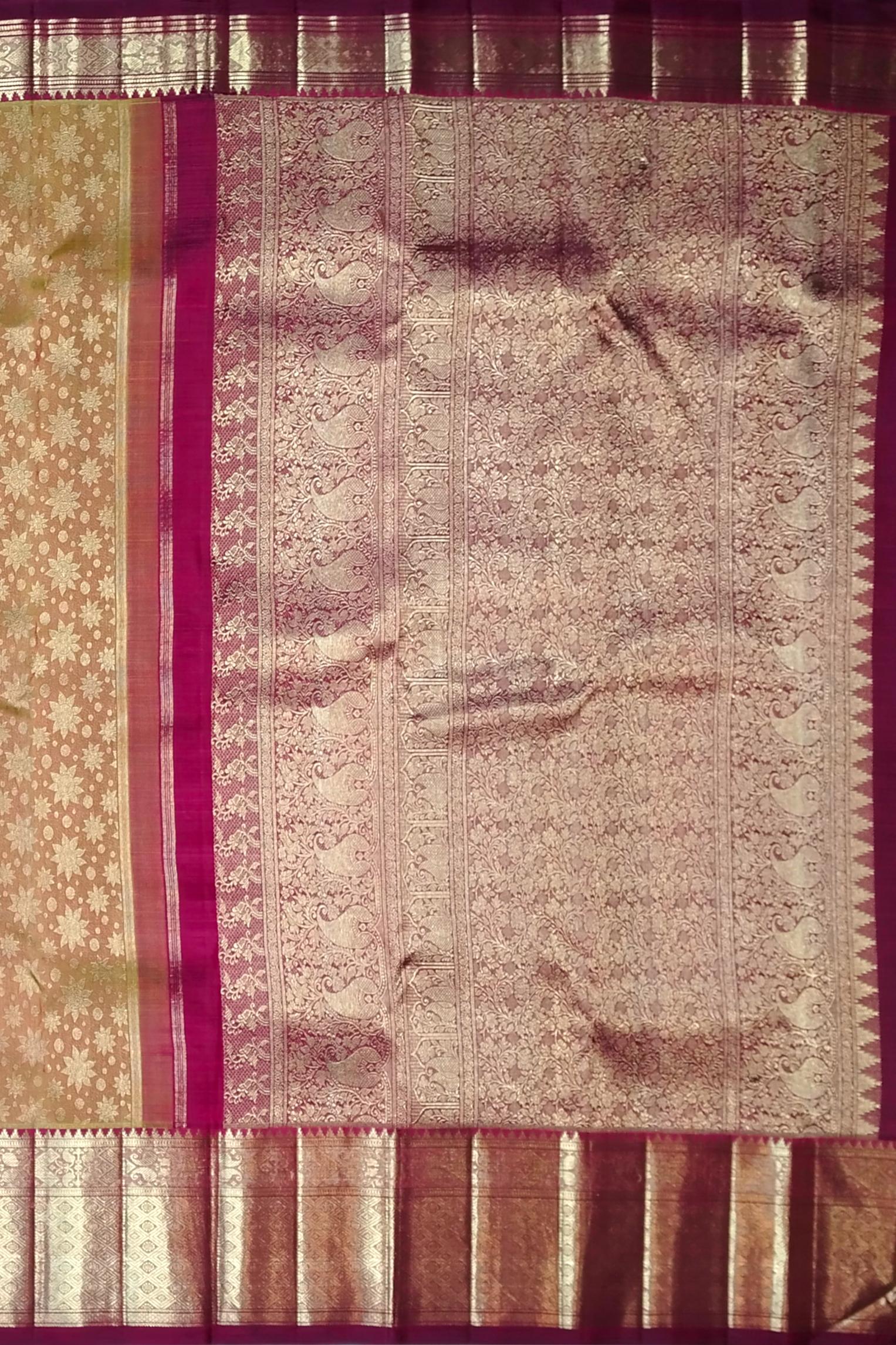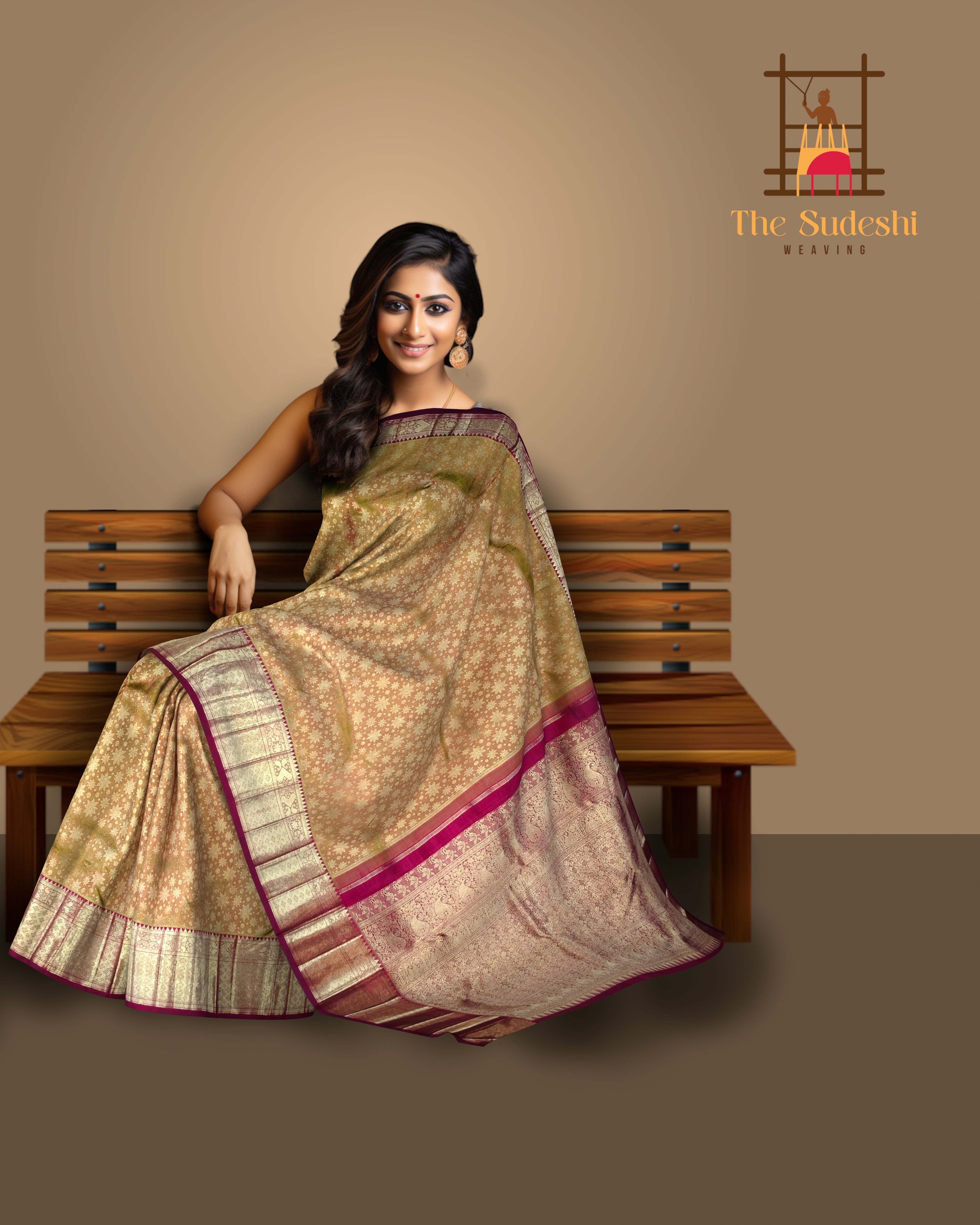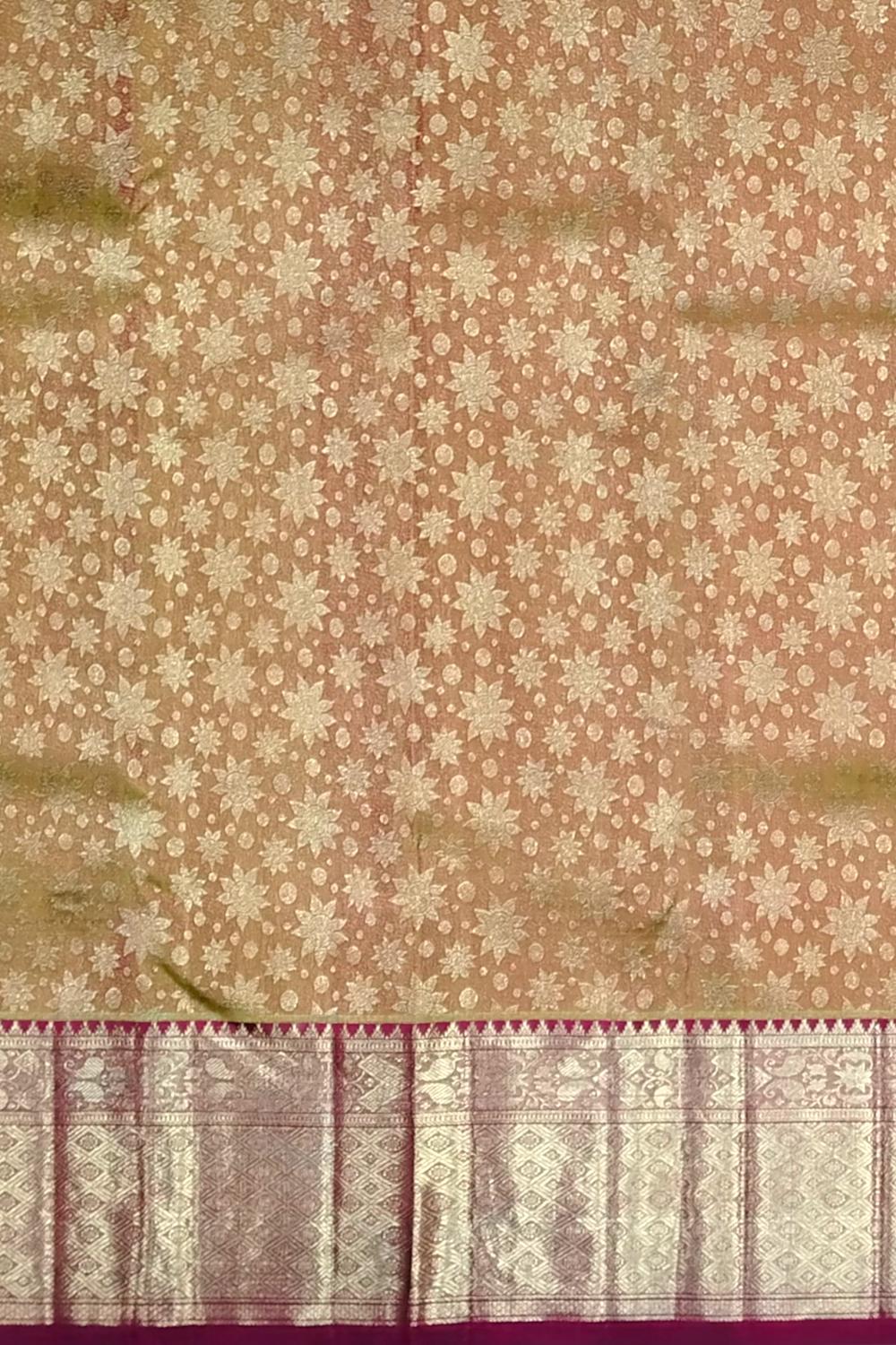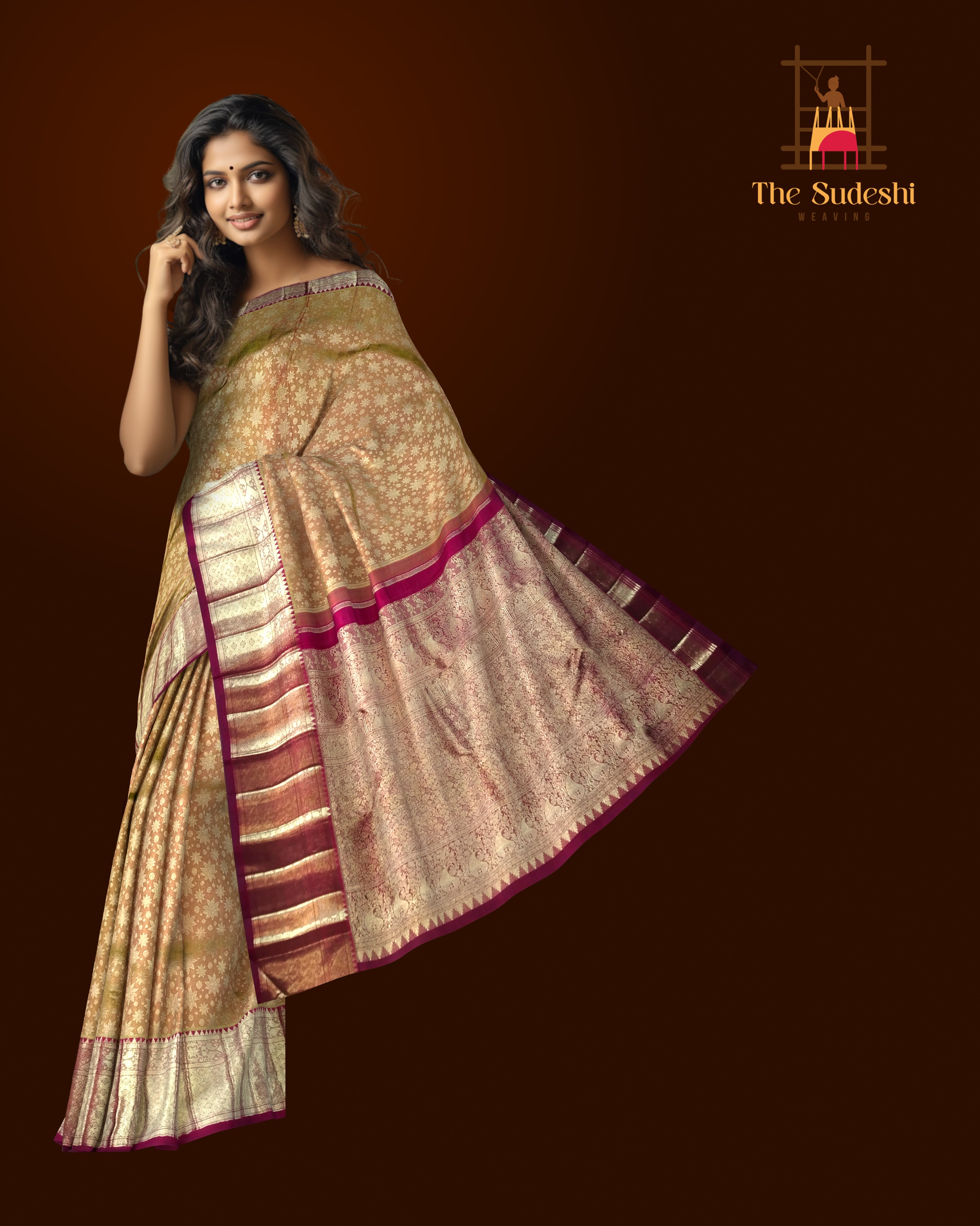 The sunflower motif, a symbol of positivity, loyalty, and strength, brings a sense of joy and brightness to this otherwise subtle tone. The maroon border, reminiscent of temple pillars and bridal finery, ties the floral narrative back to its roots in traditional South Indian design. As with all true Kanchipuram silks, the craftsmanship lies in the seamless blend of design, color, and symbolic storytelling.