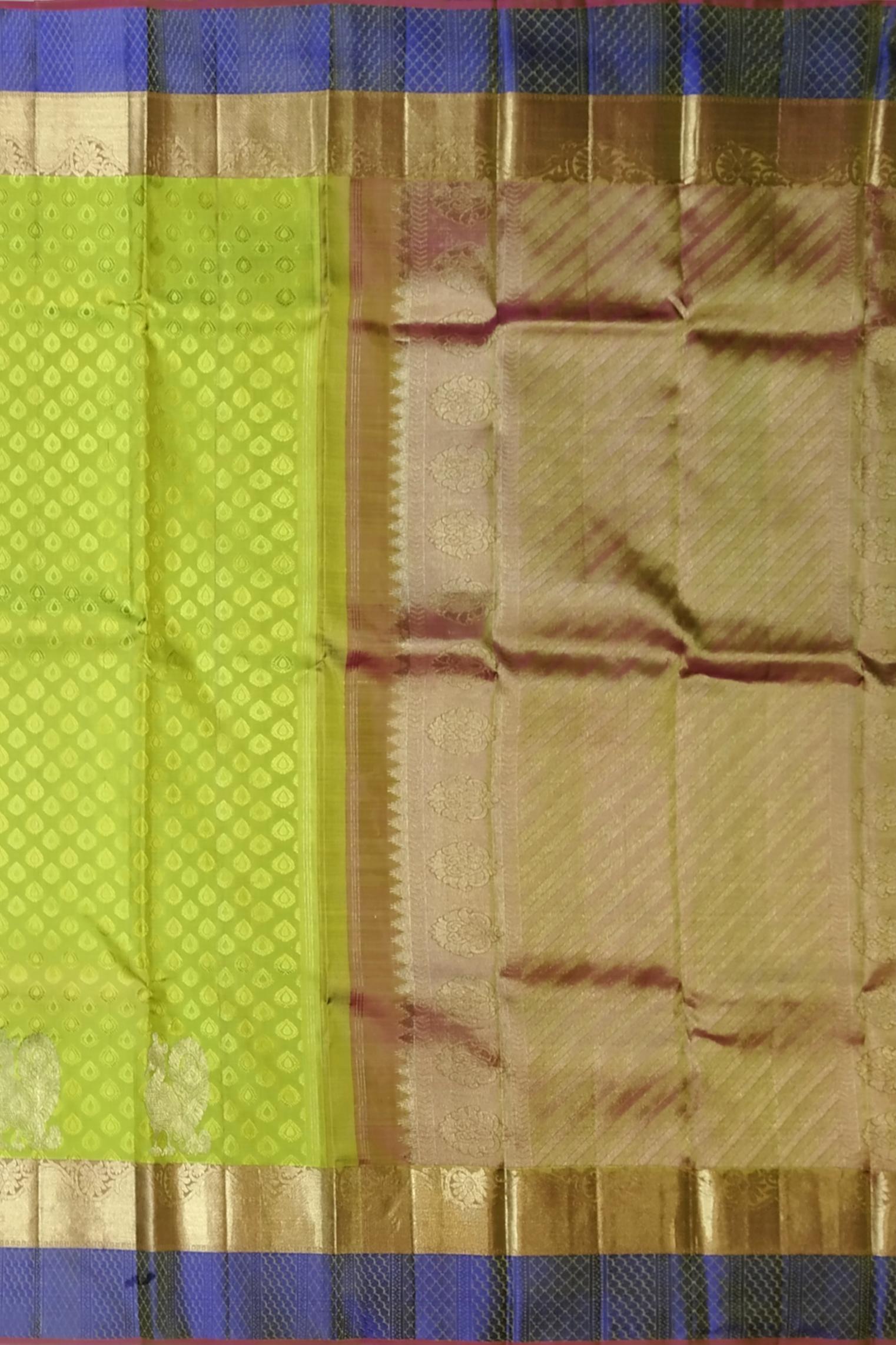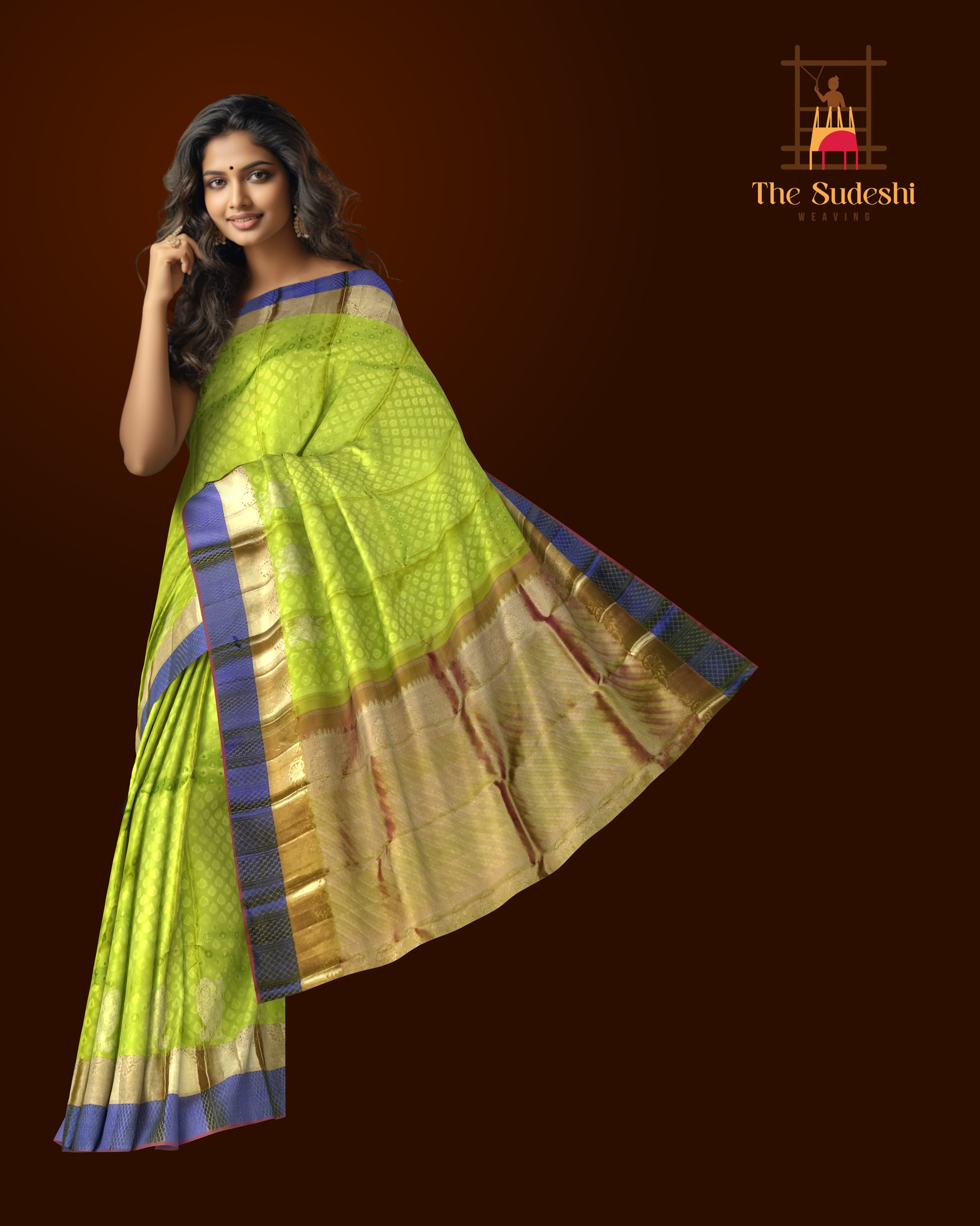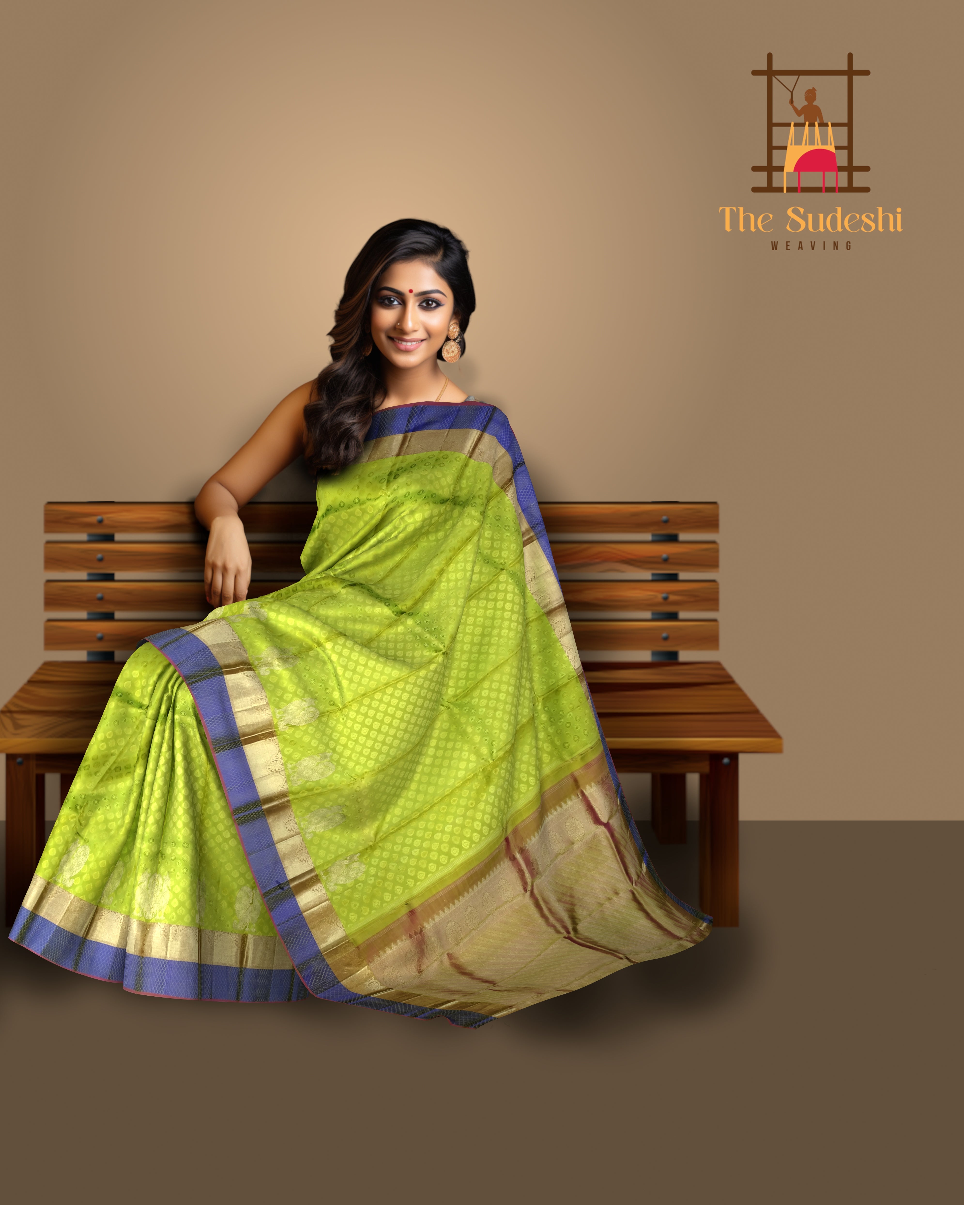The combination of jacquard weaving and traditional border motifs reflects the soulful artistry of Kanchipuram’s master weavers. Light green is a color of serenity, freshness, and new beginnings, while blue adds a touch of depth and wisdom—making this saree not just a garment, but a story in silk. The motif work on the border symbolizes the cultural richness passed down through generations.