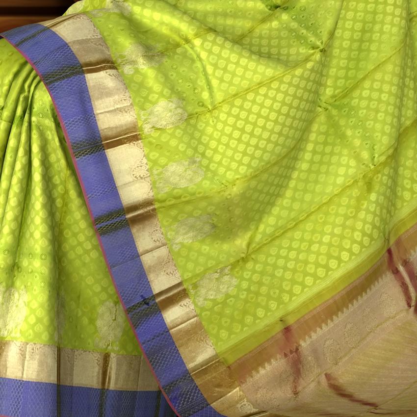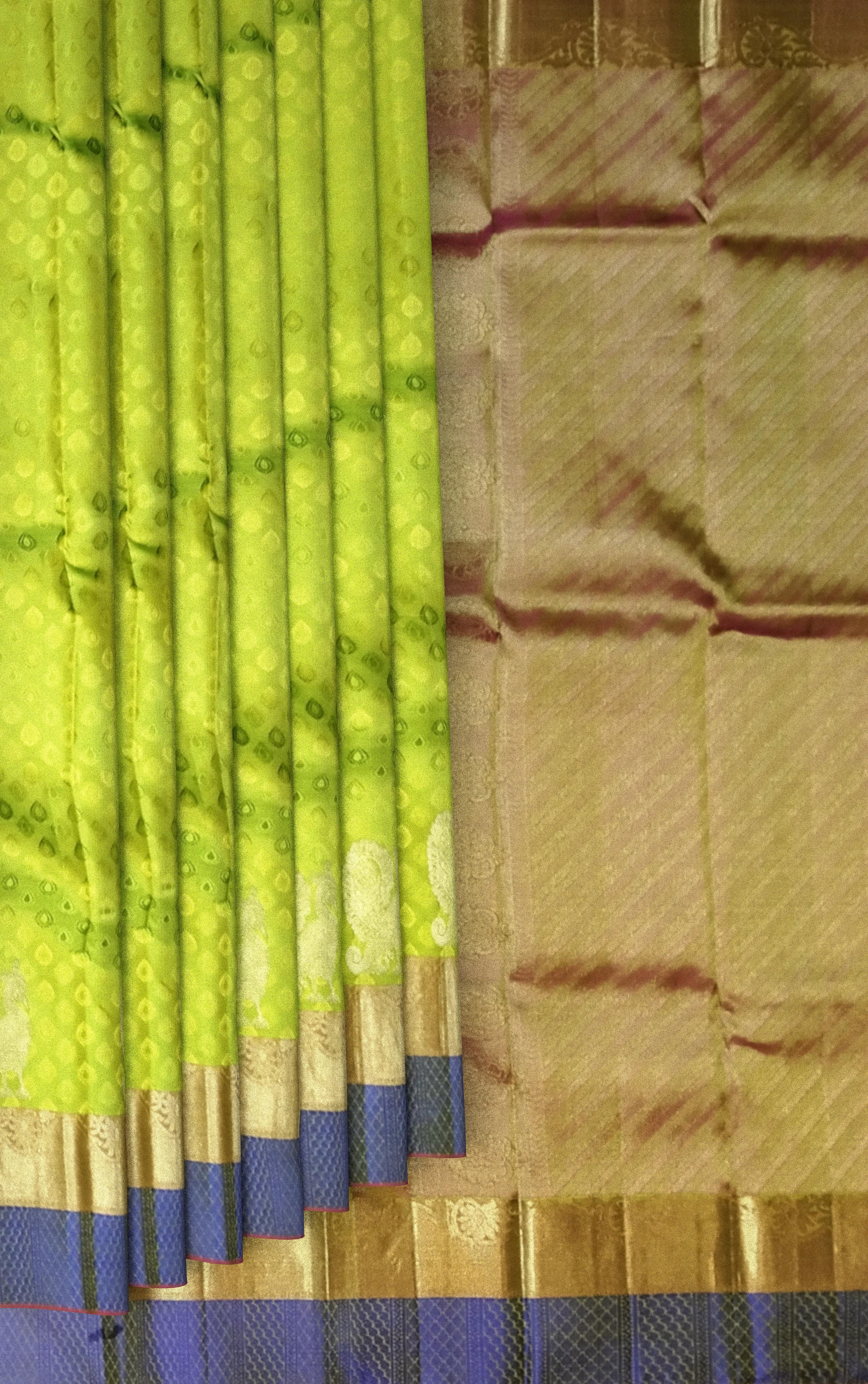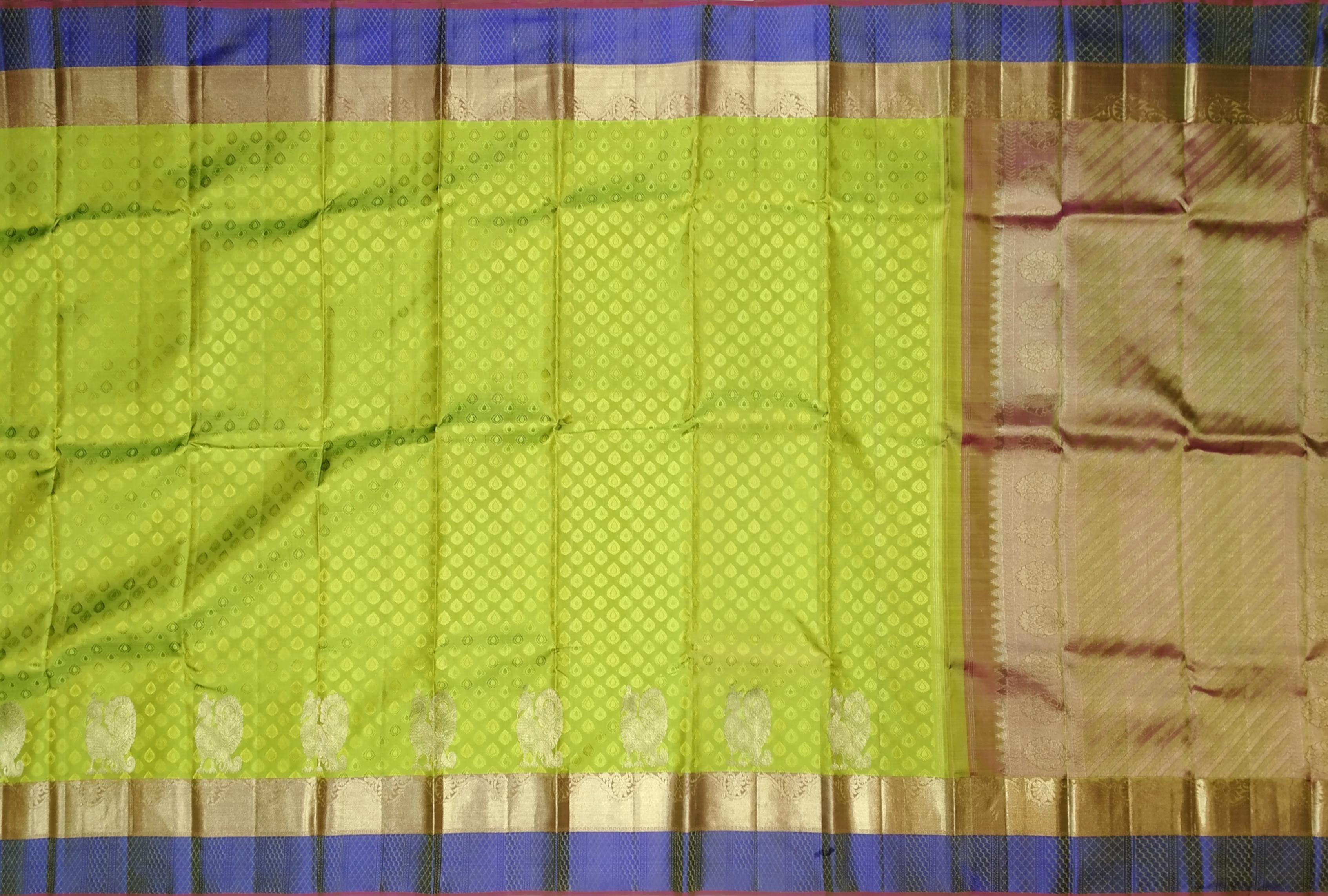 The combination of jacquard weaving and traditional border motifs reflects the soulful artistry of Kanchipuram’s master weavers. Light green is a color of serenity, freshness, and new beginnings, while blue adds a touch of depth and wisdom—making this saree not just a garment, but a story in silk. The motif work on the border symbolizes the cultural richness passed down through generations.