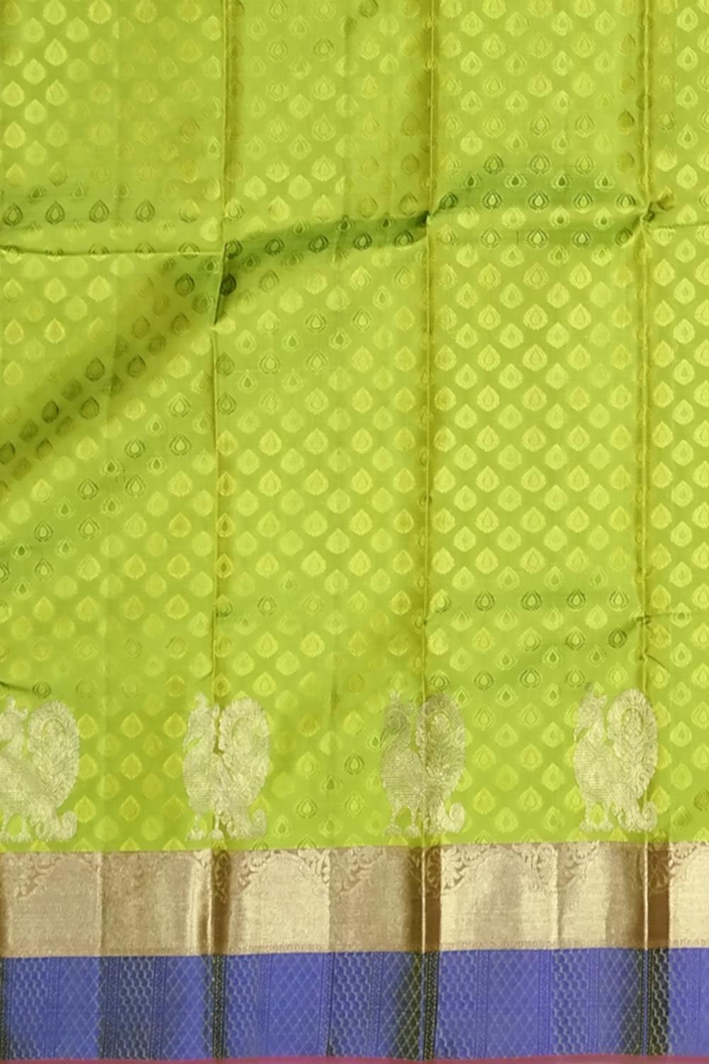 A gentle expression of elegance, this light green Kanchipuram silk saree showcases a delicately woven jacquard pattern that lends it both texture and sheen. The highlight of the saree lies in its rich blue motif border, which brings in a contrasting vibrance and beautifully frames the saree’s soft body. Completed with a matching blue blouse, this ensemble radiates a quiet charm that’s perfect for the modern traditionalist.
