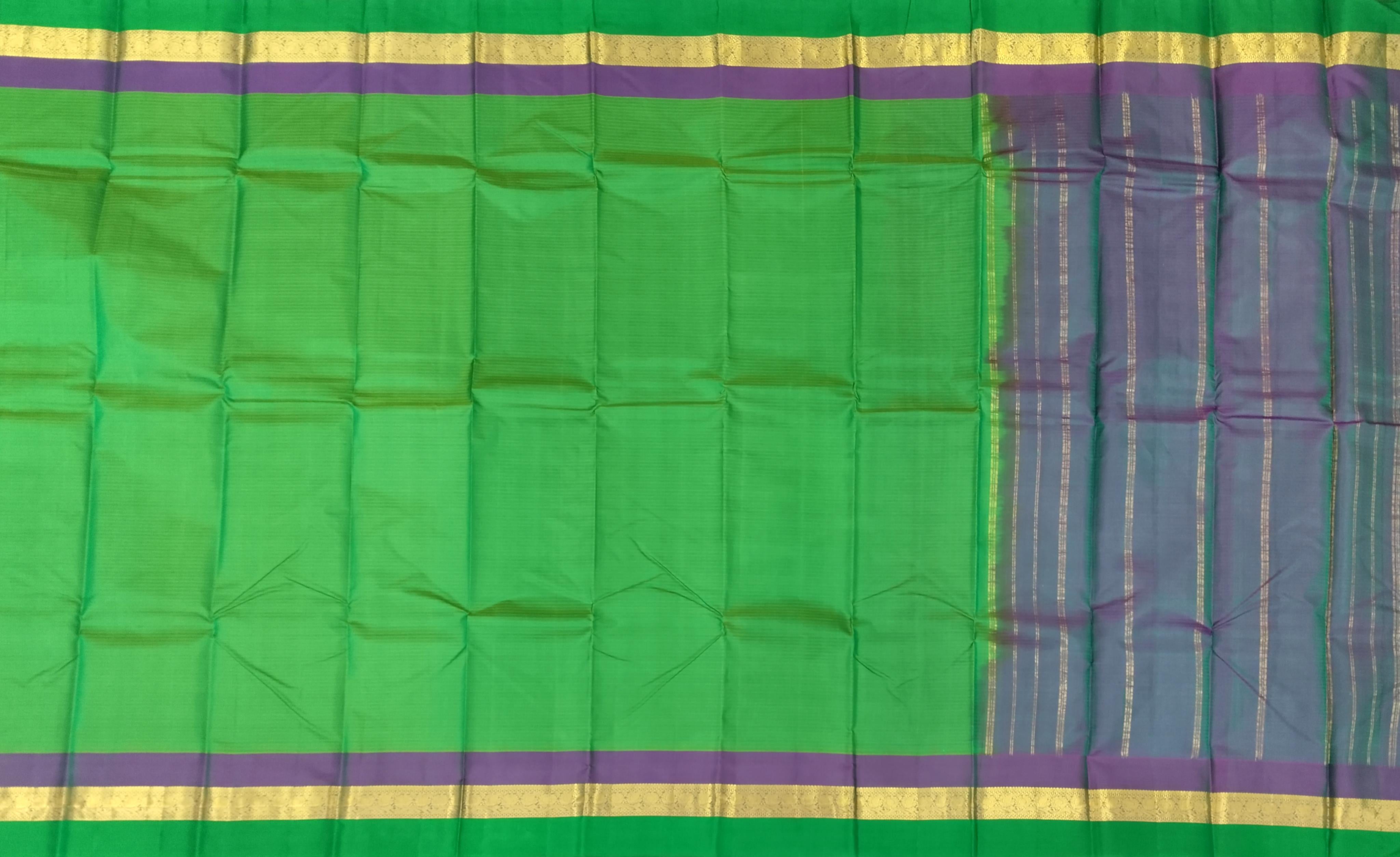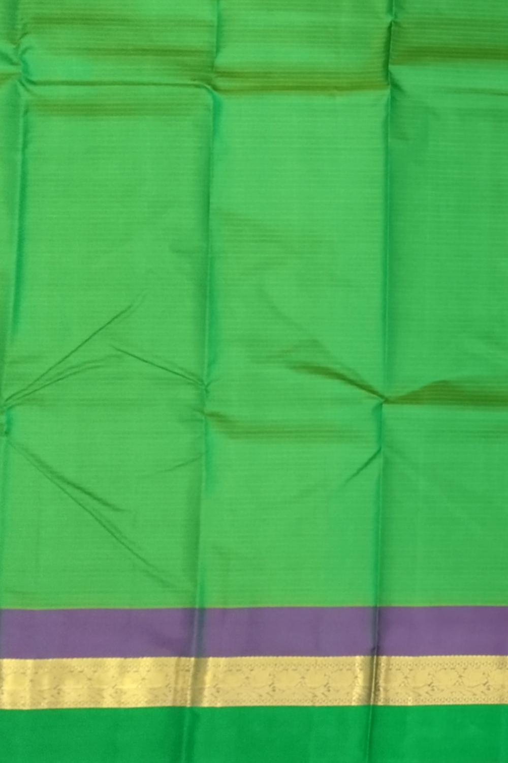 Delicate and refreshing, this Light Green Kanchipuram Silk Saree is adorned with a lilac and green border and pallu, creating a soothing pastel harmony. The plain silk body allows the soft hues to shine through, reflecting subtle grace and charm. This elegant color combination makes it a perfect choice for daytime functions or festive celebrations. Every Kanchipuram pure silk saree is a masterpiece woven with care and precision. Crafted using fine mulberry silk threads, these sarees are known for their durability, sheen, and traditional artistry that traces back to the weavers of Kanchipuram. Pair this saree with a lilac or contrasting silver blouse for a refined finish. Complement the look with delicate jewellery, pastel accessories, and a graceful bun for a sophisticated festive appearance. Note: The appearance of the product’s colors may vary due to lighting conditions or your device’s screen calibration. For further assistance or additional images/videos, feel free to contact us at +91 97897 60367 or email at wecare@thesudeshiweaving.com.