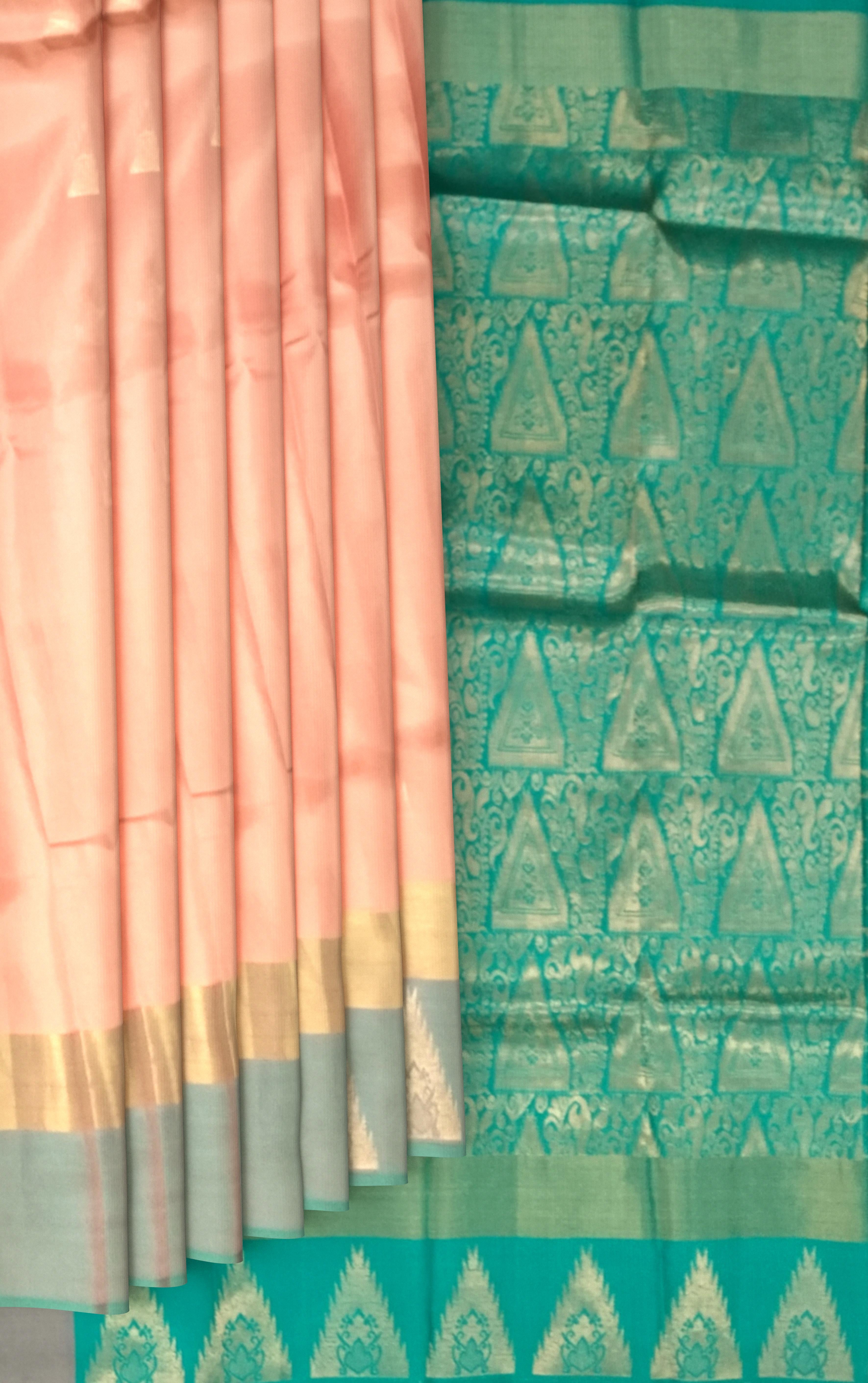 Emanating warmth and elegance, this Light Peach Kanchipuram Silk Saree with Butta motifs is a picture of timeless sophistication. The Sea Green border and pallu lend a refreshing contrast that enhances its gentle allure. Each butta, intricately woven with zari threads, adds subtle sparkle and dimension, creating a look that’s both graceful and festive. Kanchipuram Pure Silk Sarees are renowned for their divine craftsmanship and durability. Woven using fine mulberry silk and real zari, they embody centuries of heritage from the temple town of Kanchipuram. Each motif carries spiritual symbolism — representing blessings, prosperity, and eternal beauty — making these sarees not just attire, but heirlooms. Perfect for family gatherings, festive mornings, or traditional ceremonies, this saree pairs beautifully with a sea-green blouse and antique gold jewelry. Add pearl bangles and soft curls for a delicate, feminine finish. Note: The appearance of the product’s colors may vary due to lighting conditions or your device’s screen calibration. For further assistance or additional images/videos, feel free to contact us at +91 97897 60367 or email at wecare@thesudeshiweaving.com.
