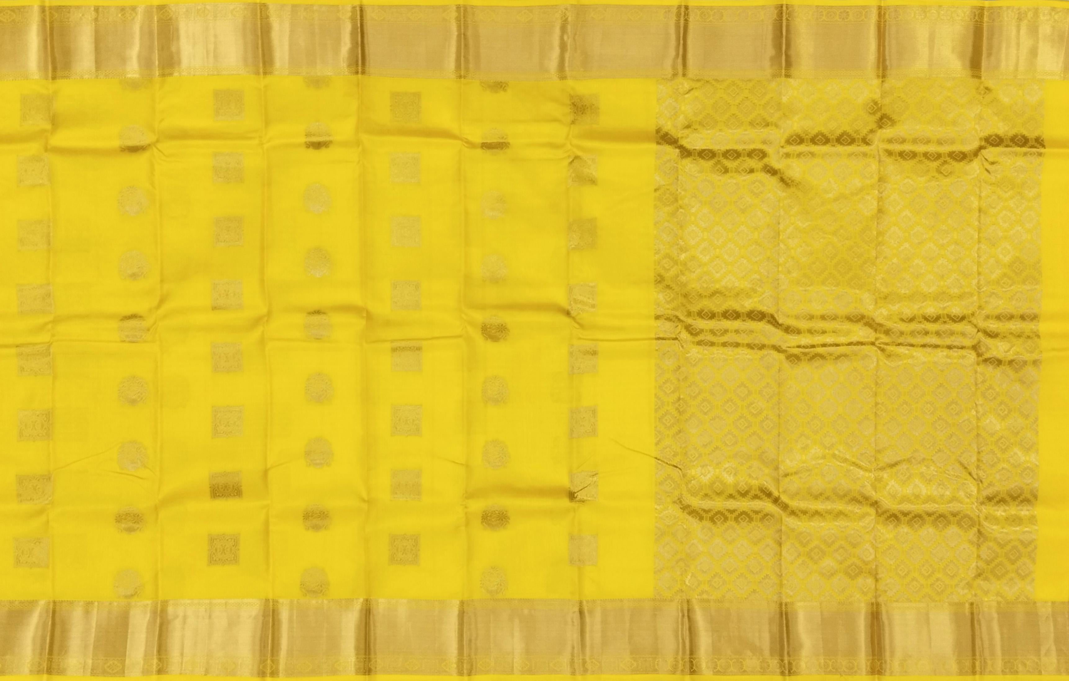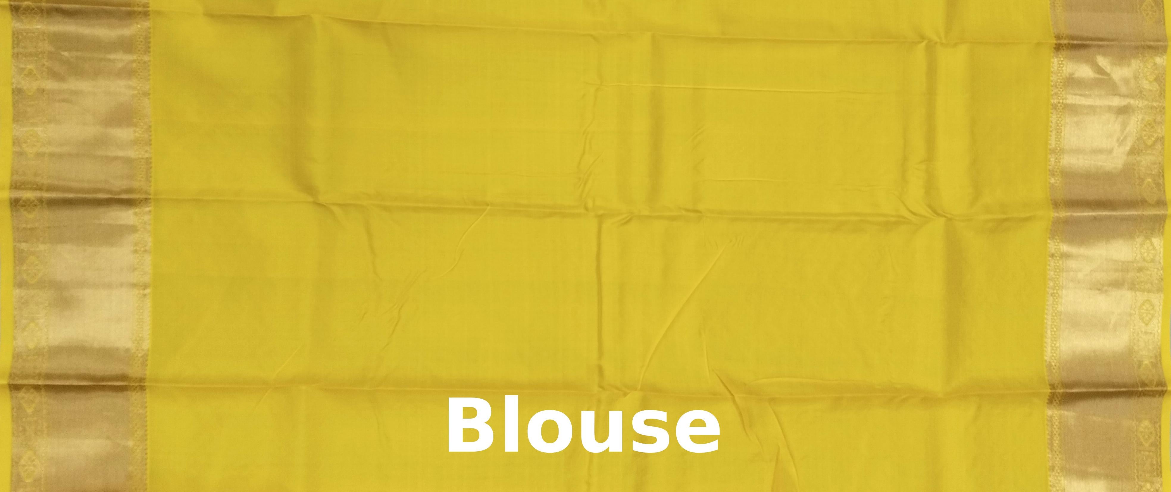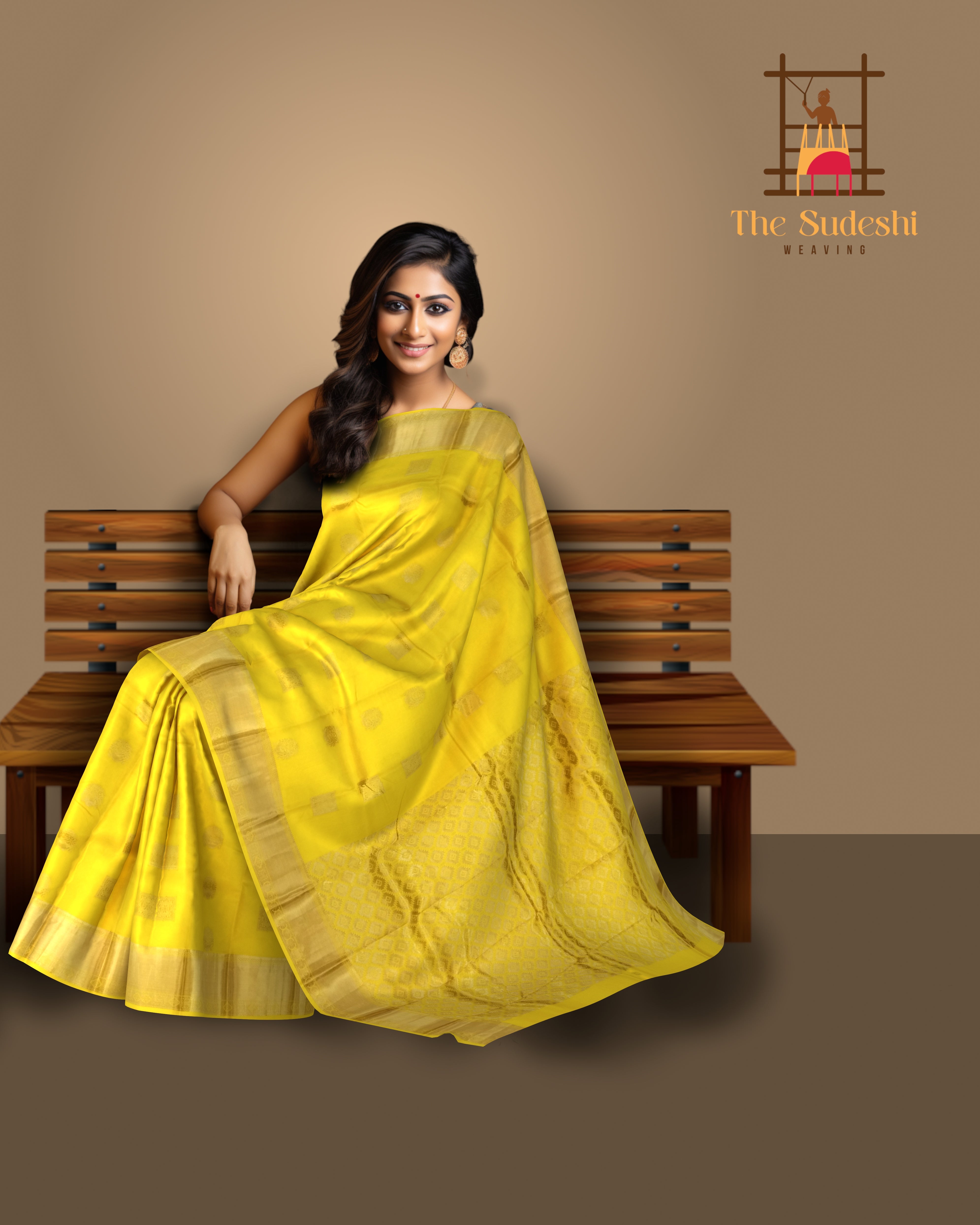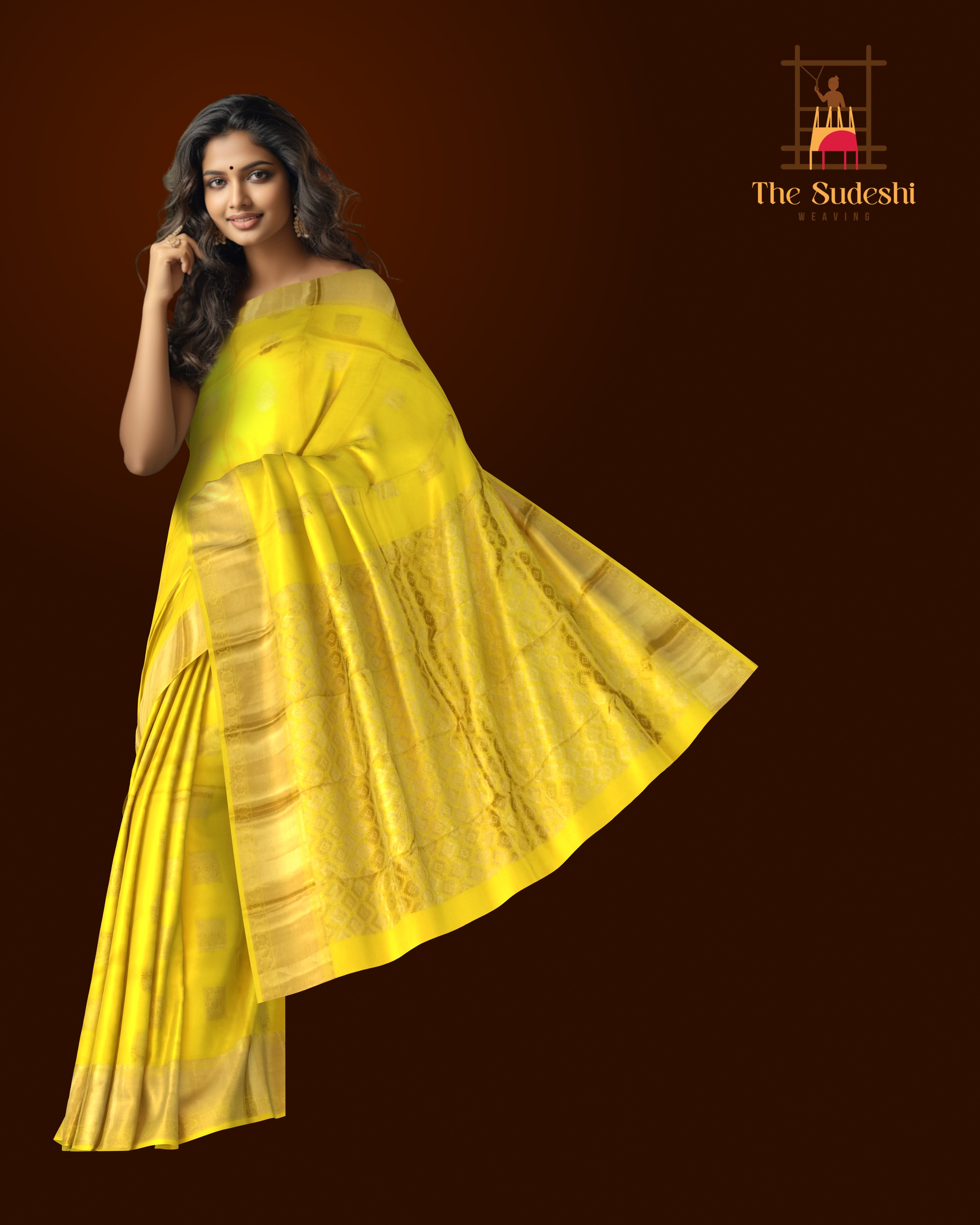 In the legacy of Kanchipuram silk weaving, yellow is often associated with joy, wisdom, and auspicious beginnings. The motifs woven across the saree carry deep symbolic value—often signifying nature, blessings, or divine protection. Every thread in this handwoven piece reflects the mastery of artisans who've preserved the purity of this craft over centuries.