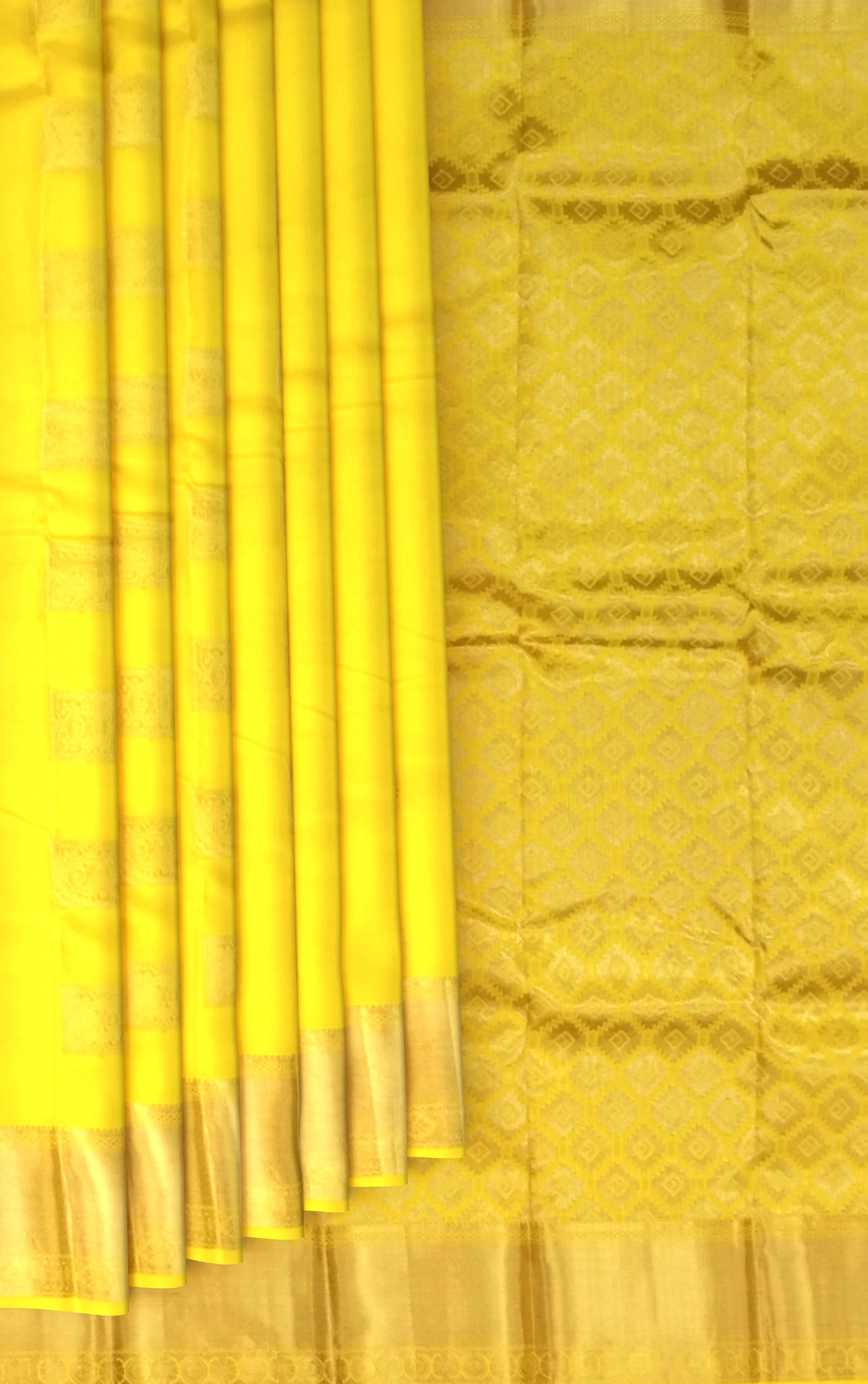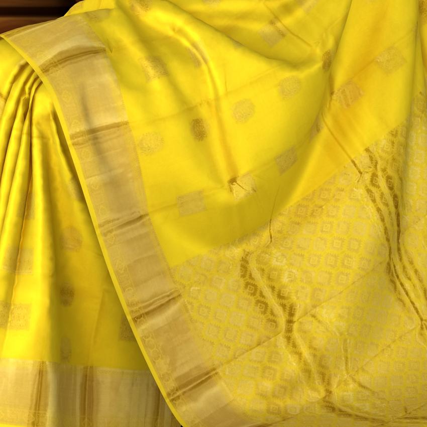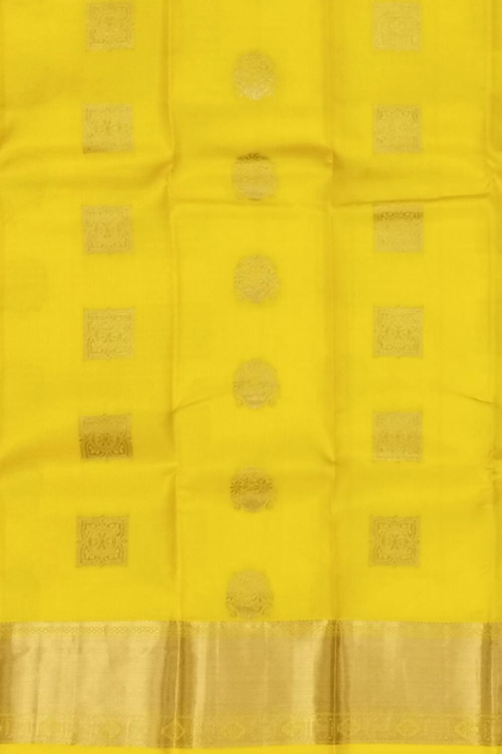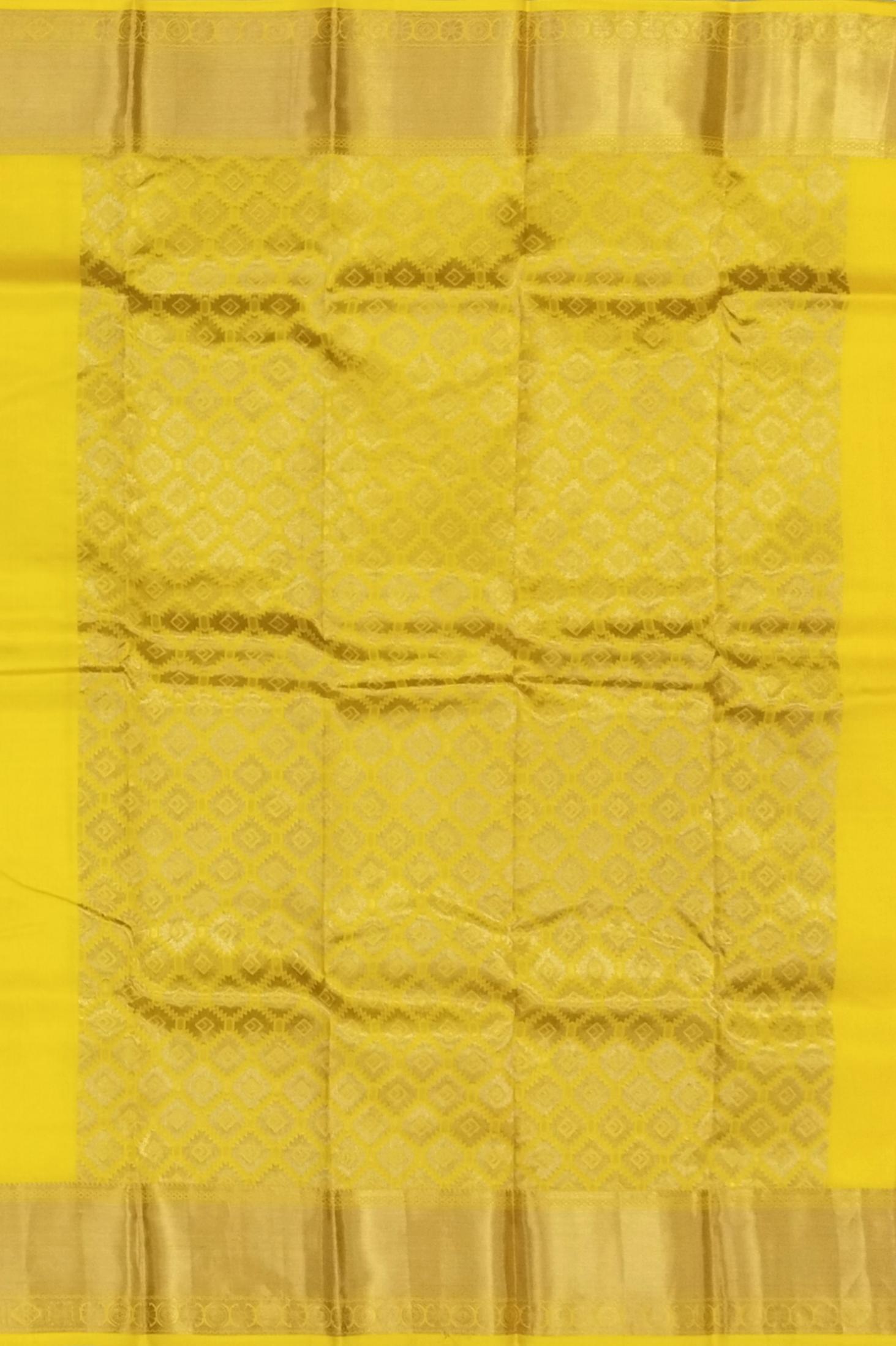 In the legacy of Kanchipuram silk weaving, yellow is often associated with joy, wisdom, and auspicious beginnings. The motifs woven across the saree carry deep symbolic value—often signifying nature, blessings, or divine protection. Every thread in this handwoven piece reflects the mastery of artisans who've preserved the purity of this craft over centuries.