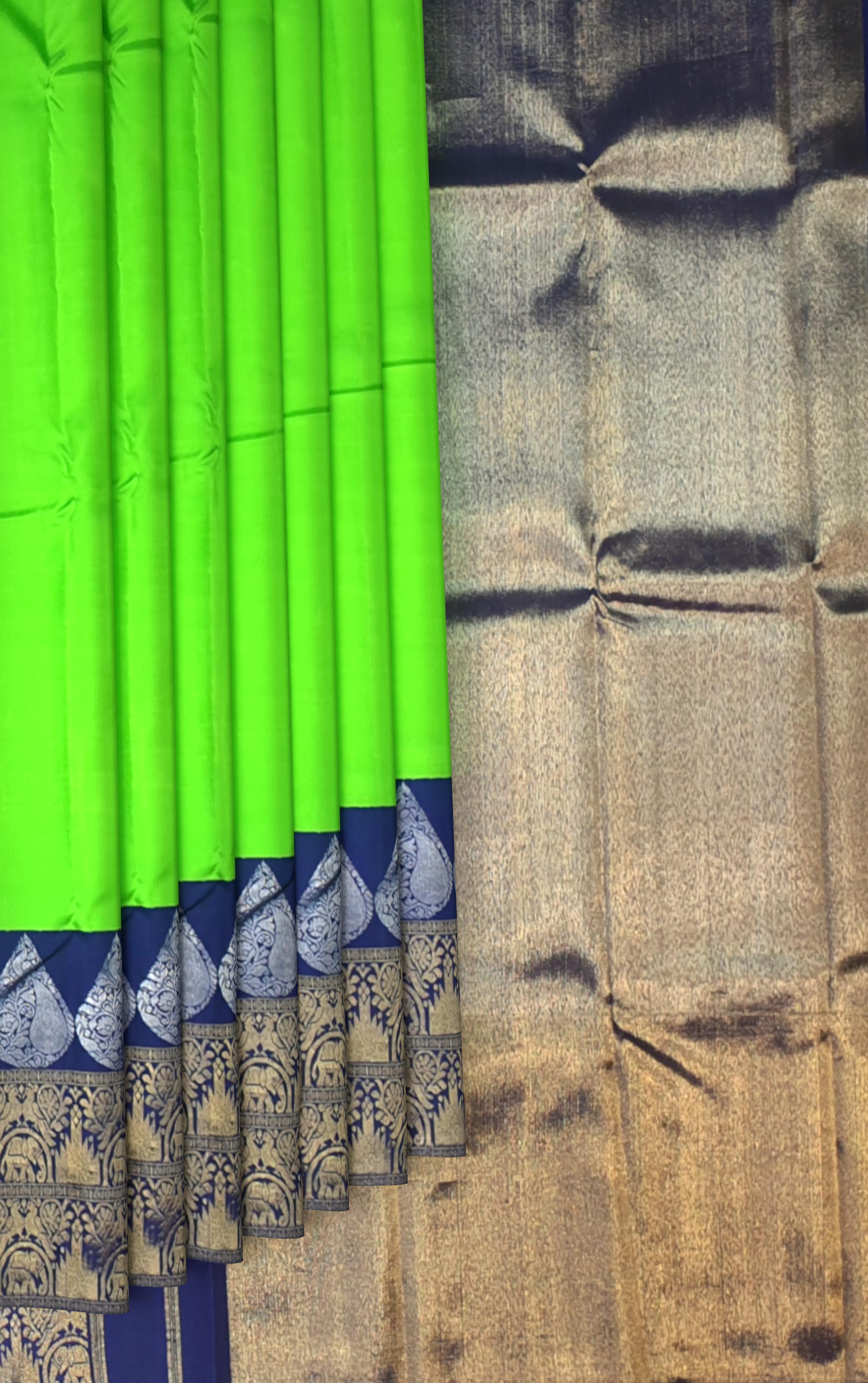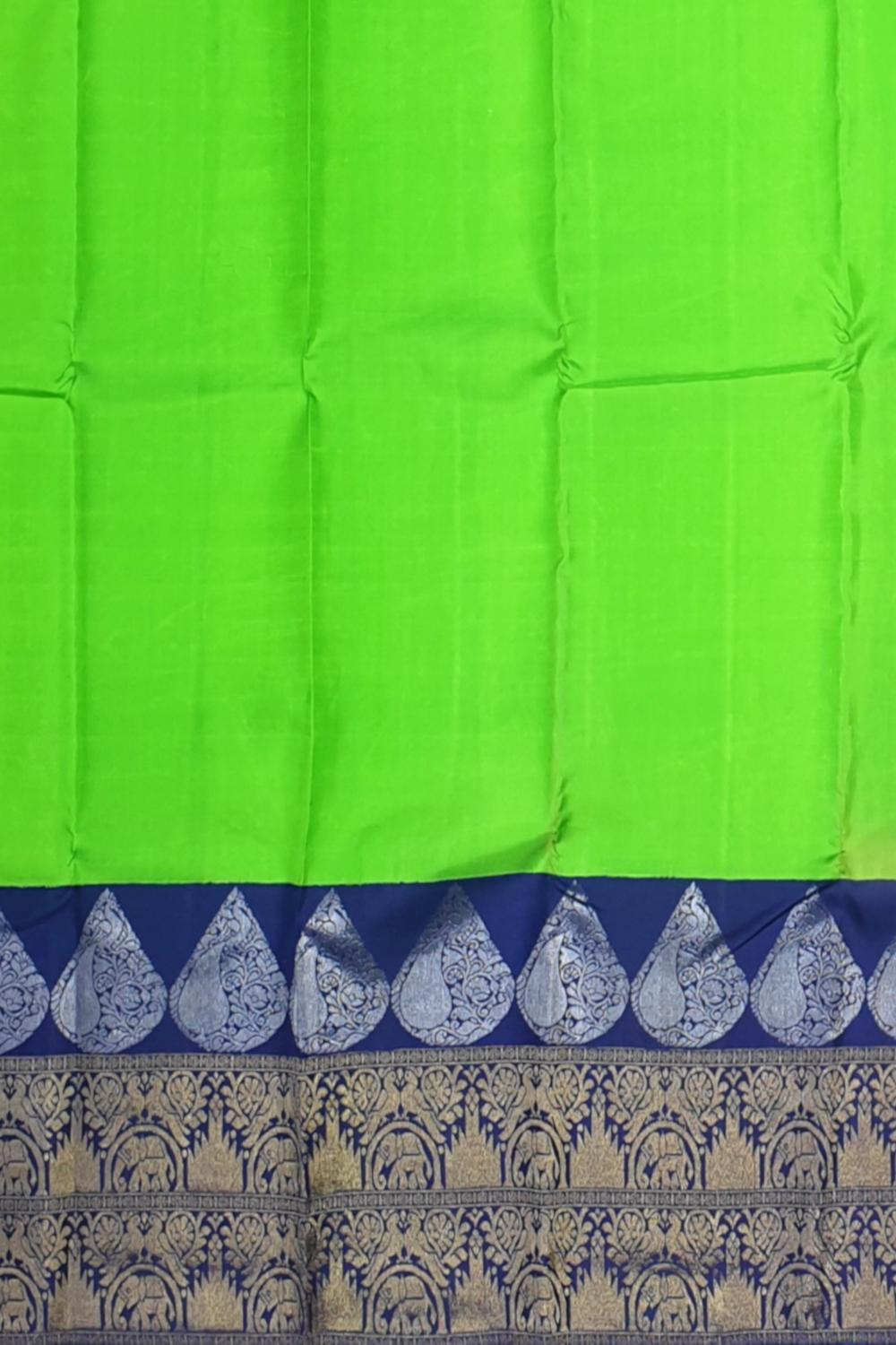 Simple yet stunning, this lime green Kanchipuram silk saree brings a refreshing burst of color to your traditional wardrobe. The plain body lets the richness of the silk shine through, while the striking dark blue border and matching pallu add depth and contrast. It’s a beautiful interplay between bold and subtle, tradition and minimalism—perfect for those who love refined elegance with a touch of vibrancy.