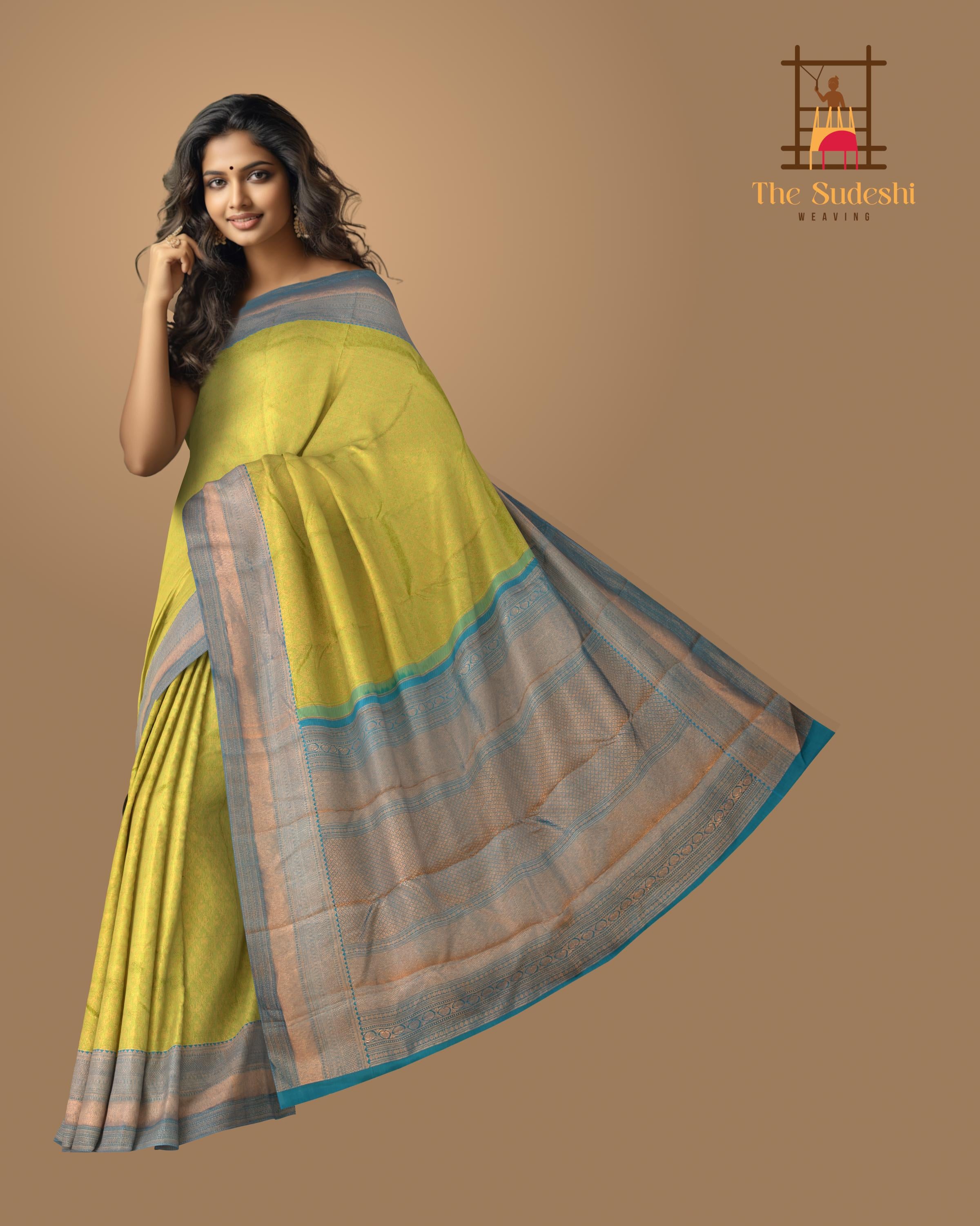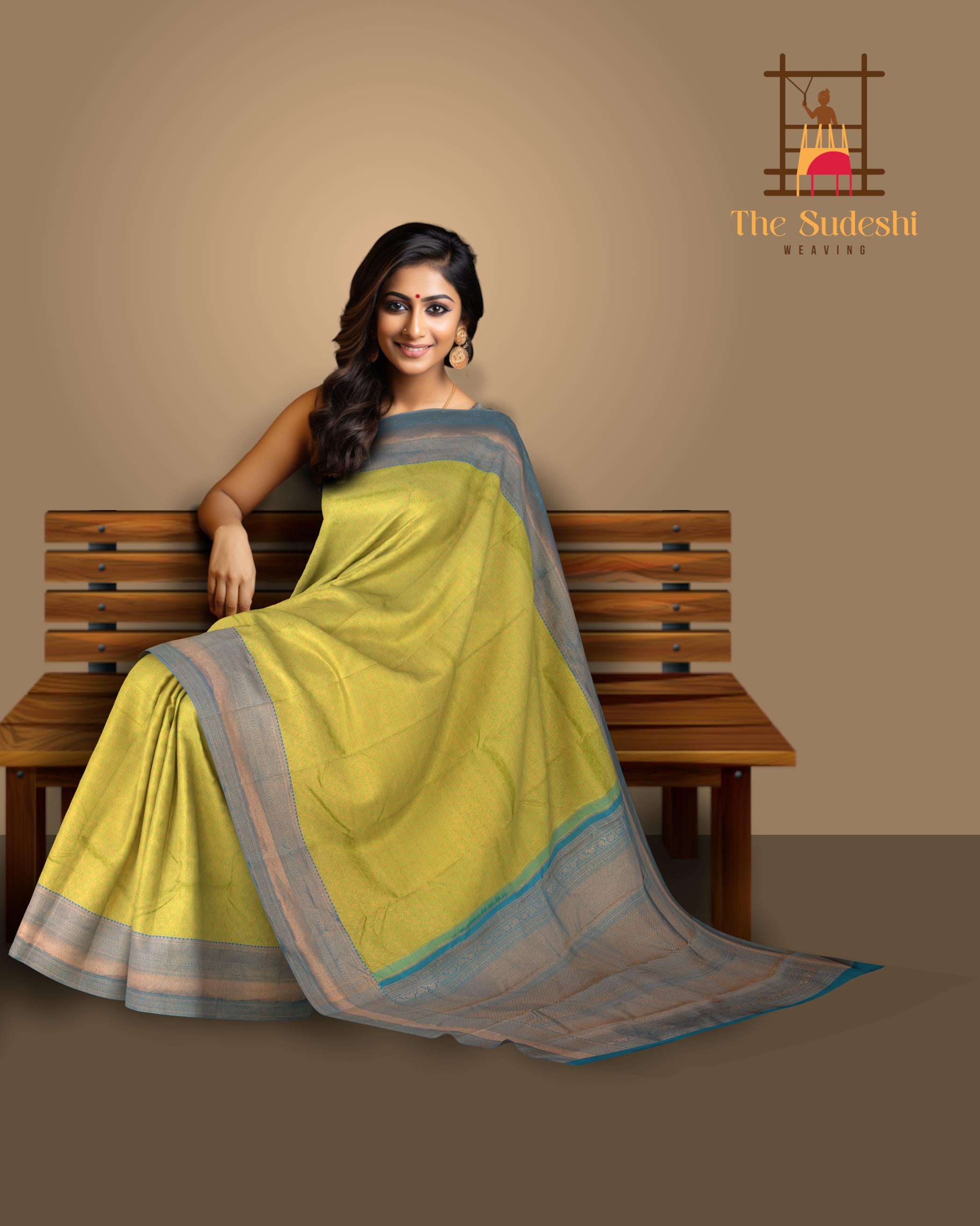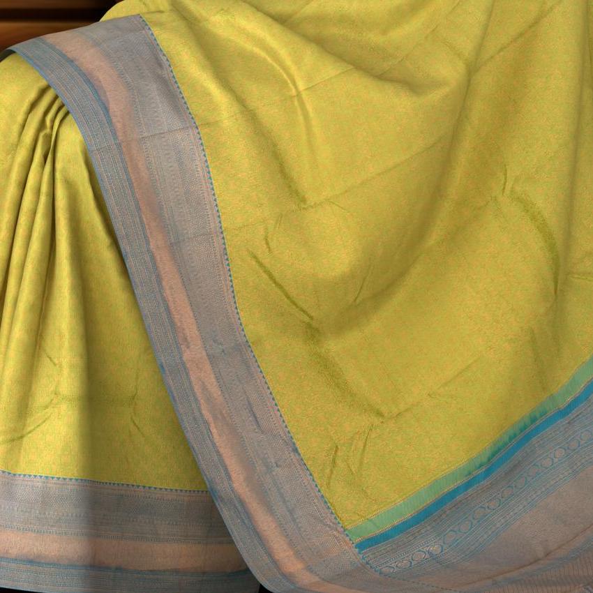 Drape yourself in the luminance of lime green with this Kanchipuram silk saree, intricately adorned with gold zari work. The contrast blue border, intricately woven with varisapet, complements the lime green body, invoking images of lush orchards and clear skies. The grand blue pallu, with its benaraset and basket weave design, adds an extra layer of elegance and tradition to this exquisite piece.