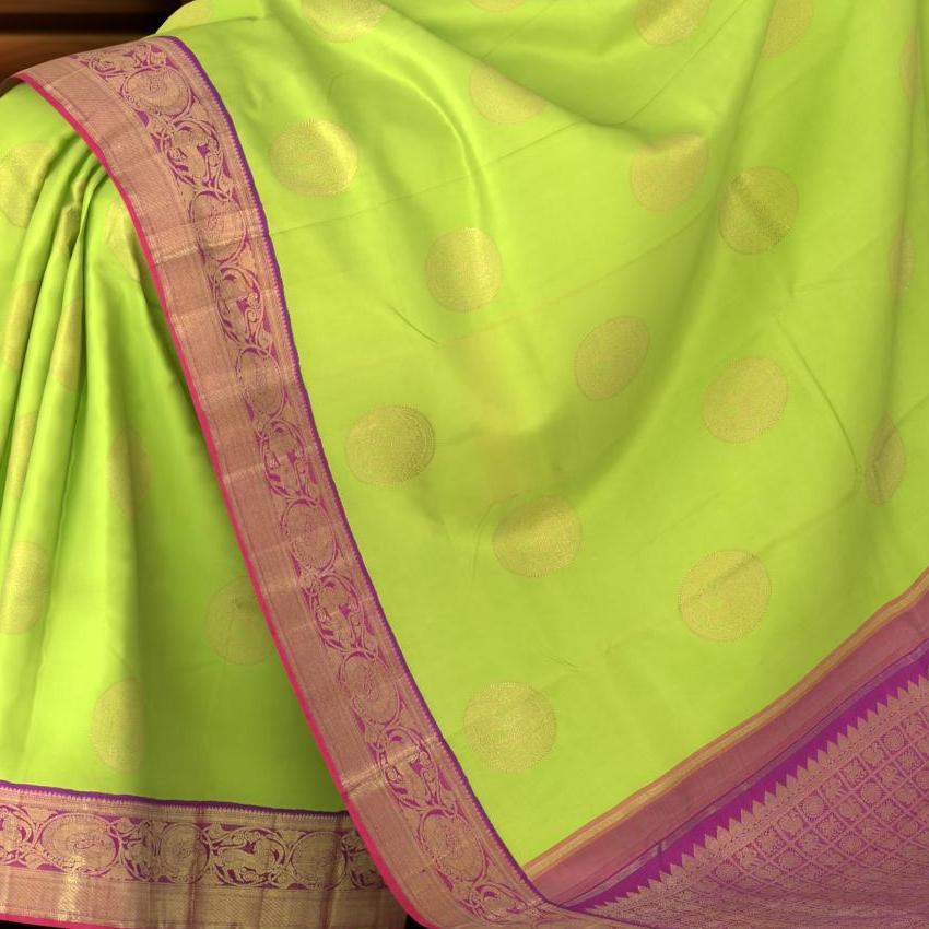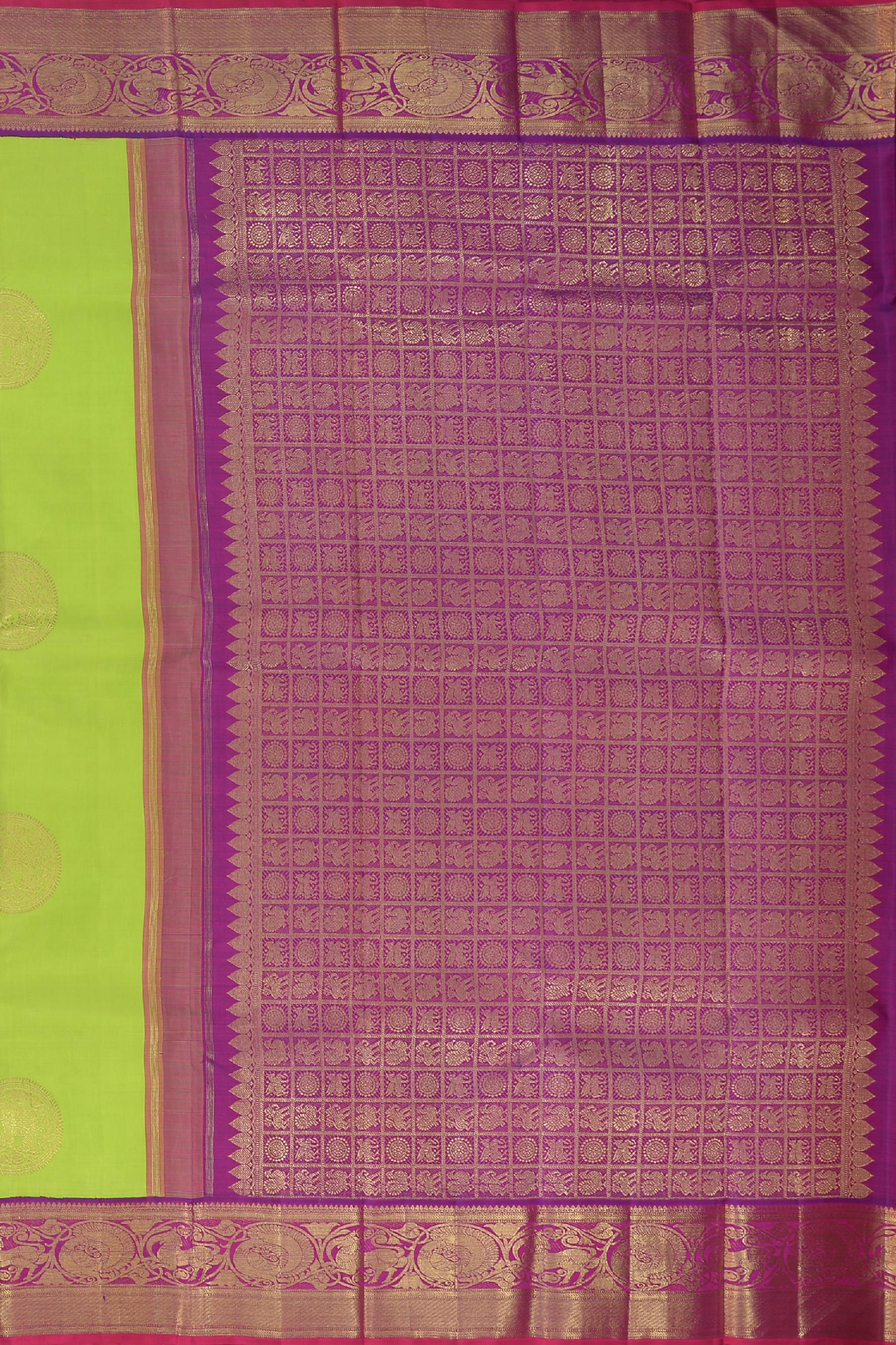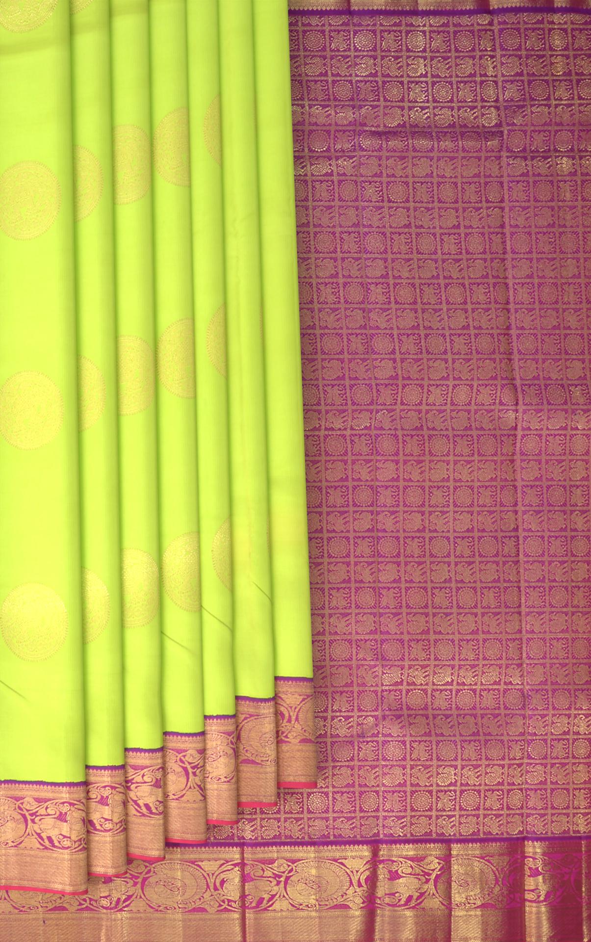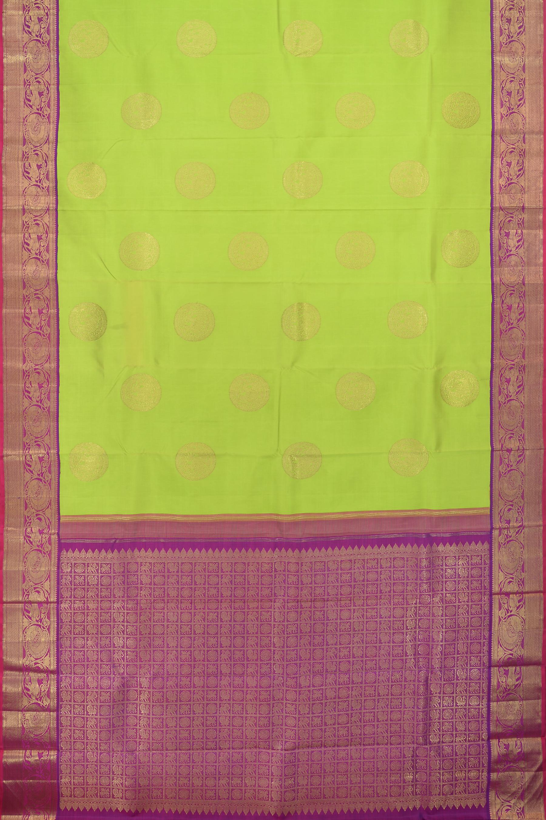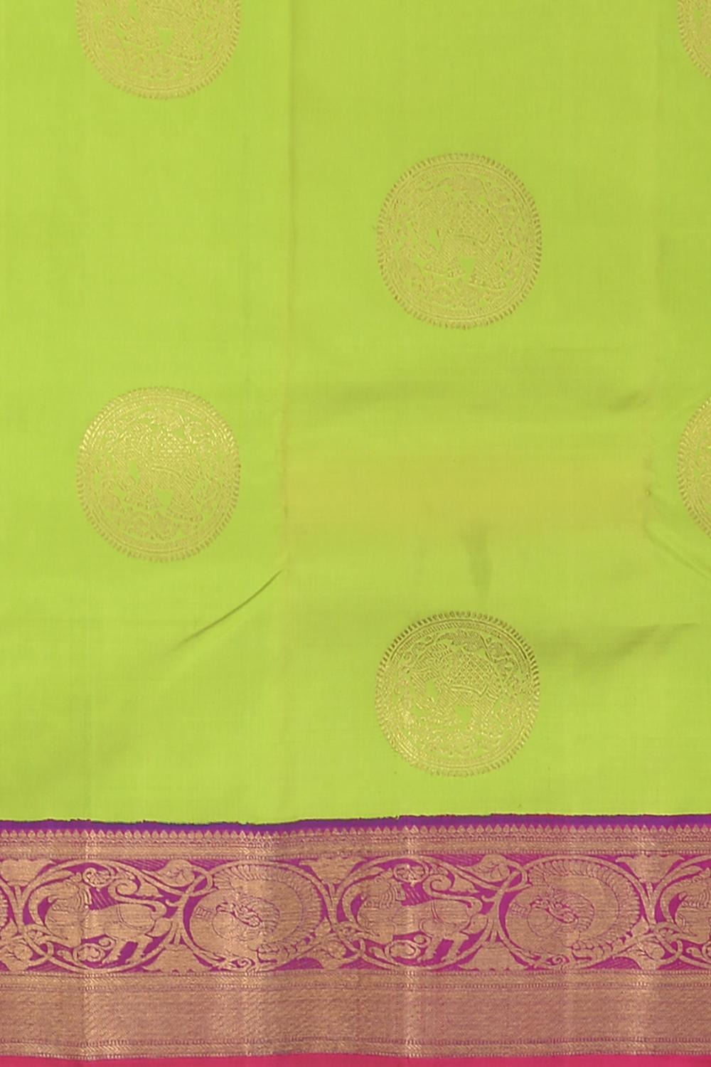 Drape yourself in this lime green Kanchipuram silk saree, where every thread weaves the opulence of regal courts and the grandeur of majestic parades. The body of the saree is adorned with big buttas featuring elephants, a symbol of strength, wisdom, and royal splendor in Indian culture.
