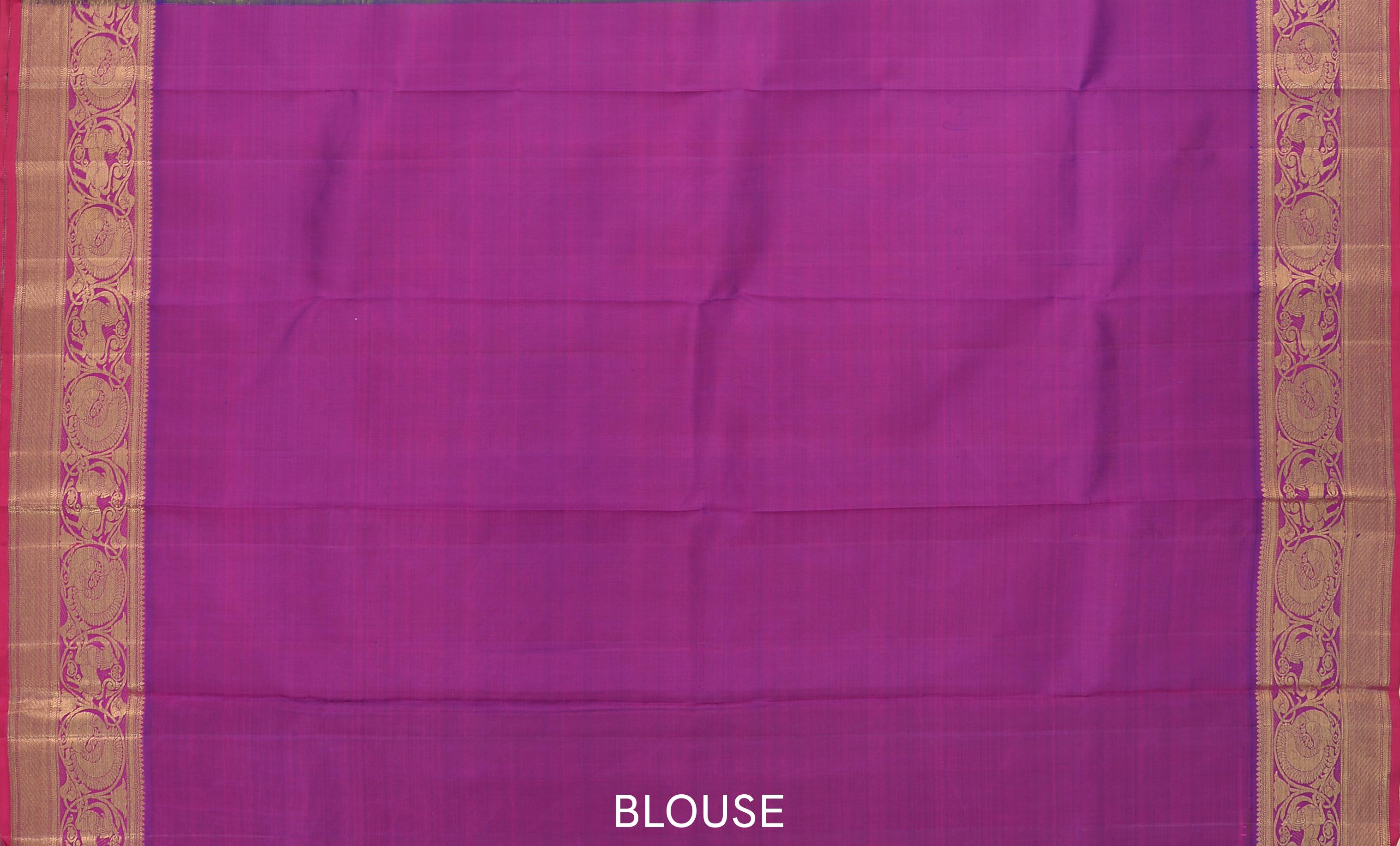 The contrast purple border is a canvas of artistic brilliance, showcasing the yaali and peacock benaraspet border, which adds a layer of depth and intrigue to the saree's overall design. The pallu, grand and detailed, weaves together annapakshi, rudraksham, and yanai motifs within checks, presenting a rich tapestry of tradition and elegance.