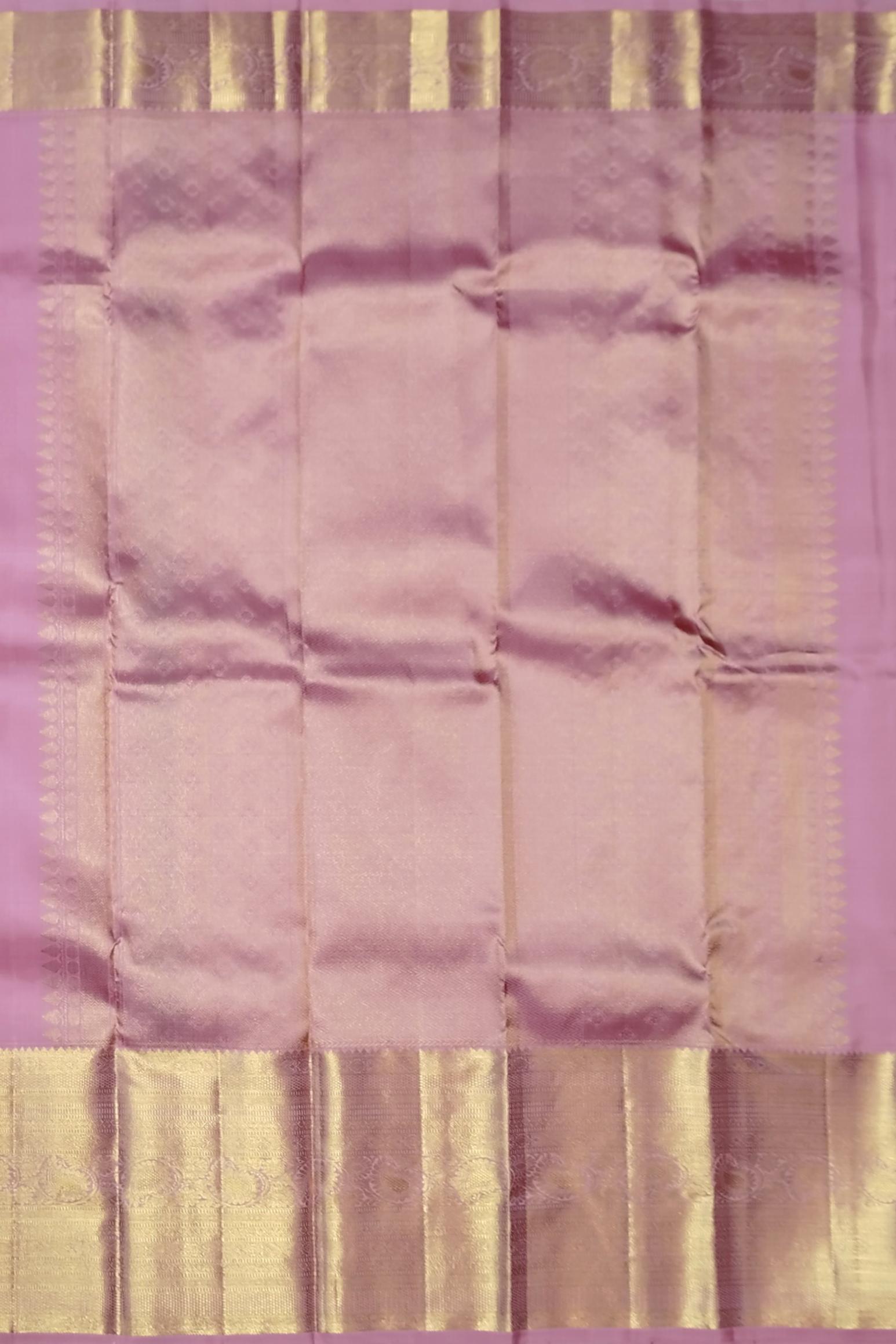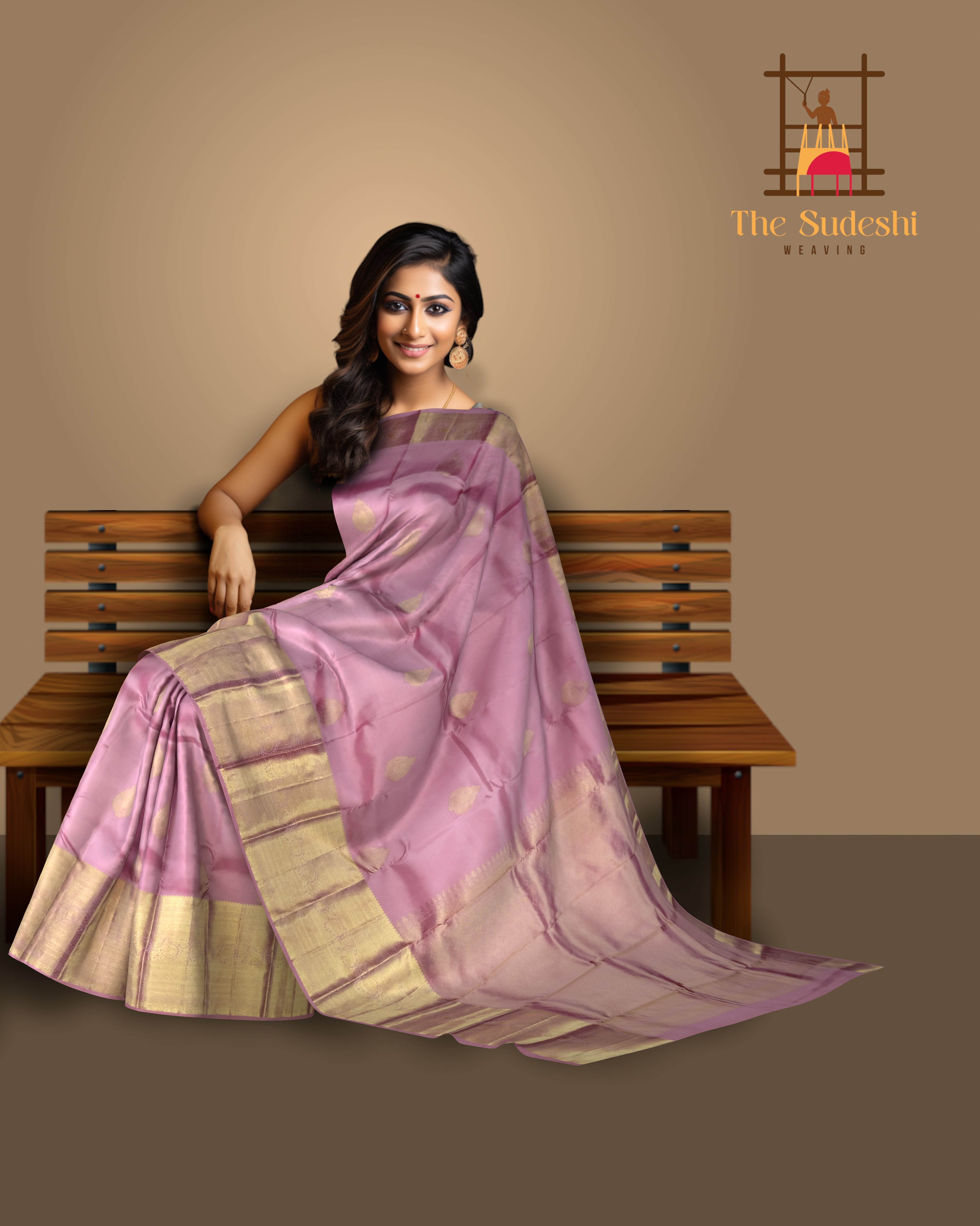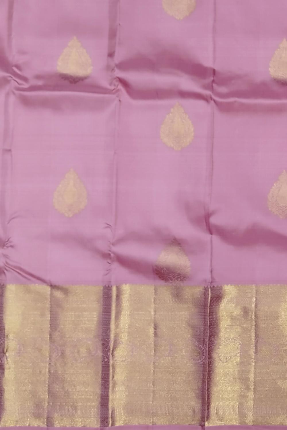 This stunning lotus pink Kanchipuram silk saree is woven with prominent tear-shaped bhutta motifs across the body, lending it a dramatic yet elegant visual rhythm. The single-tone palette brings focus to the detailed jaquard work, while the soft sheen of the silk elevates its appeal.